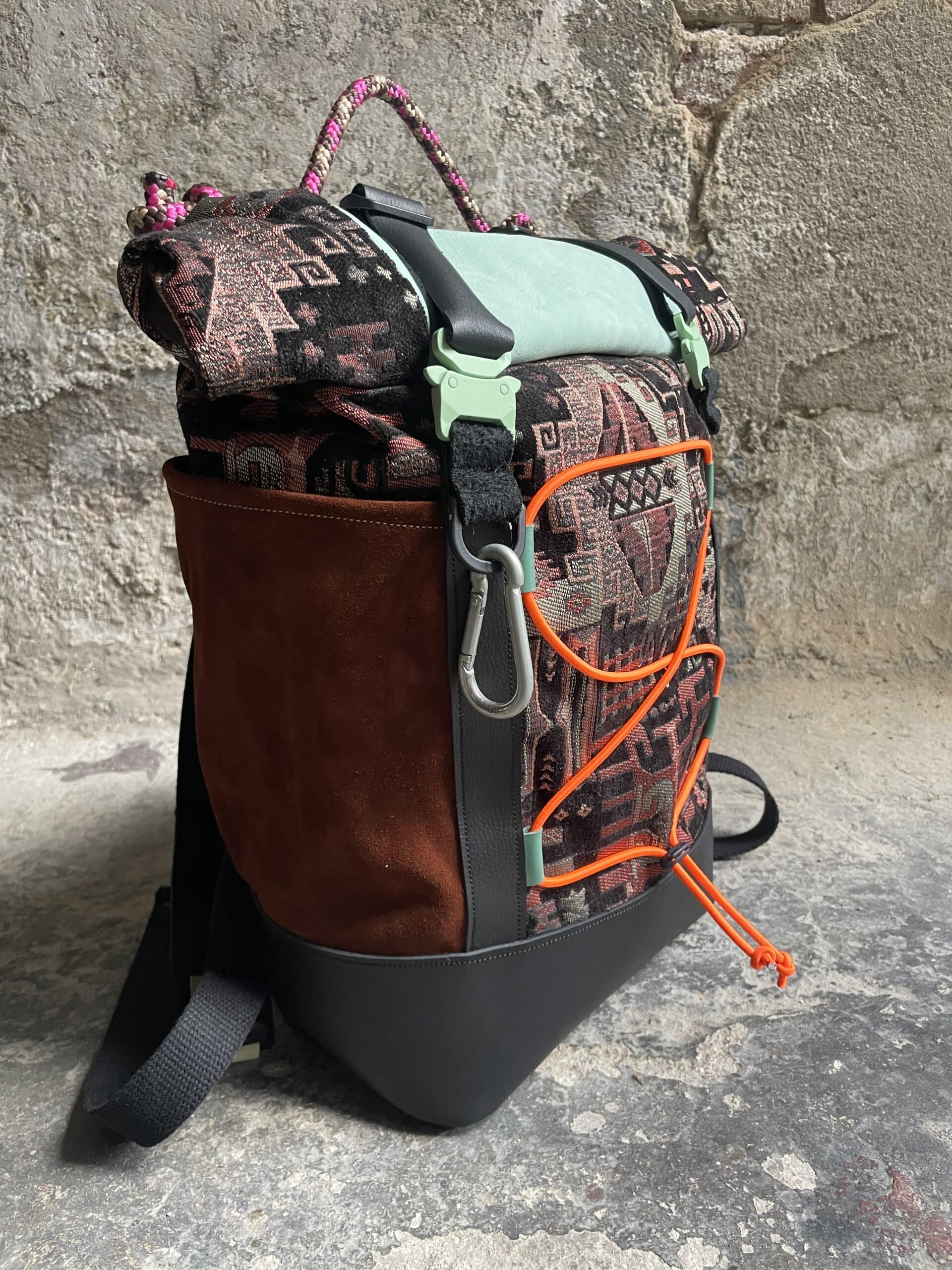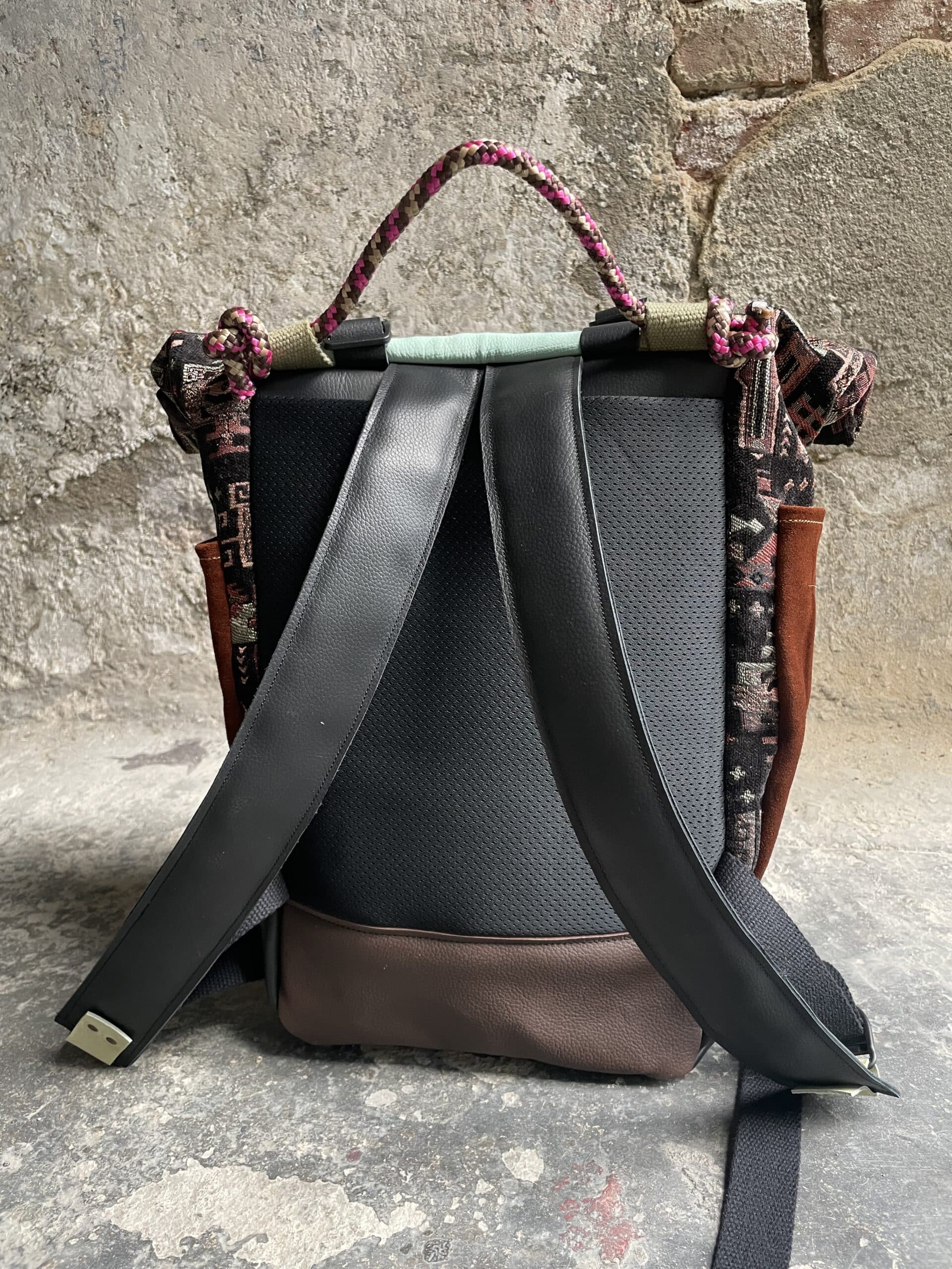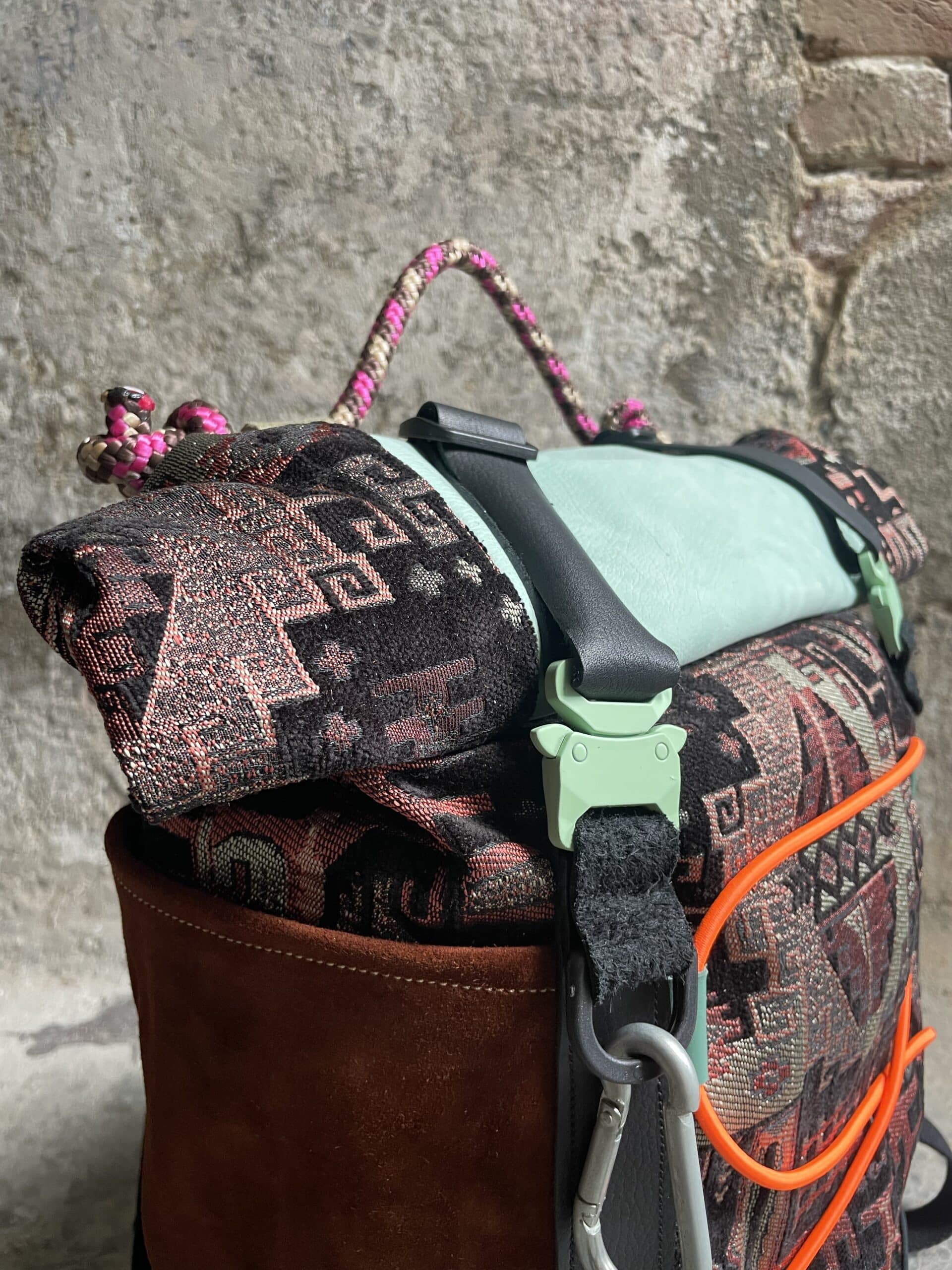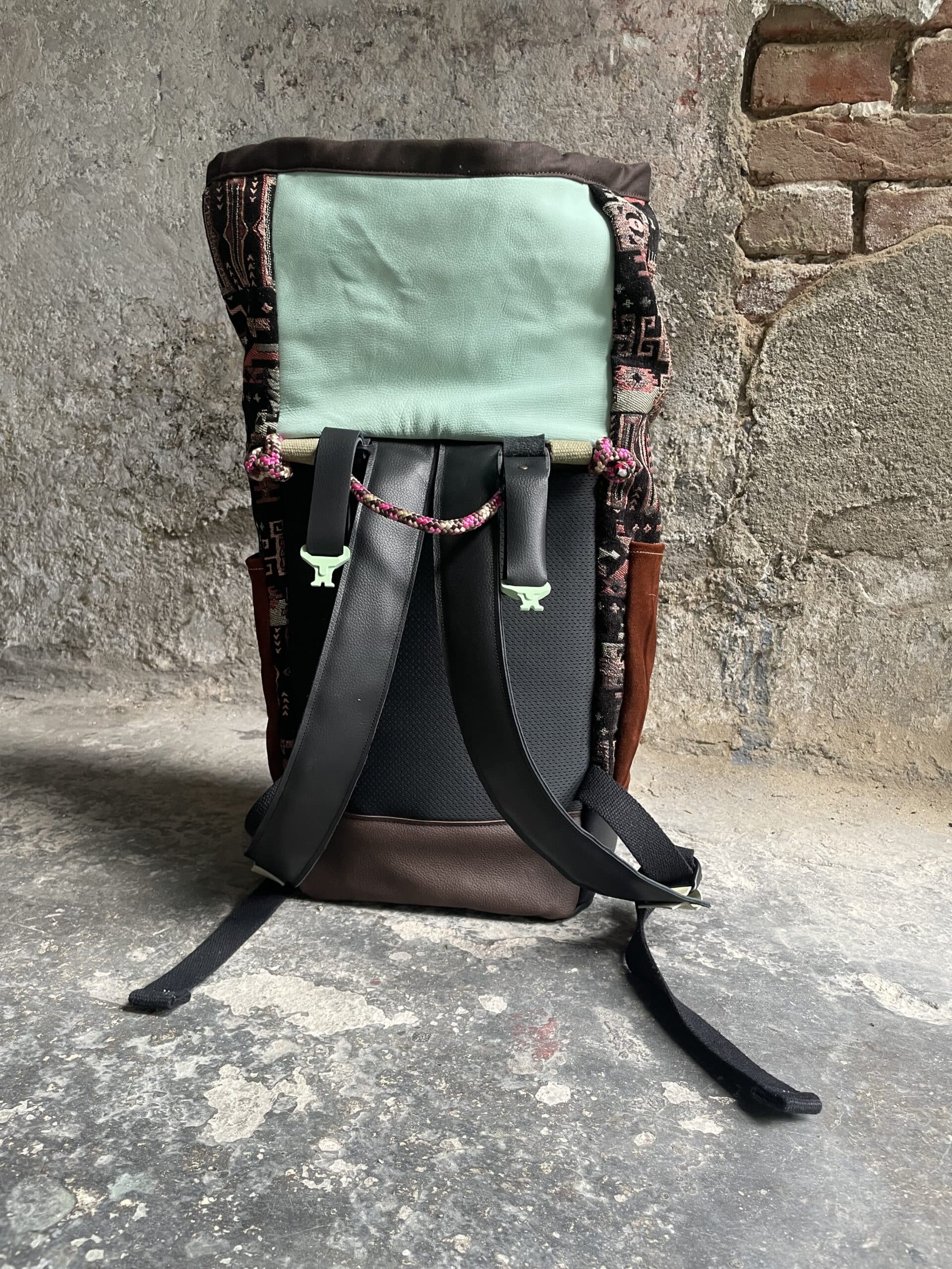 Zaino rolltop realizzato con tessuto artigianale di provenienza turca stile KILIM, e pellami misti, leftovers di concerie italiane.