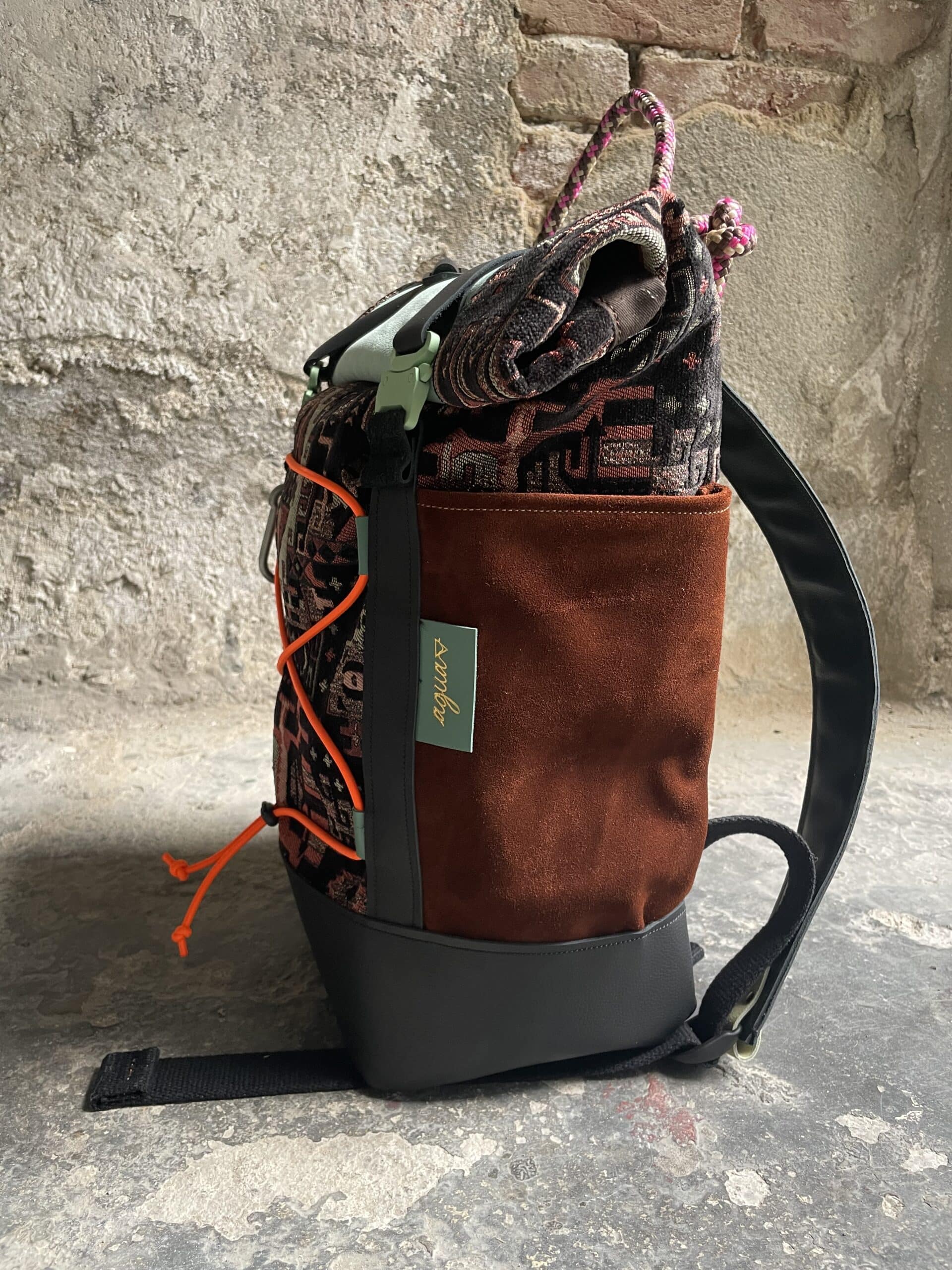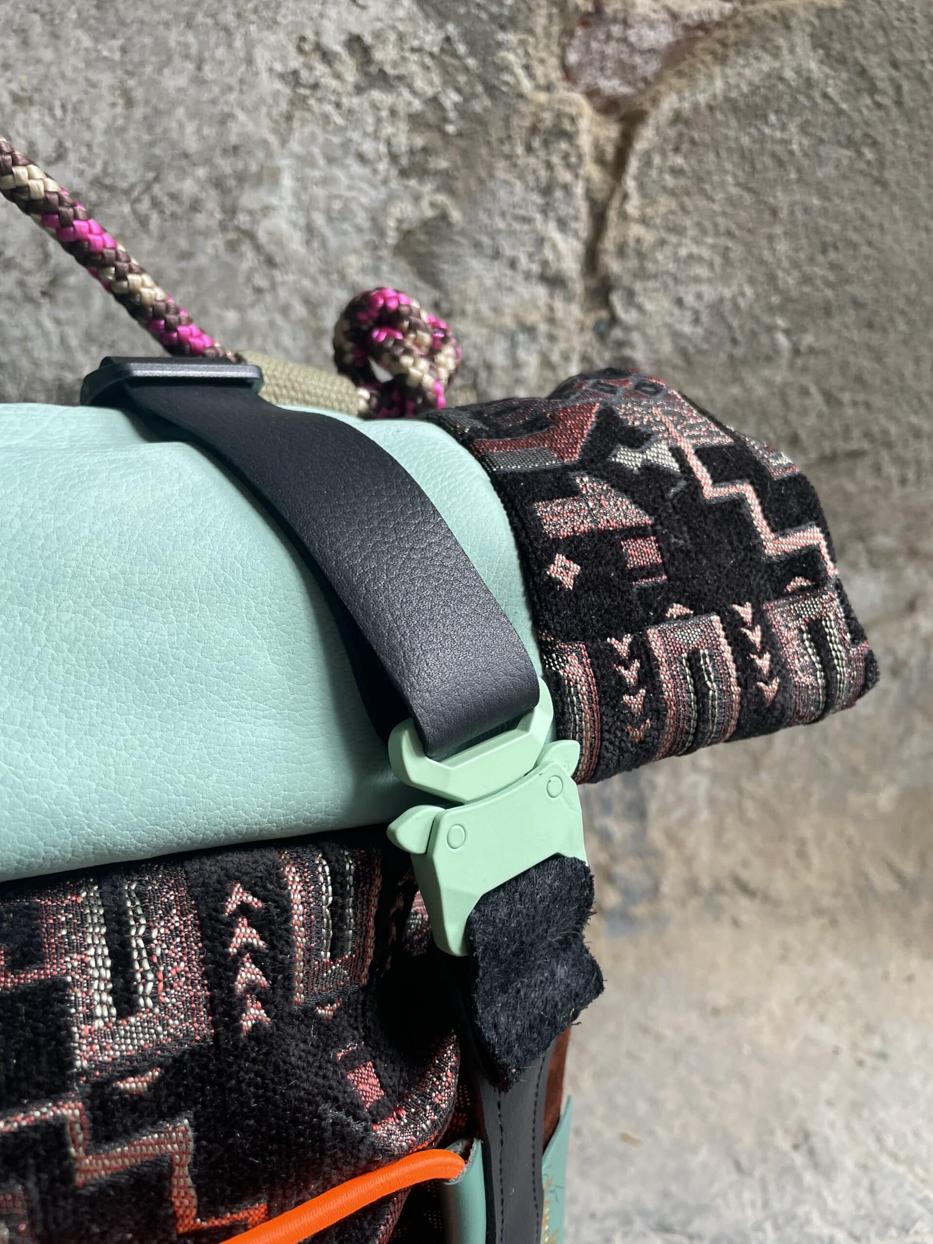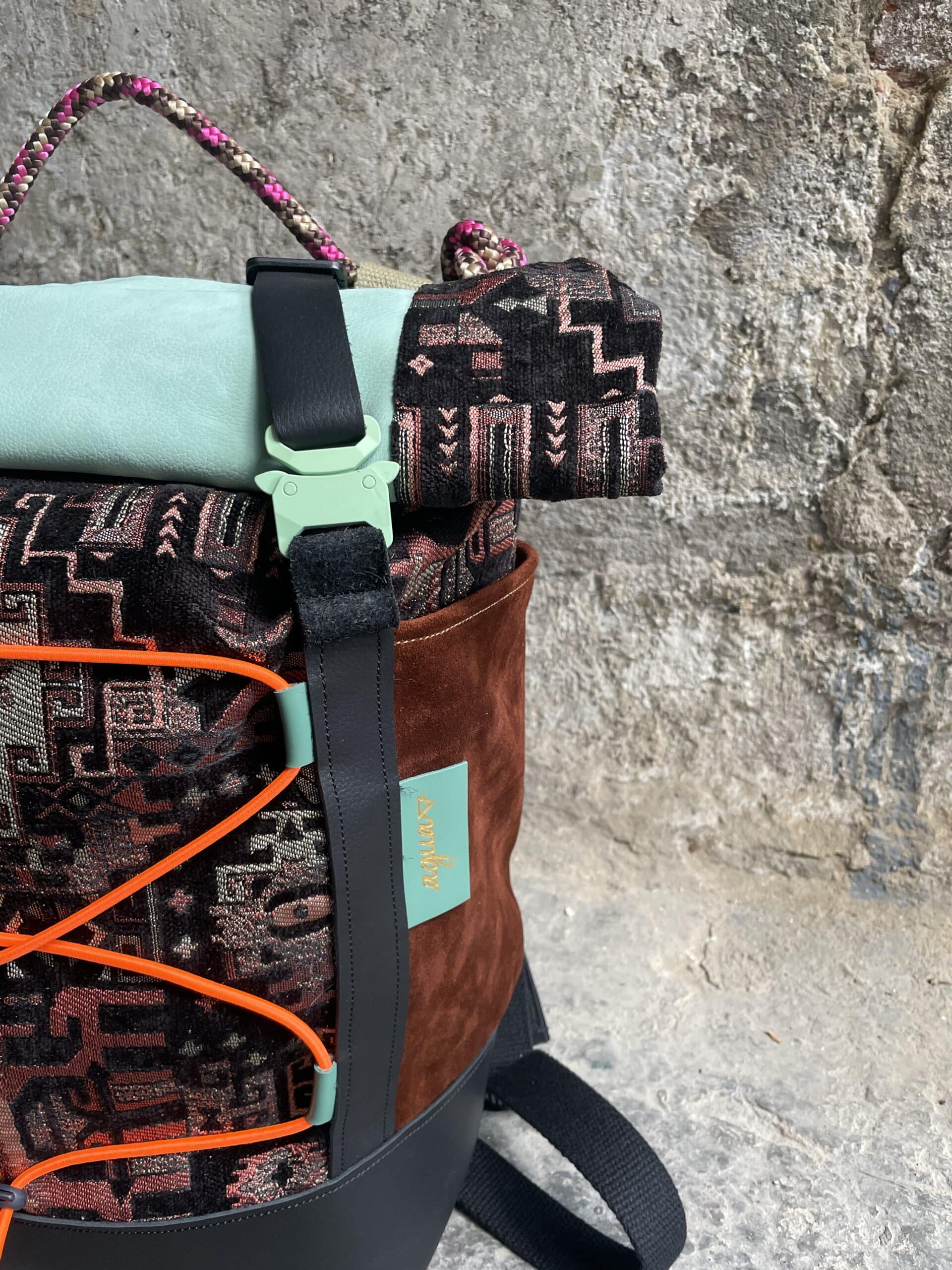 Zaino rolltop realizzato con tessuto artigianale di provenienza turca stile KILIM, e pellami misti, leftovers di concerie italiane.