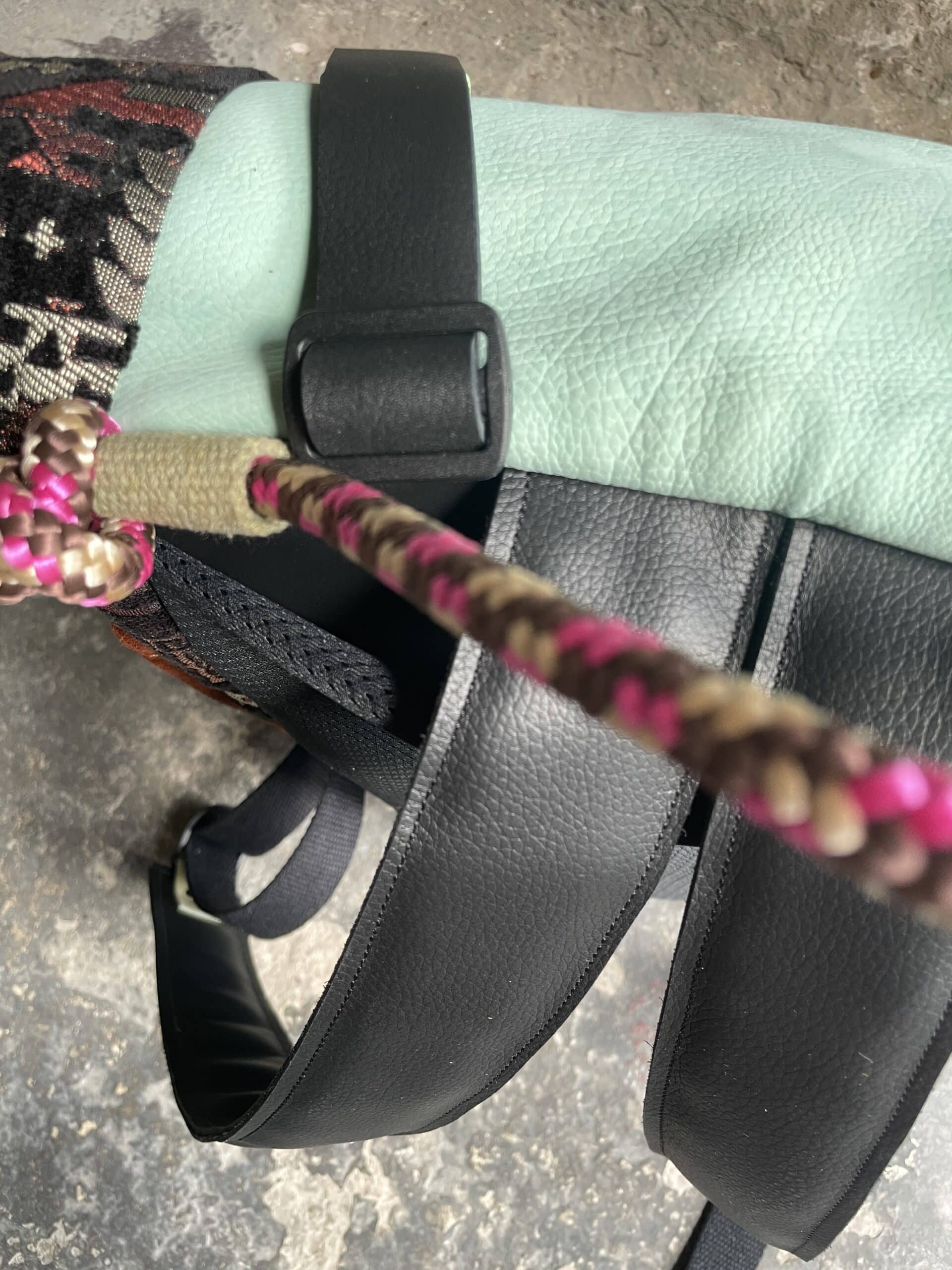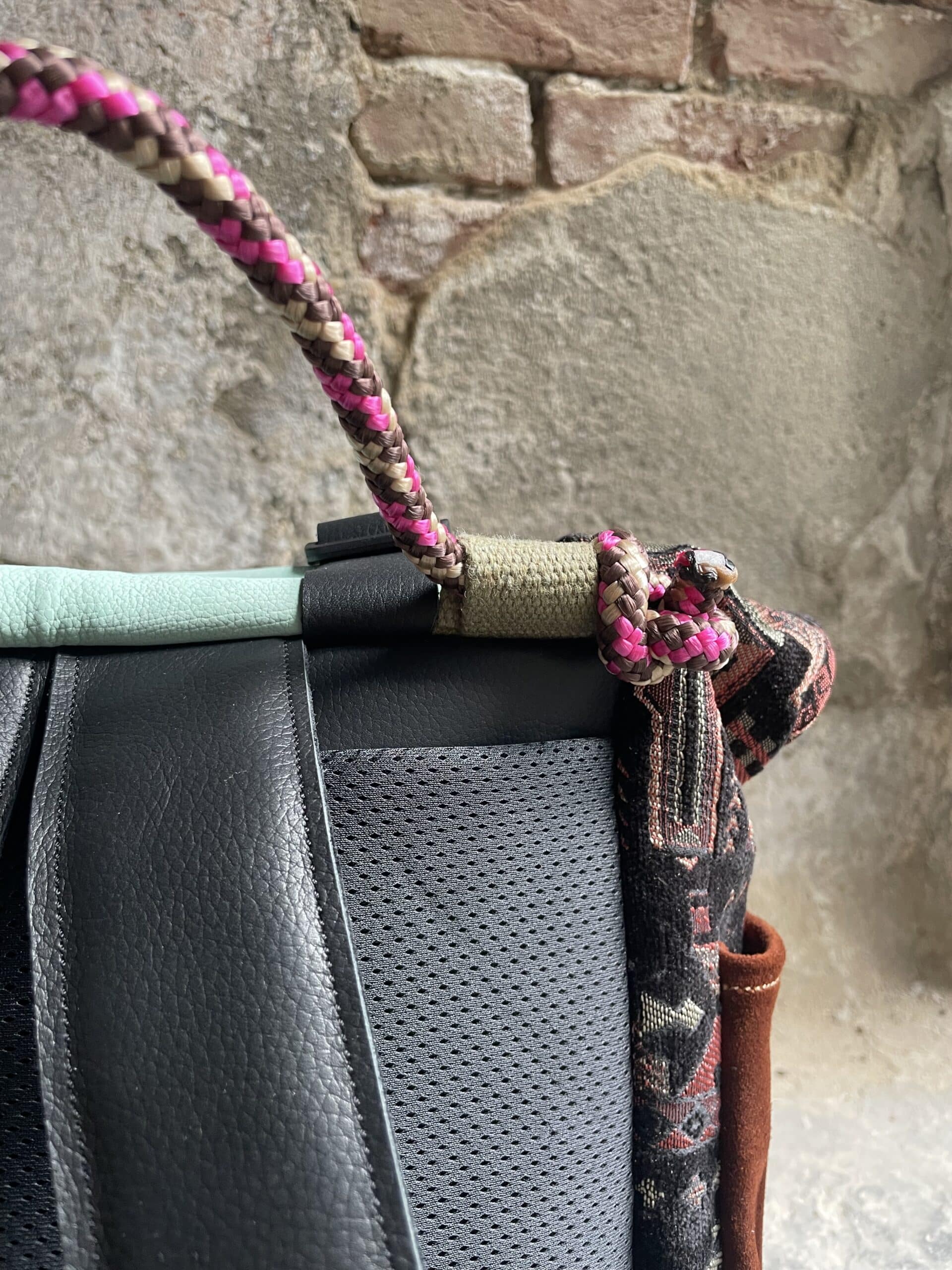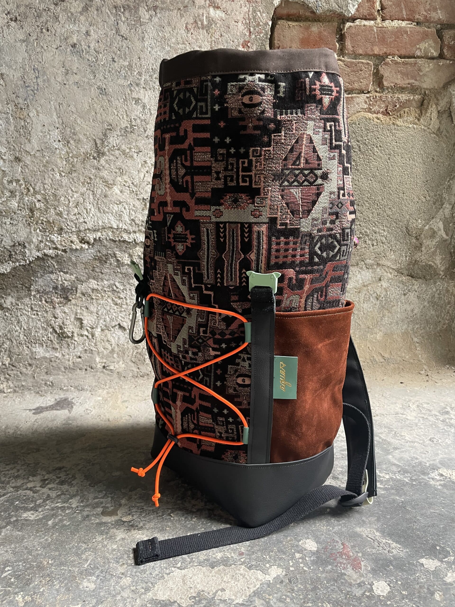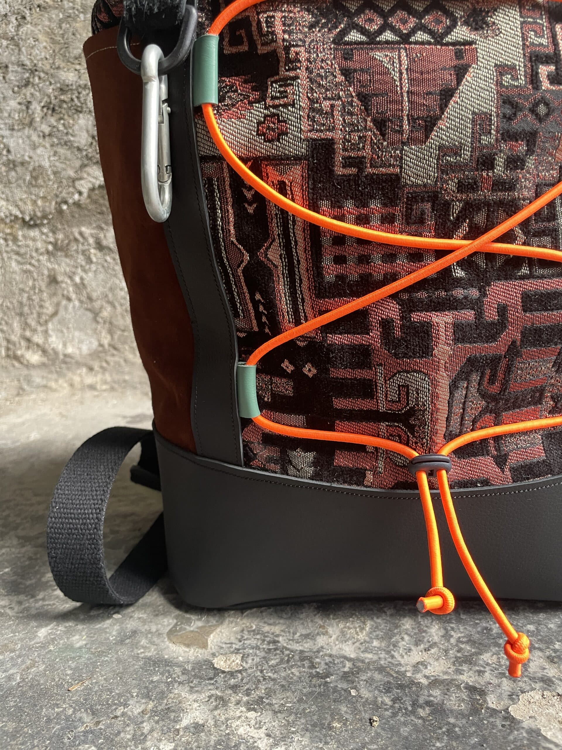 Zaino rolltop realizzato con tessuto artigianale di provenienza turca stile KILIM, e pellami misti, leftovers di concerie italiane.