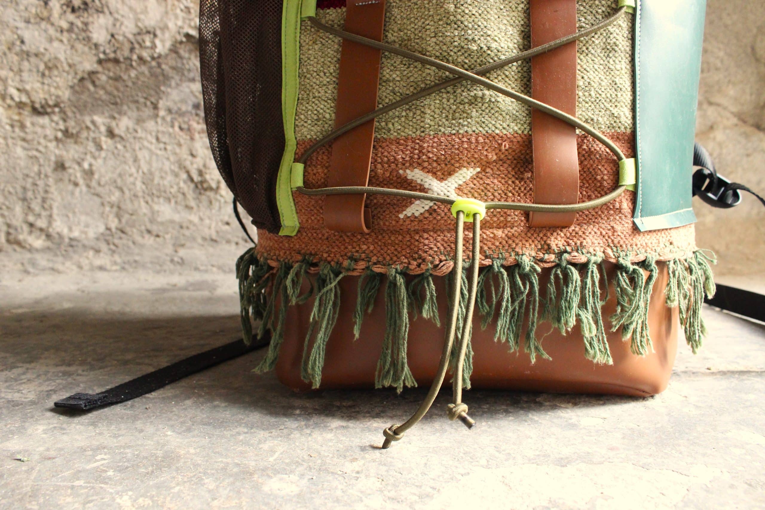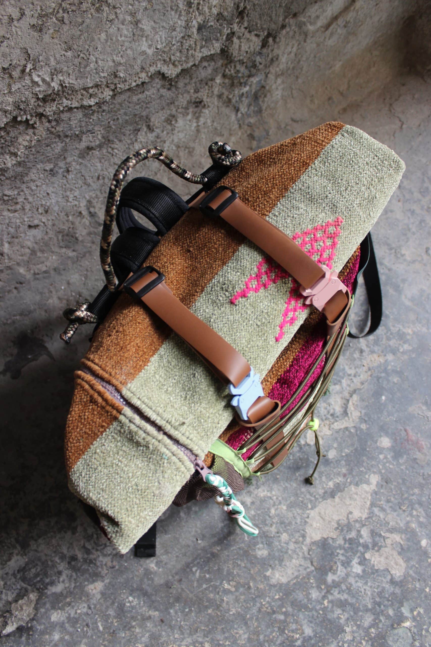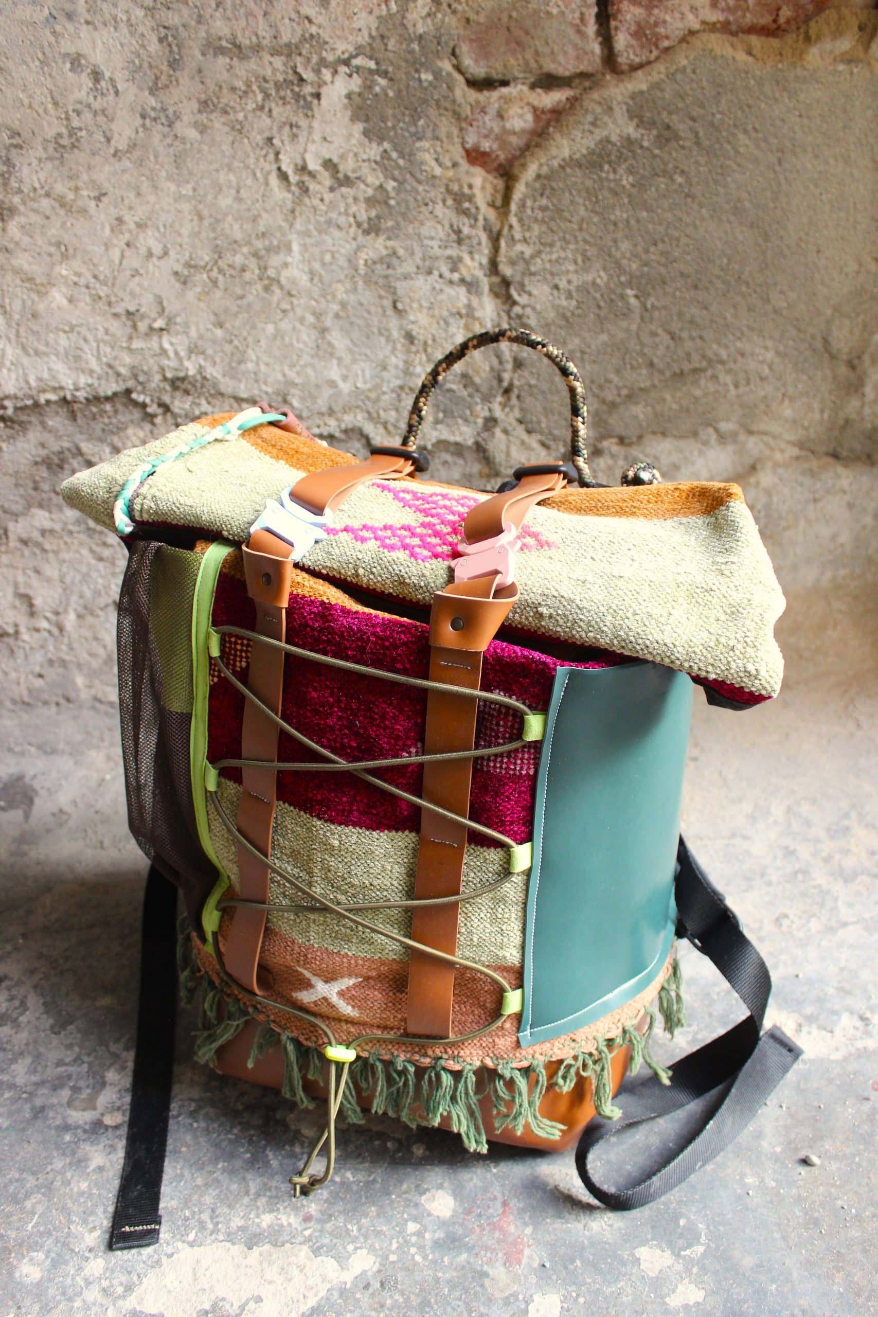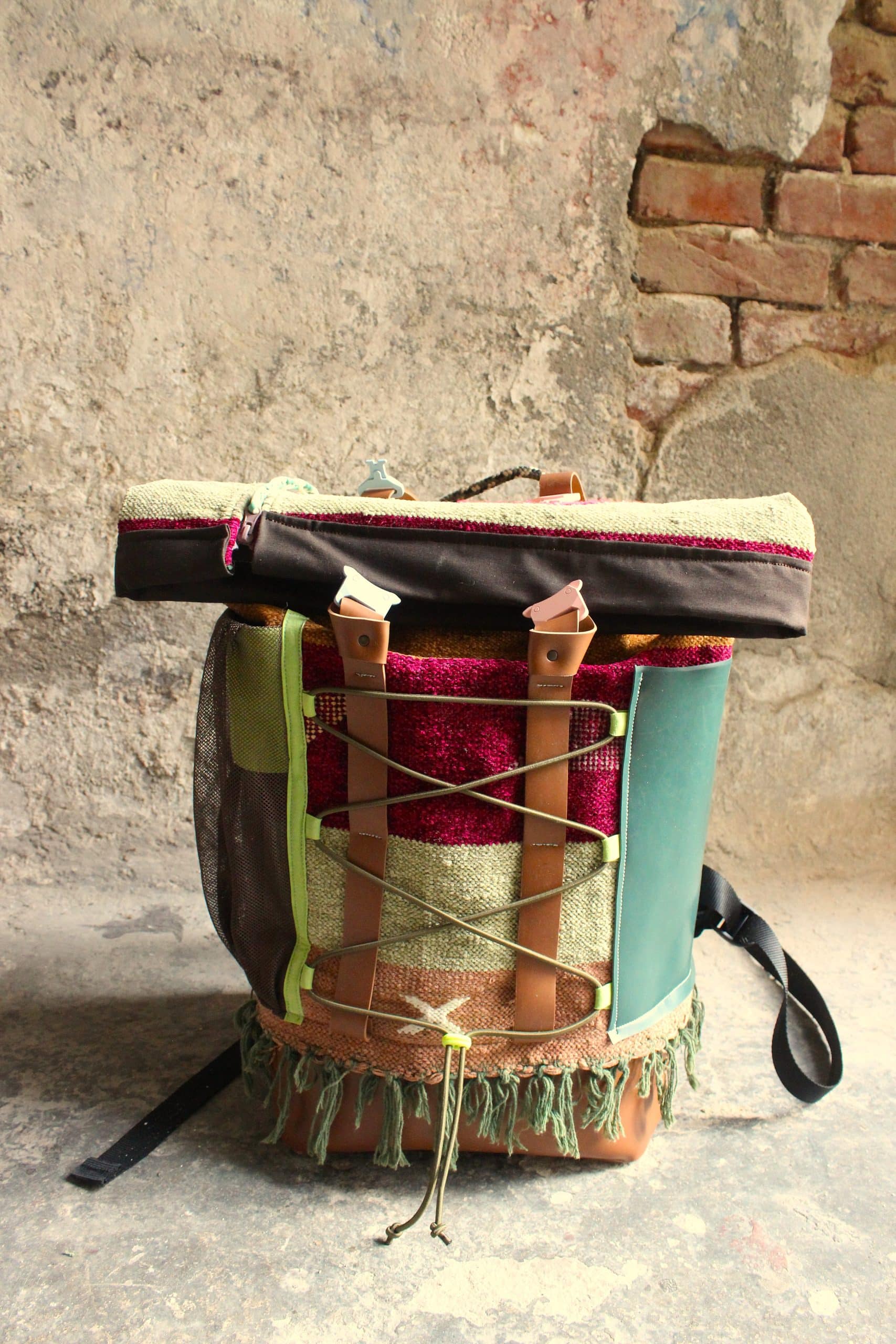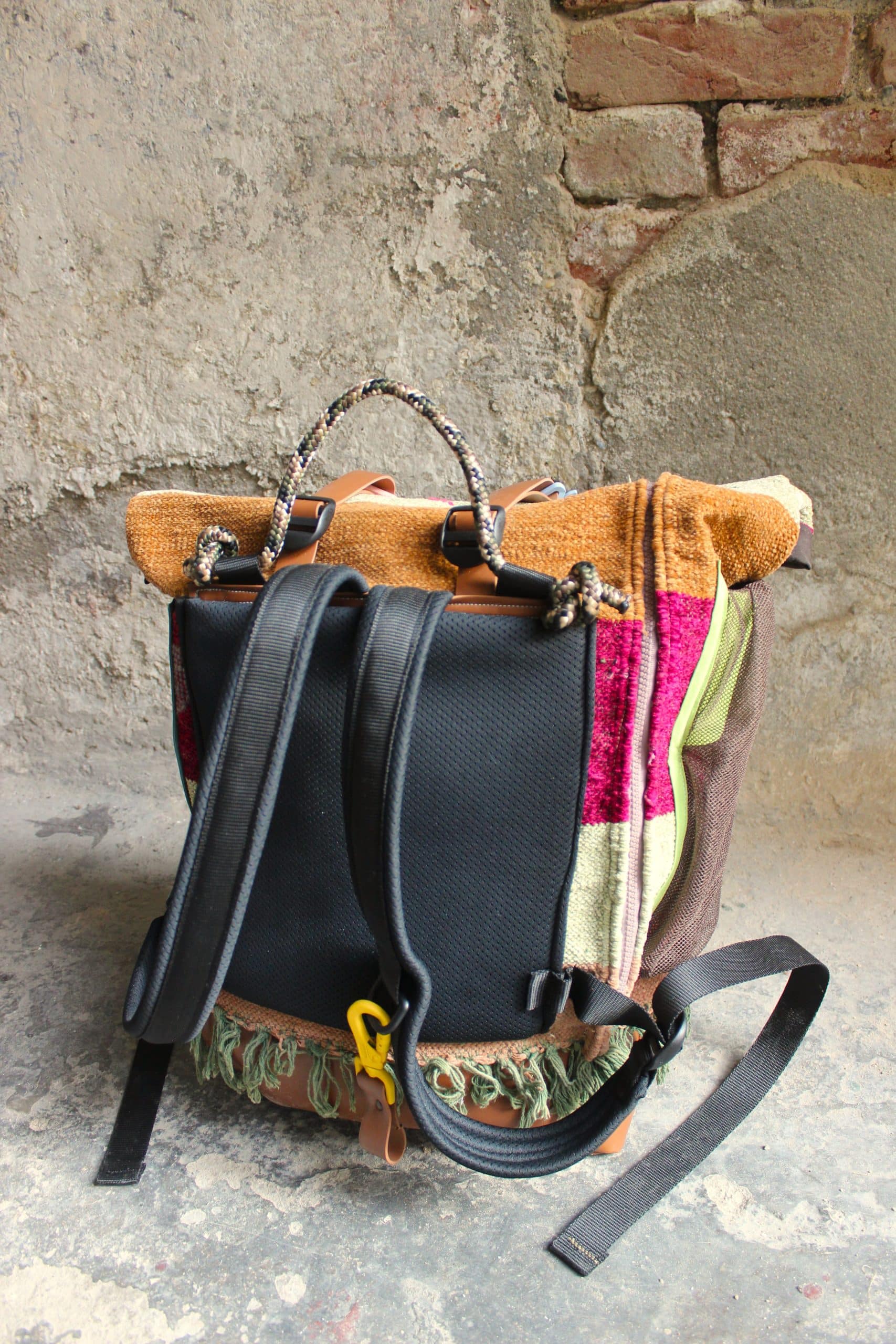 Zaino rolltop realizzato con tappeto berbero colorato, tessuto a mano acquistato ad Essaouira, e gomma riciclata recuperata dai leftovers di VIBRAM.
