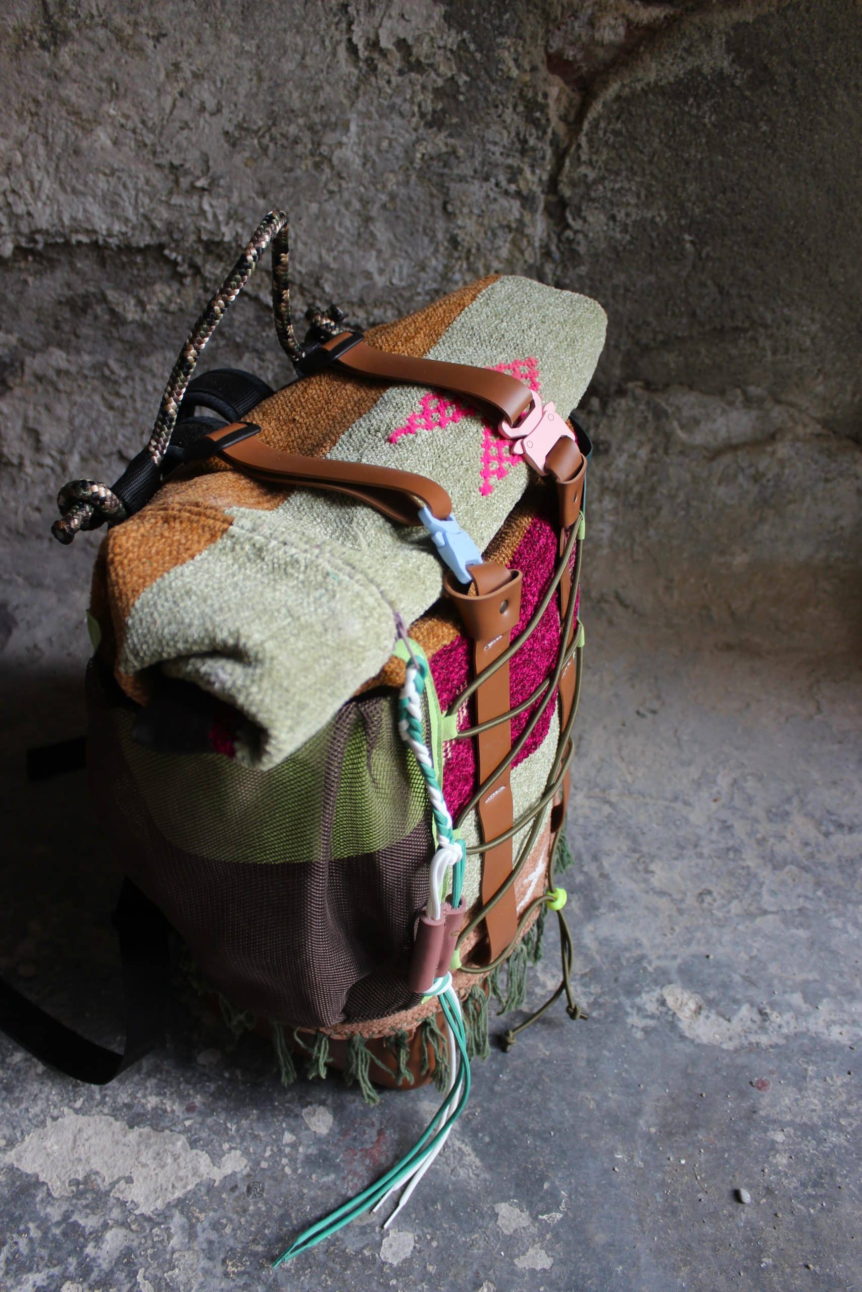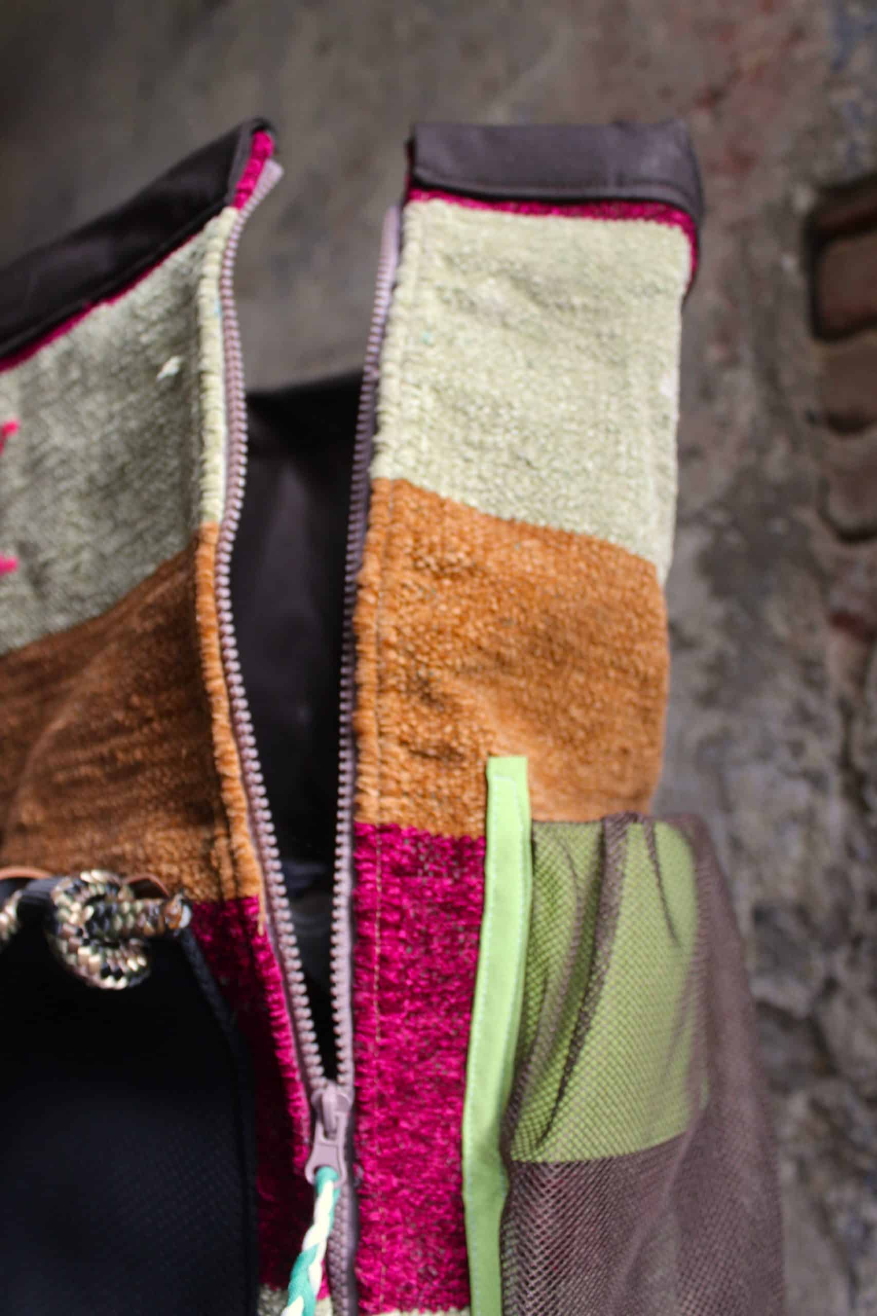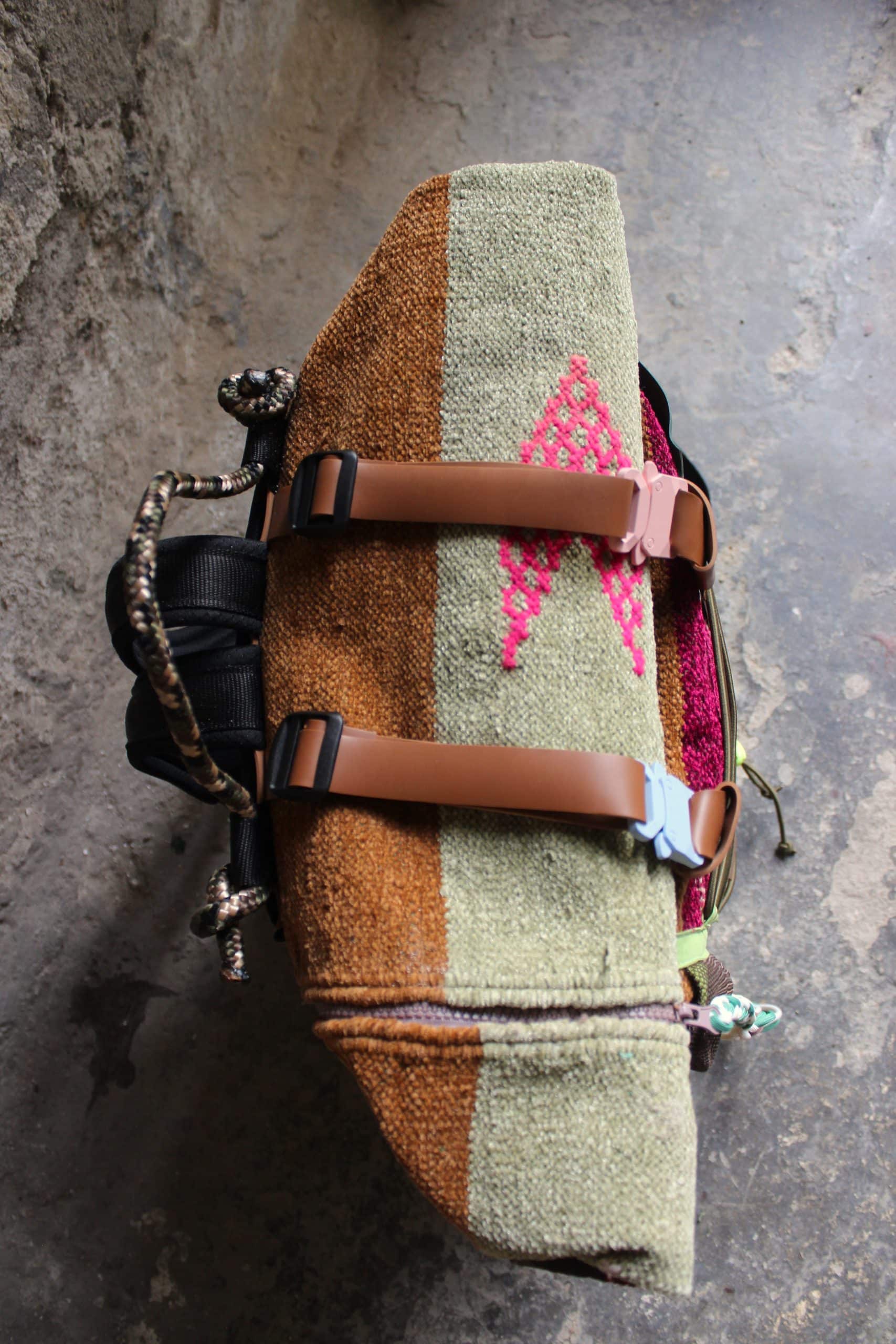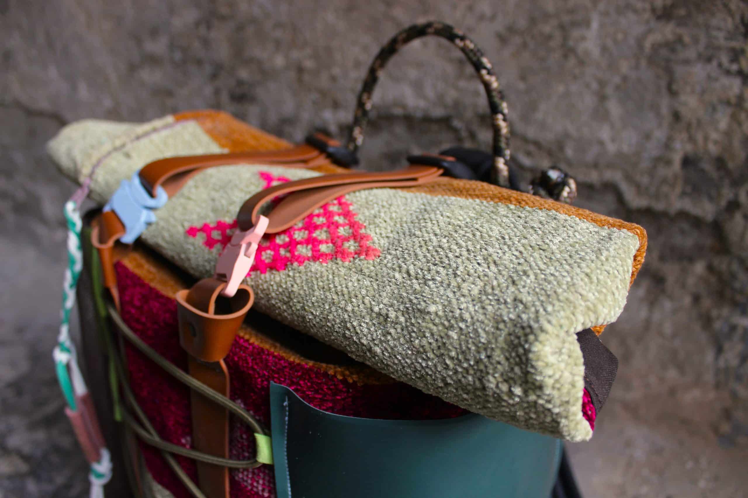 Zaino rolltop realizzato con tappeto berbero colorato, tessuto a mano acquistato ad Essaouira, e gomma riciclata recuperata dai leftovers di VIBRAM.
