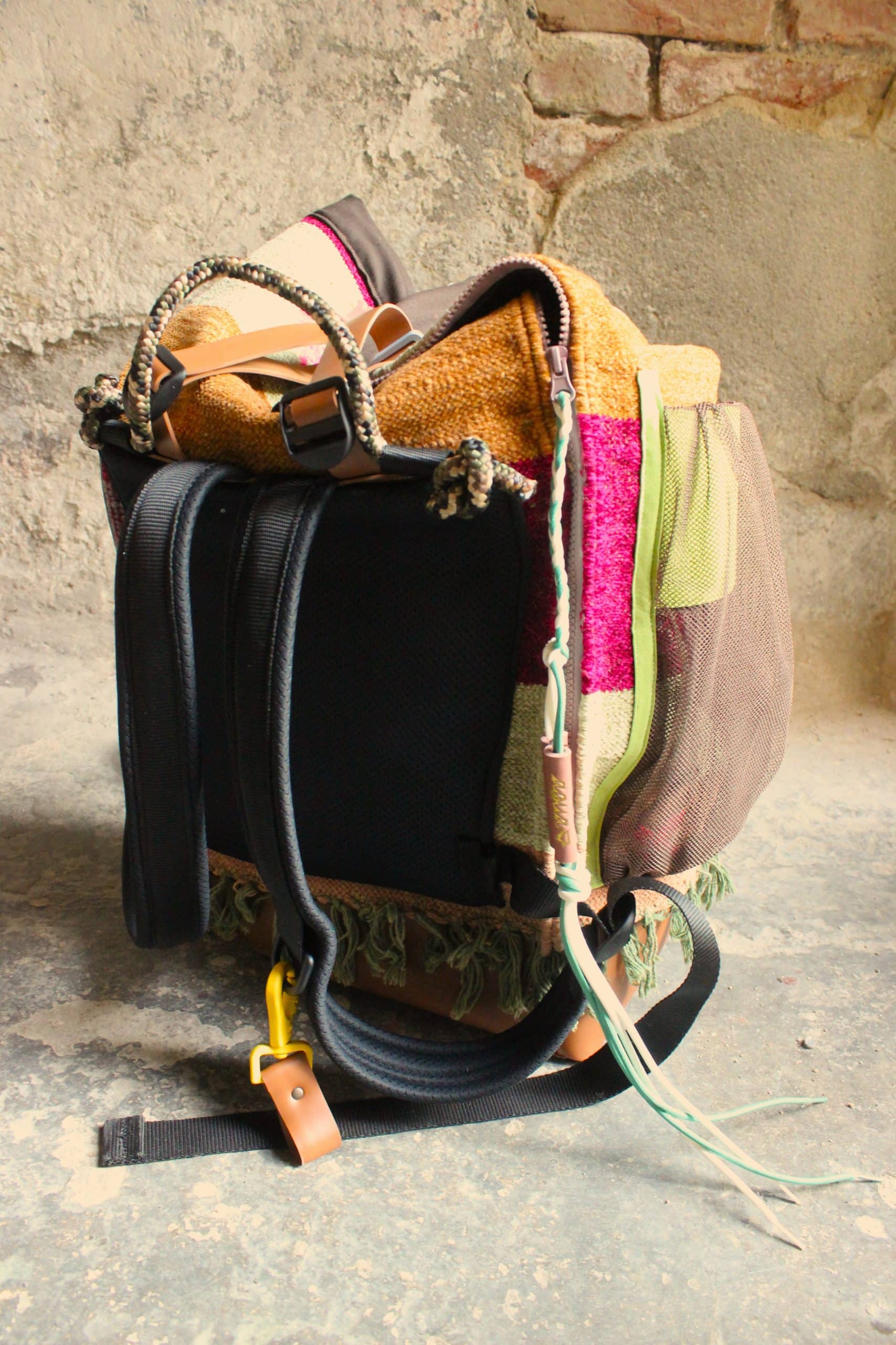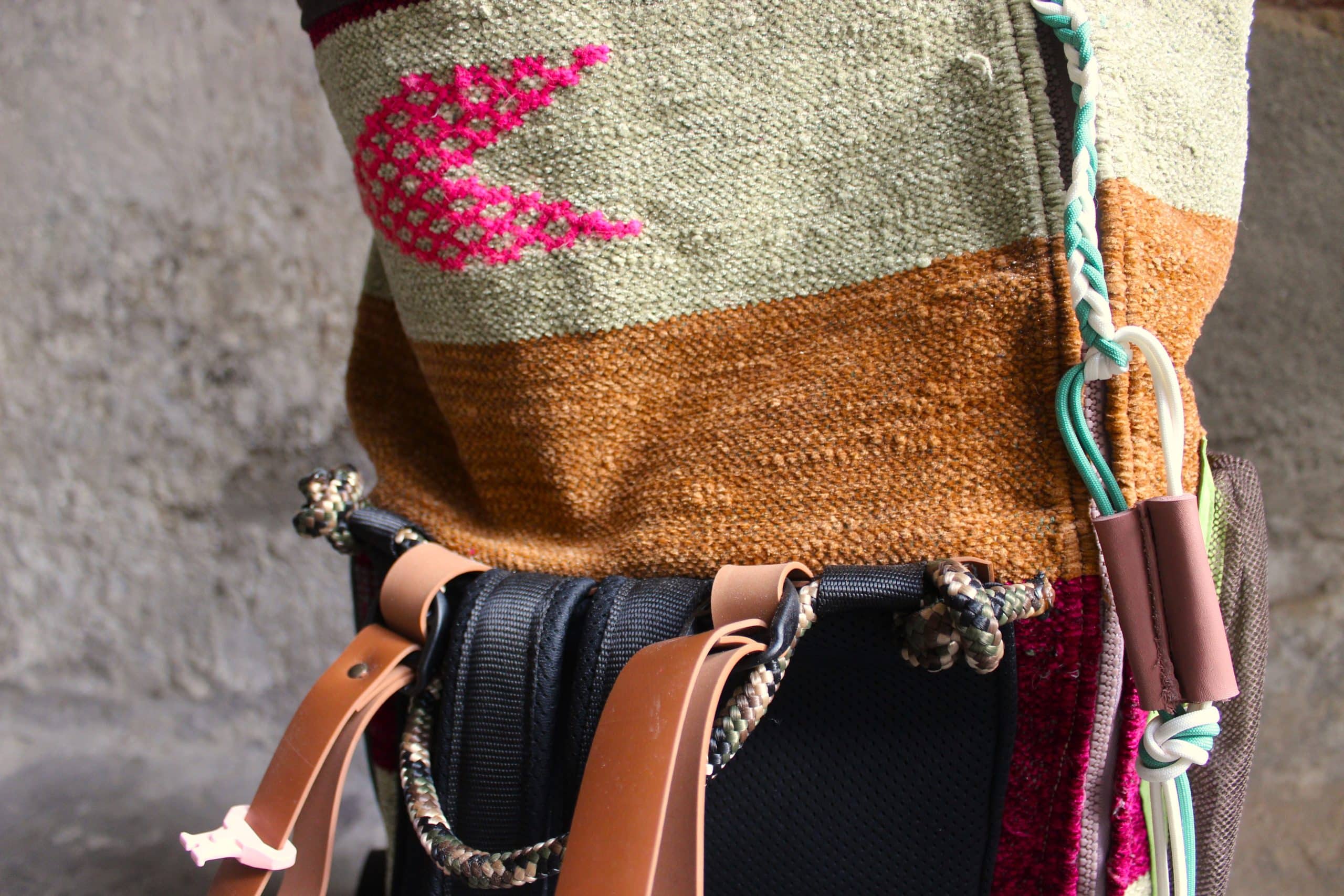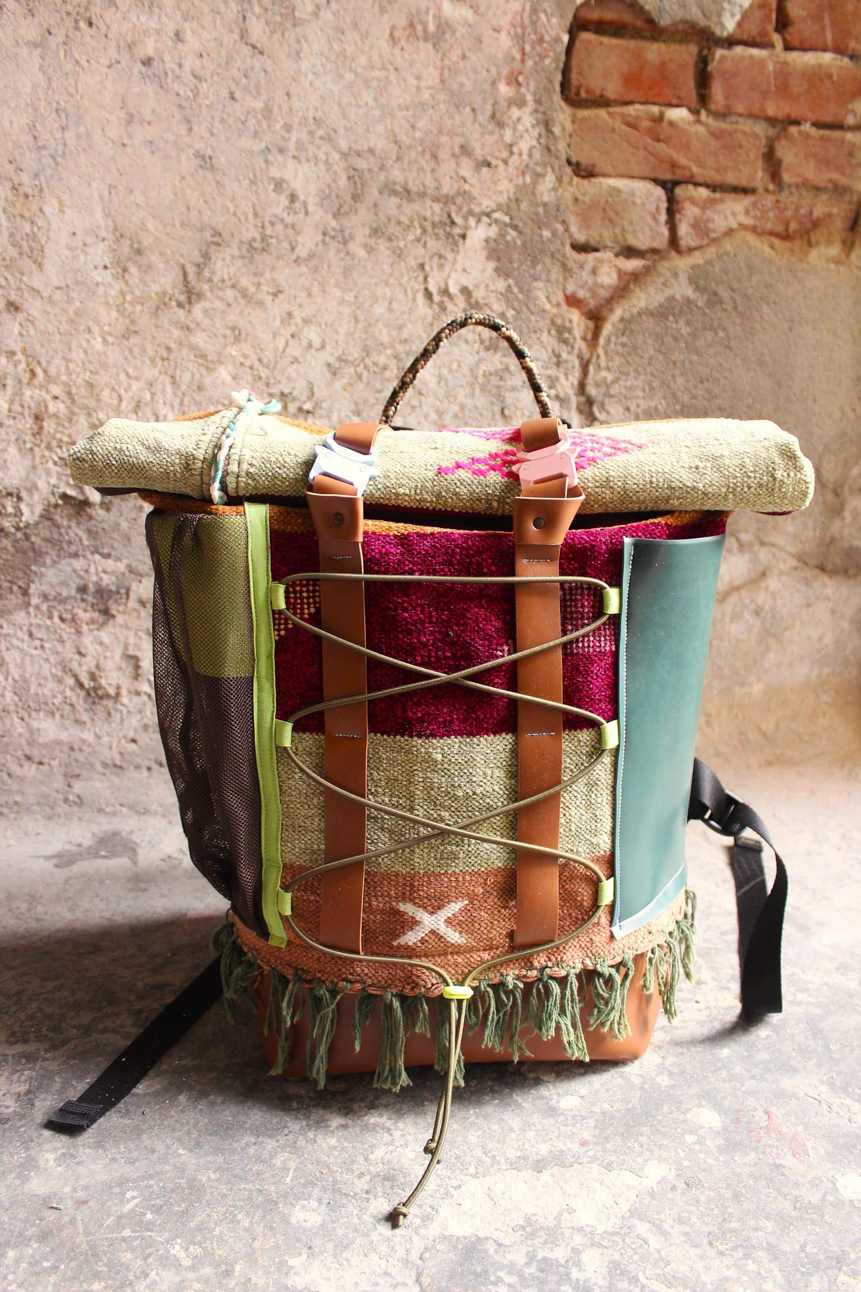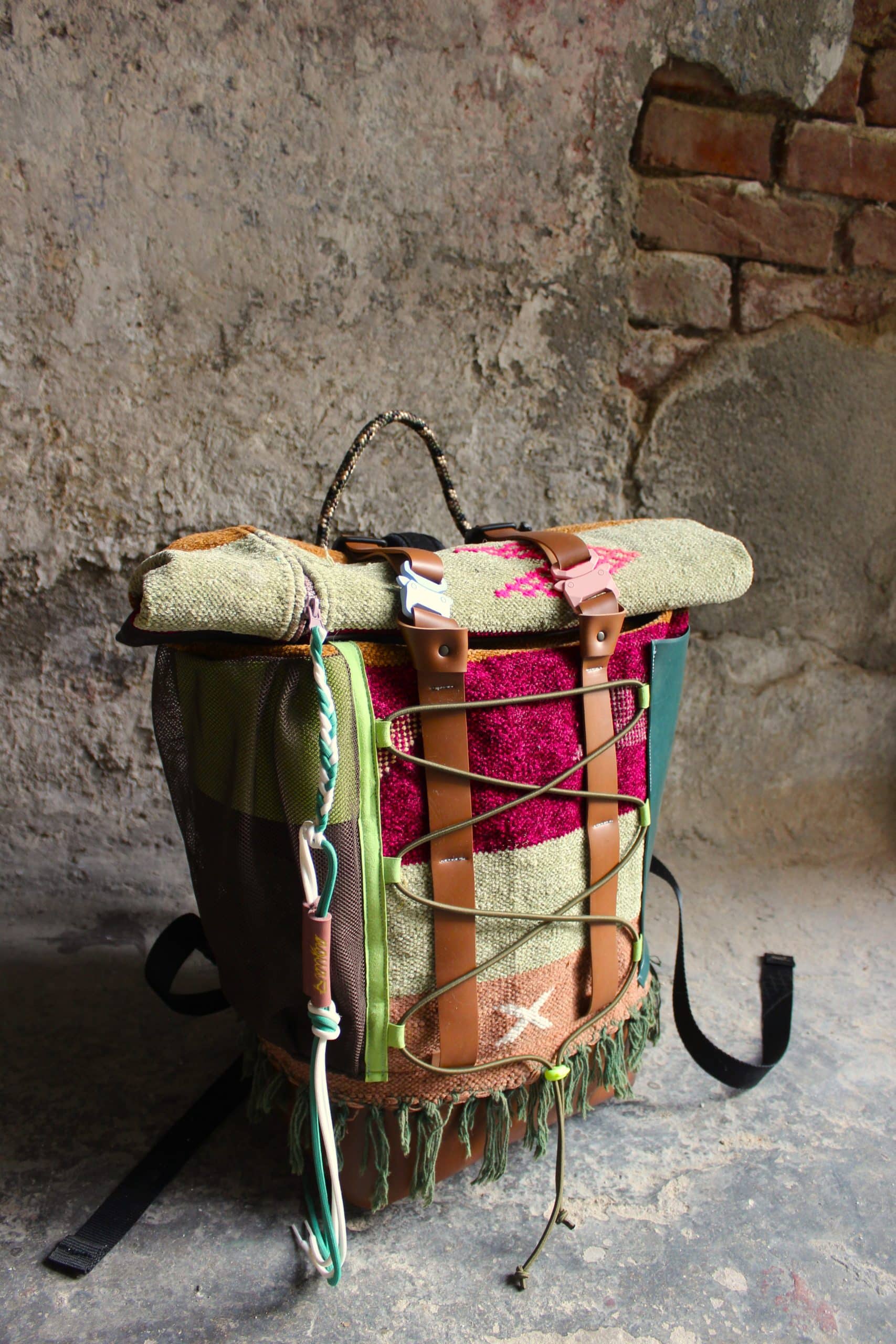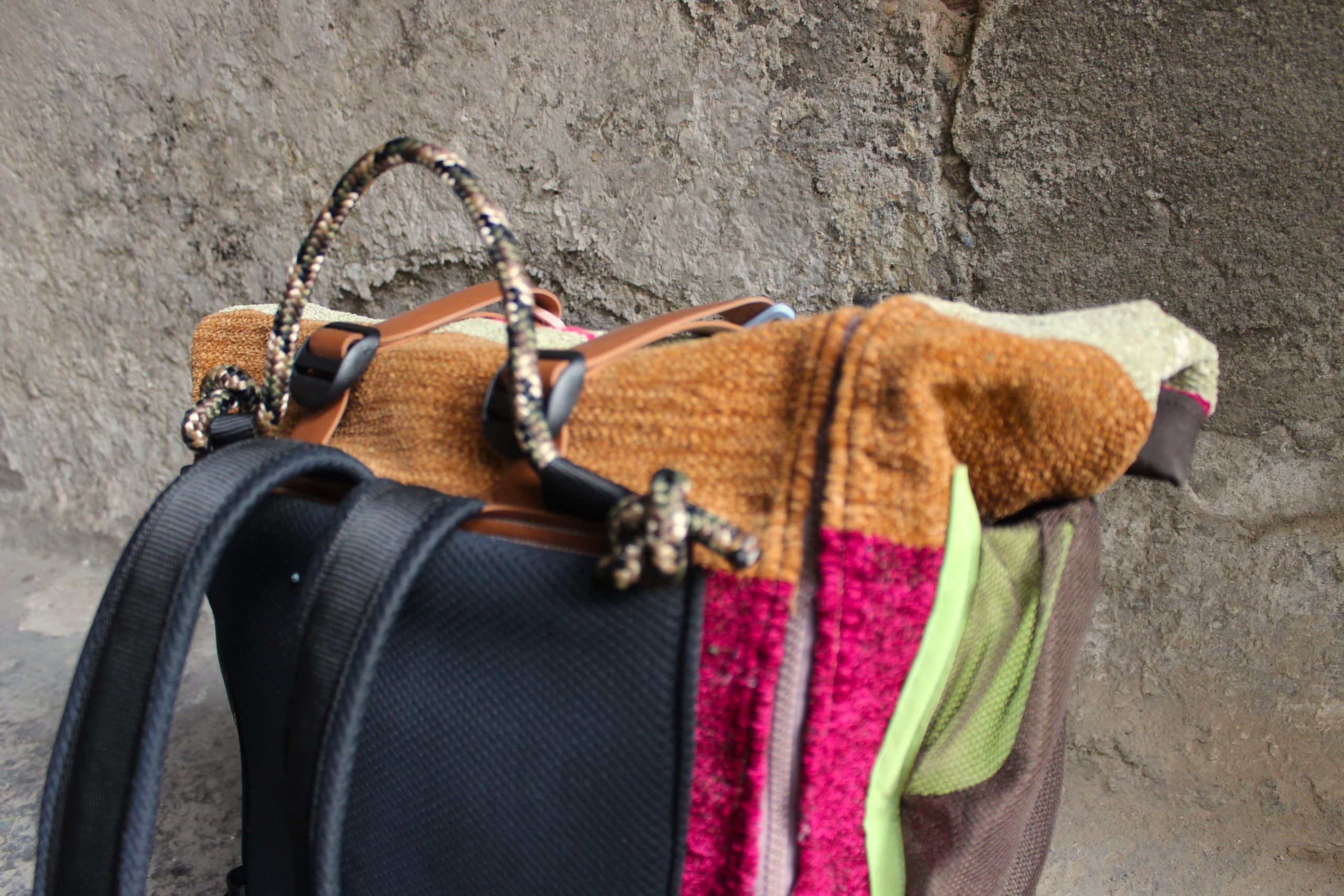 Zaino rolltop realizzato con tappeto berbero colorato, tessuto a mano acquistato ad Essaouira, e gomma riciclata recuperata dai leftovers di VIBRAM.