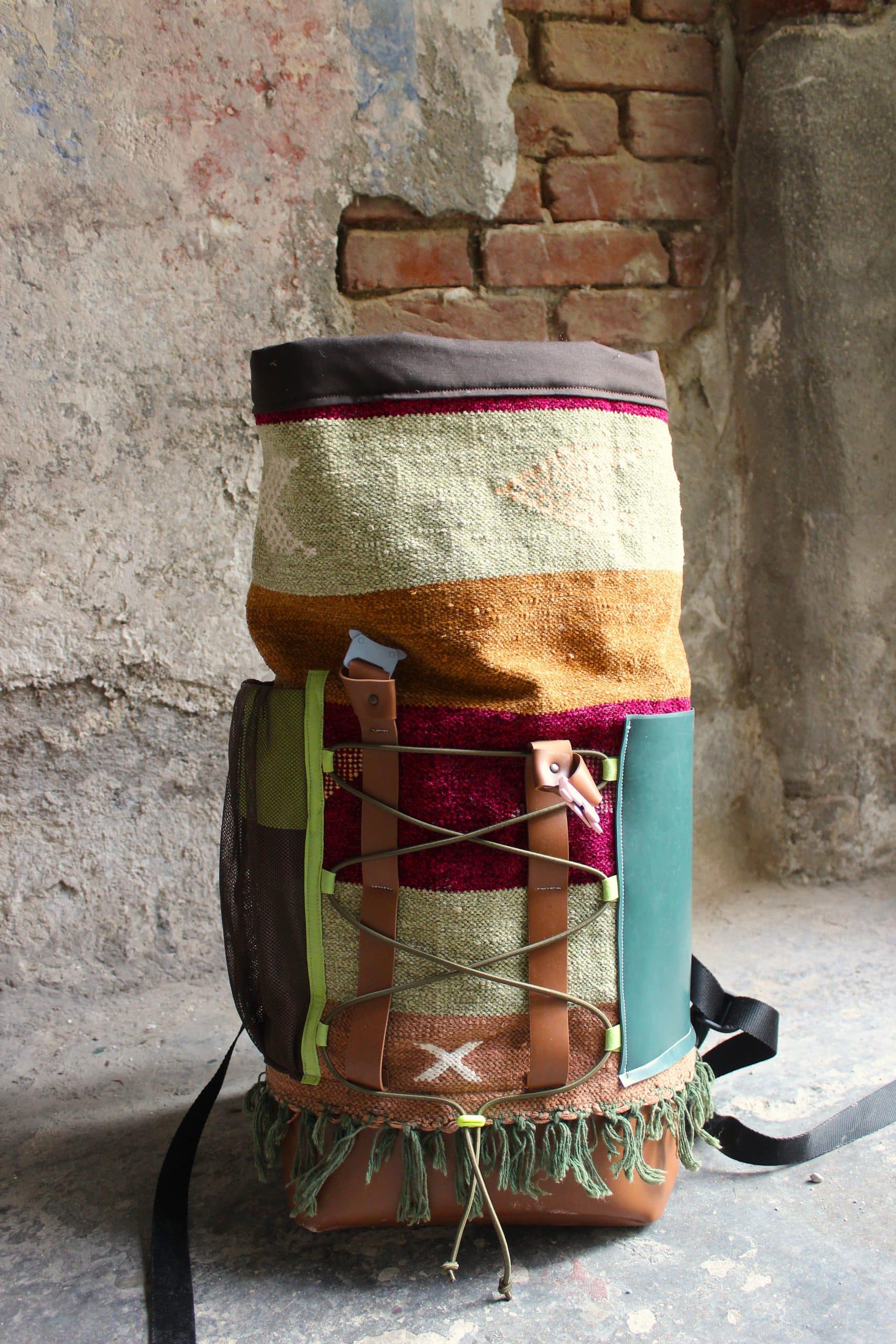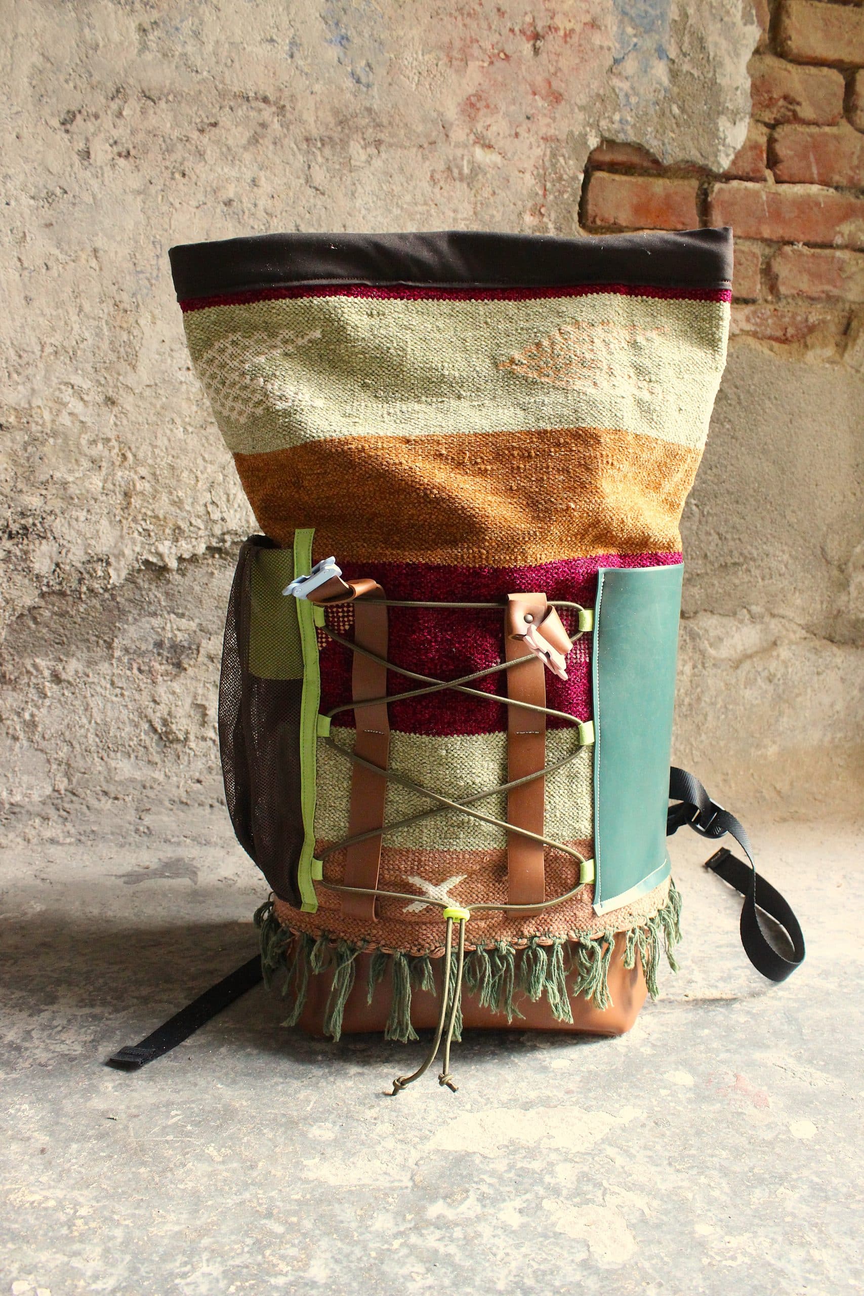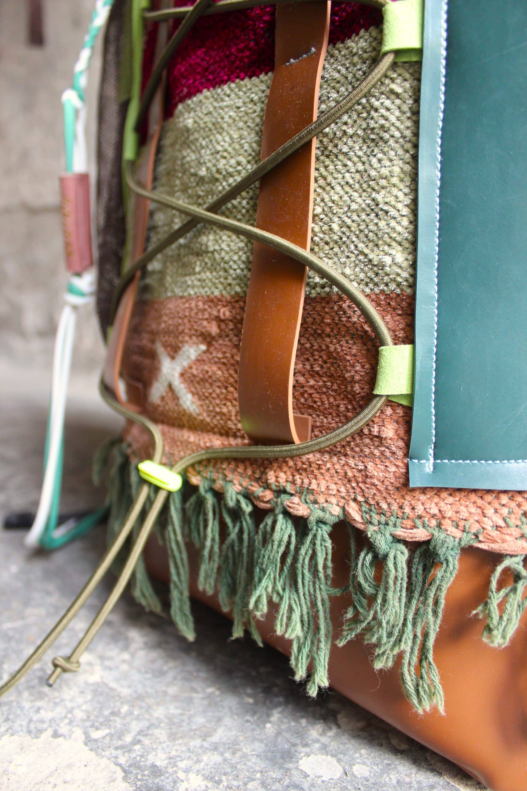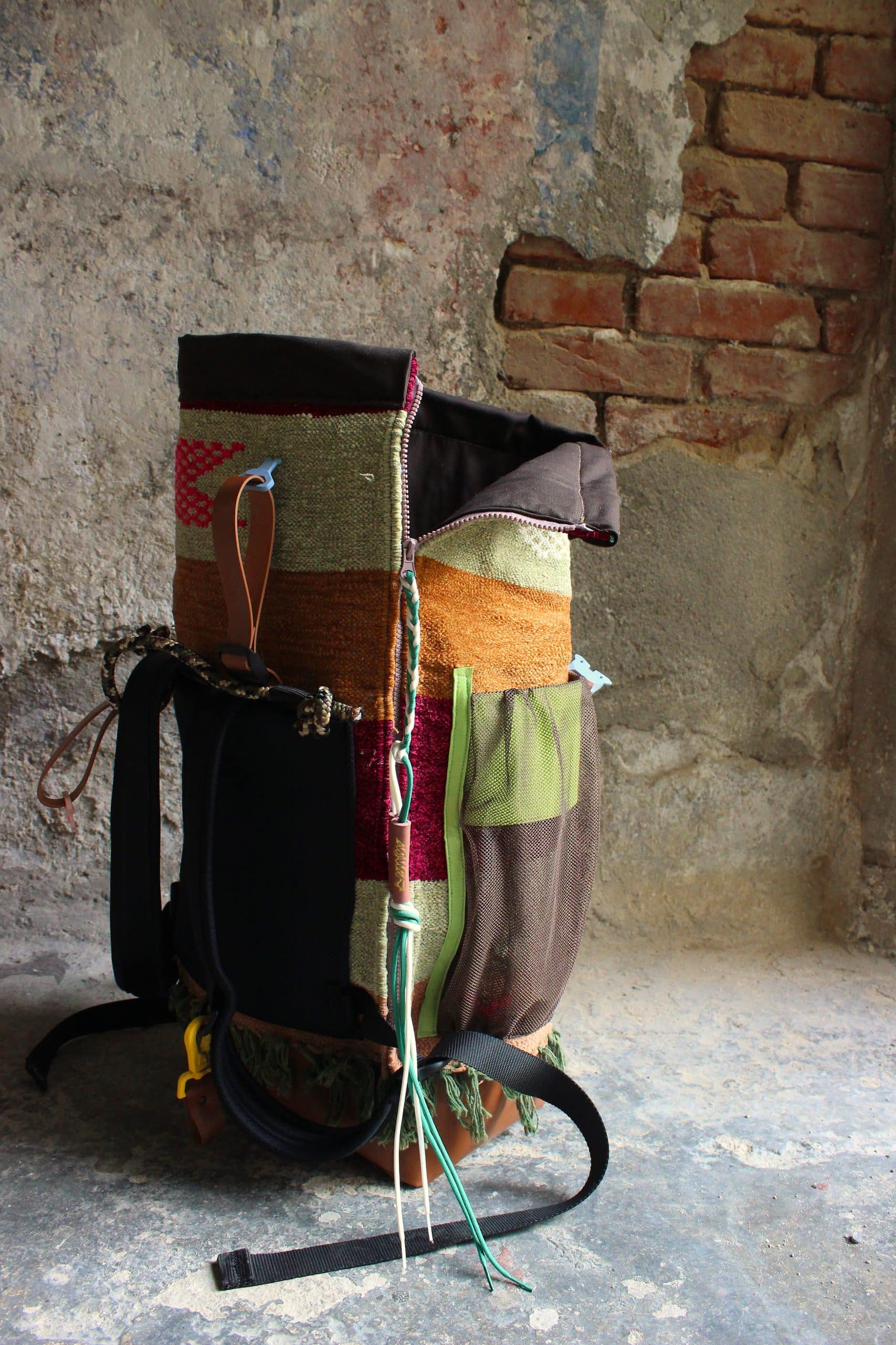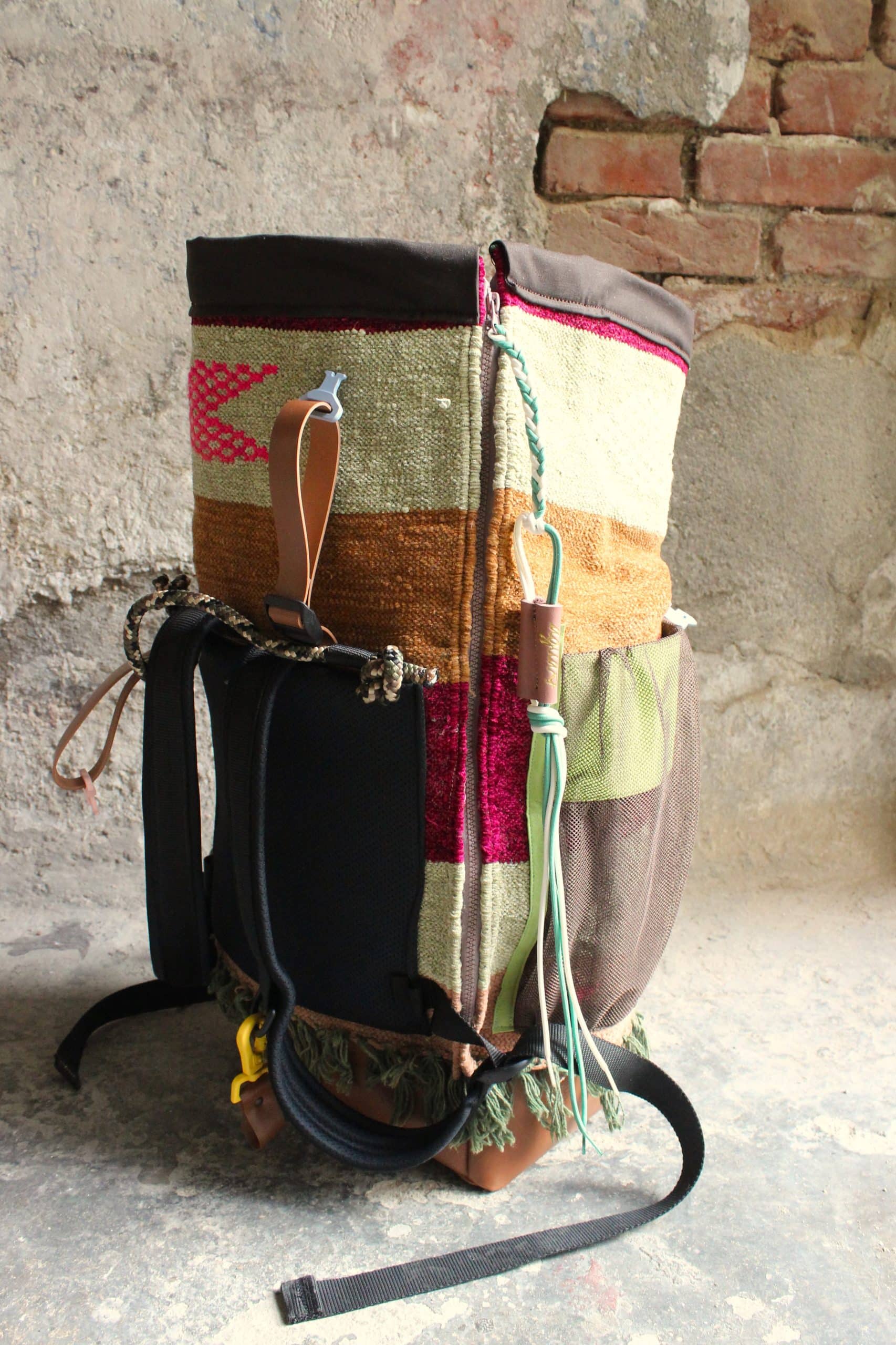 Zaino rolltop realizzato con tappeto berbero colorato, tessuto a mano acquistato ad Essaouira, e gomma riciclata recuperata dai leftovers di VIBRAM.