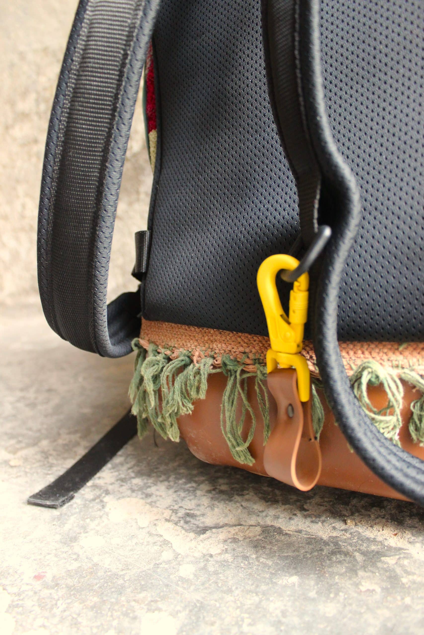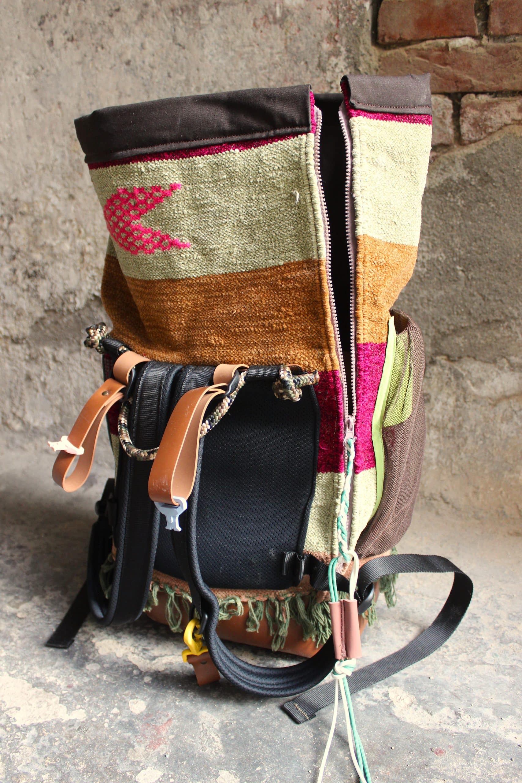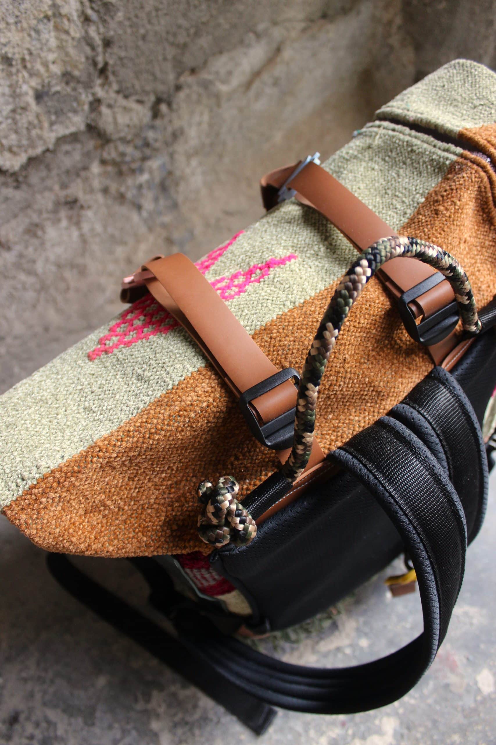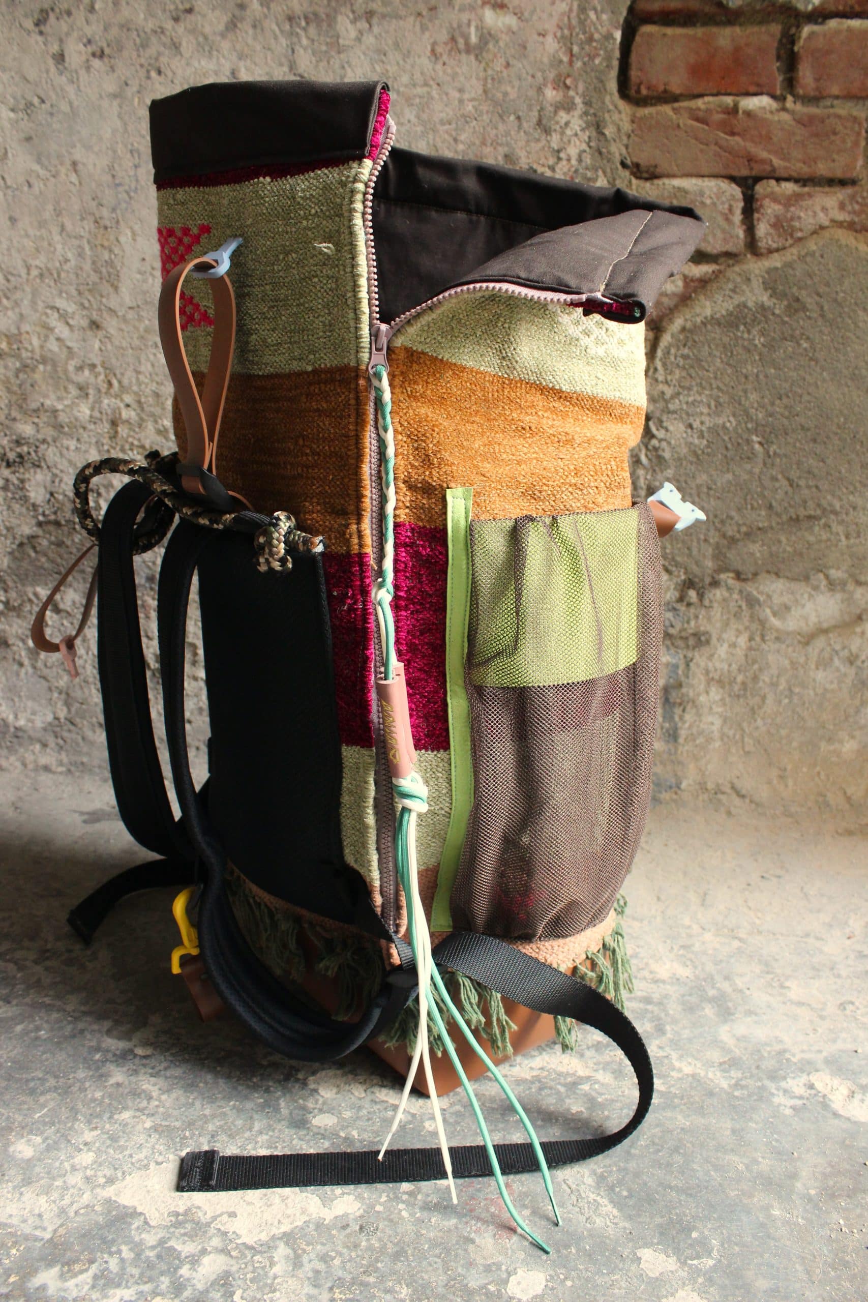 Zaino rolltop realizzato con tappeto berbero colorato, tessuto a mano acquistato ad Essaouira, e gomma riciclata recuperata dai leftovers di VIBRAM.