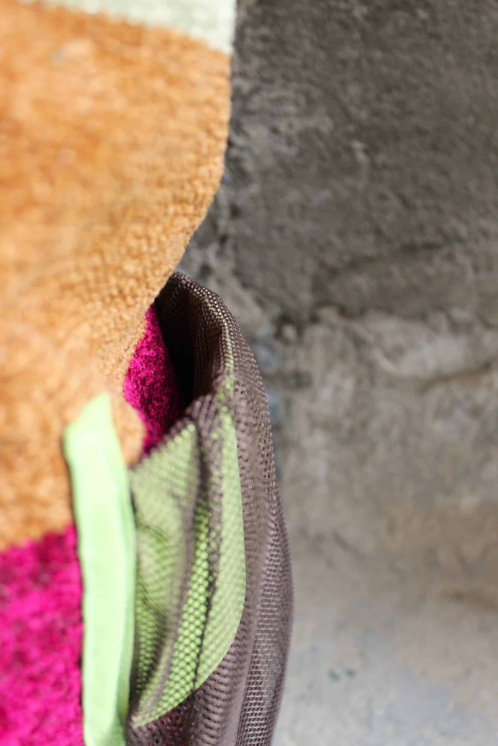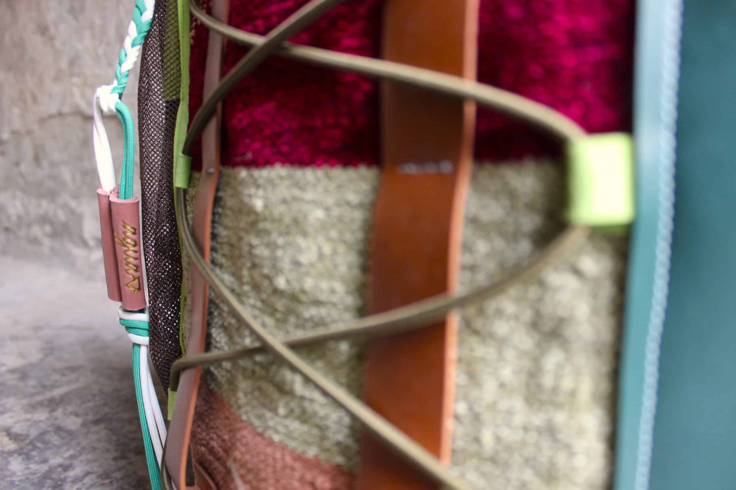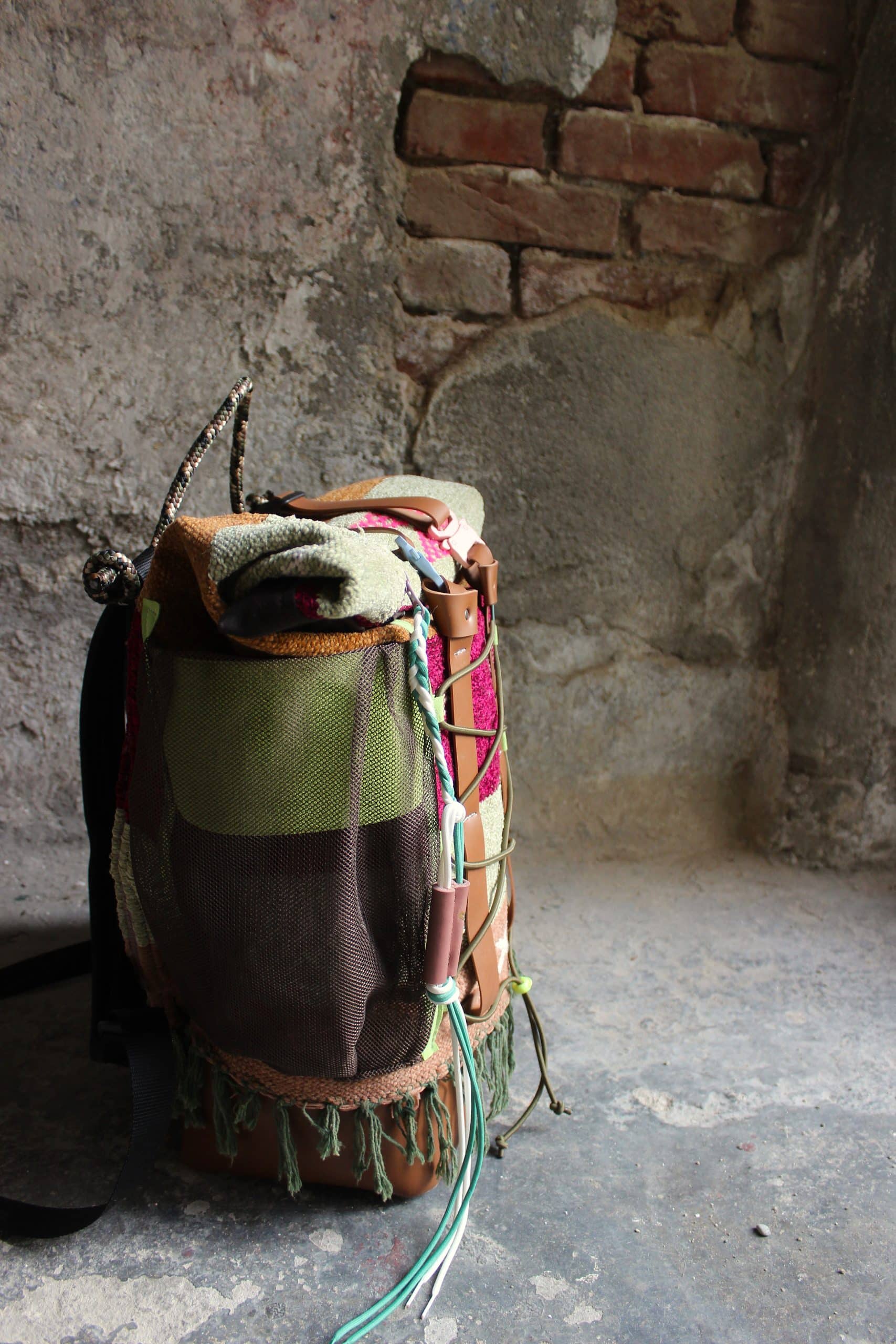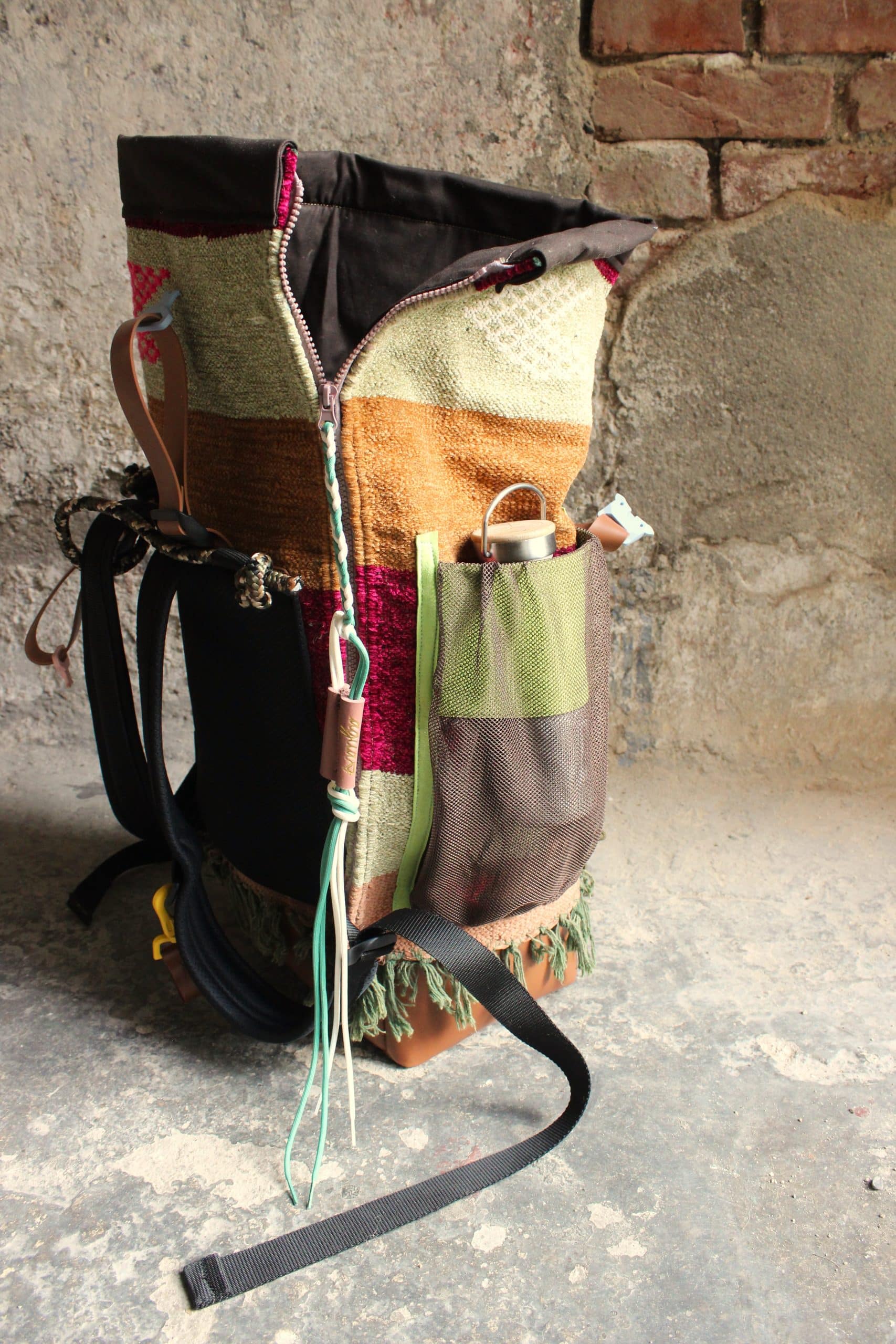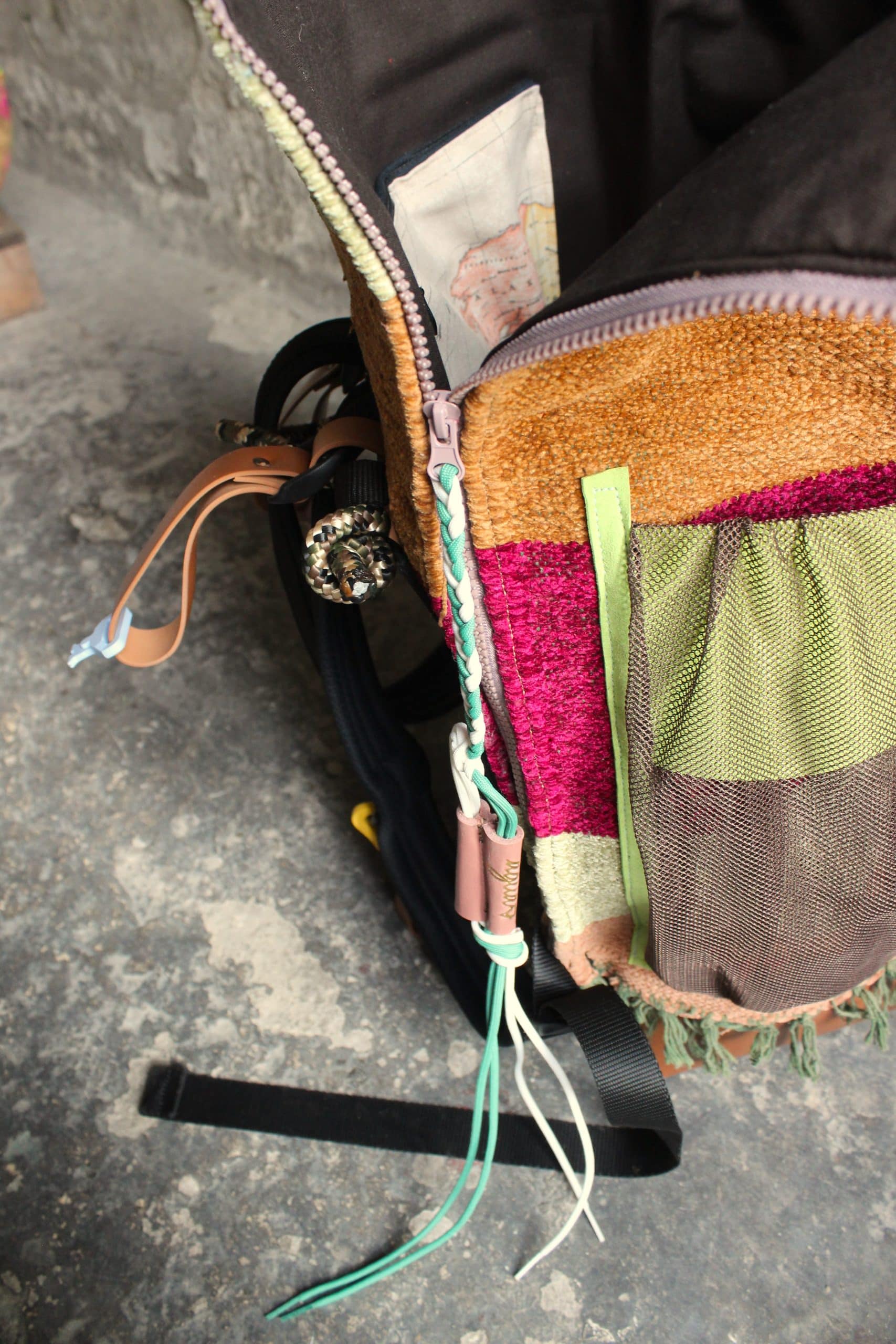 Zaino rolltop realizzato con tappeto berbero colorato, tessuto a mano acquistato ad Essaouira, e gomma riciclata recuperata dai leftovers di VIBRAM.