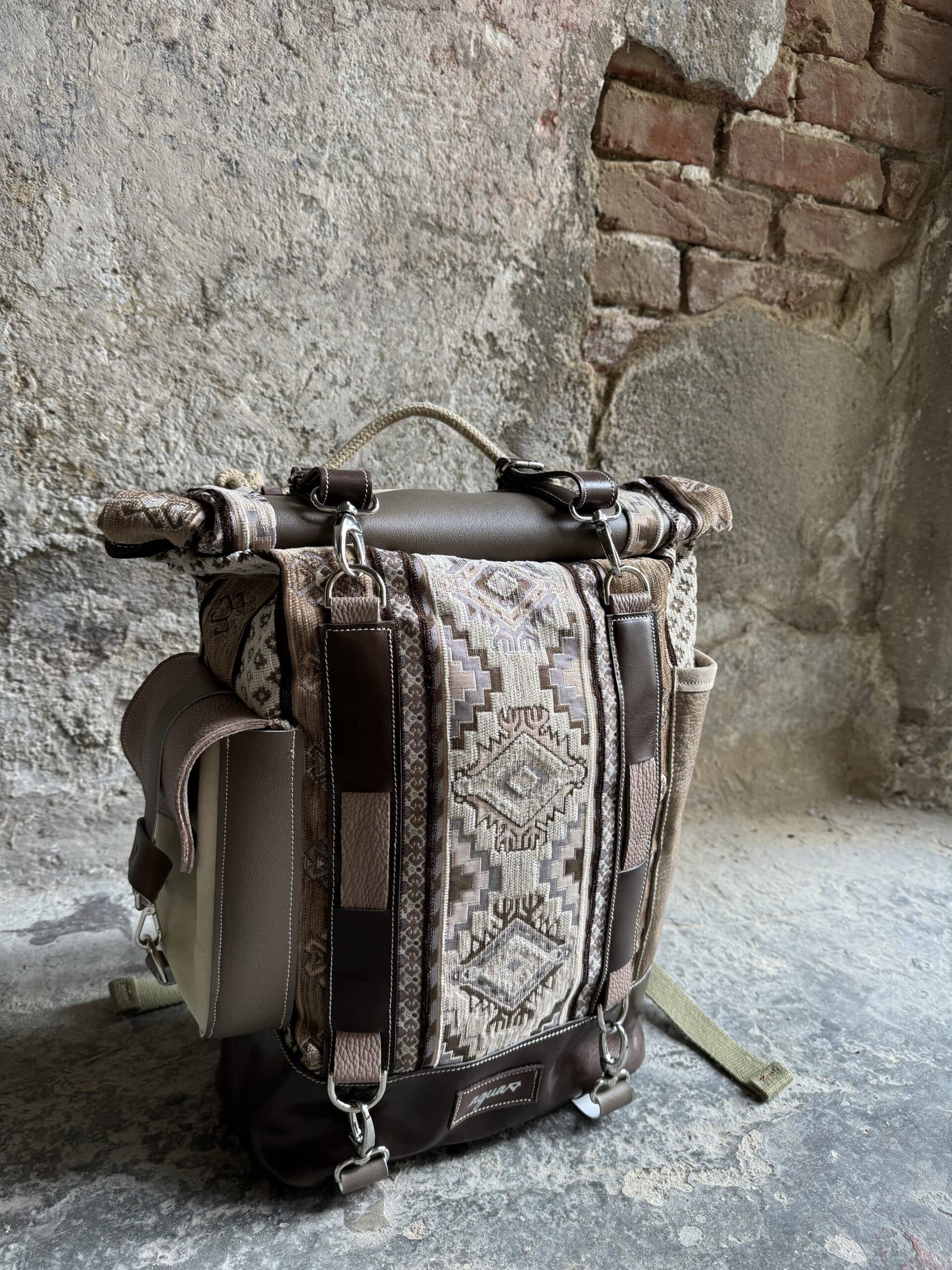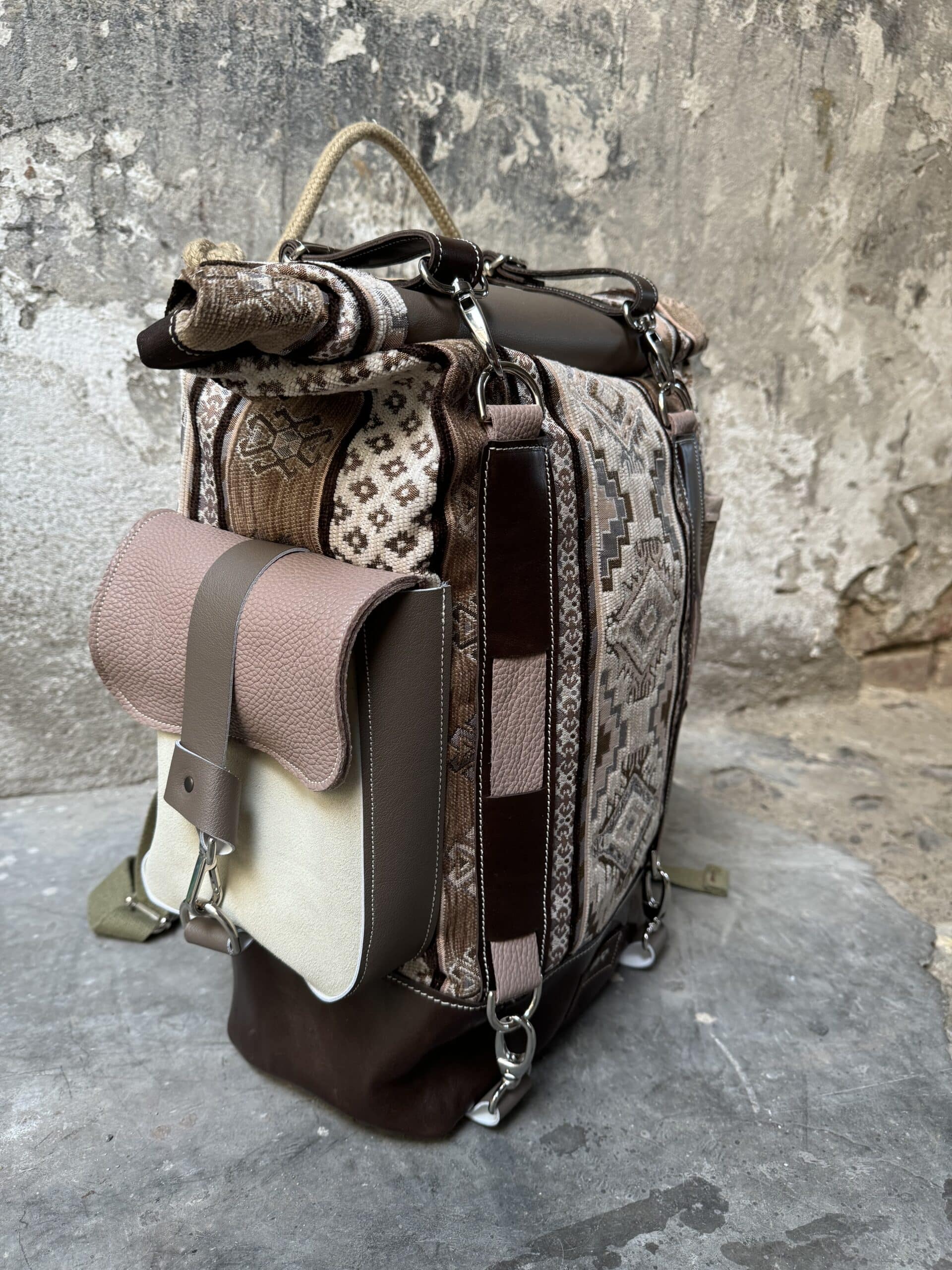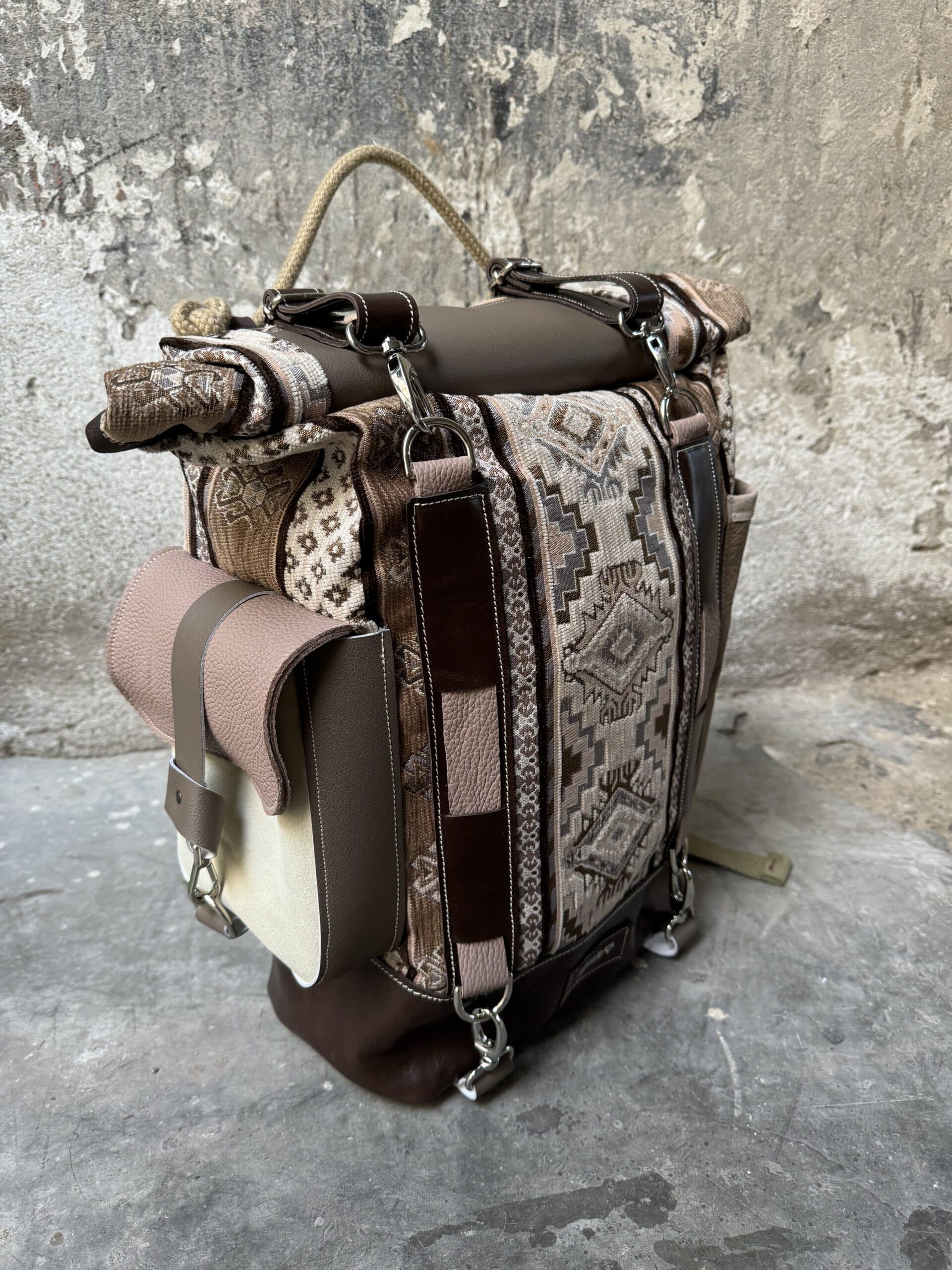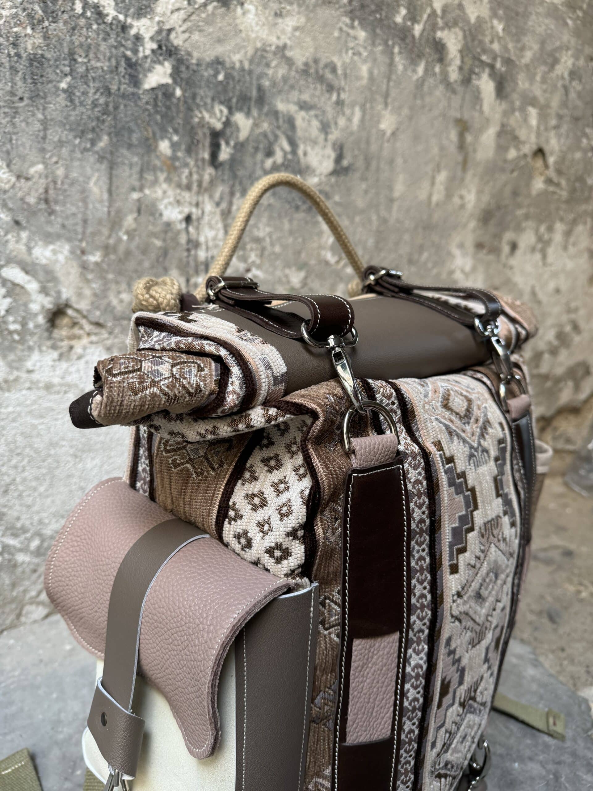 Zaino in tessuto turco stile Kilim e pellami misti. Chiusura con moschettoni argentati, cinghie frontali regolabili.
