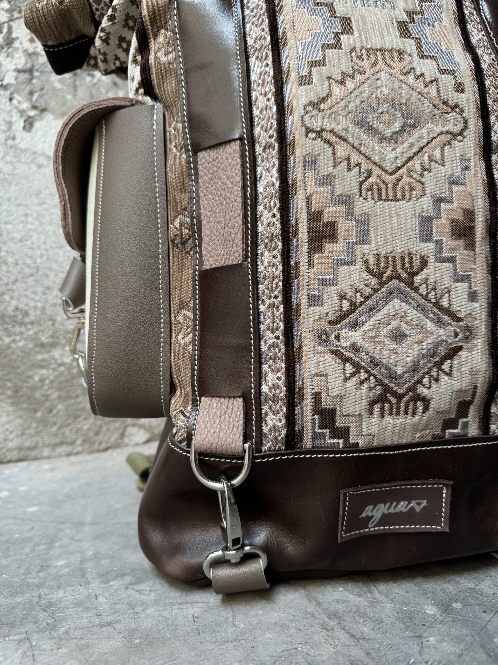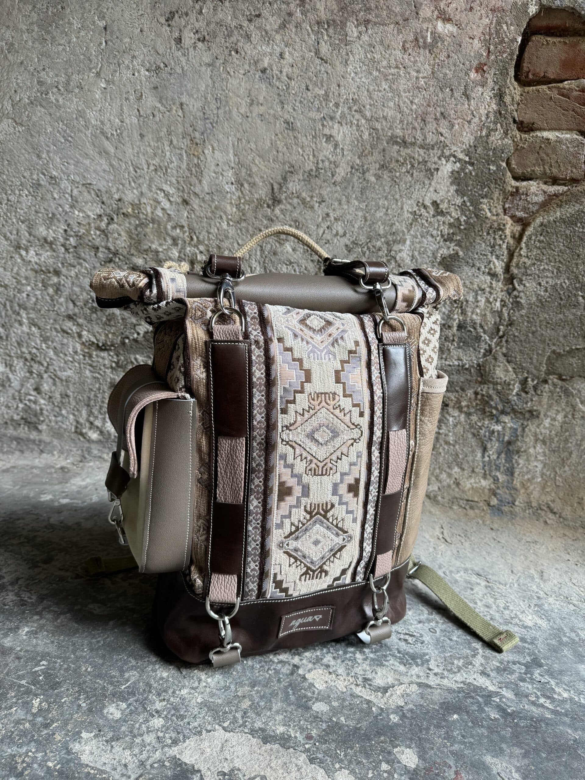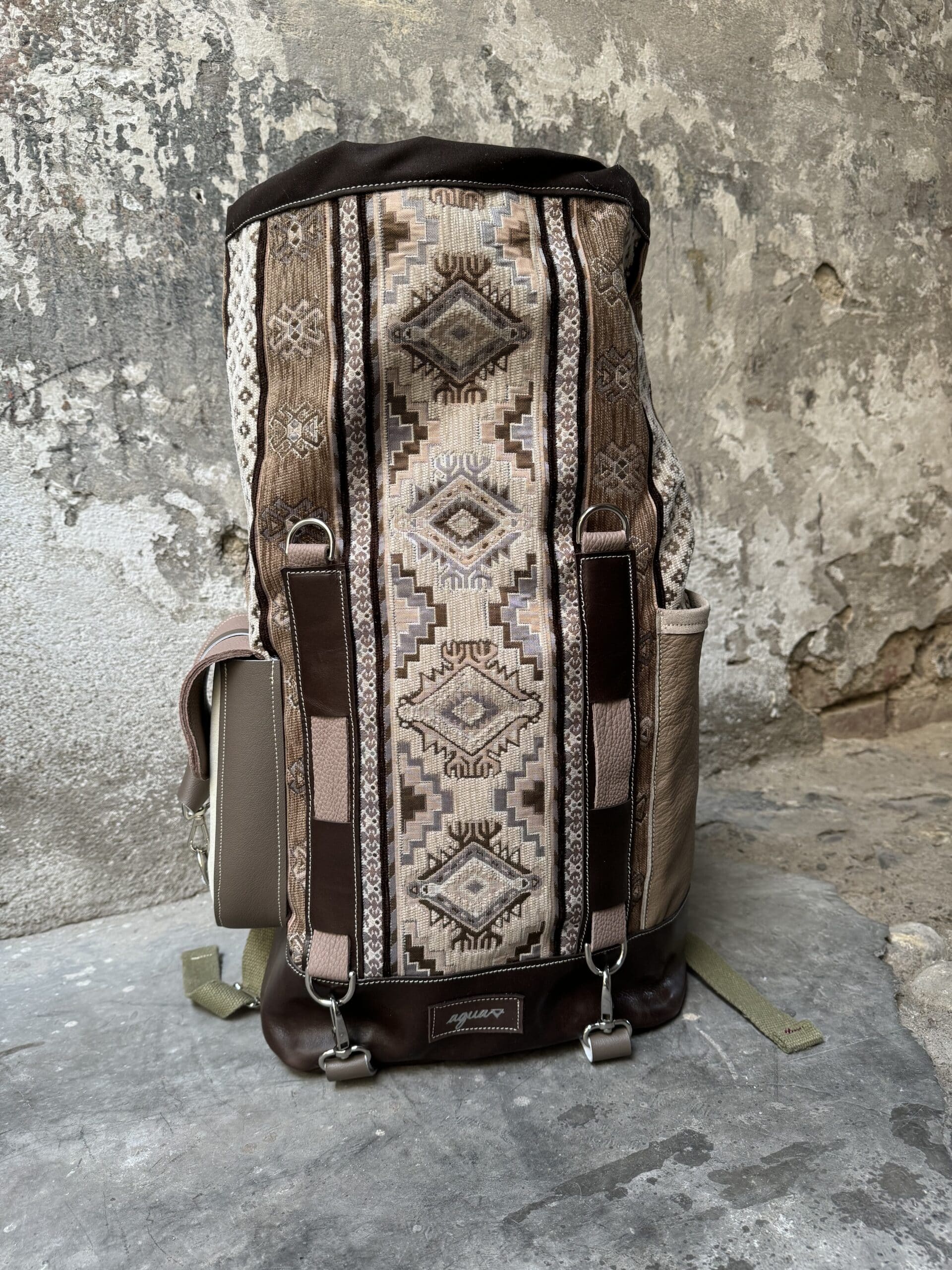 Zaino in tessuto turco stile Kilim e pellami misti. Chiusura con moschettoni argentati, cinghie frontali regolabili.
