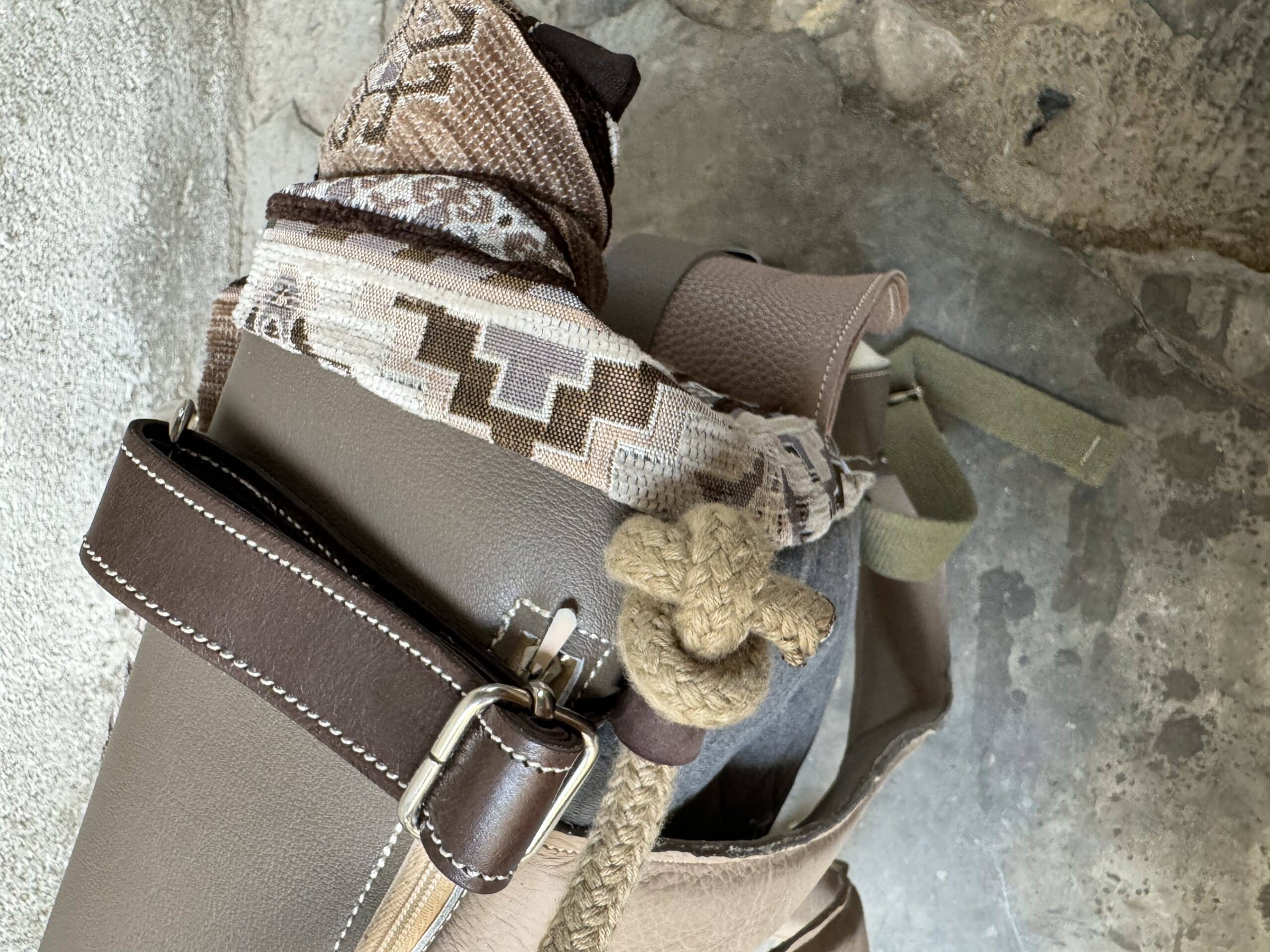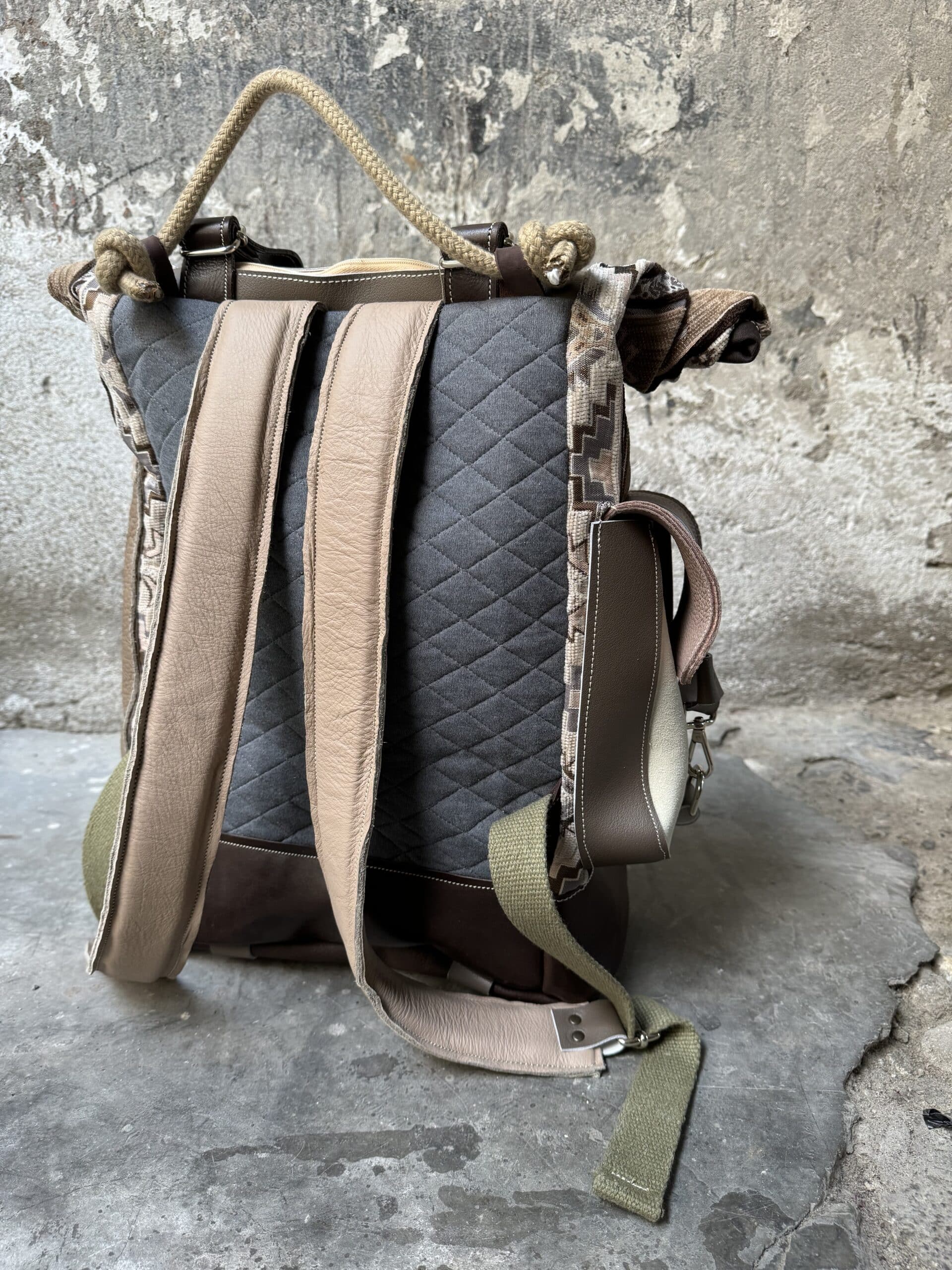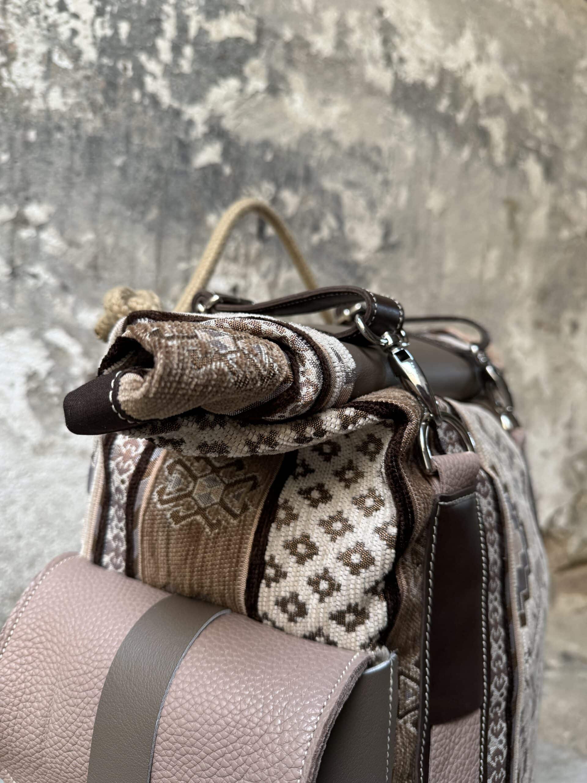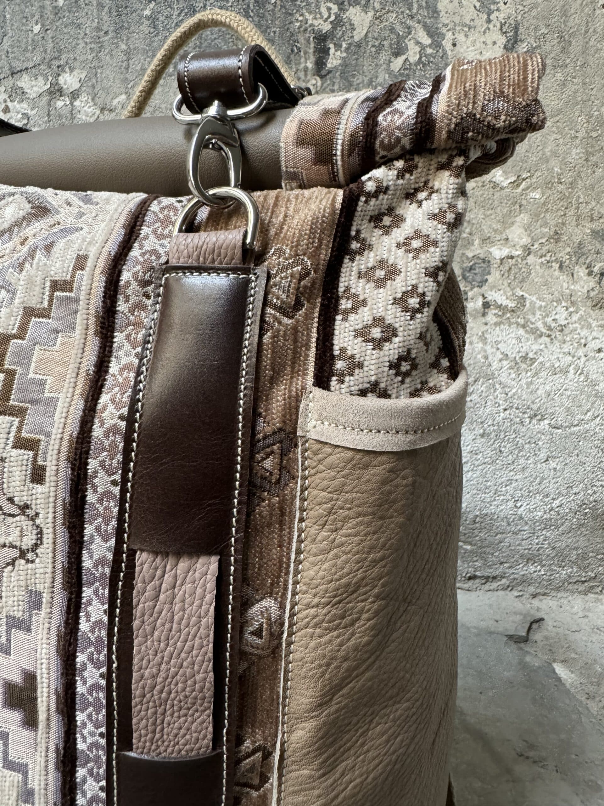 Zaino in tessuto turco stile Kilim e pellami misti. Chiusura con moschettoni argentati, cinghie frontali regolabili.