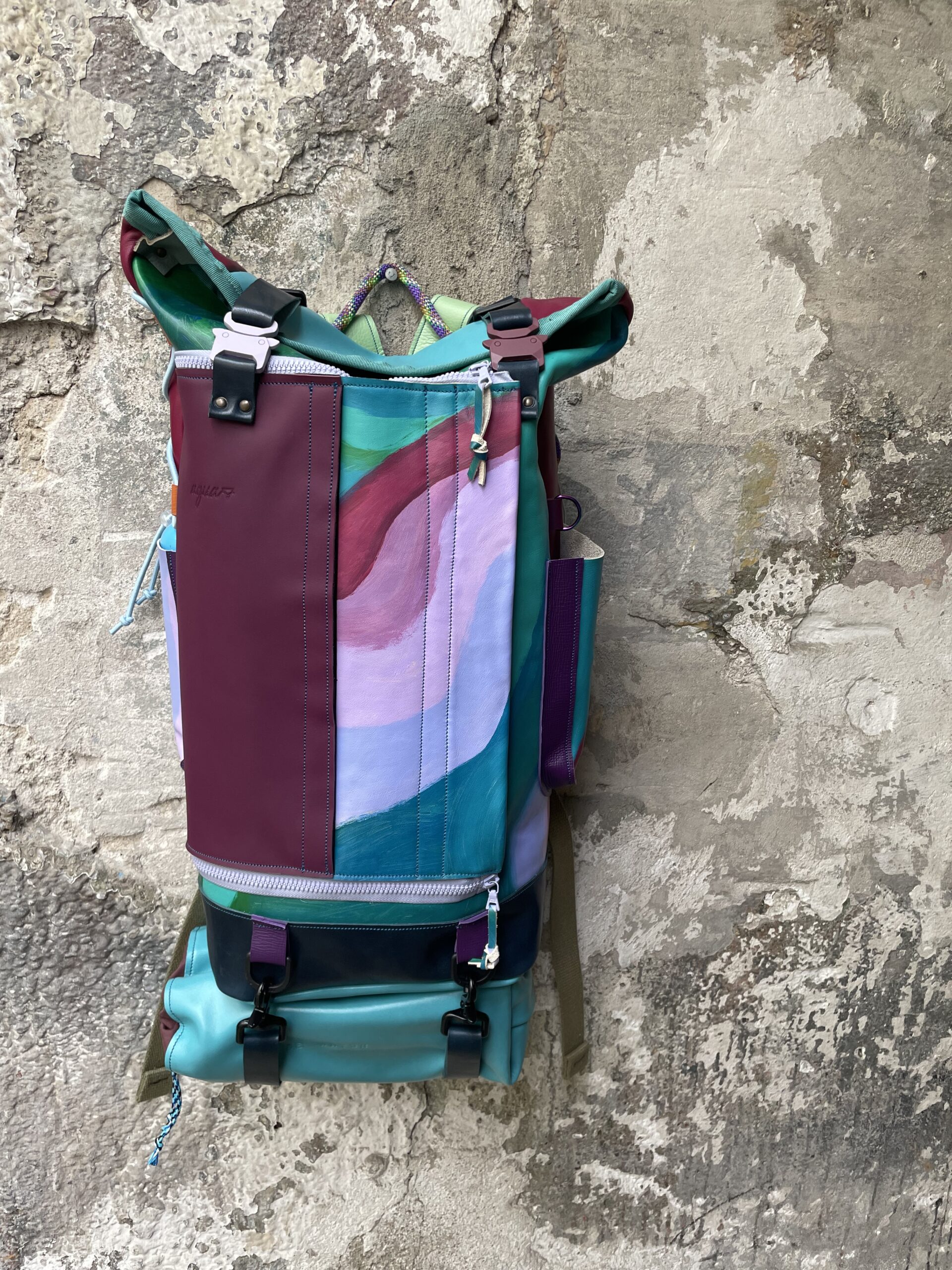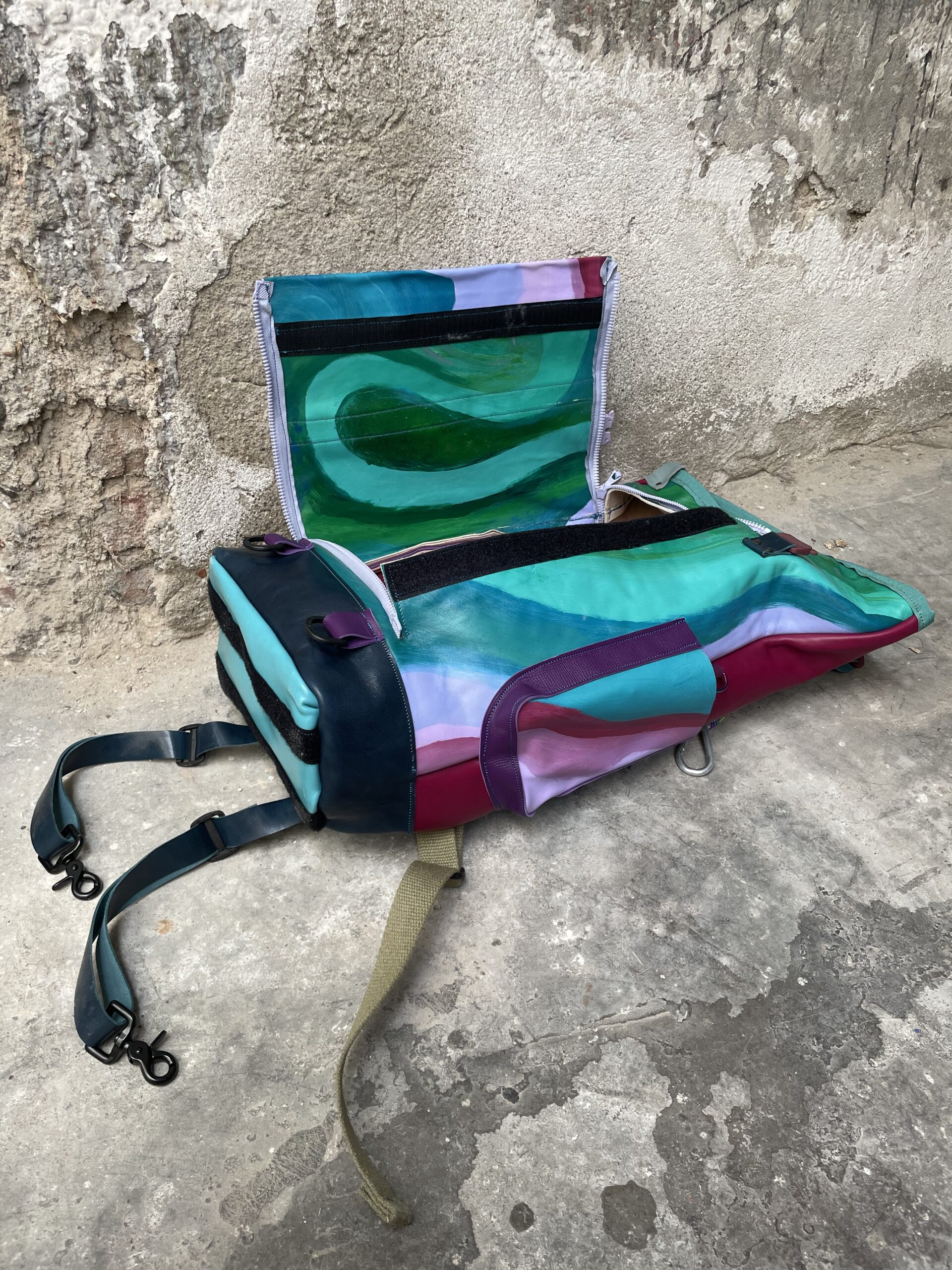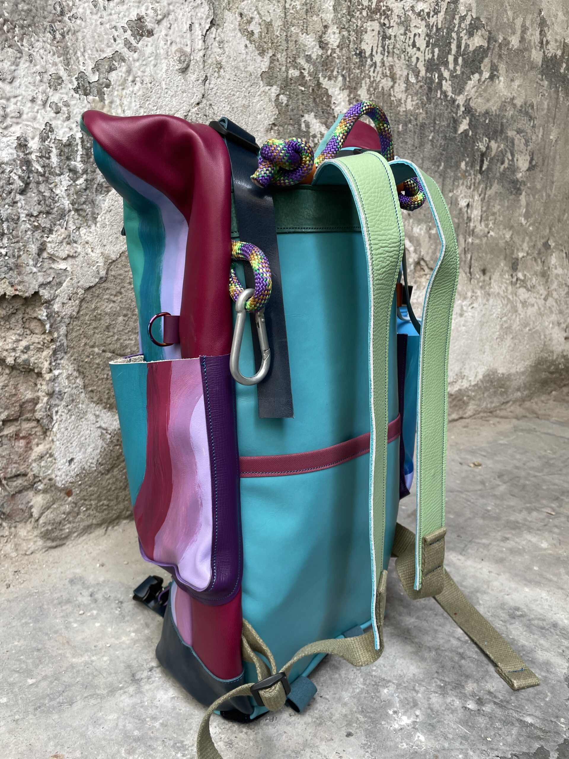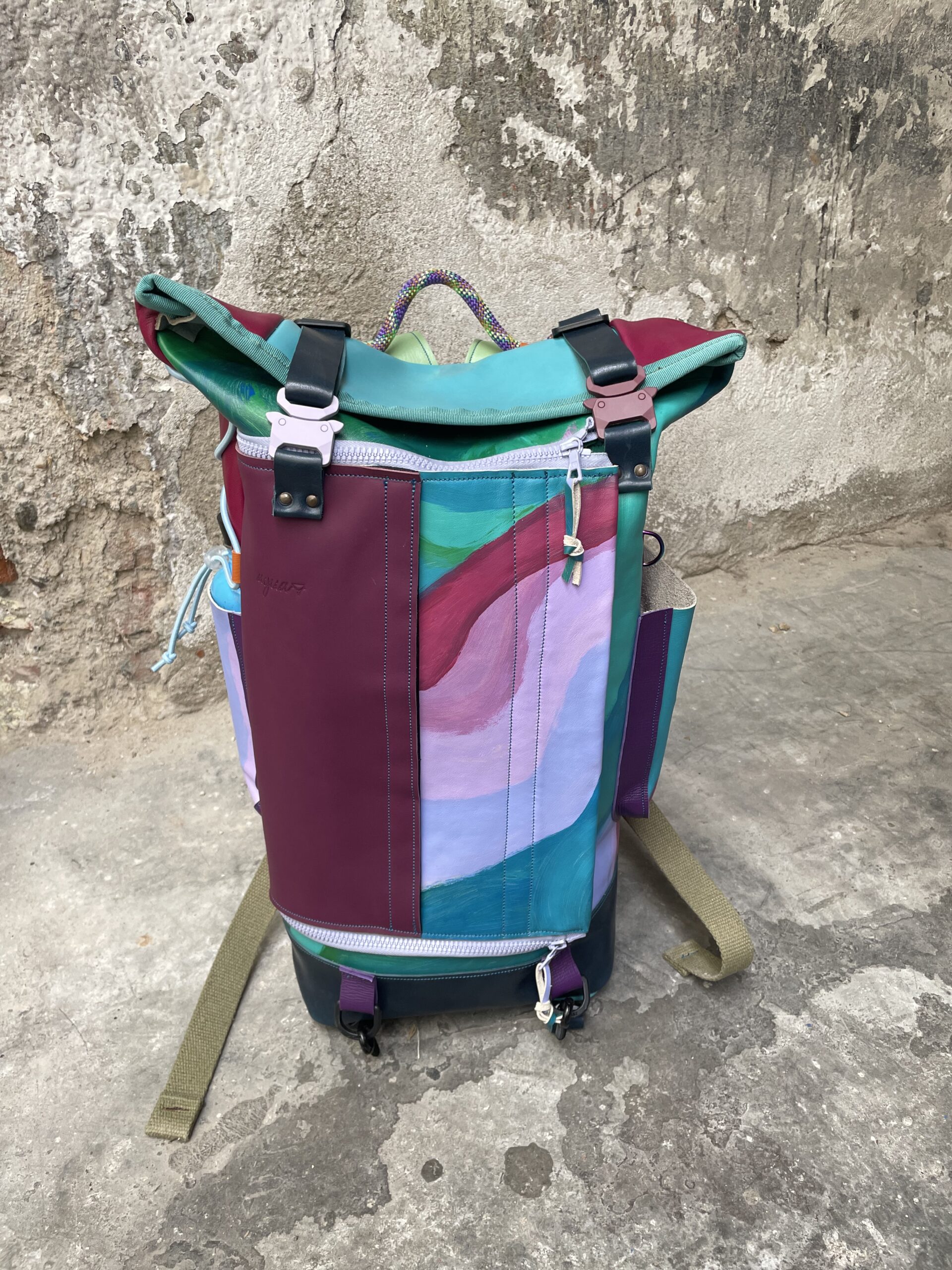 Zaino realizzato con tessuto artigianale asiatico in cotone e pellami recuperati. Chiusura rolltop e apertura frontale con cerniera, tasca sul retro e tre tasche frontali. All’interno sono presenti due tasche interne laterali ed una sullo schienale, imbottita ed adatta al pc.