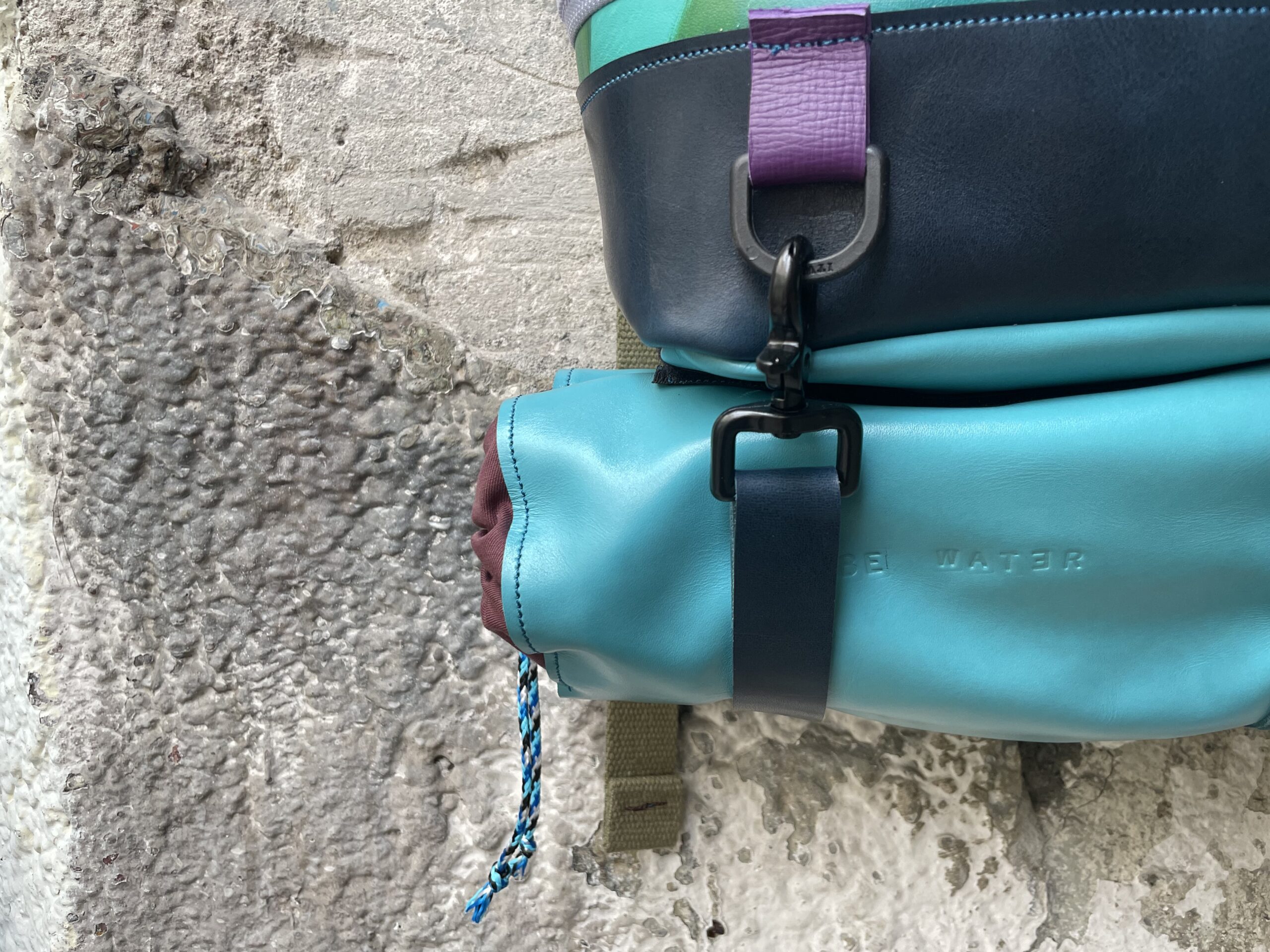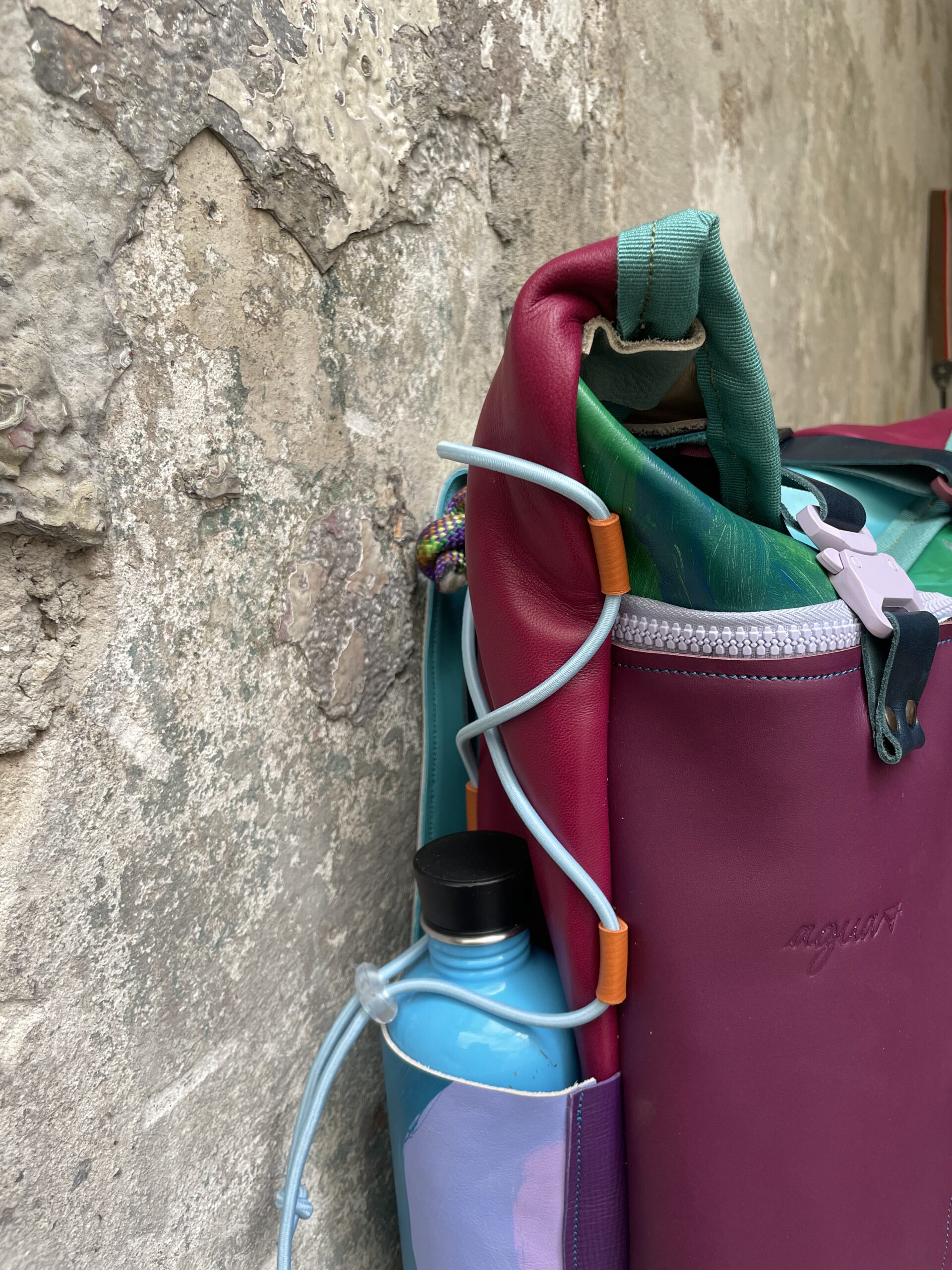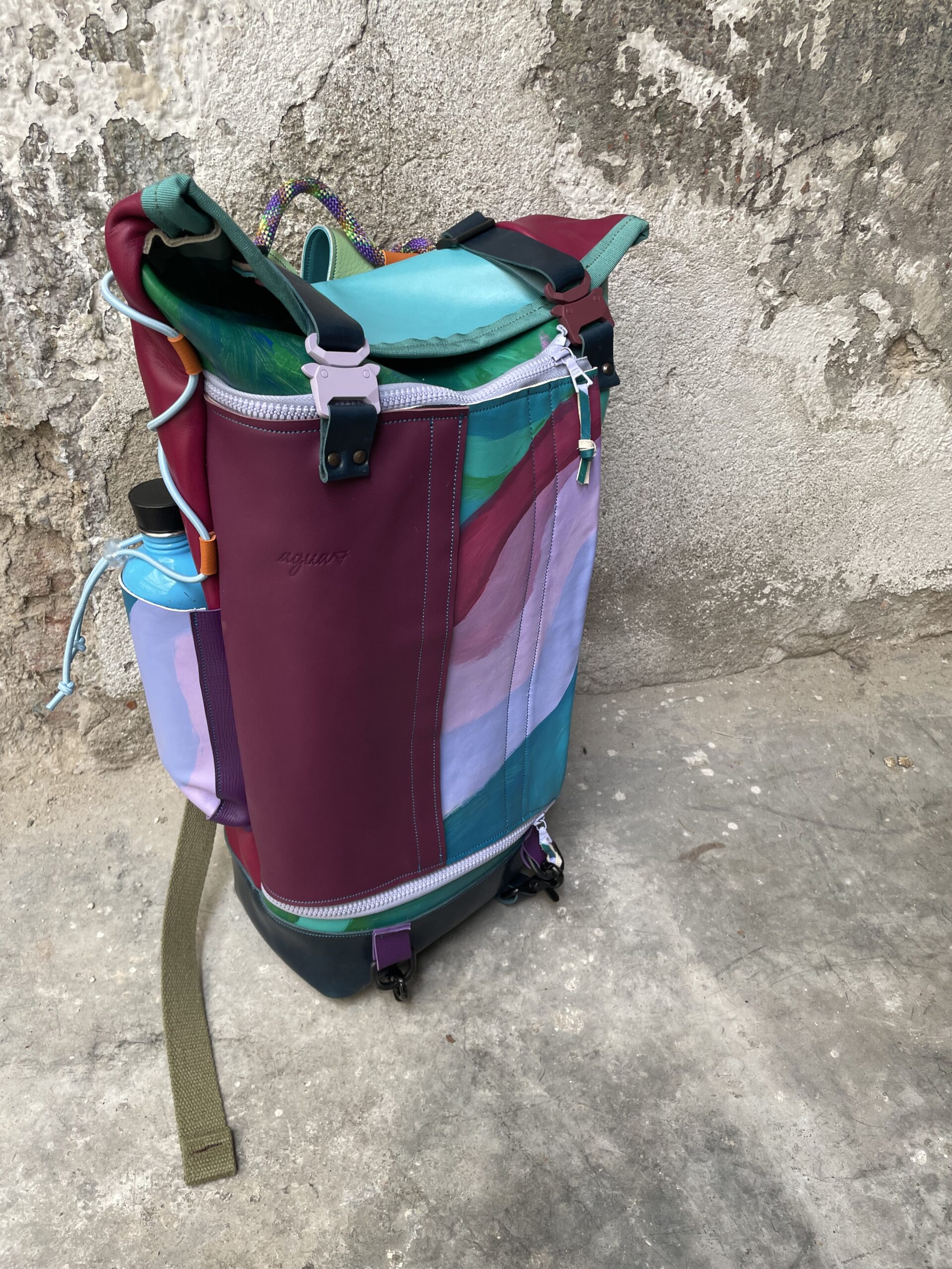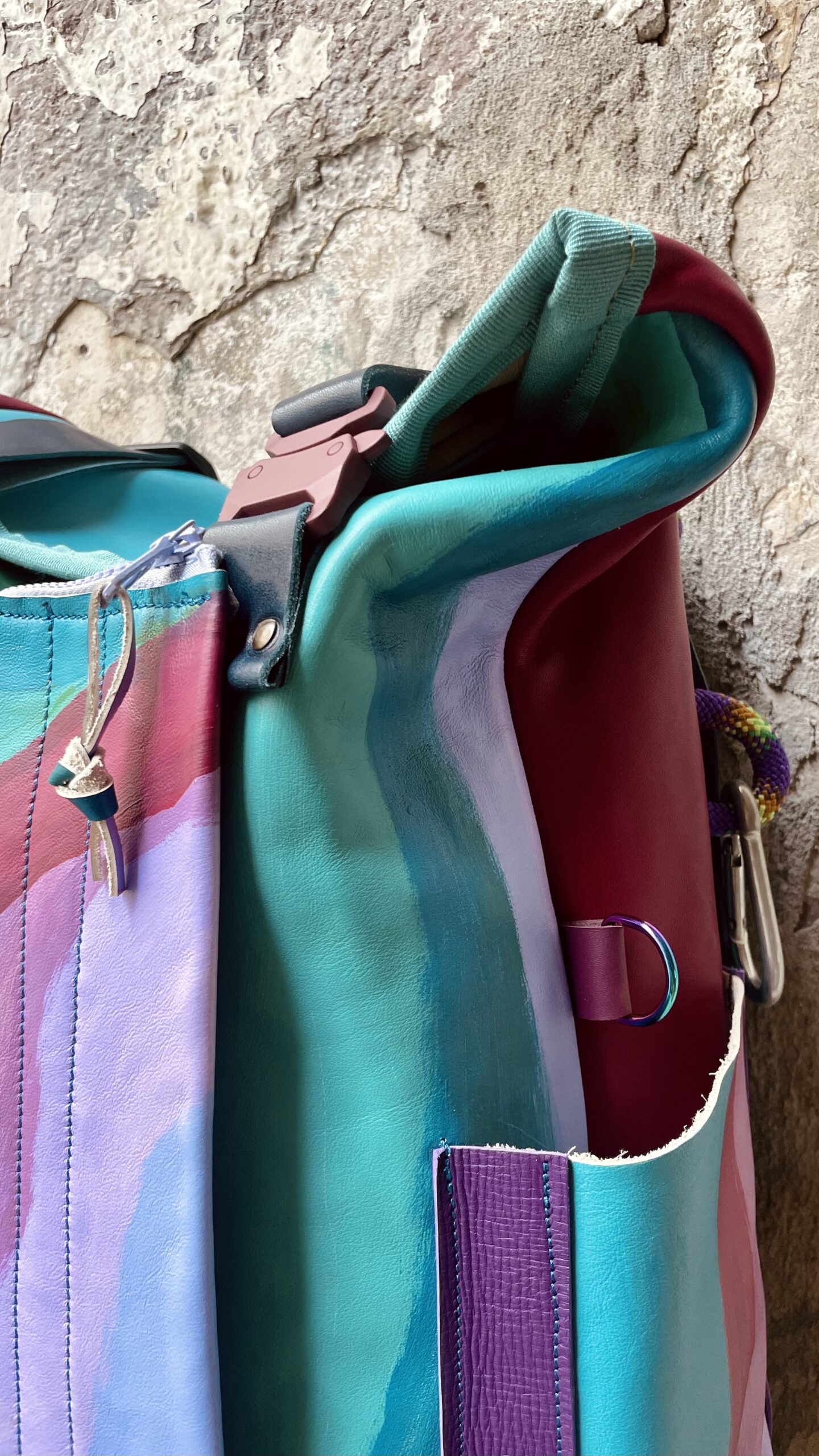 Zaino realizzato con tessuto artigianale asiatico in cotone e pellami recuperati. Chiusura rolltop e apertura frontale con cerniera, tasca sul retro e tre tasche frontali. All’interno sono presenti due tasche interne laterali ed una sullo schienale, imbottita ed adatta al pc.