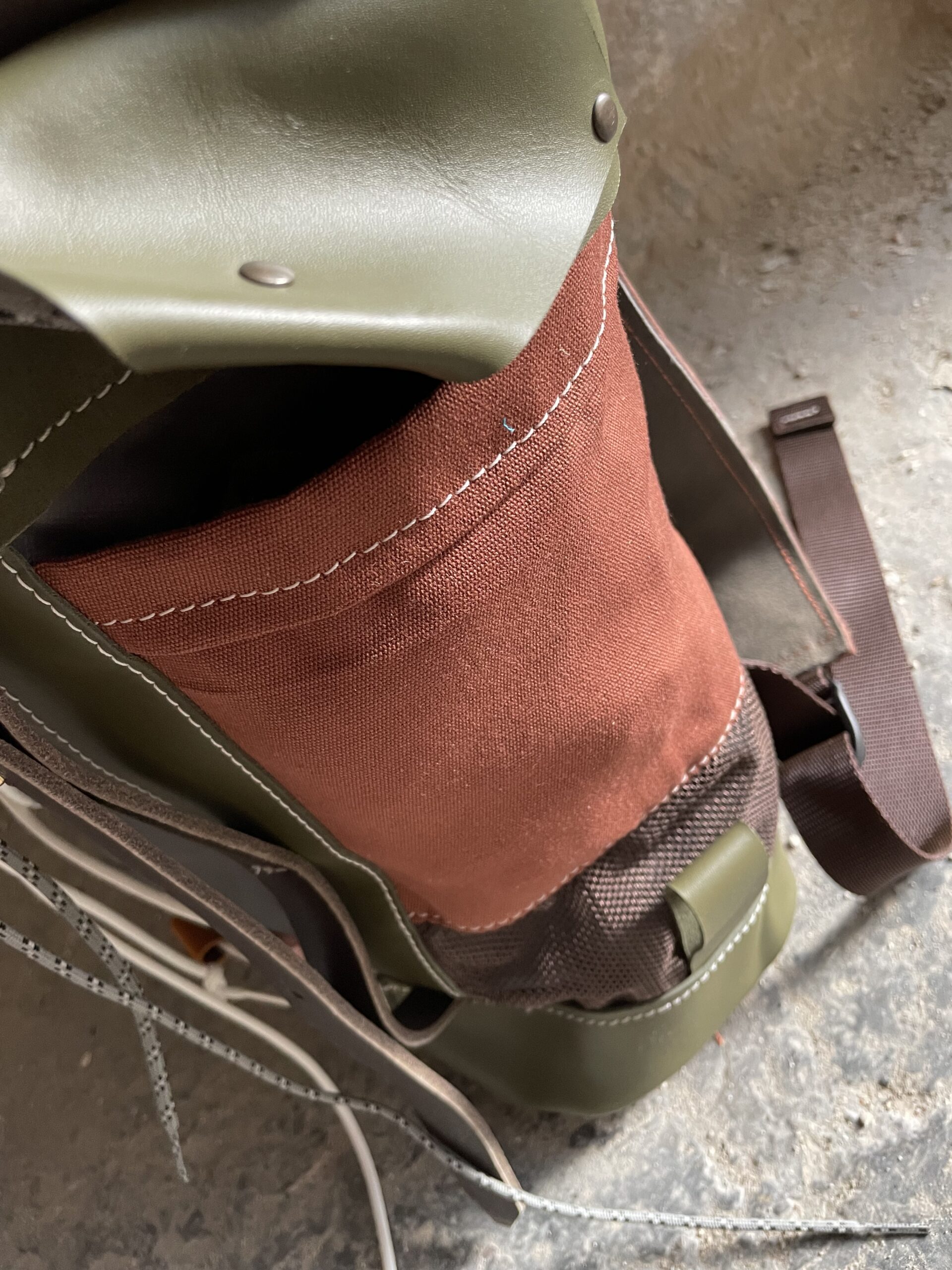 Due tasche laterali, una in tessuto retato con stampa della cartina di Bologna, elastica ed espandibile, l’altra in tessuto canva color mattone con chiusura a patta con laccio sportivo e dettaglio retina.