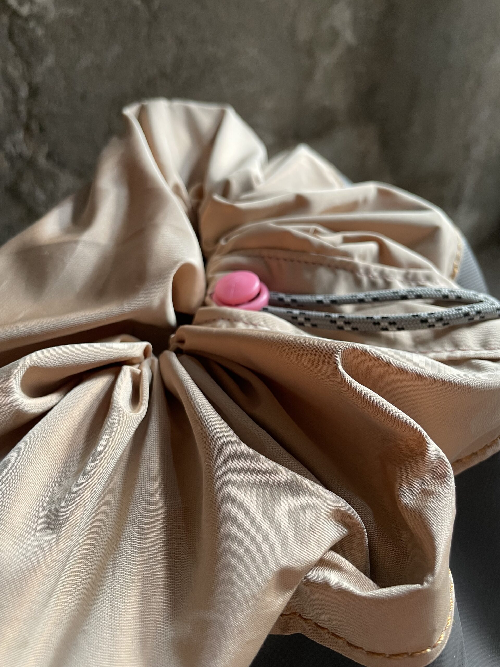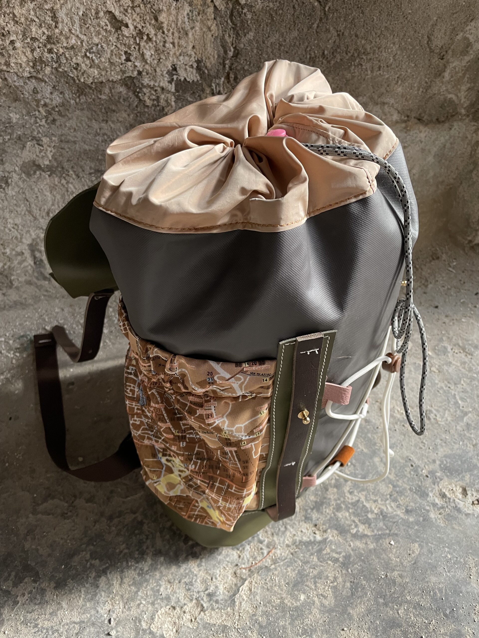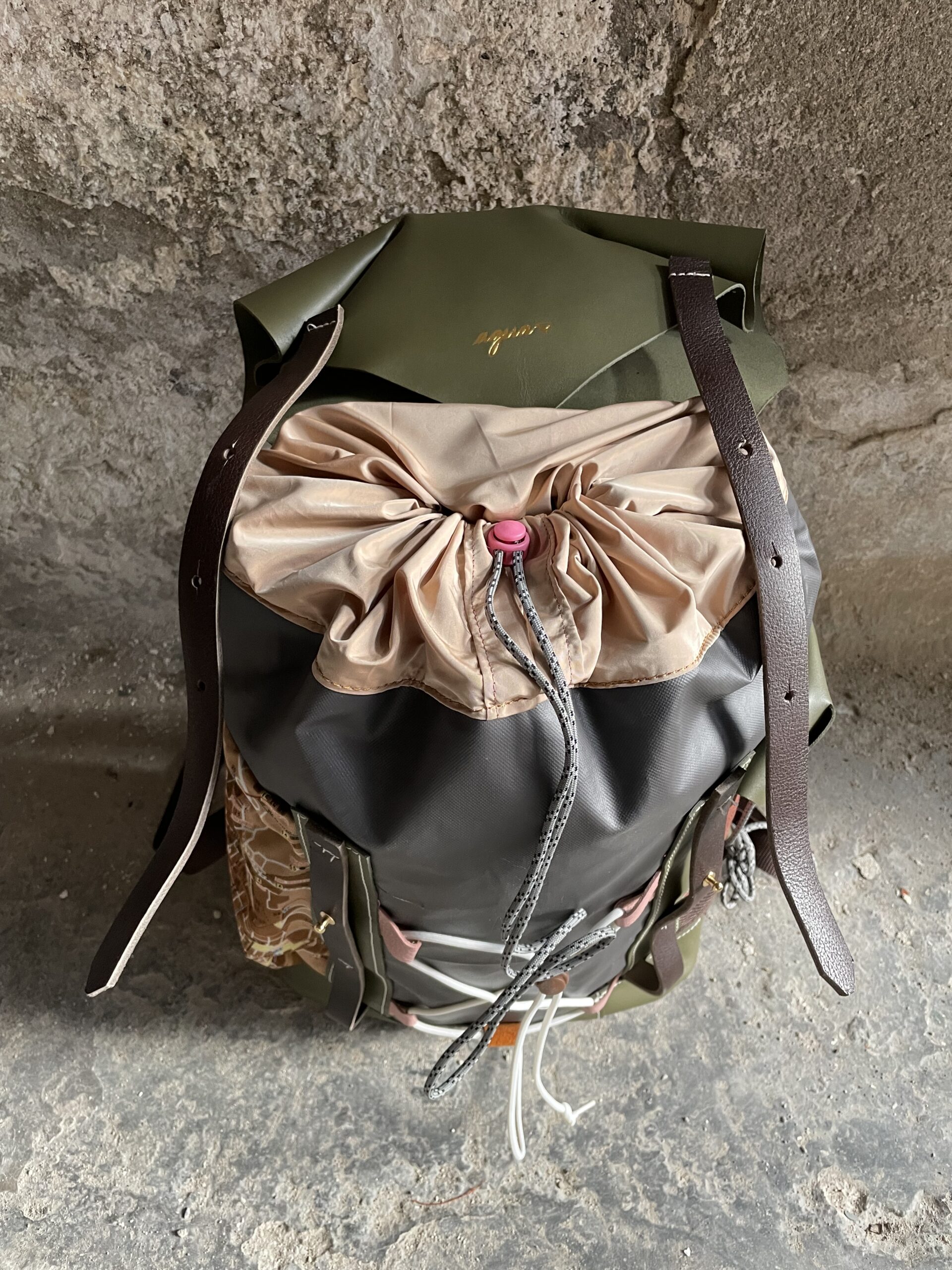 Zaino con chiusura a coulisse (in nylon color rosa cipria) e patta in pelle realizzato in tessuto impermeabile Cordura 600d e pellami misti, leftovers delle concerie italiane.