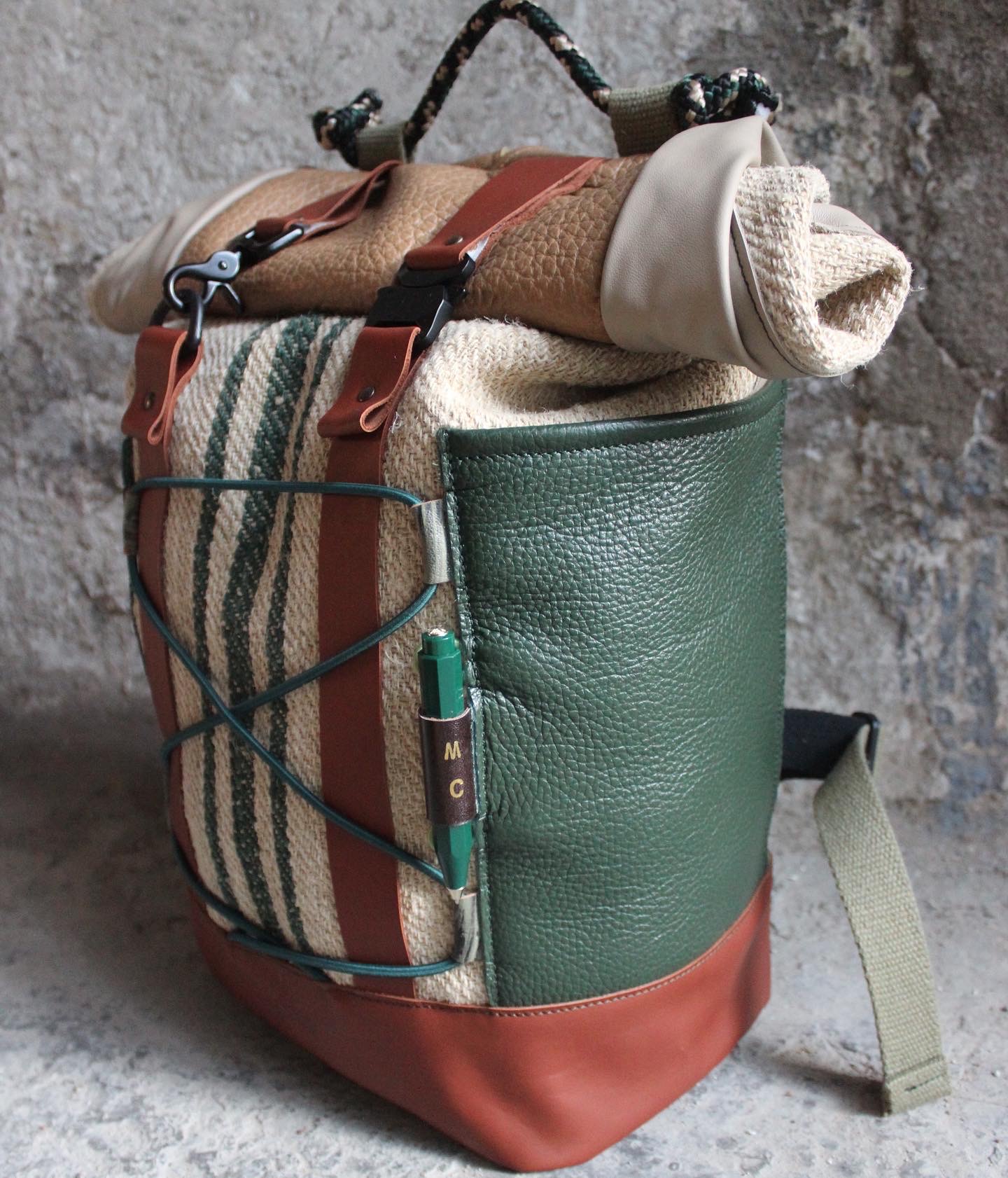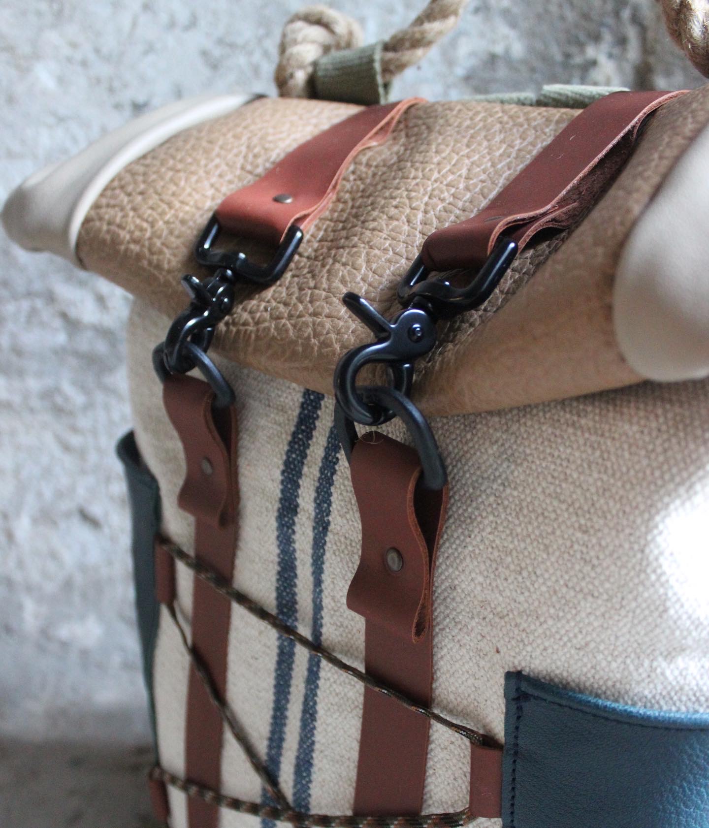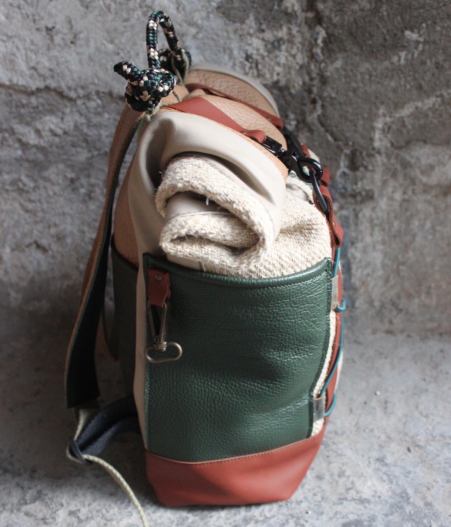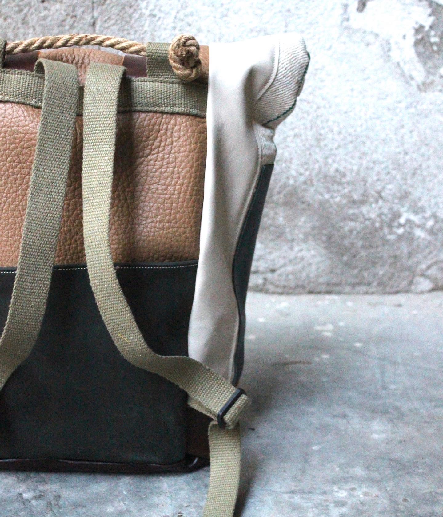 Zaino realizzato dal recupero di antichi sacchi in canapa francesi usati per la raccolta del grano, misto a pelle. Possibilità di tasche laterali con profilo e patta/chiusura o aderenti alla struttura. Tasca sullo schienale. Fodera interna in cotone 100% fantasia cartina geografica con tasca per computer.