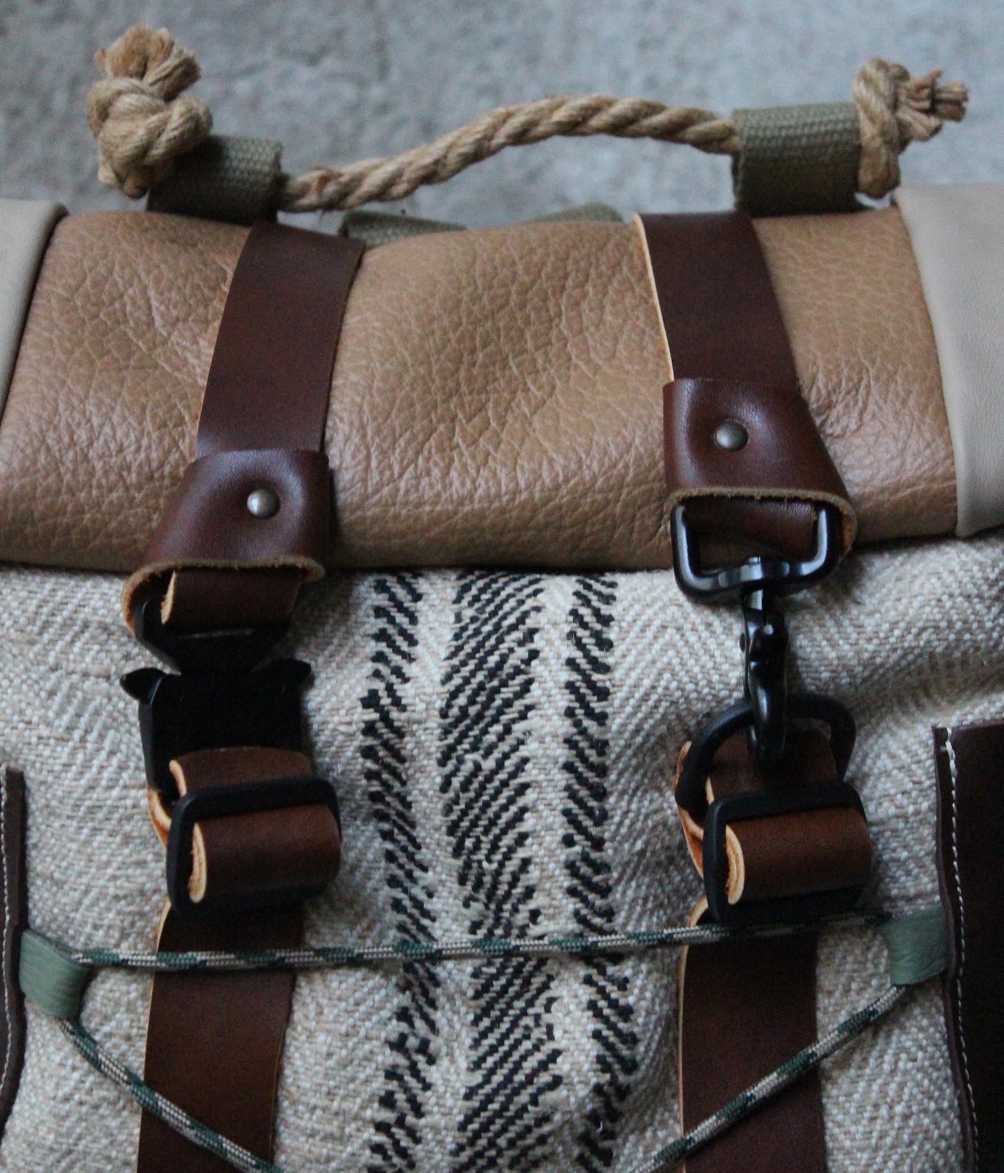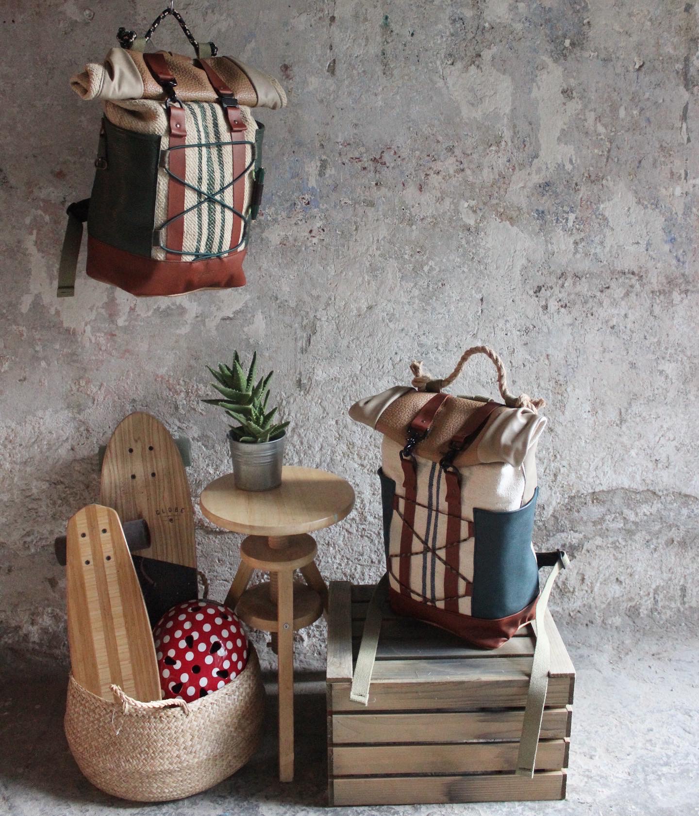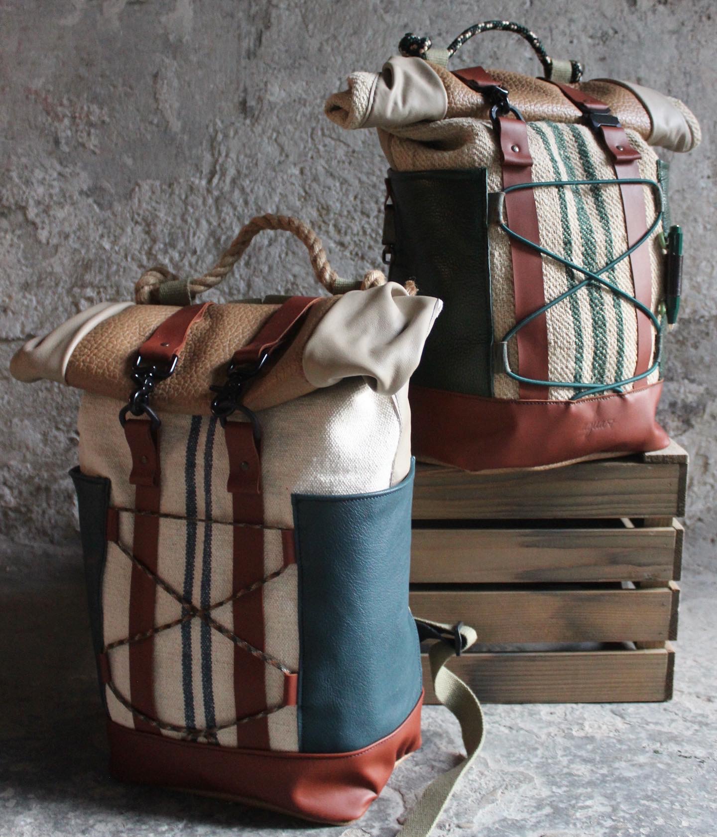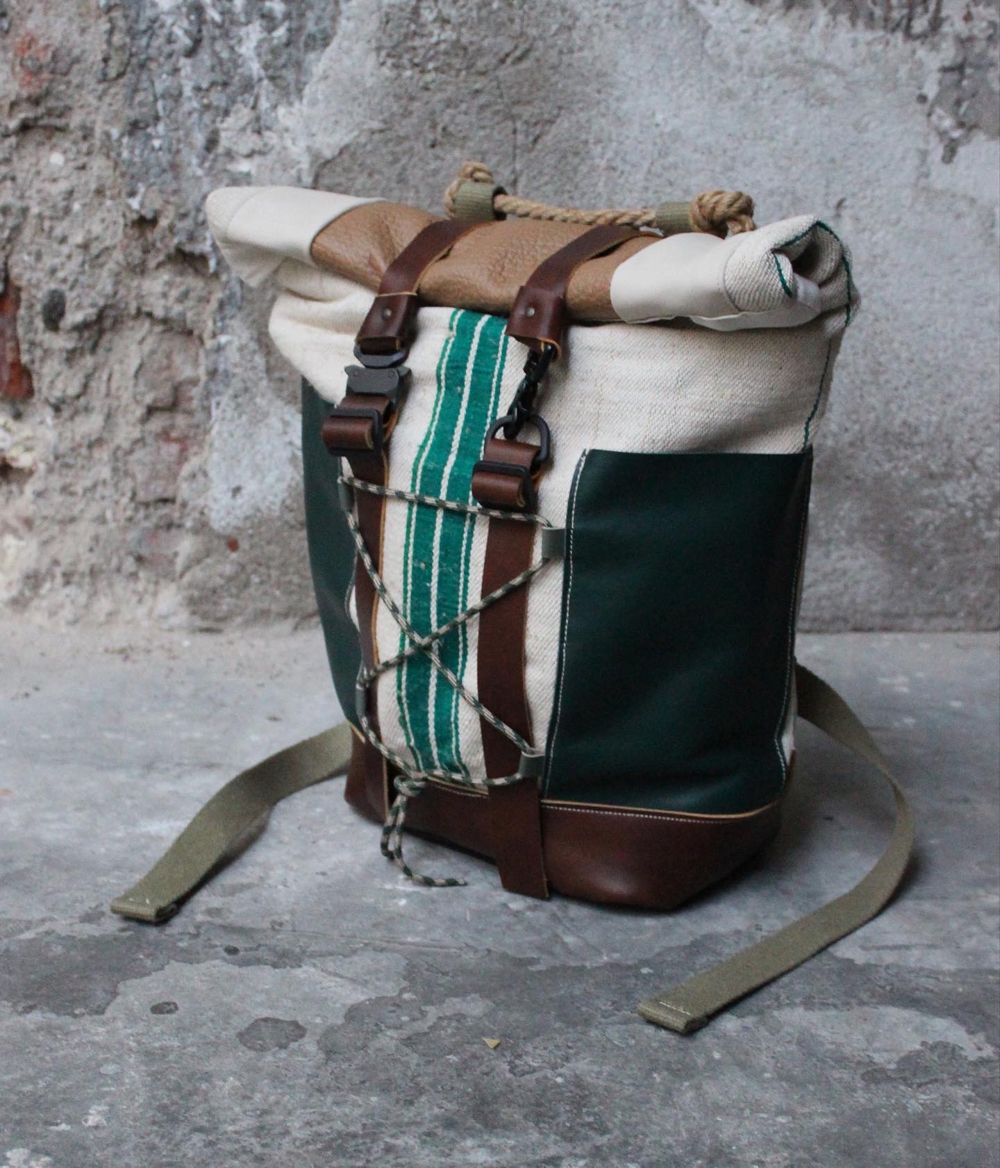 Zaino realizzato dal recupero di antichi sacchi in canapa francesi usati per la raccolta del grano, misto a pelle. Possibilità di tasche laterali con profilo e patta/chiusura o aderenti alla struttura. Tasca sullo schienale. Fodera interna in cotone 100% fantasia cartina geografica con tasca per computer.