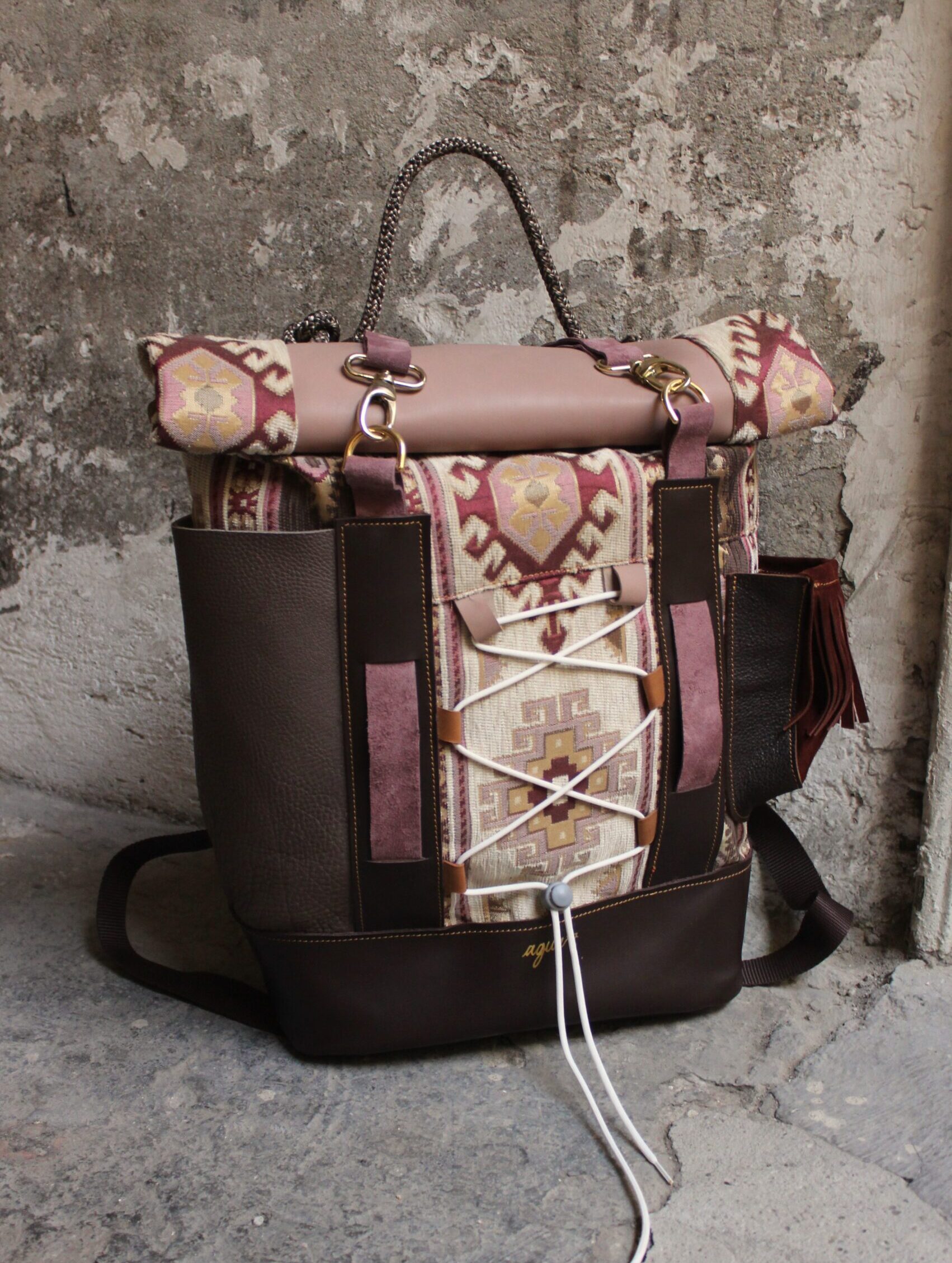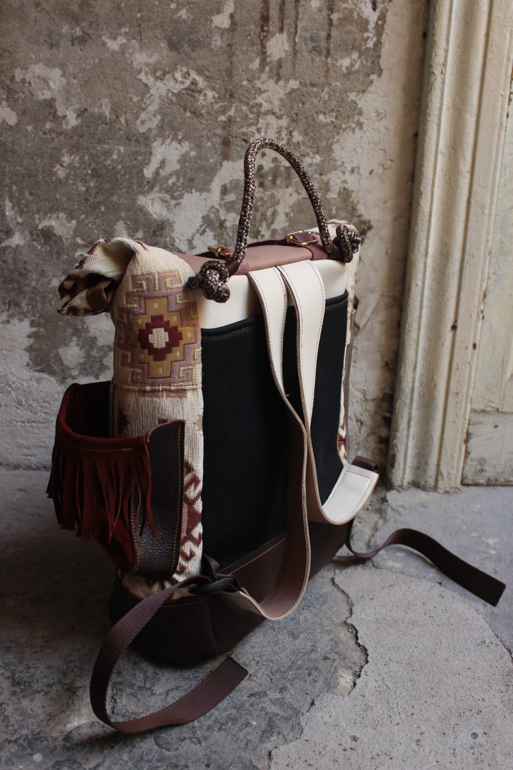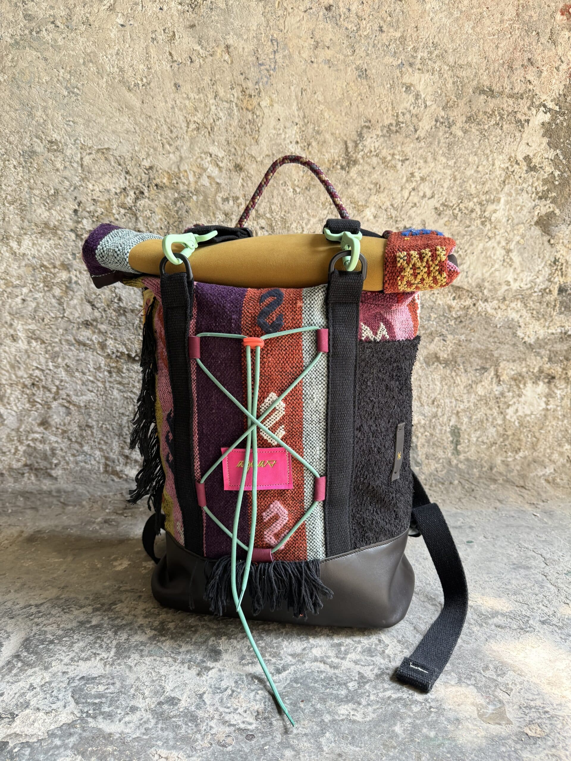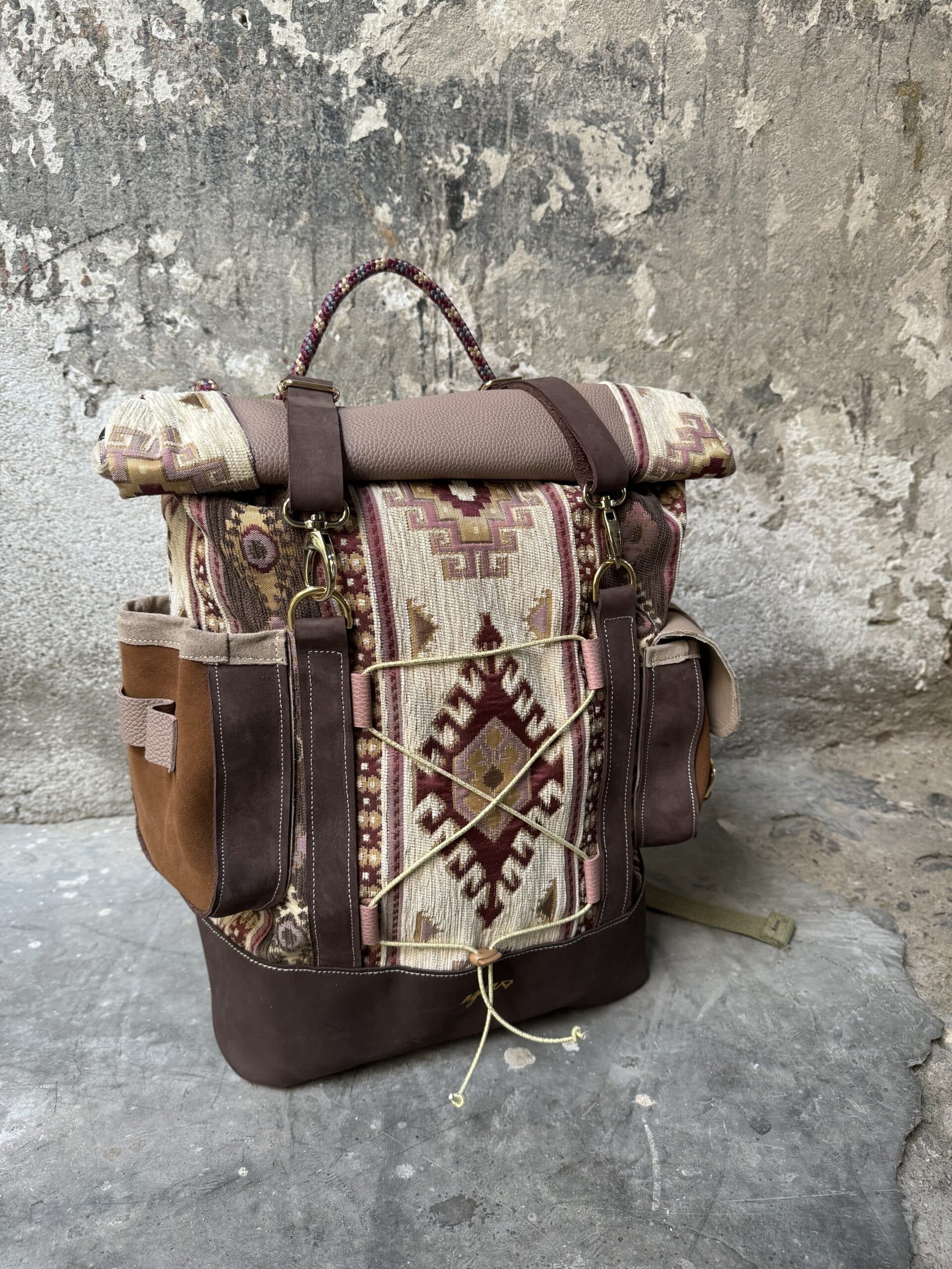 Zaino in tessuto turco stile Kilim e pellami misti. Chiusura con moschettoni dorati, cinghie frontali regolabili.