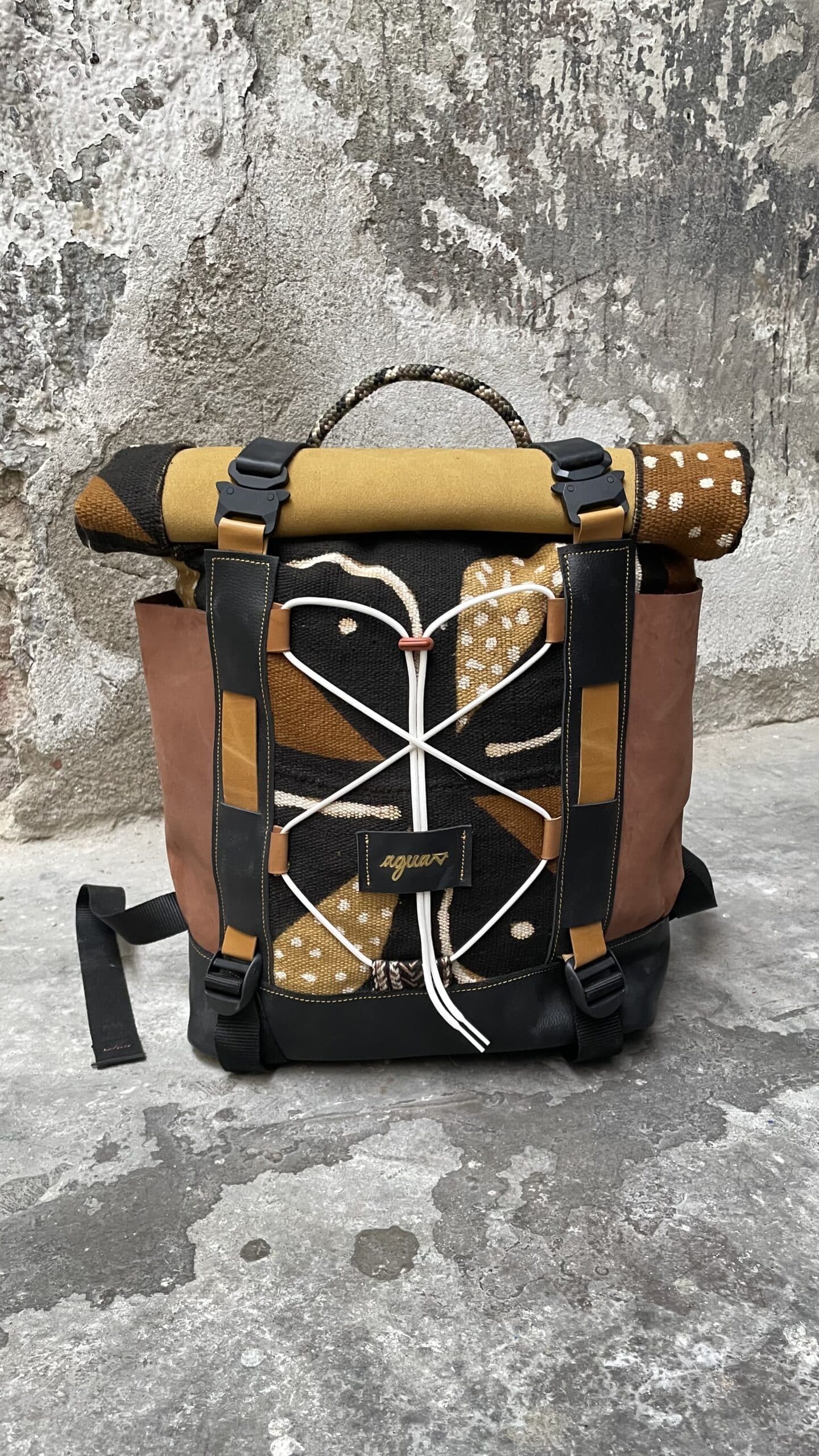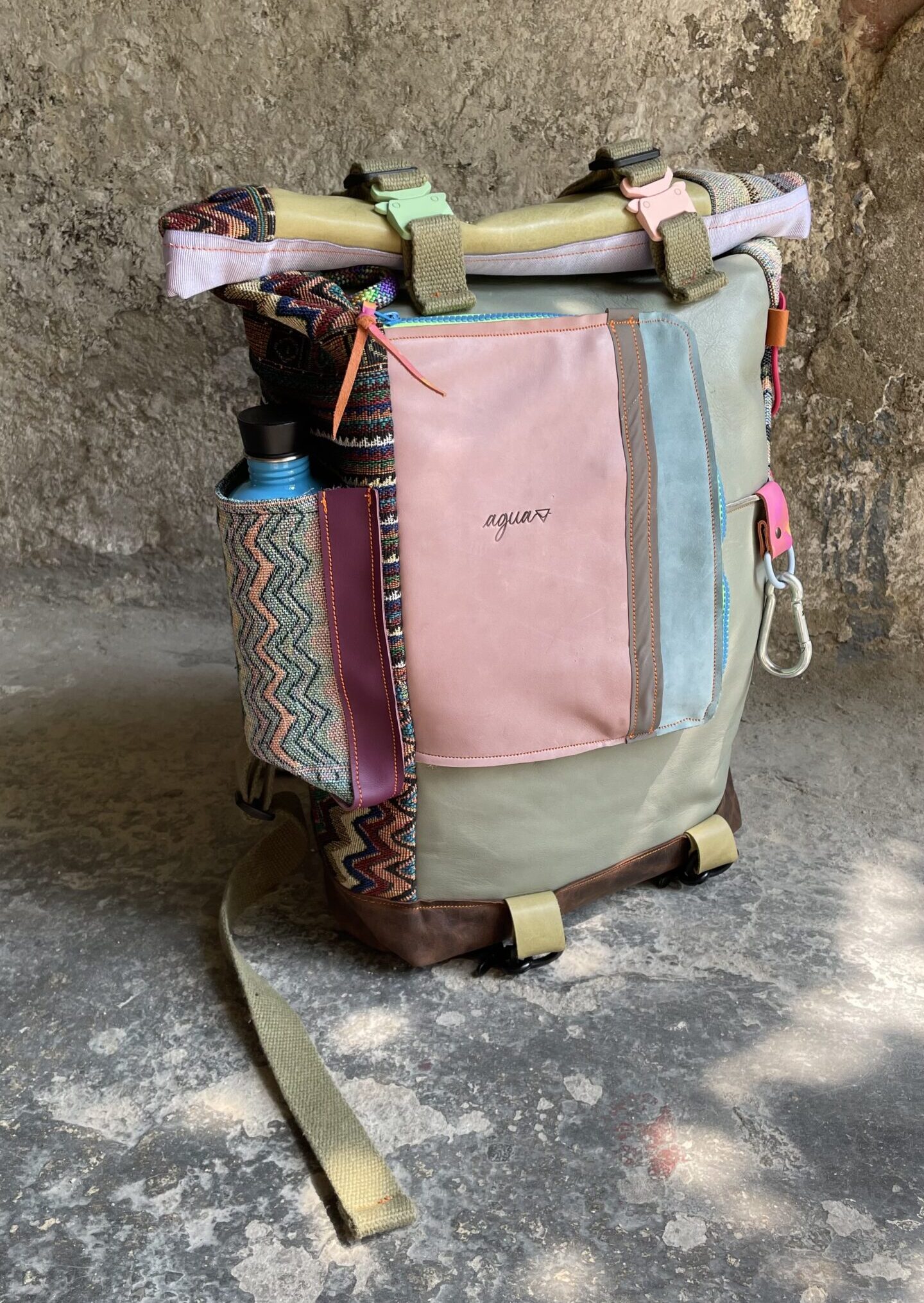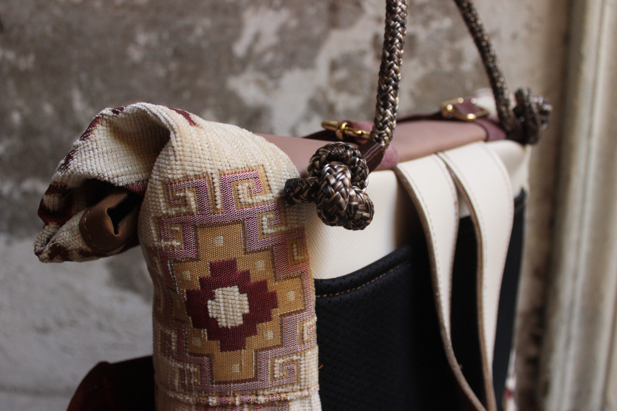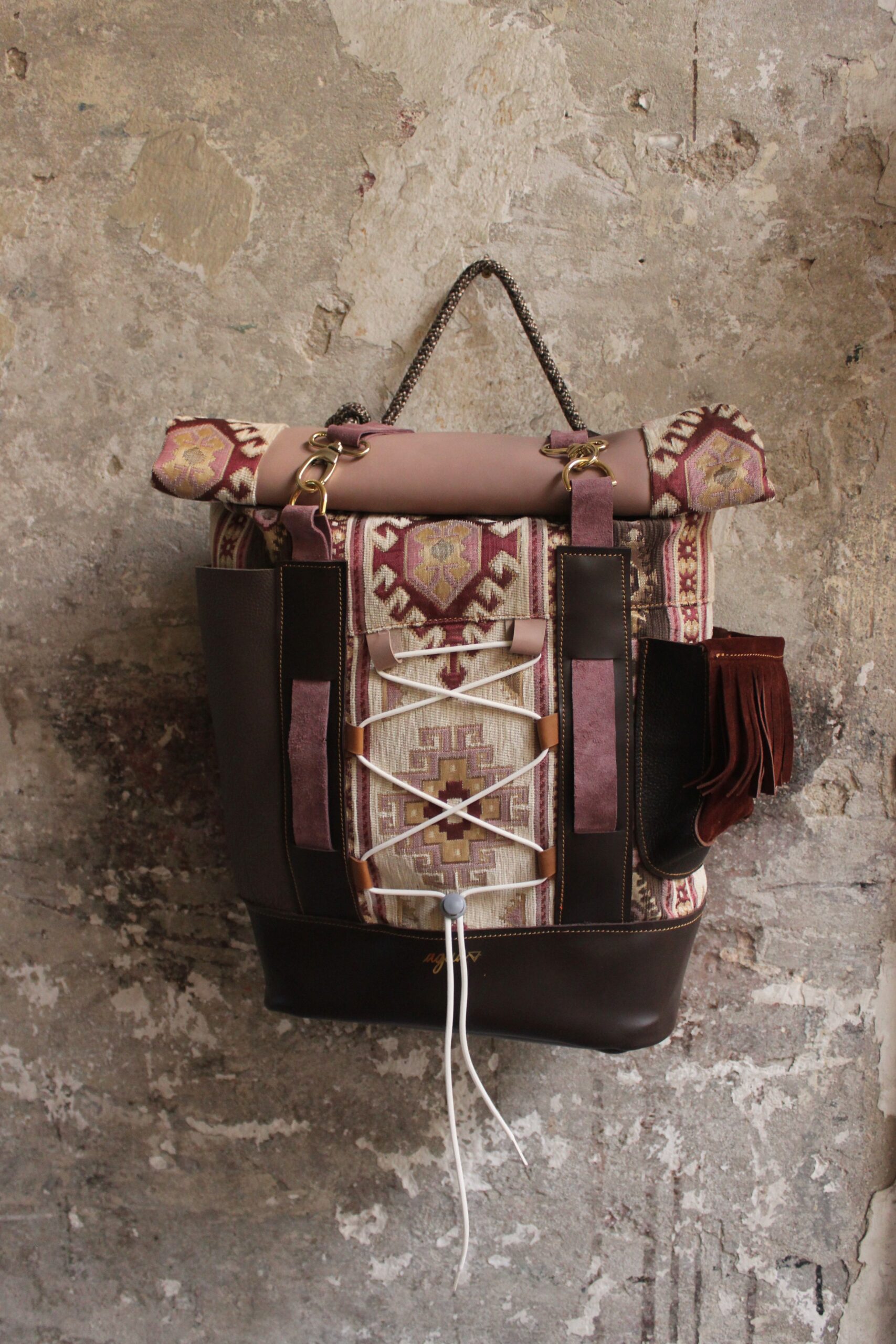 Zaino in tessuto turco stile Kilim e pellami misti. Chiusura con moschettoni dorati, cinghie frontali regolabili.