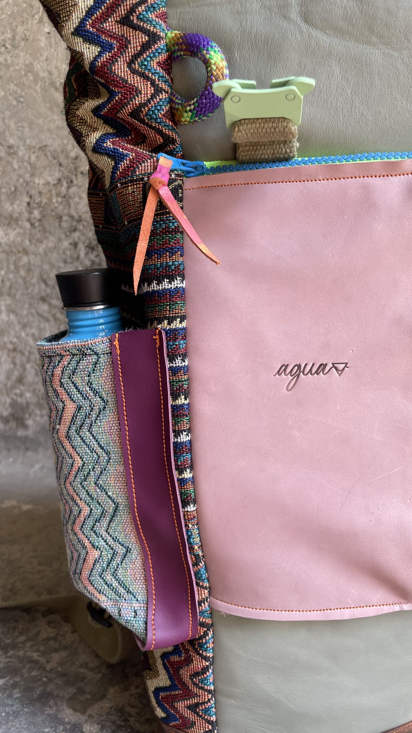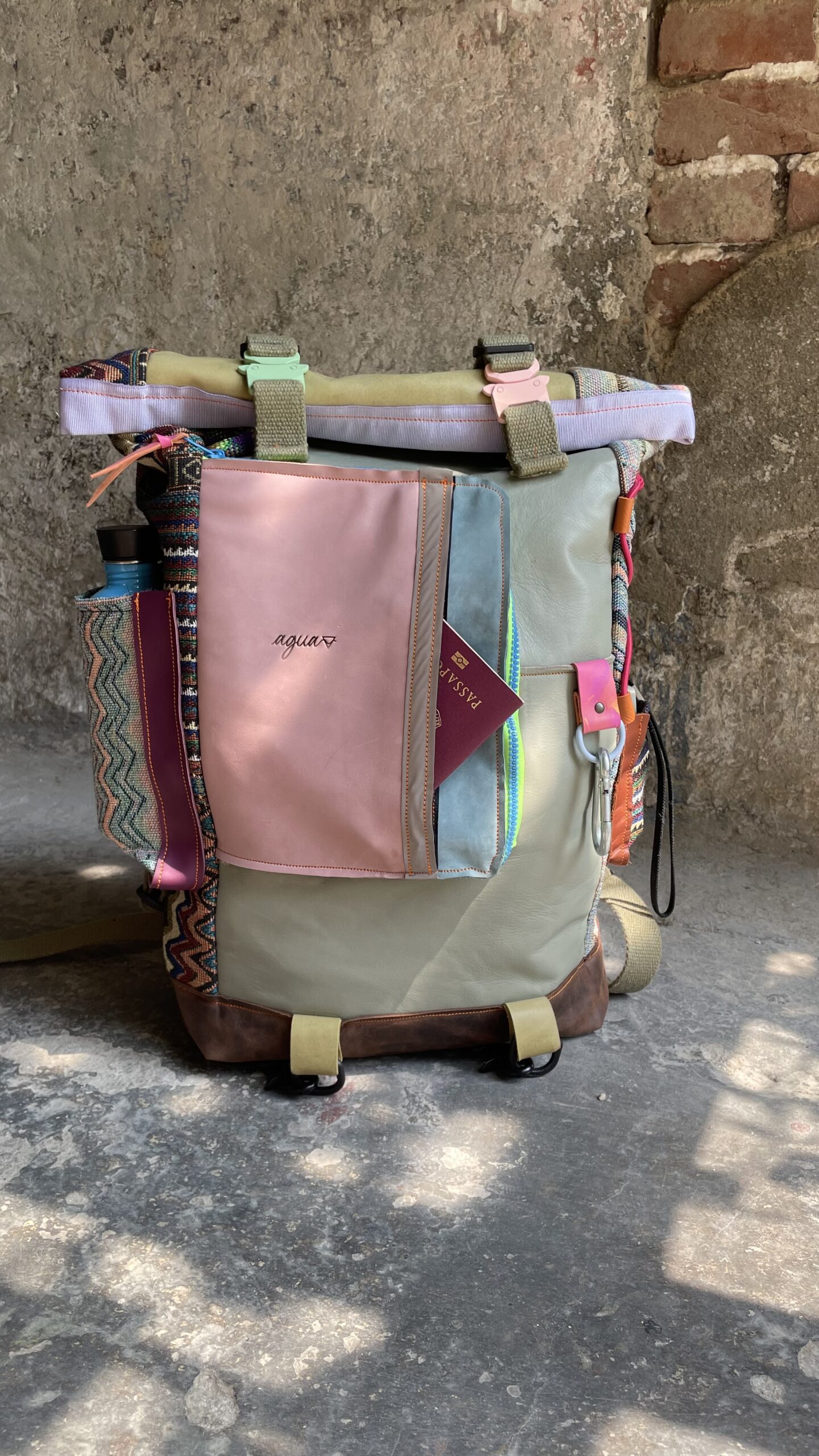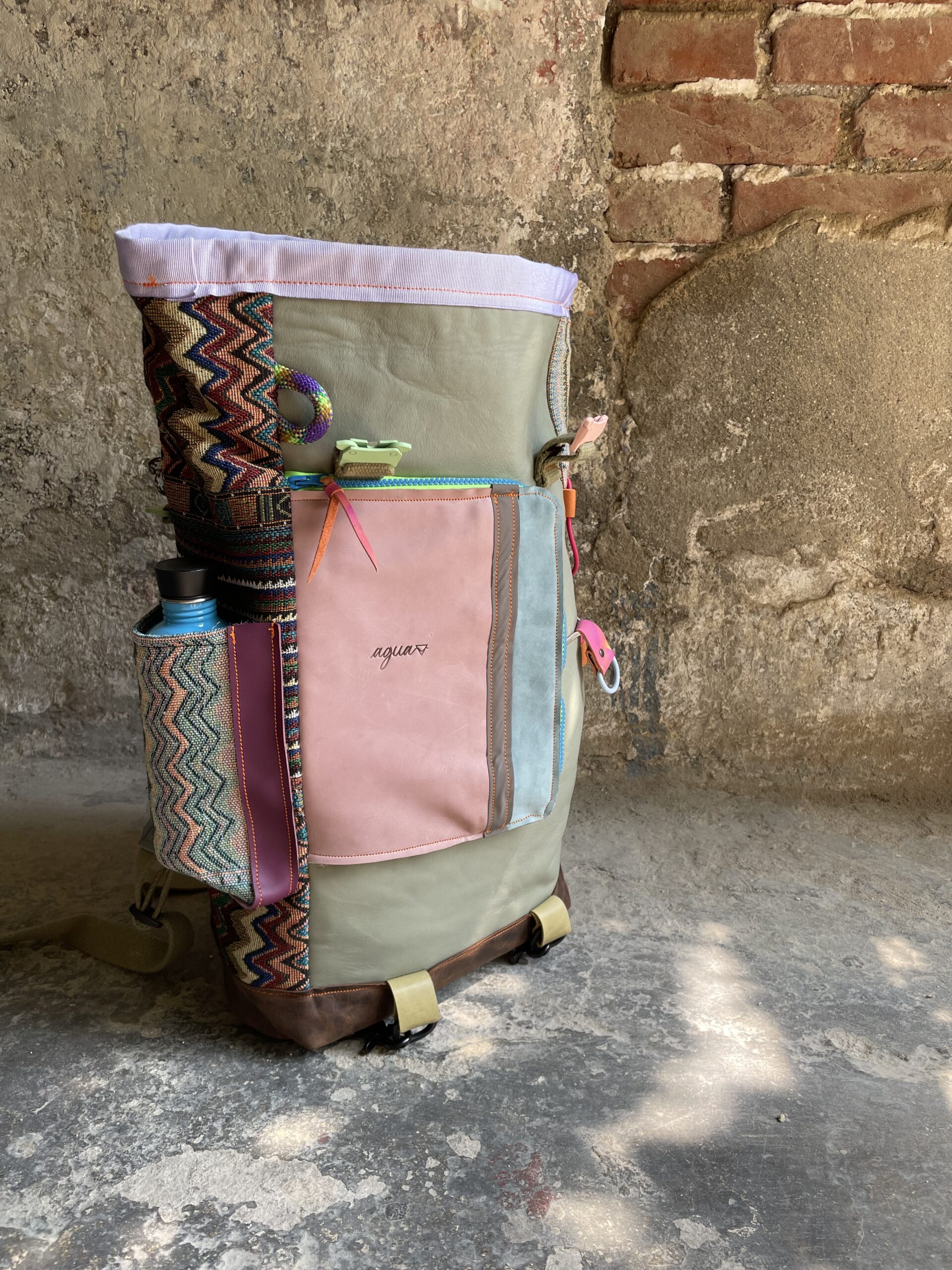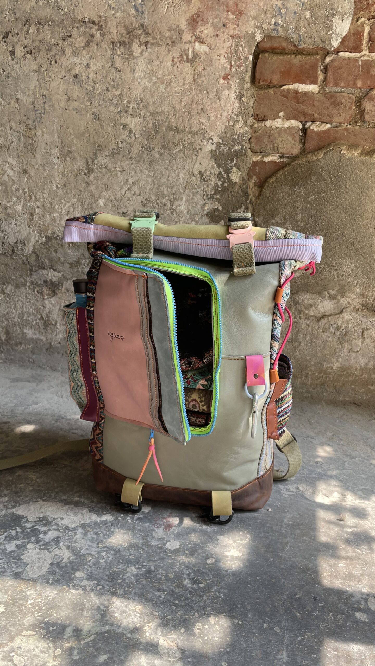 Zaino interamente in pelle, realizzato con pellame upcycled, dipinto a mano. Interno in tessuto tecnico impermeabile cordura. Chiusura rolltop e apertura frontale con cerniera, tasca sul retro, tasca frontale con velcro e due tasche laterali con profilo. All’interno sono presenti due tasche interne laterali ed una sullo schienale, imbottita ed adatta al pc.