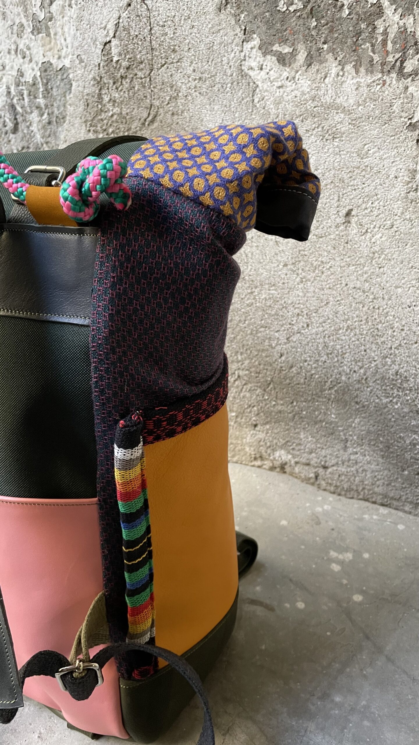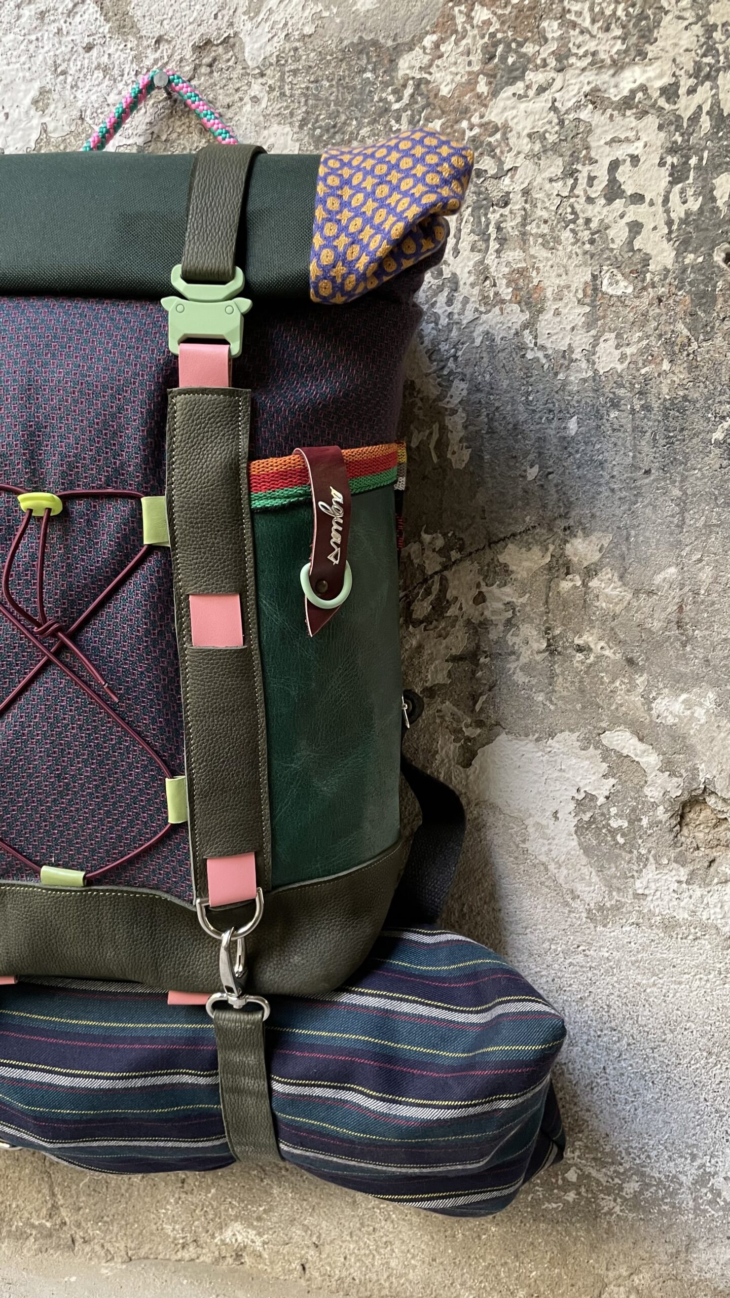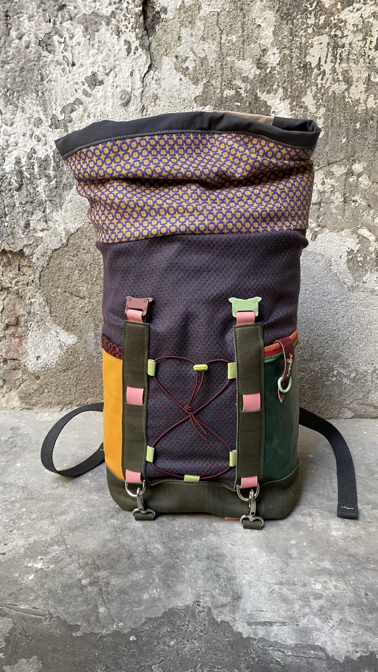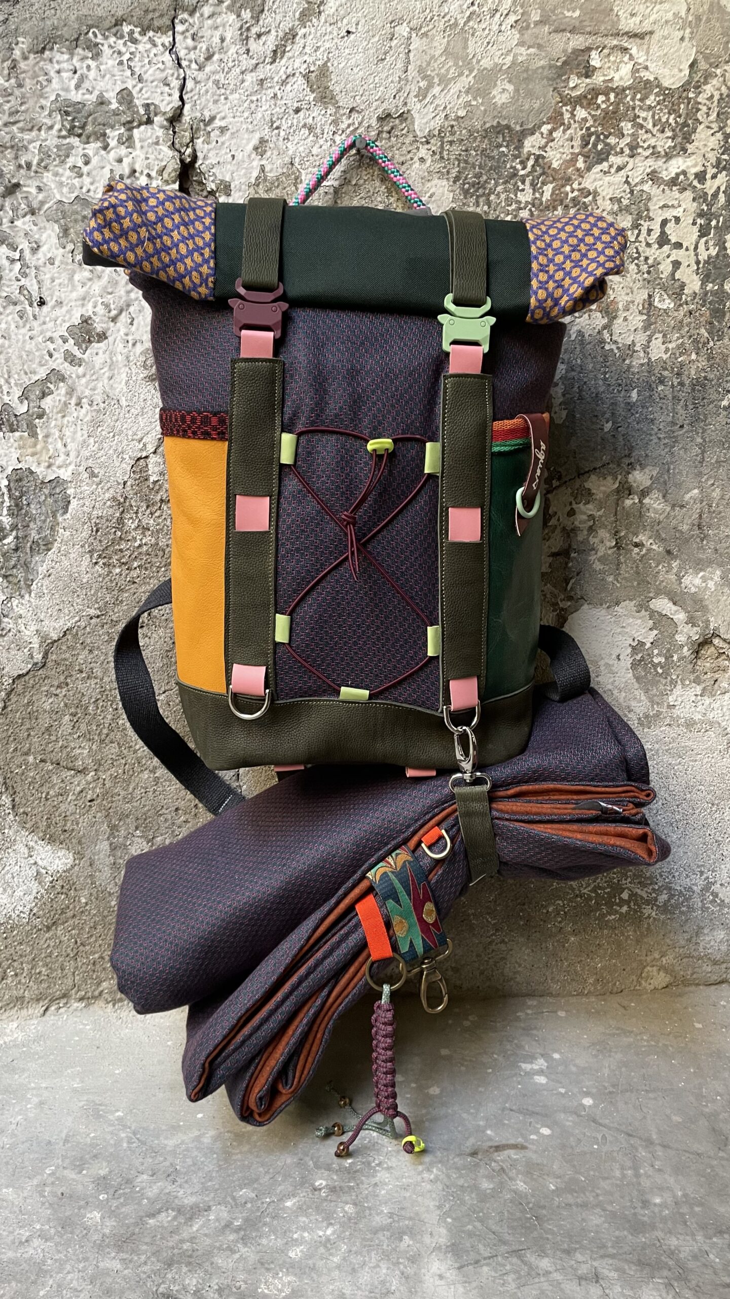 Zaino realizzato con tessuti artigianali marocchini, scarti di produzione di coperte e sacchi a pelo del brand italiano STUDIO TOTIPOTENTE e pellami misti.