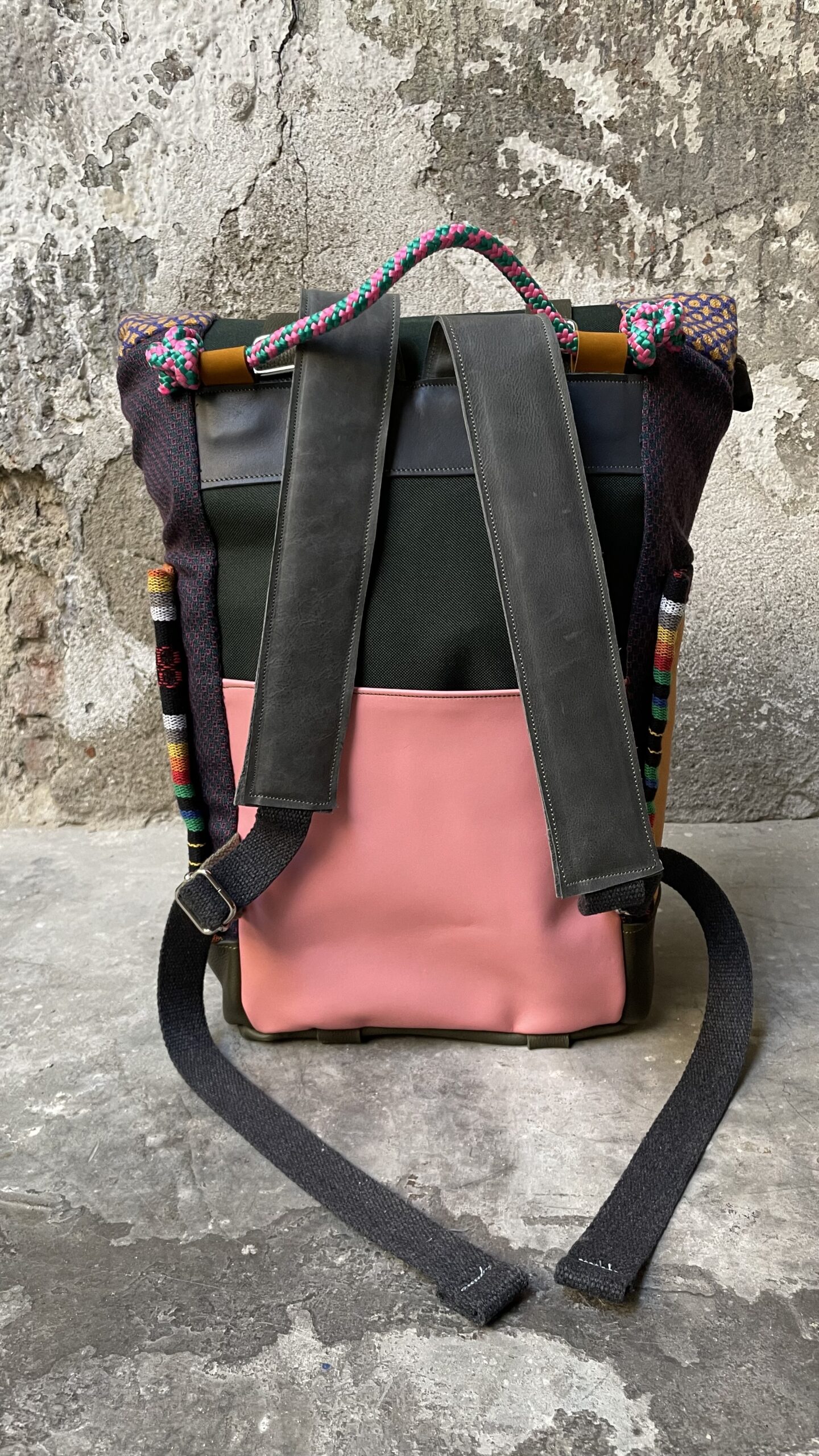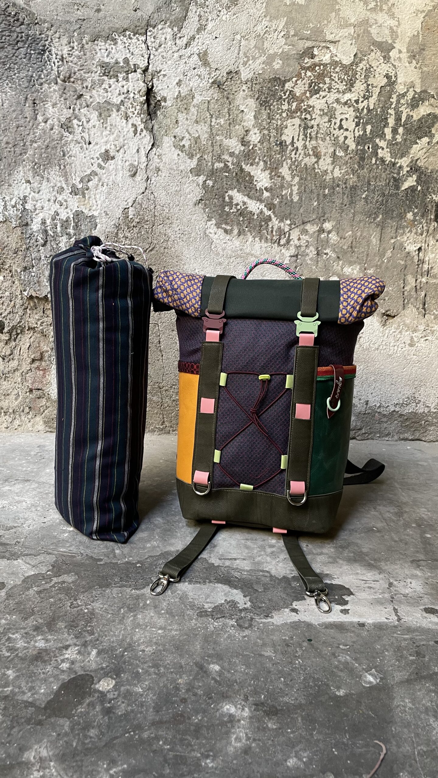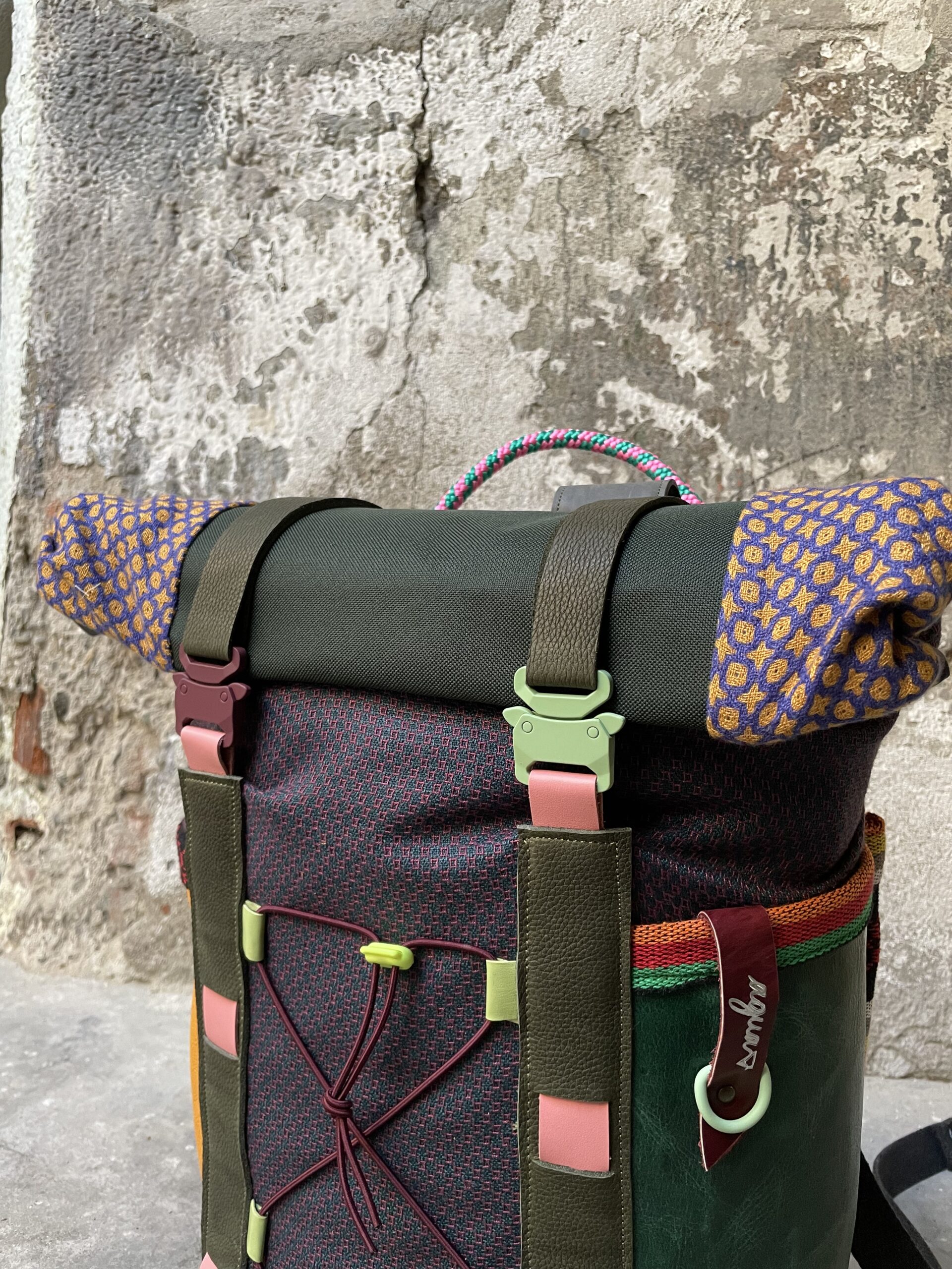 Zaino realizzato con tessuti artigianali marocchini, scarti di produzione di coperte e sacchi a pelo del brand italiano STUDIO TOTIPOTENTE e pellami misti.