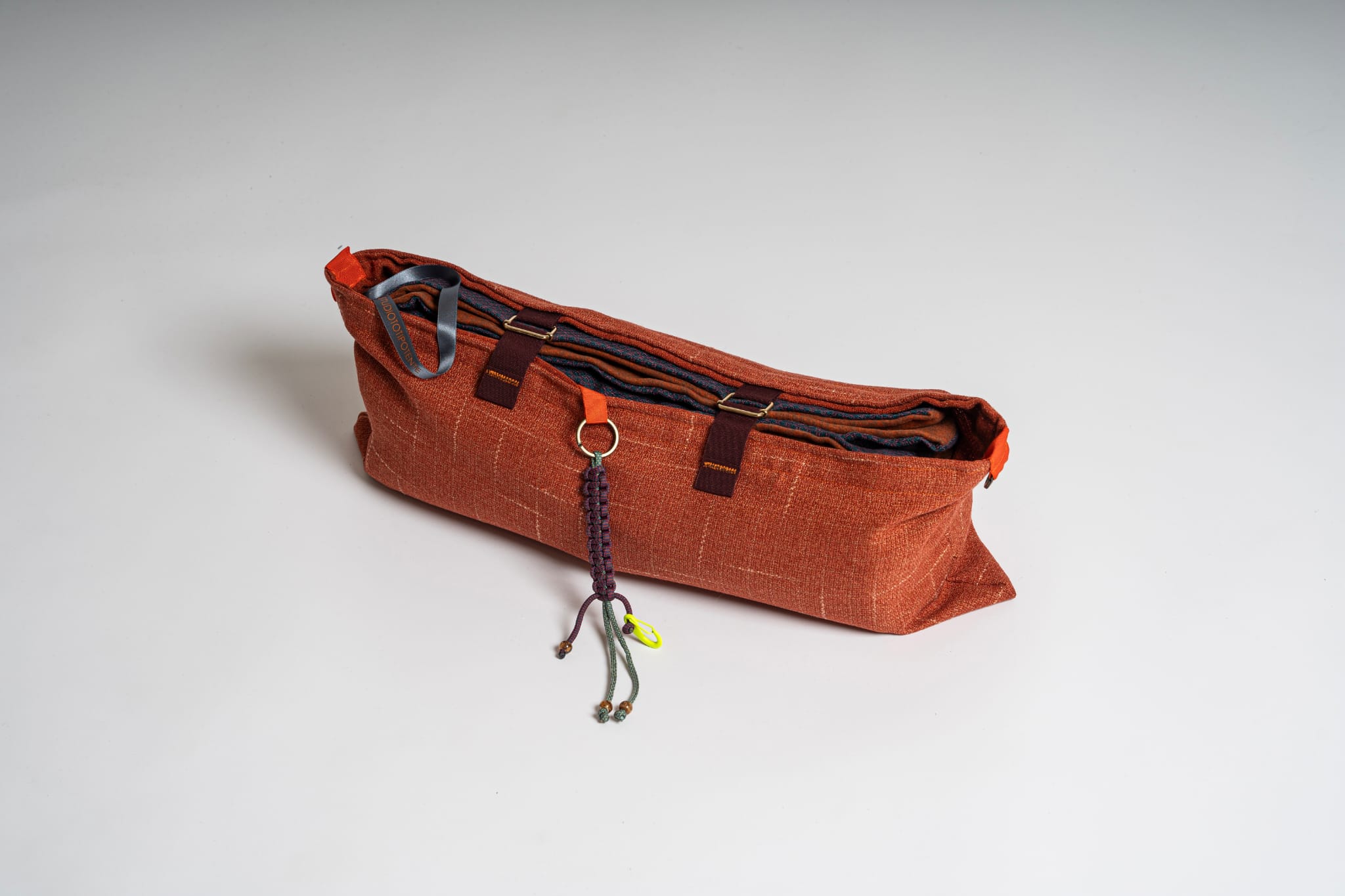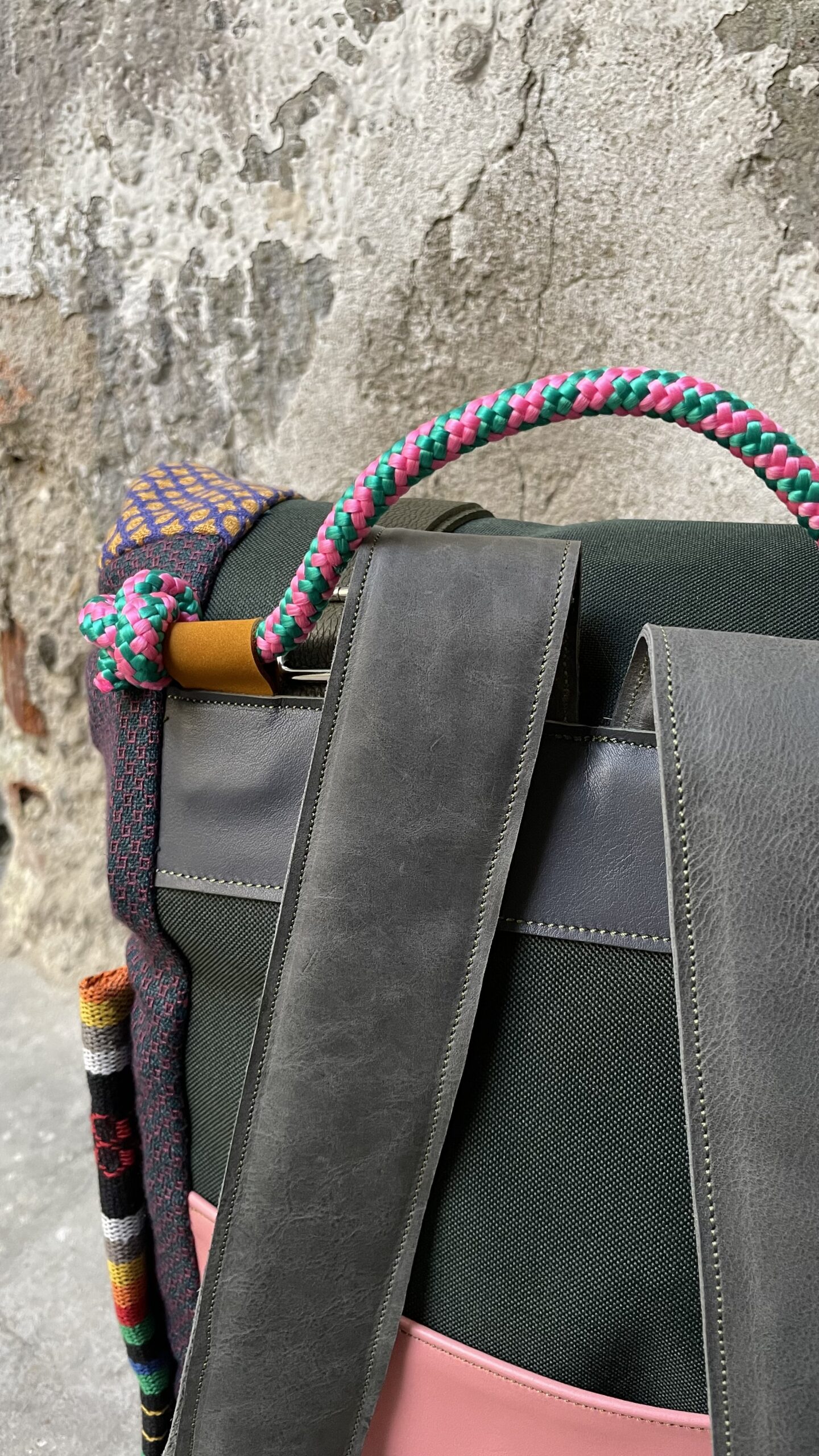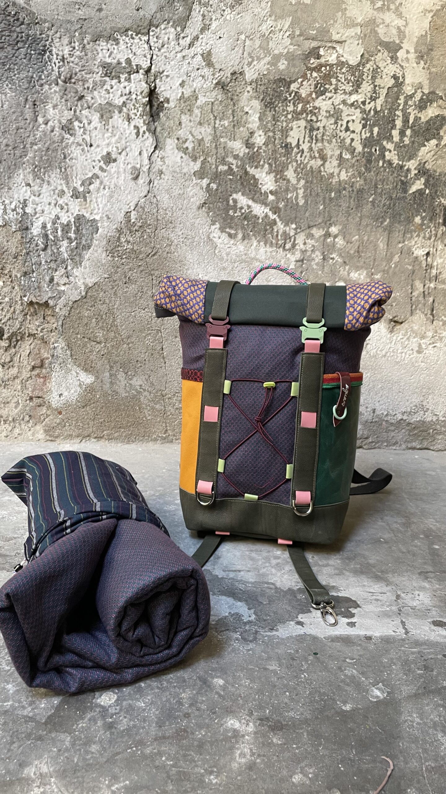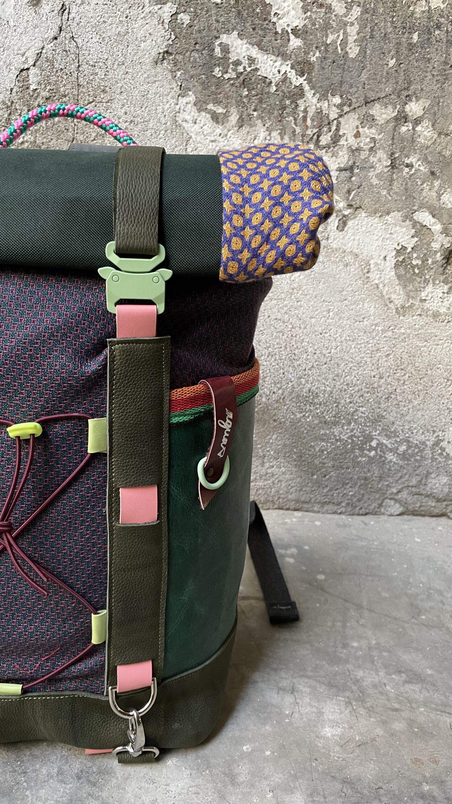 Zaino realizzato con tessuti artigianali marocchini, scarti di produzione di coperte e sacchi a pelo del brand italiano STUDIO TOTIPOTENTE e pellami misti.