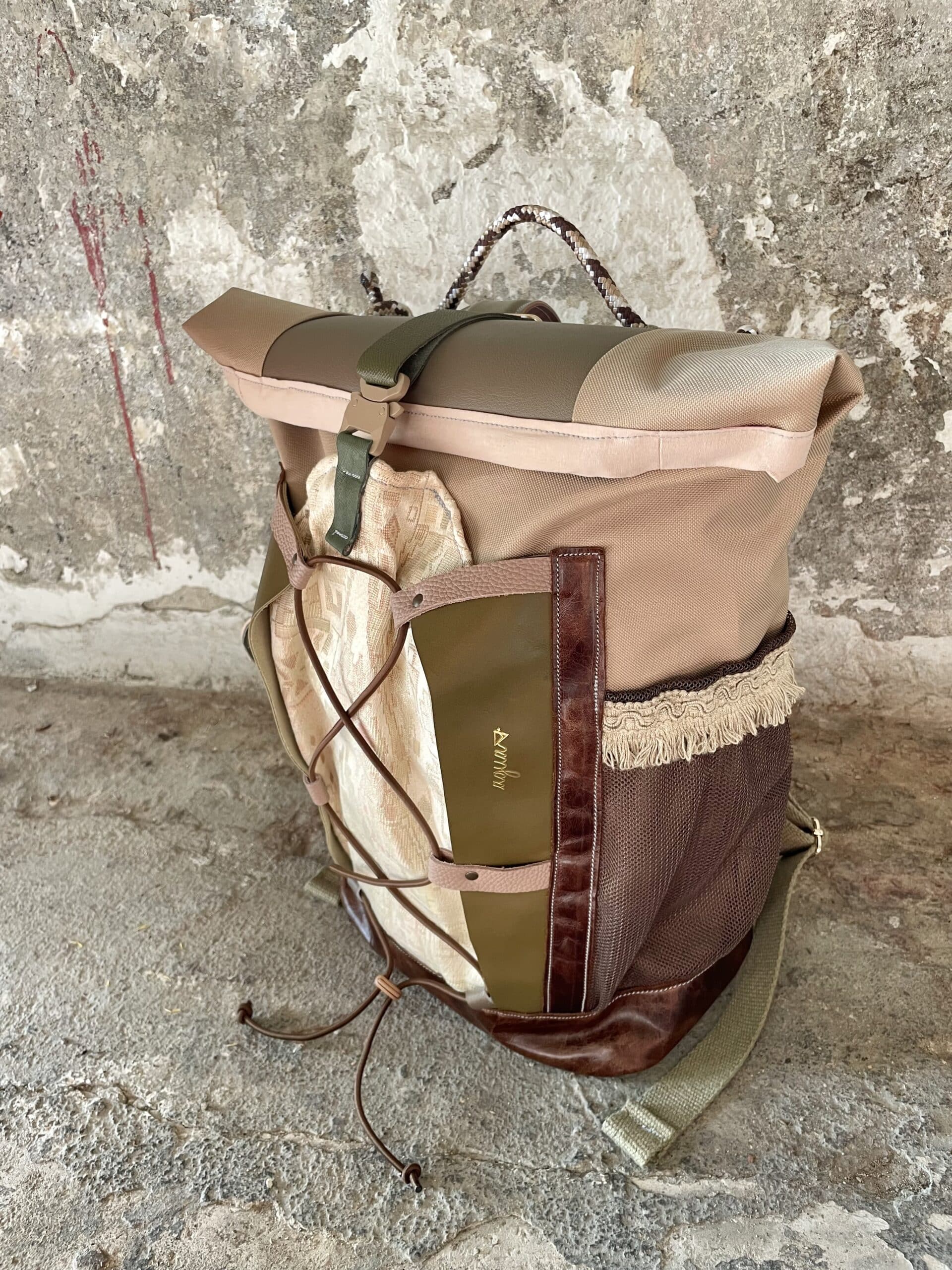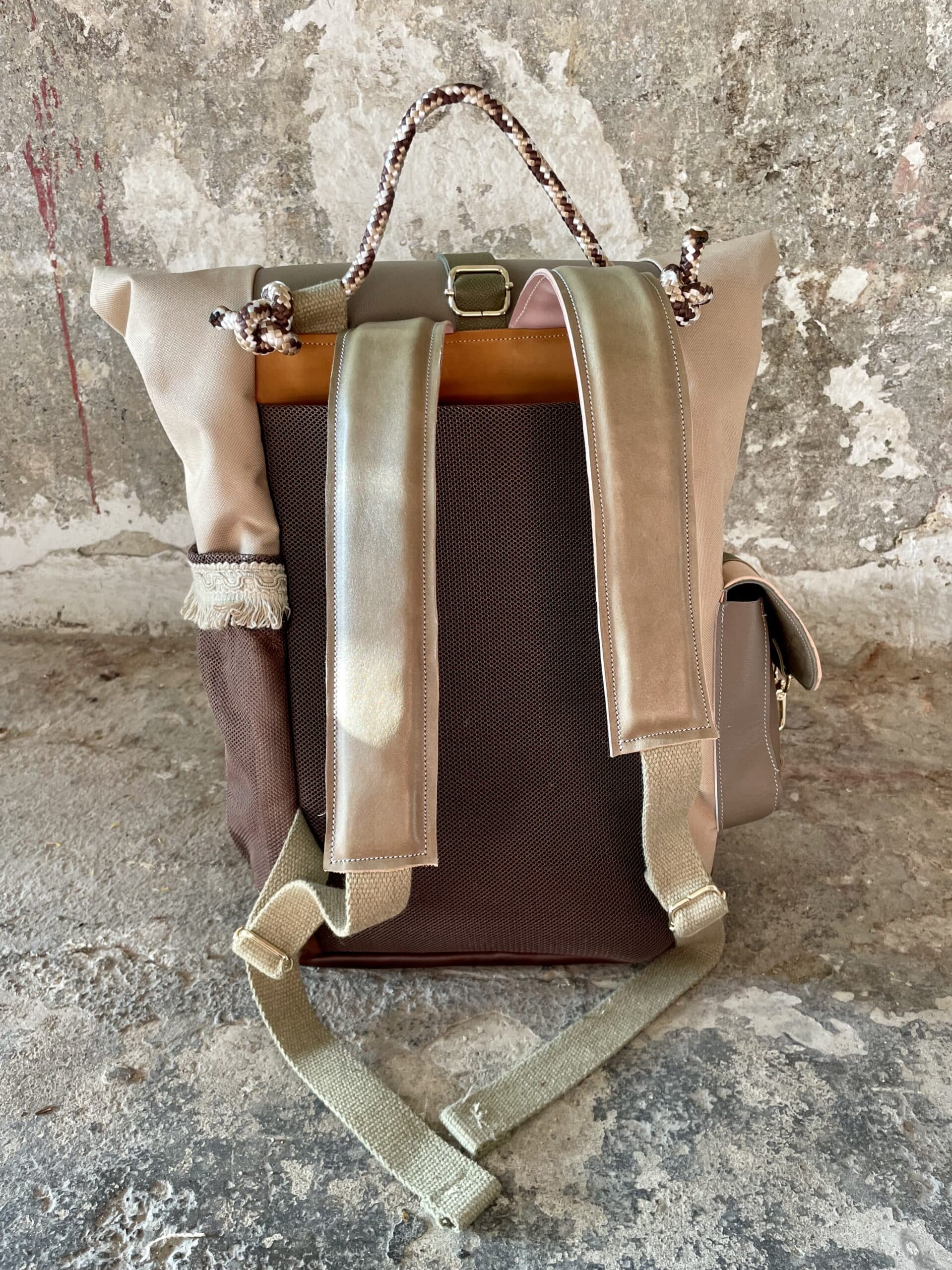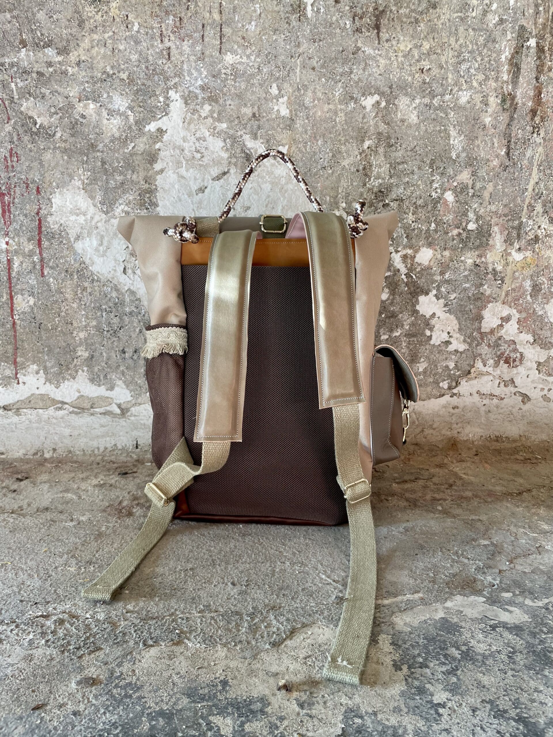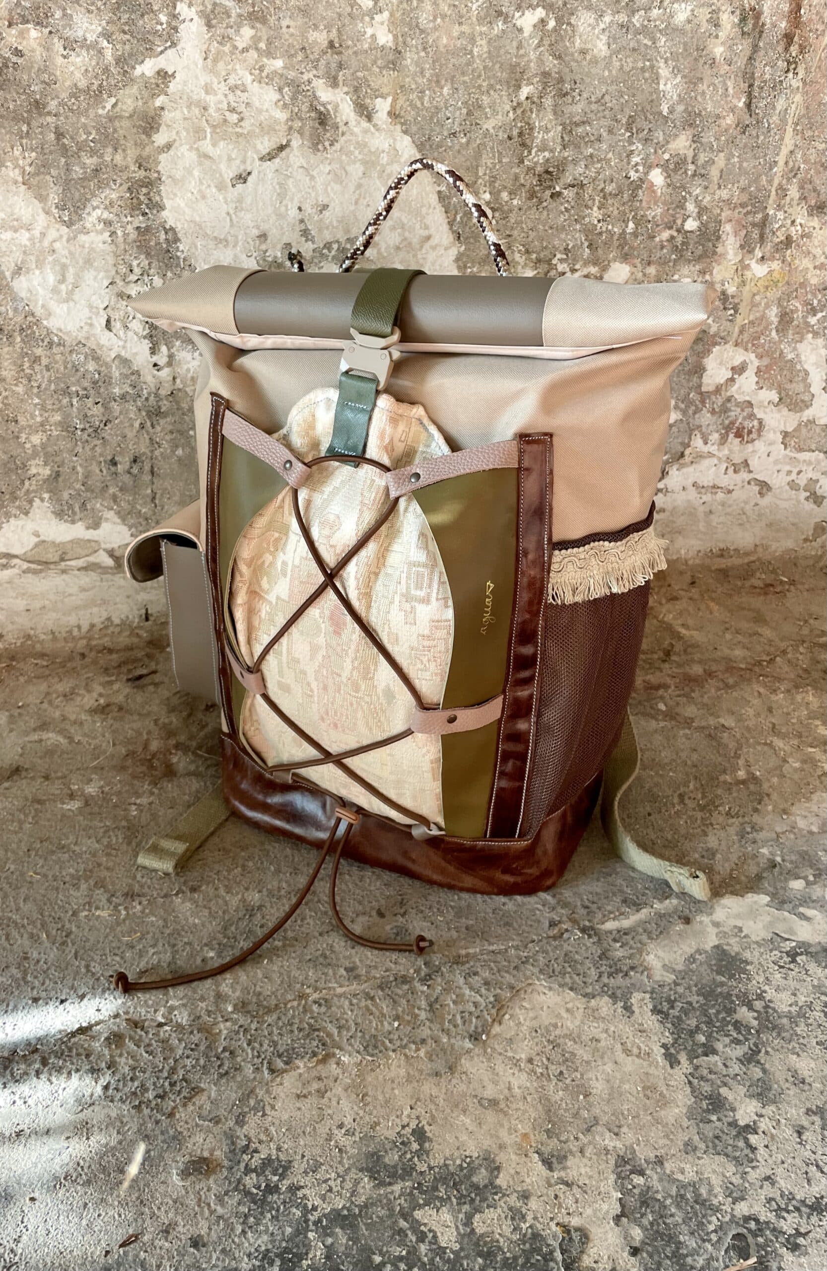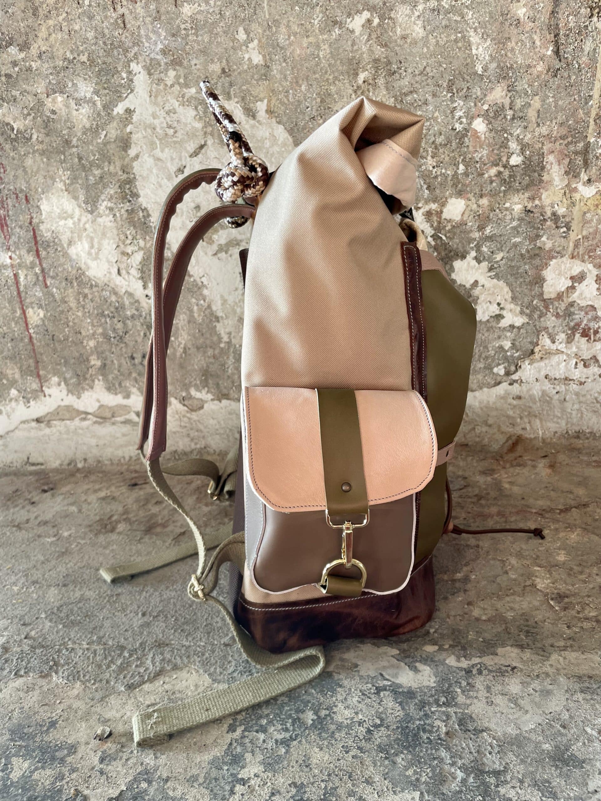 Zaino rolltop realizzato con tessuto tecnico impermeabile CORDURA 600D color cappuccino, e pellami misti, leftovers di concerie italiane.