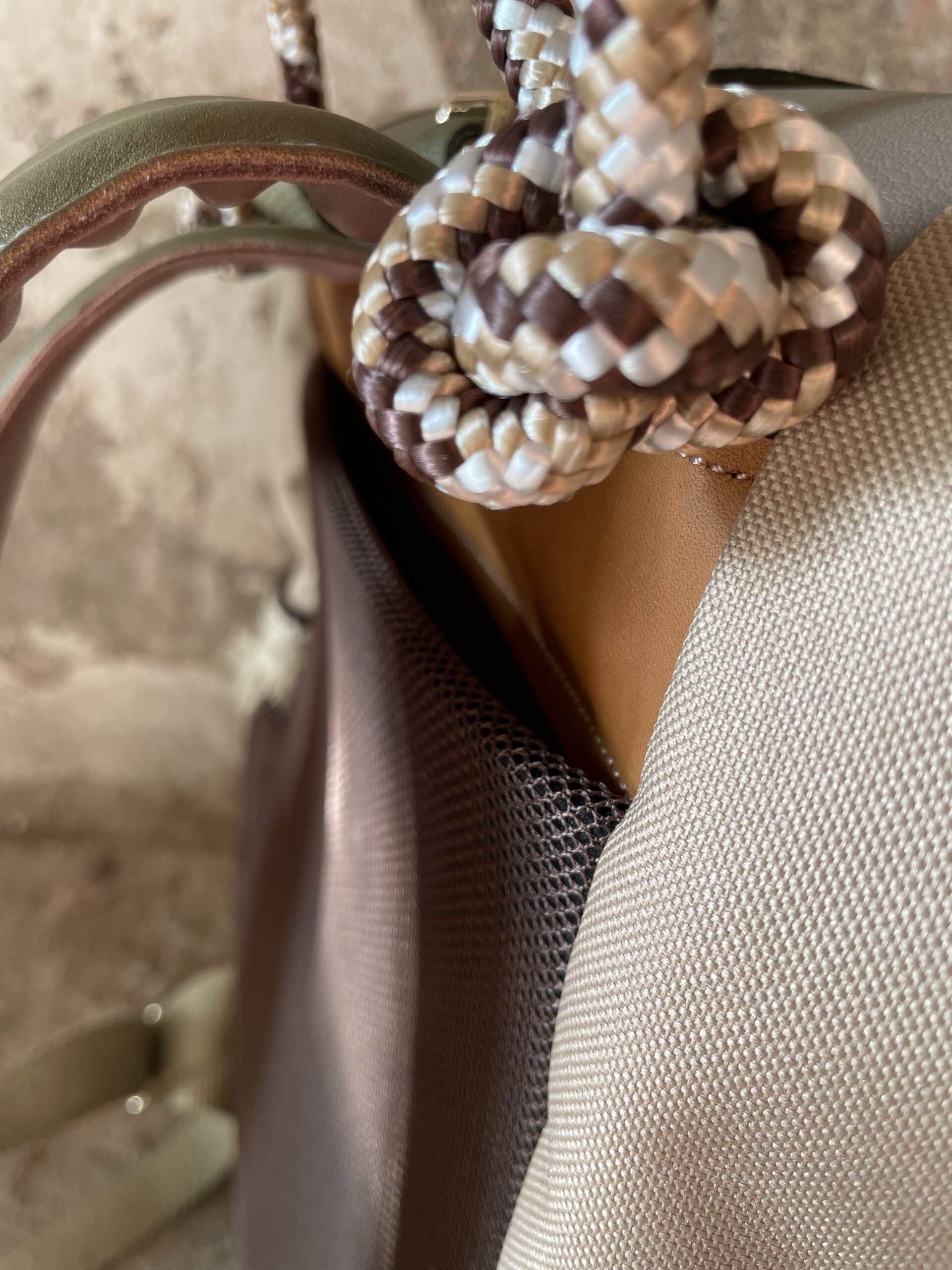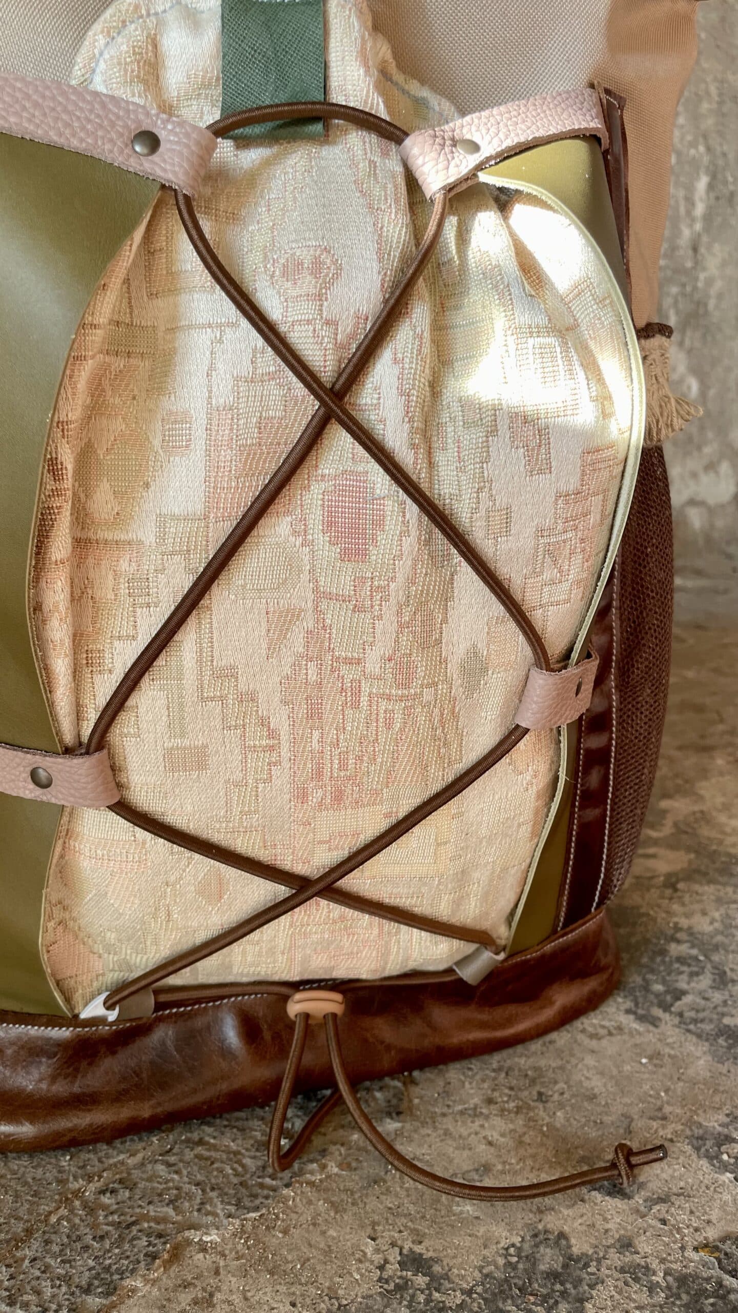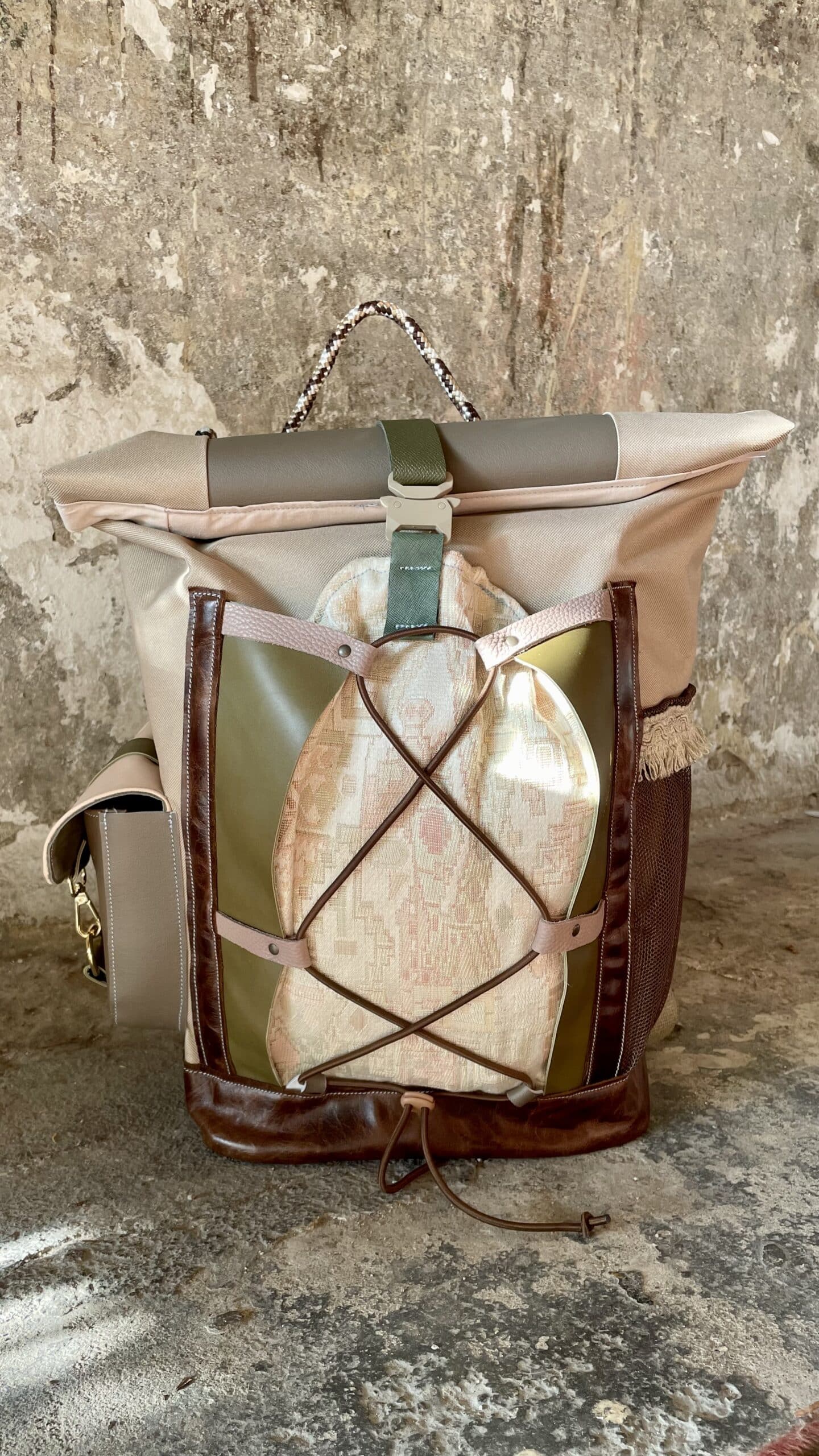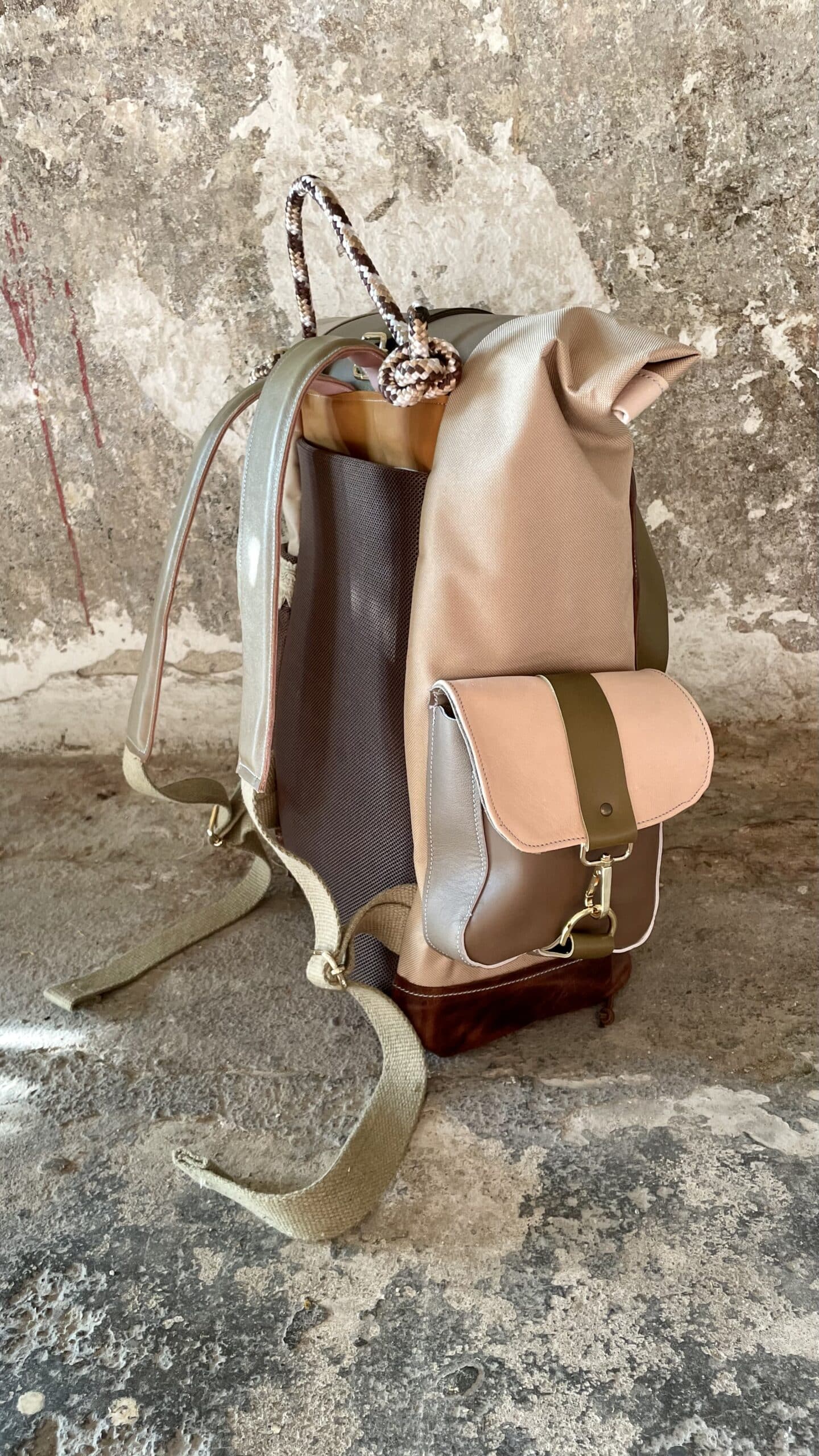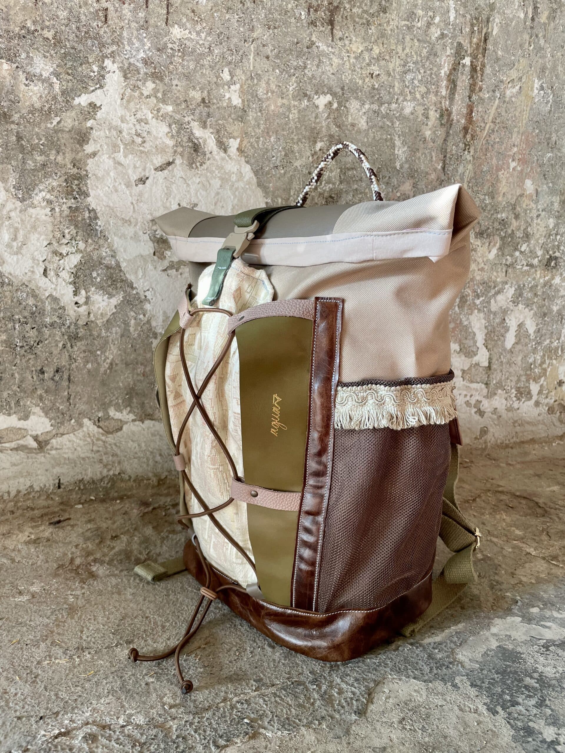 Zaino rolltop realizzato con tessuto tecnico impermeabile CORDURA 600D color cappuccino, e pellami misti, leftovers di concerie italiane.