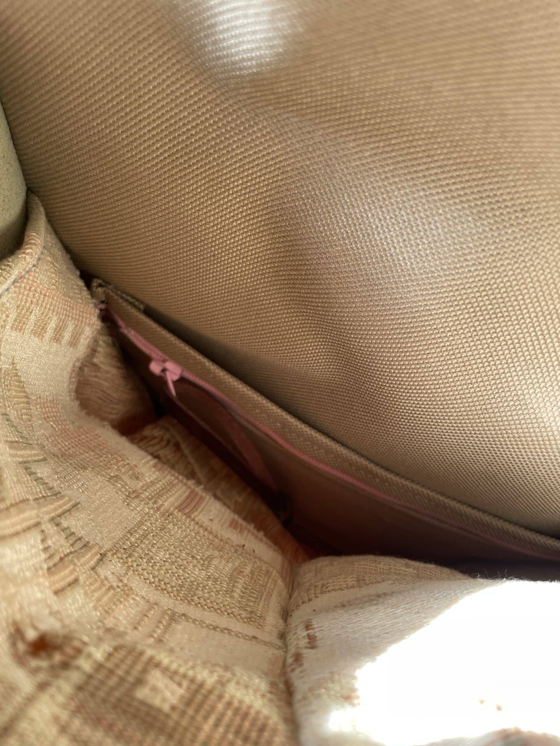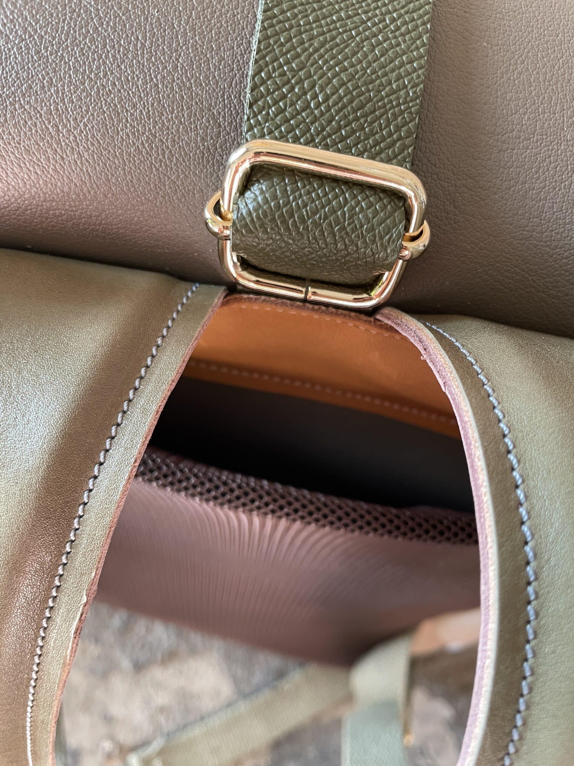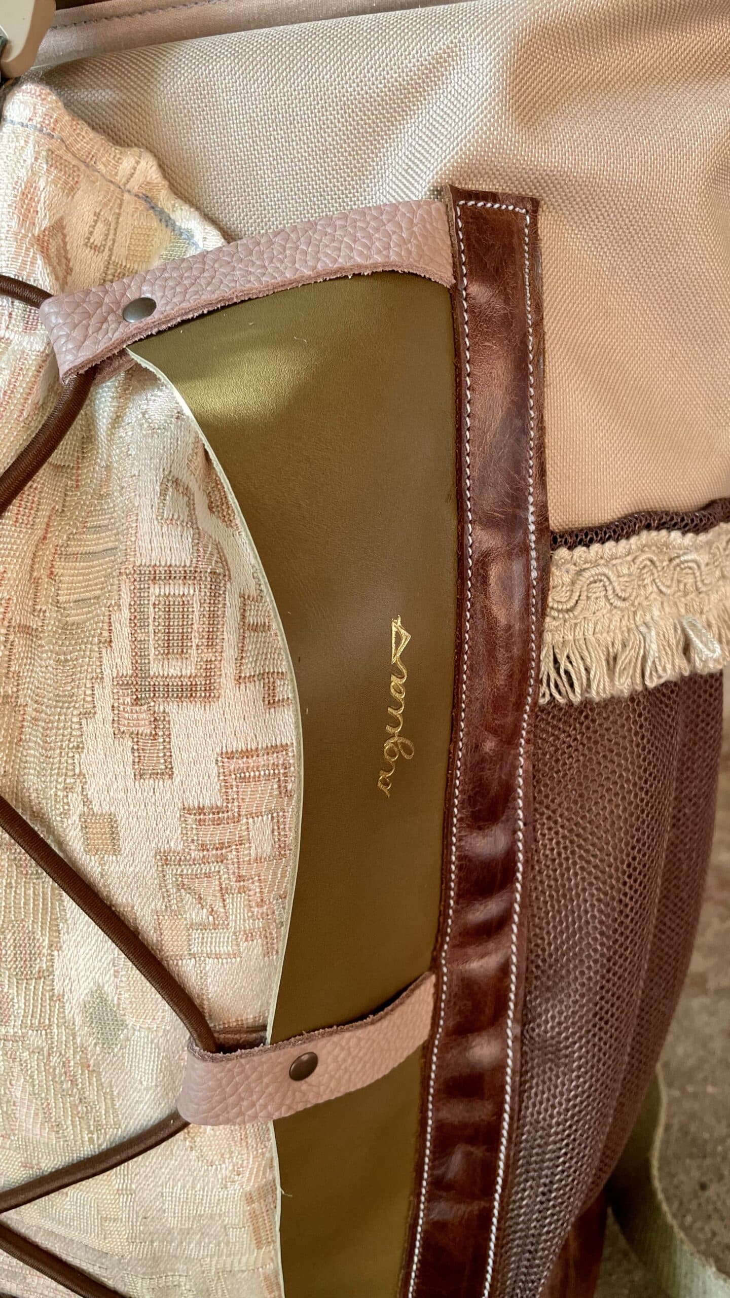 Tasca frontale in tessuto di tappezzeria Gobelin proveniente da Barcellona con all’interno due piccoli scompartimenti, uno di questi con cerniera.