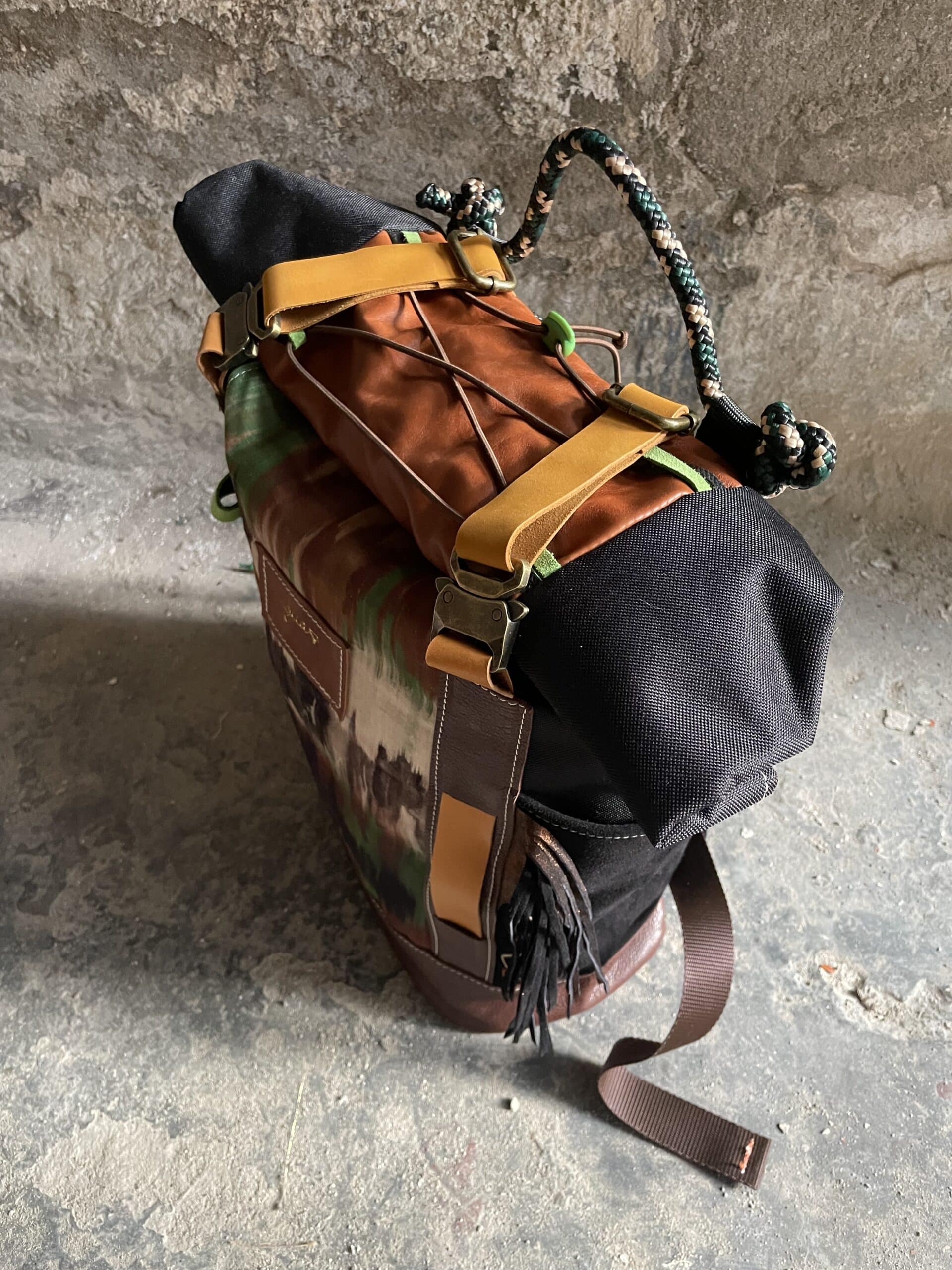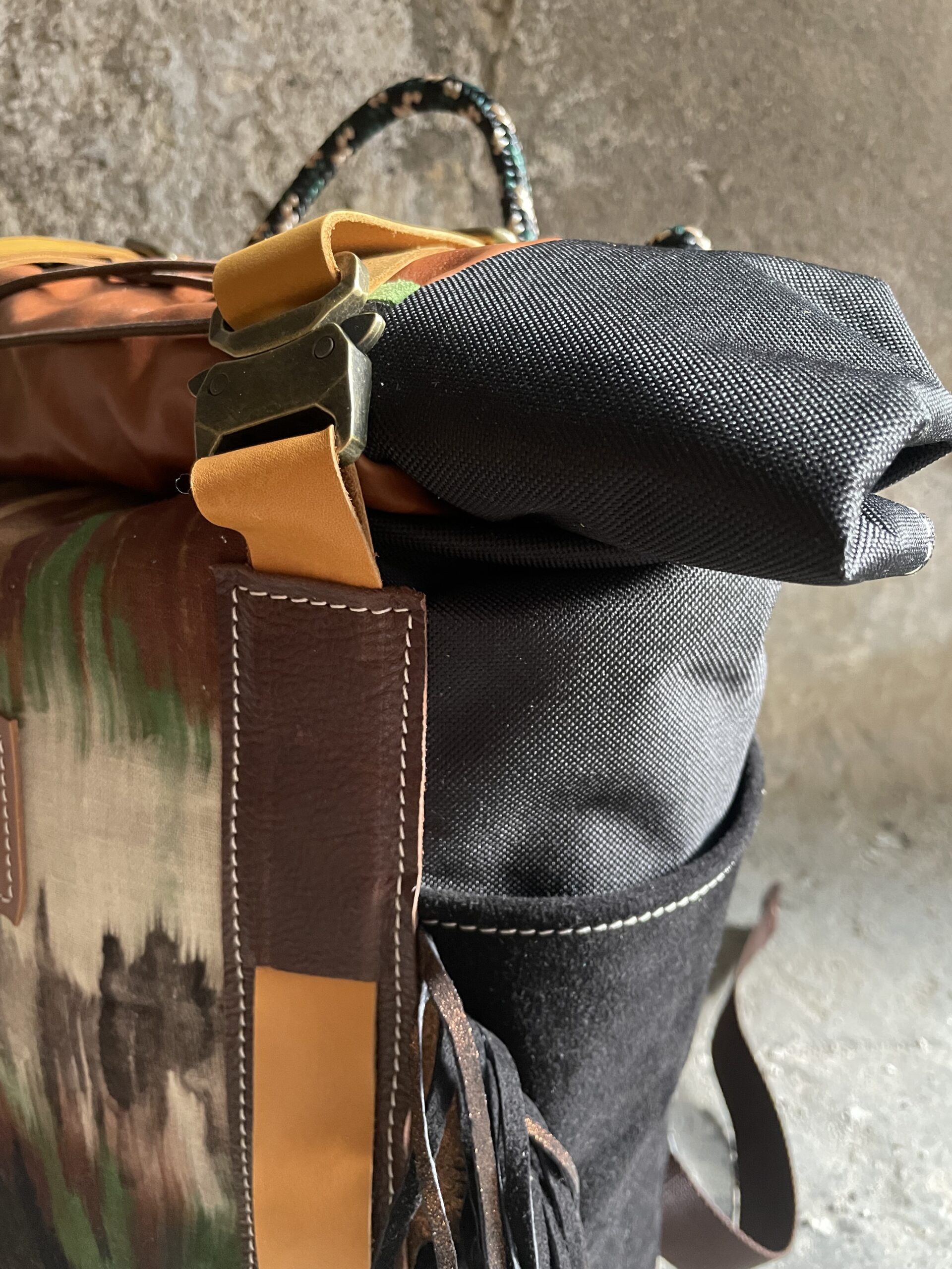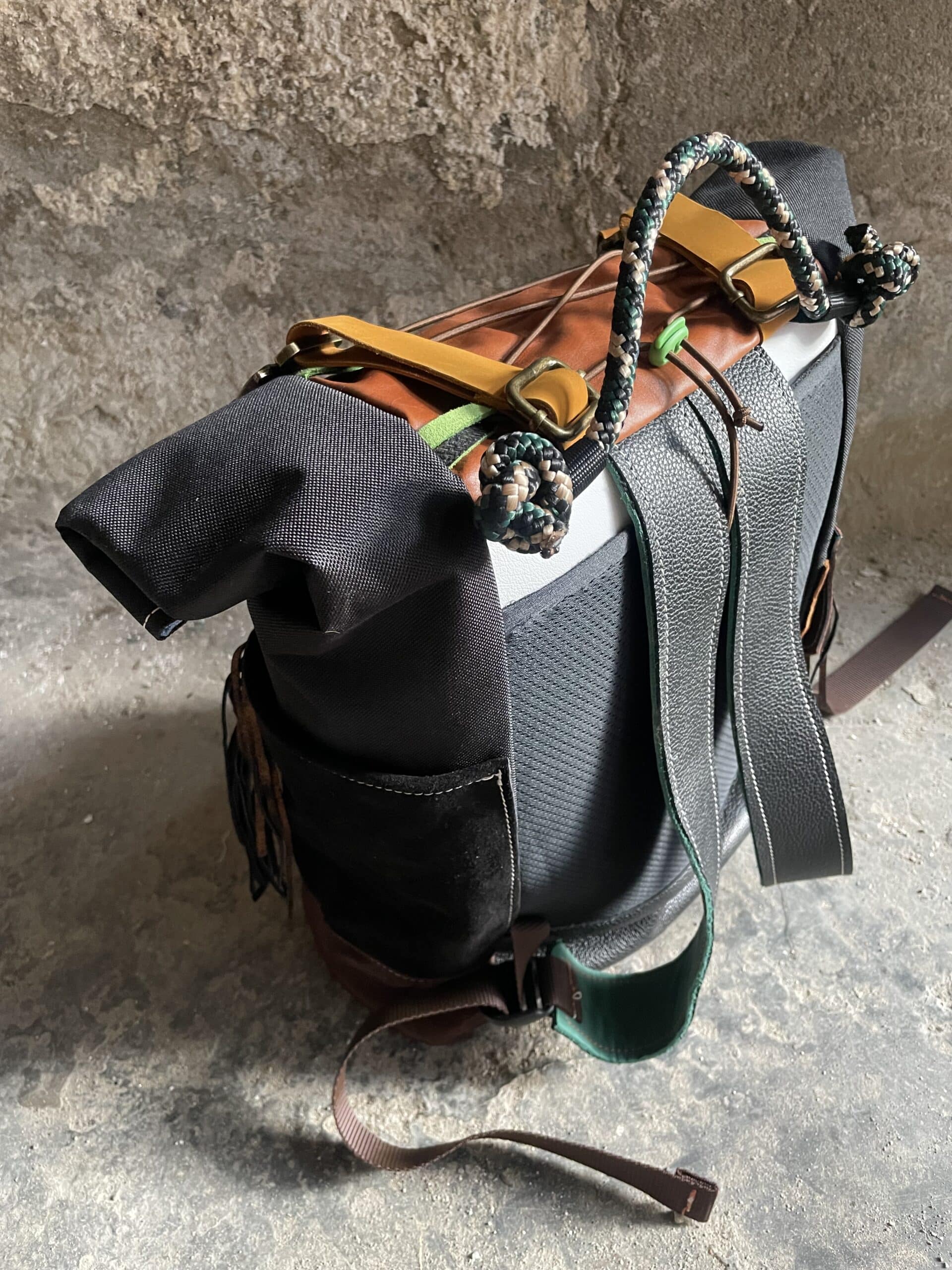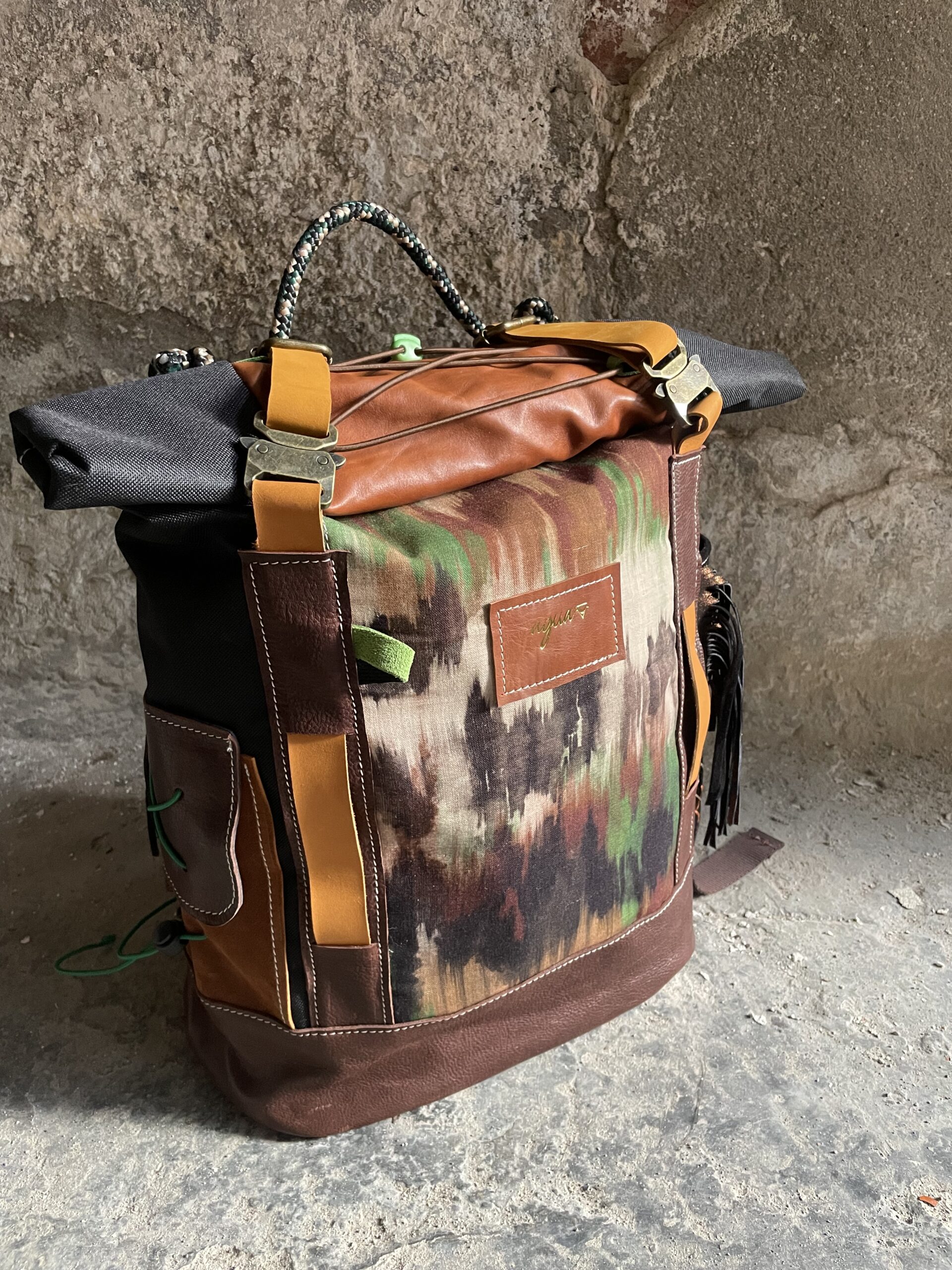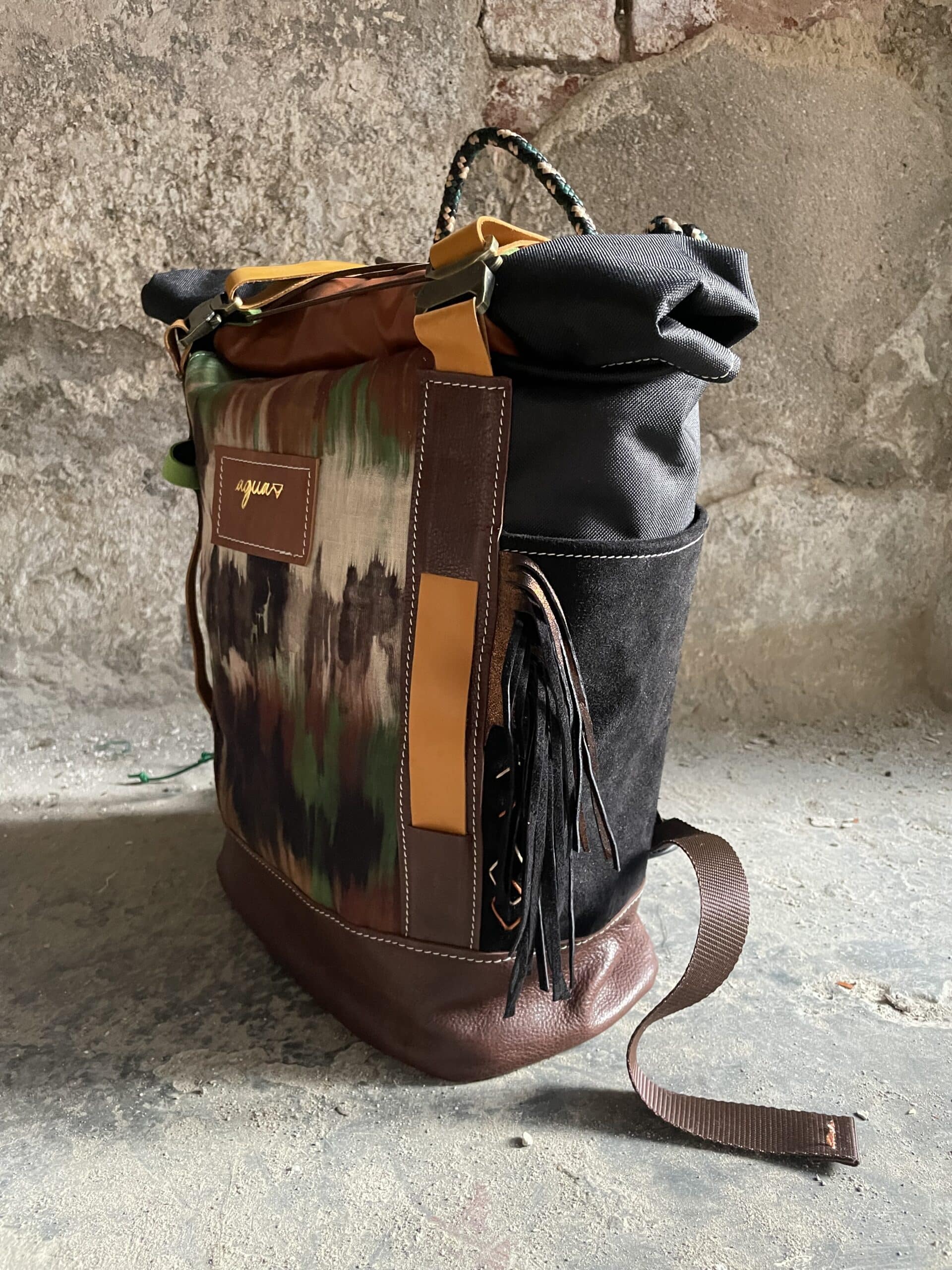 Zaino rolltop dai toni tribali realizzato in tessuto impermeabile cordura 600d nero con dettaglio frontale in tessuto di produzione italiana in cotone con tinta naturale e pellami misti, leftovers delle concerie italiane.