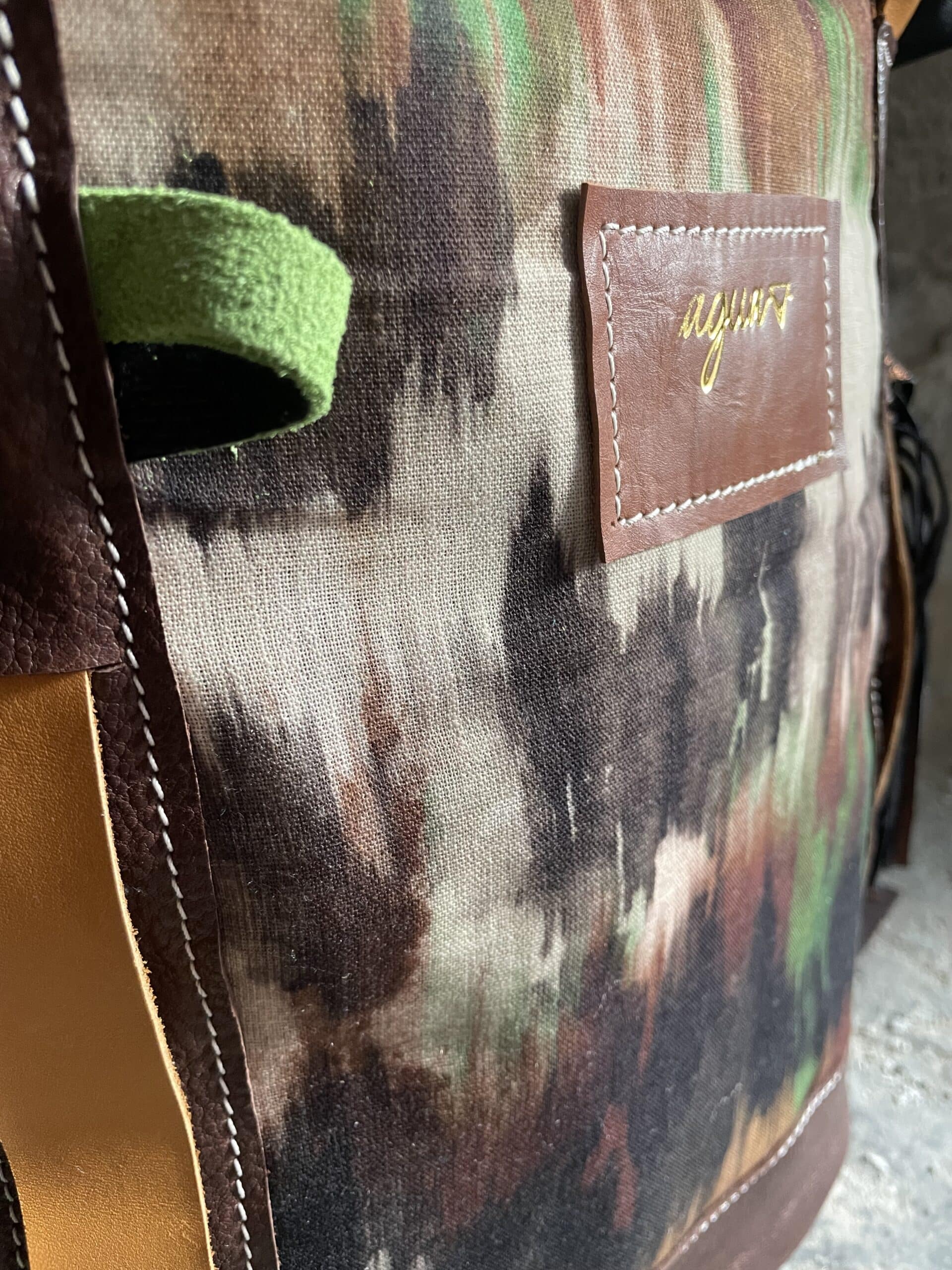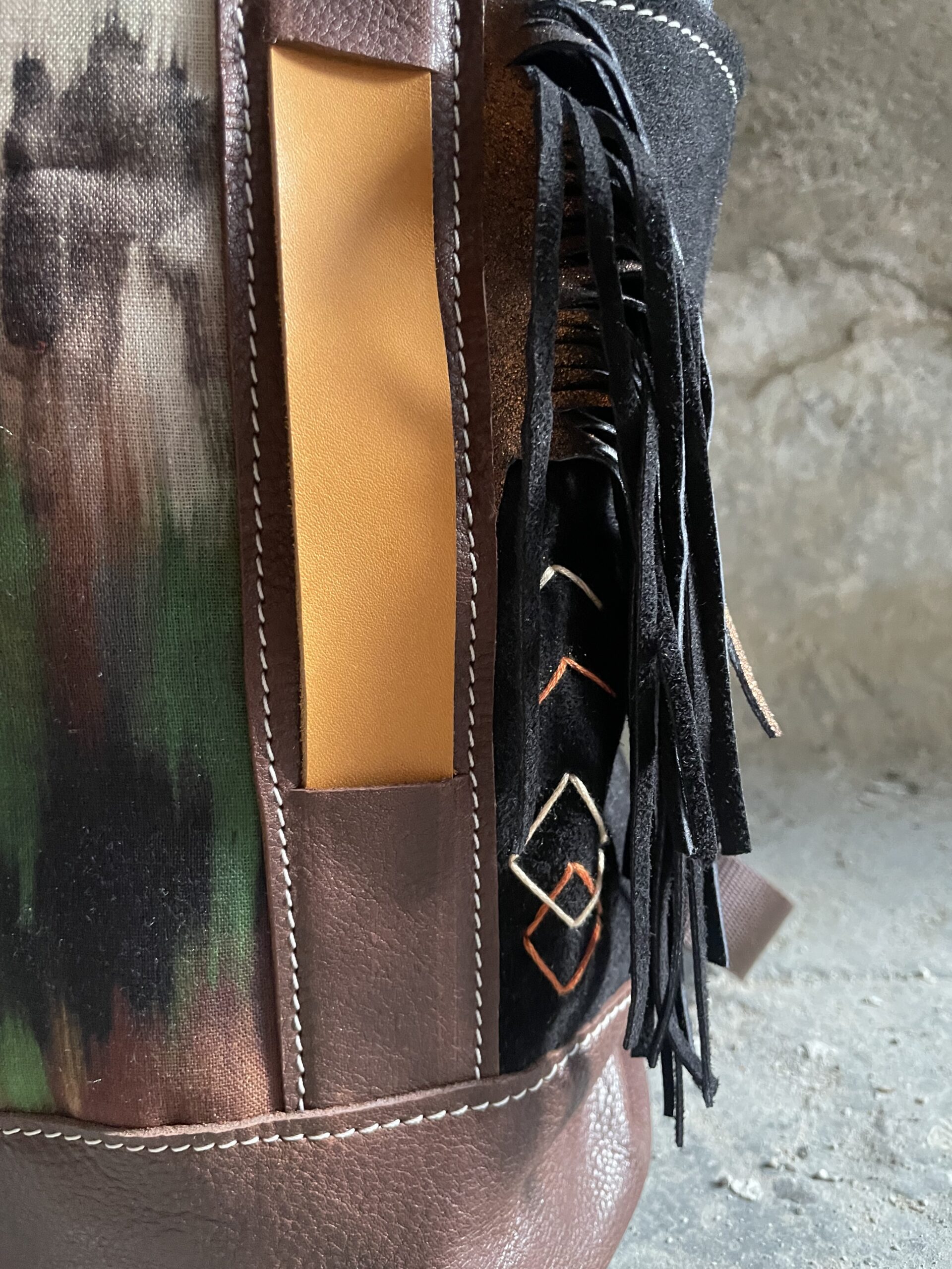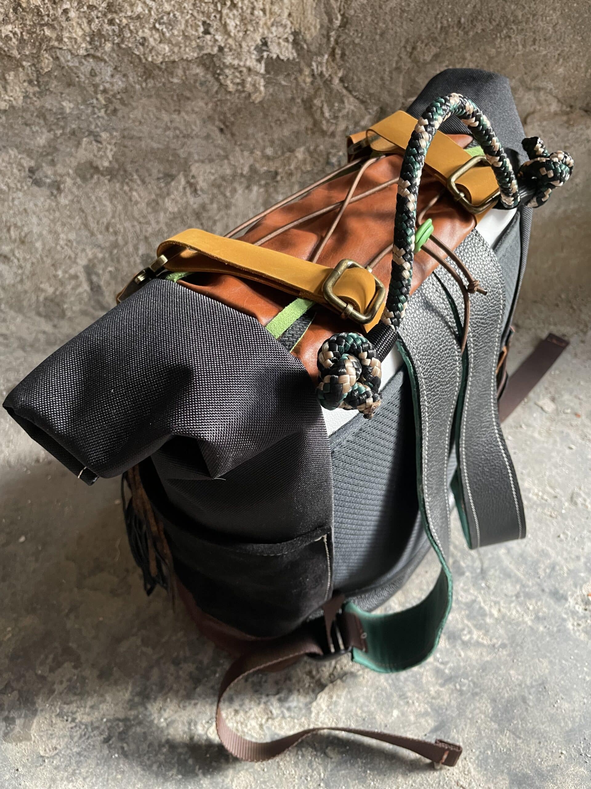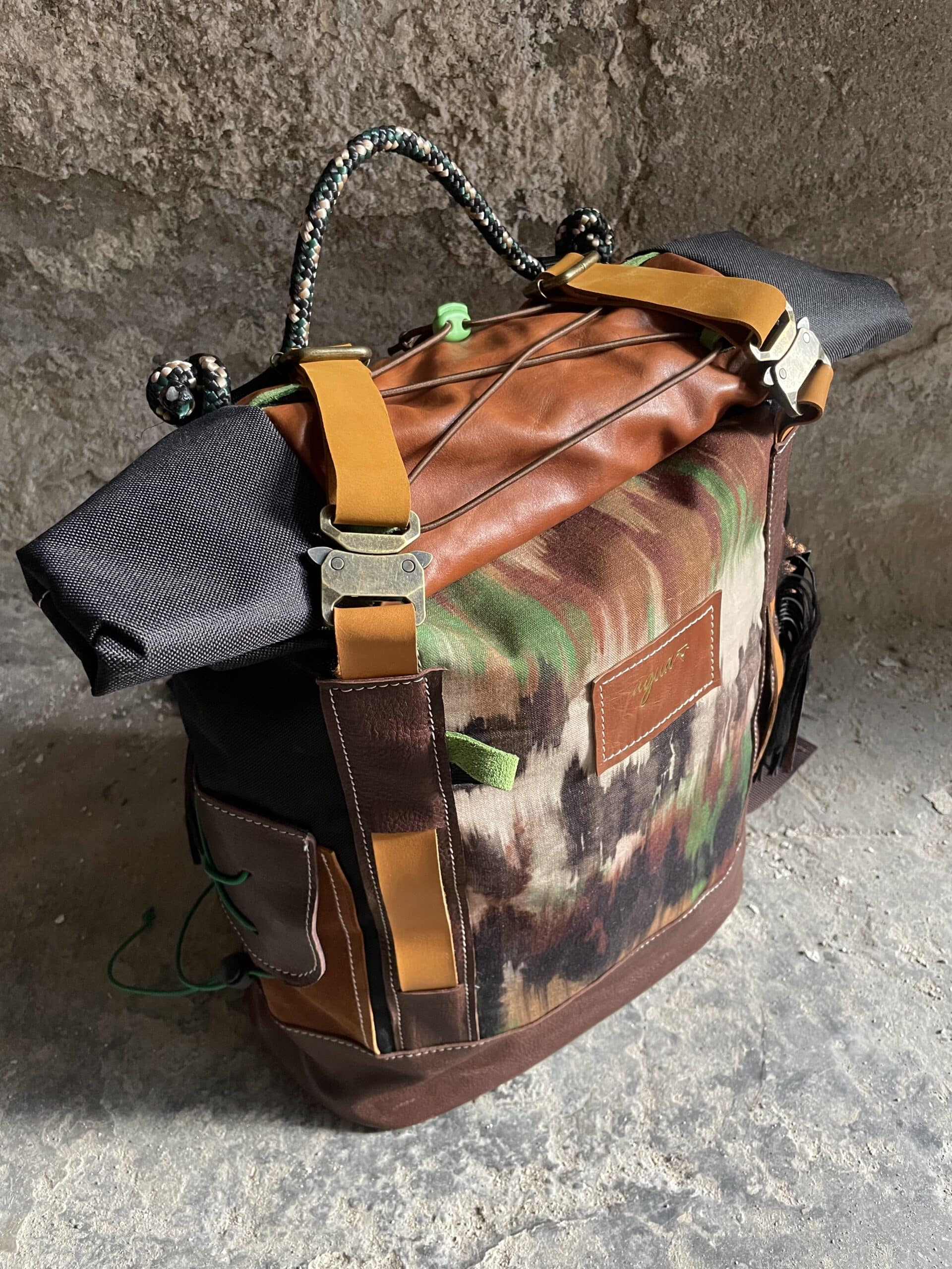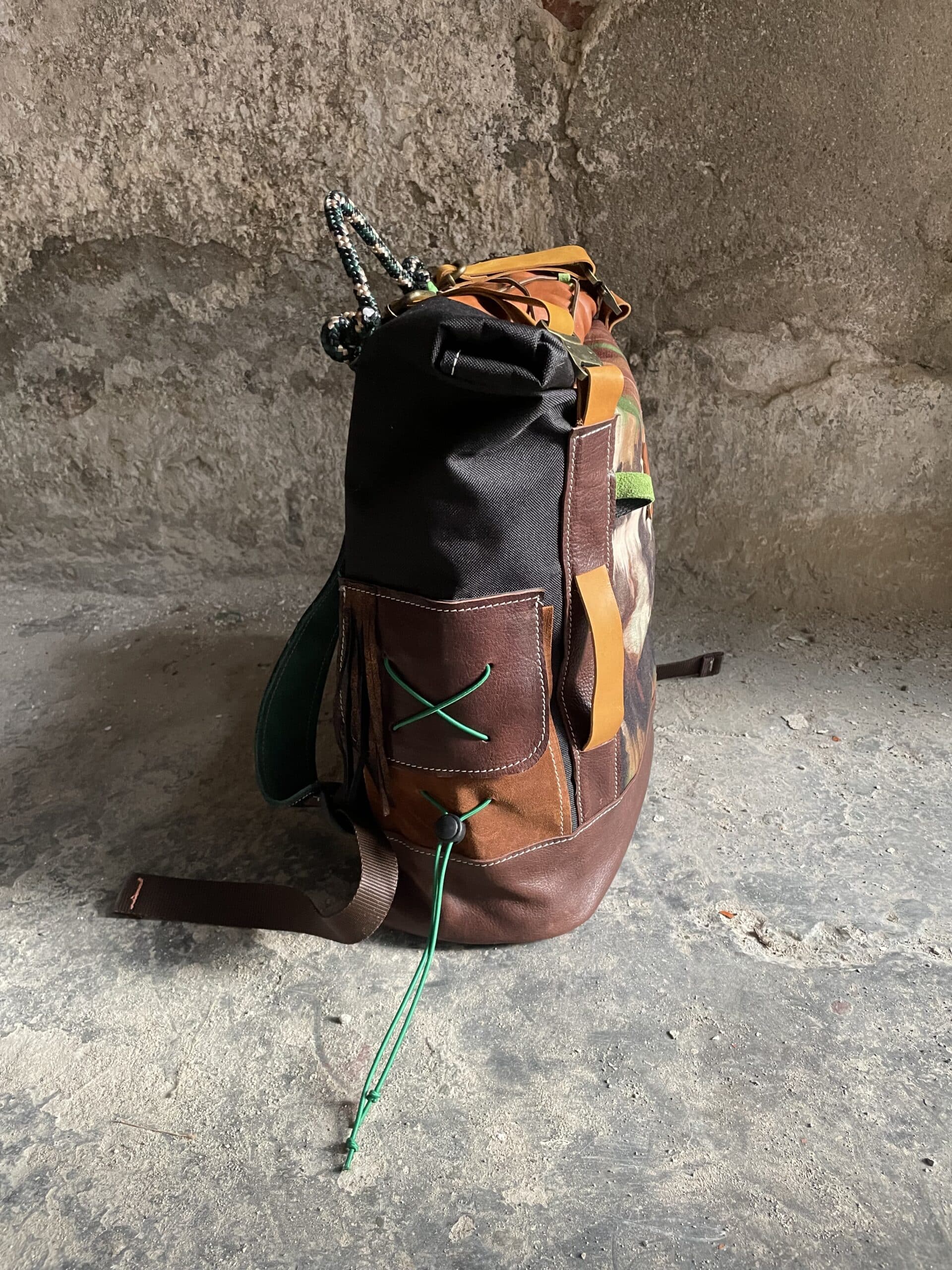 Zaino rolltop dai toni tribali realizzato in tessuto impermeabile cordura 600d nero con dettaglio frontale in tessuto di produzione italiana in cotone con tinta naturale e pellami misti, leftovers delle concerie italiane.