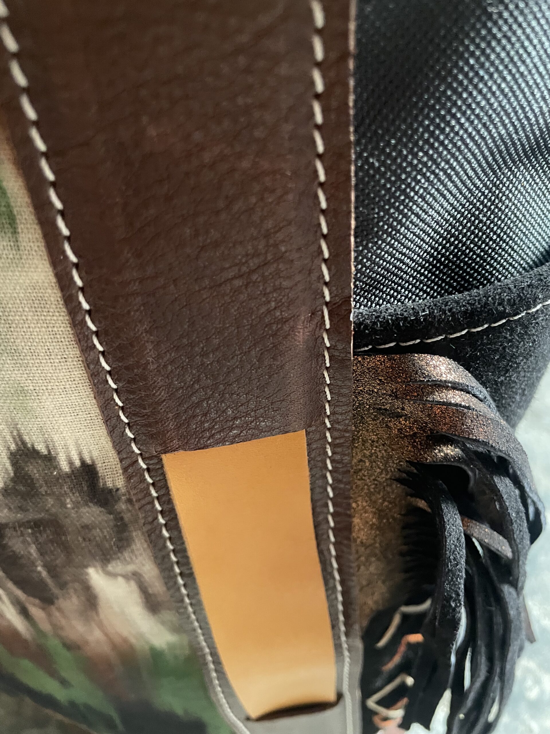 Due tasche laterali: una in suede nero con dettaglio frange doubleface con colorazione rame/brillante e dettaglio ricamo tribale, l’altra in pellami misti con chiusura patta e dettaglio laccio e lastico verde.
