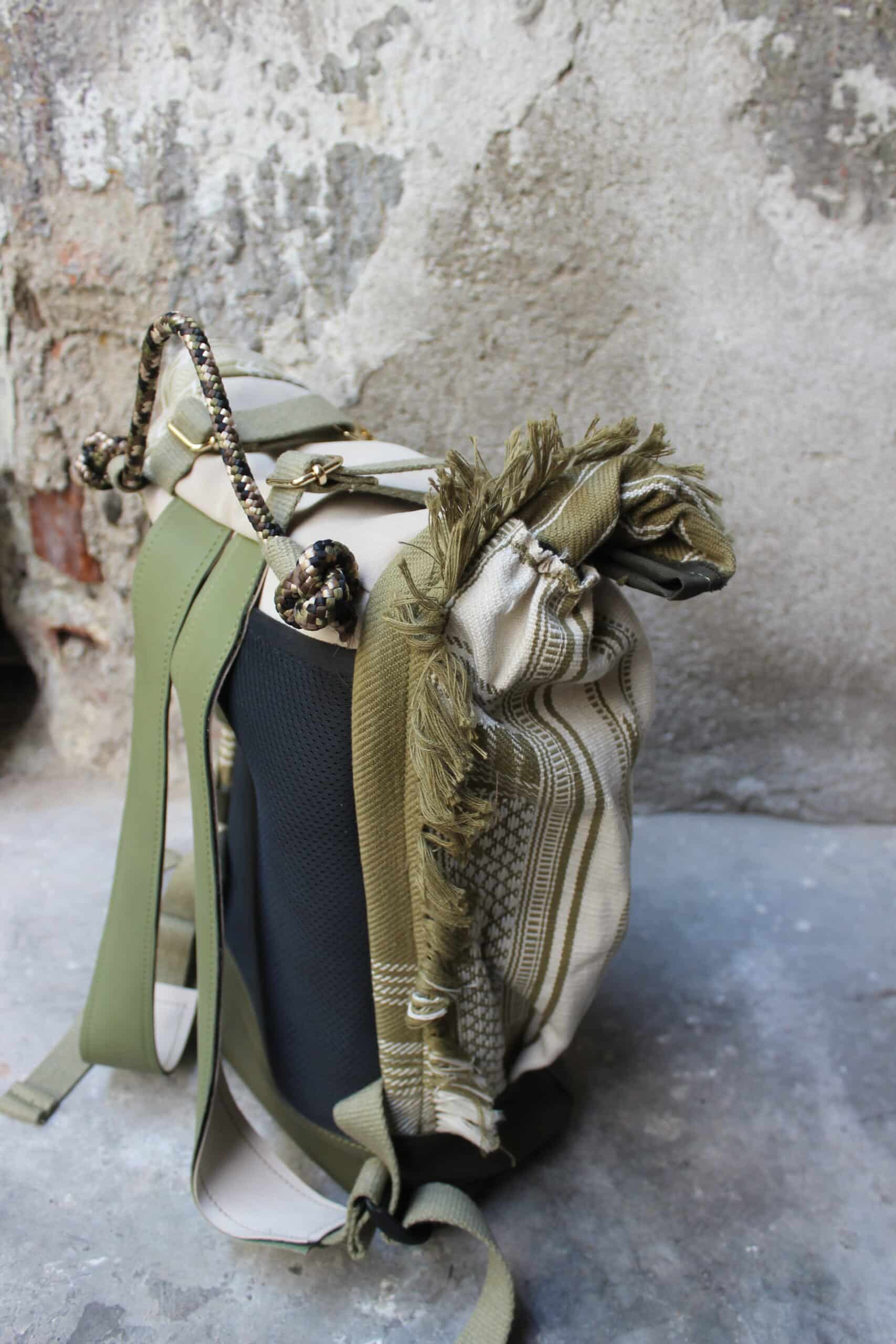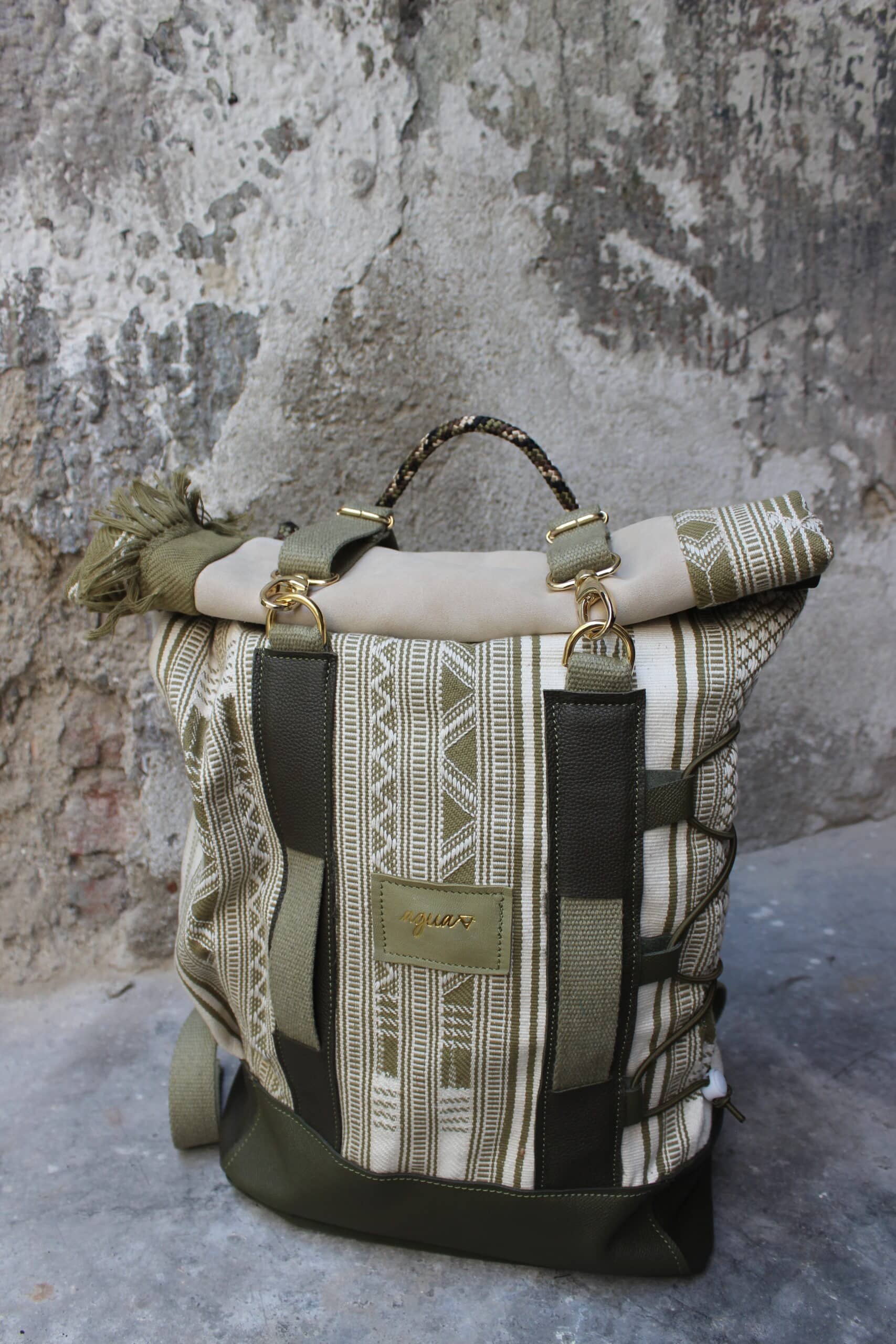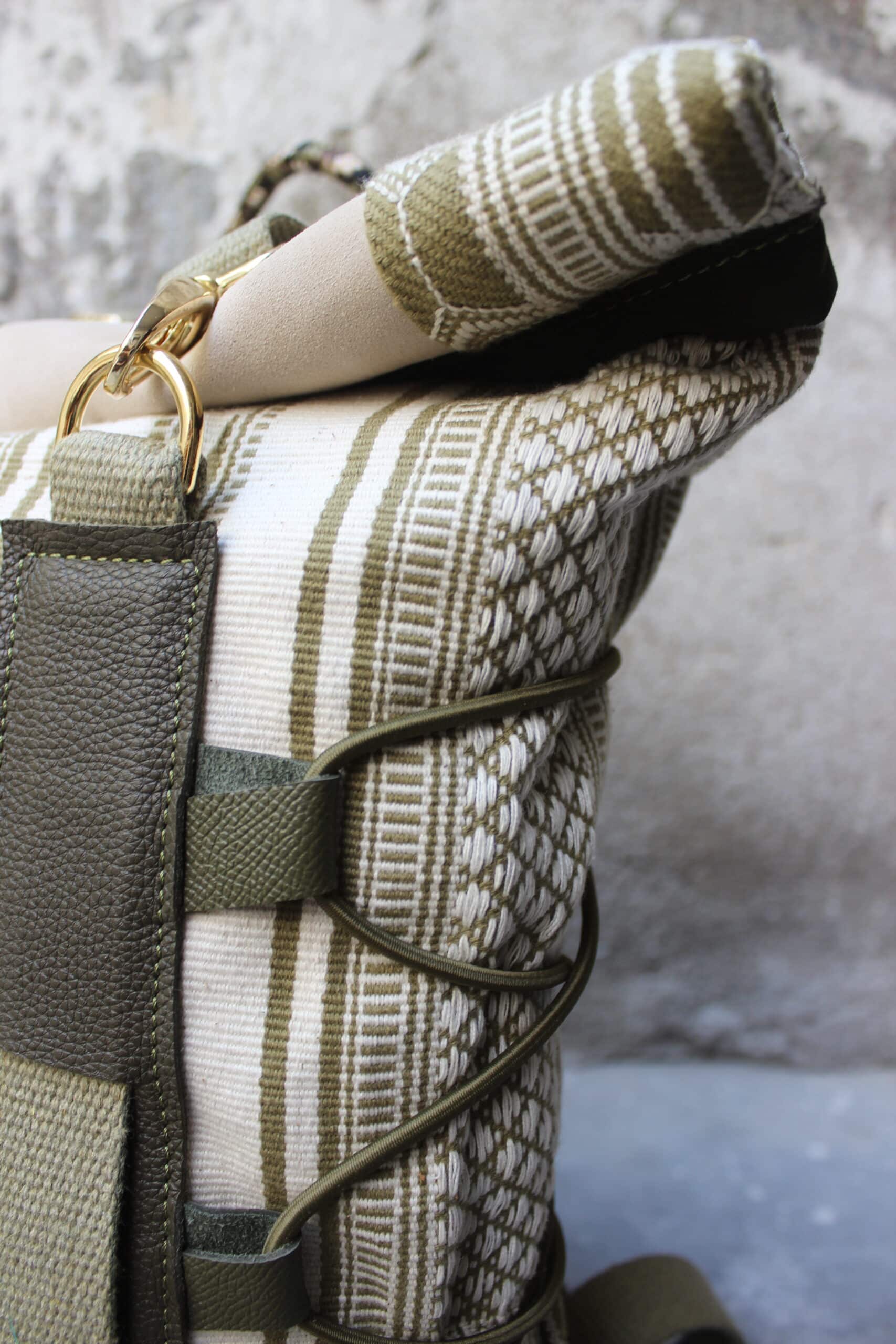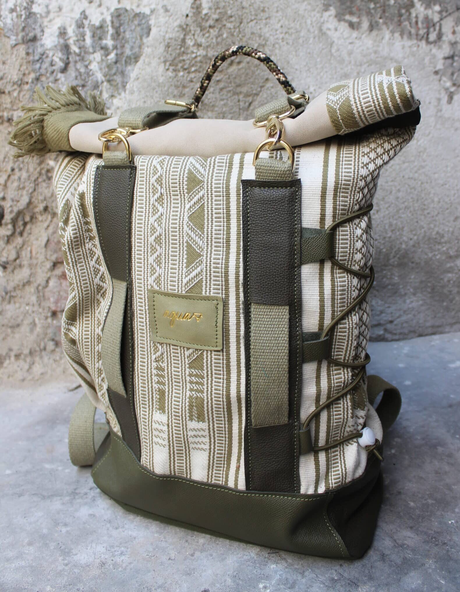 Zaino rolltop realizzato con tessuto in cotone realizzato a telaio da una famiglia di tessitori in India, e pellami misti leftovers di concerie italiane.