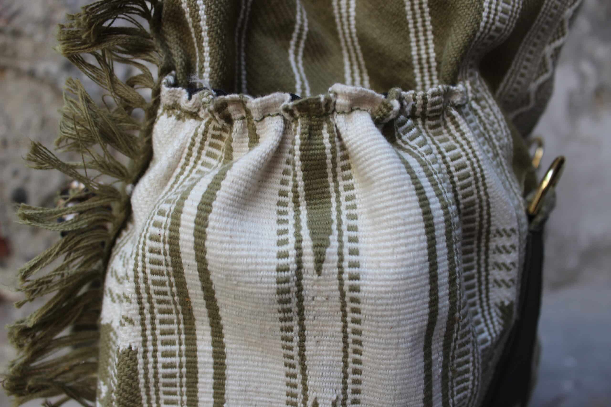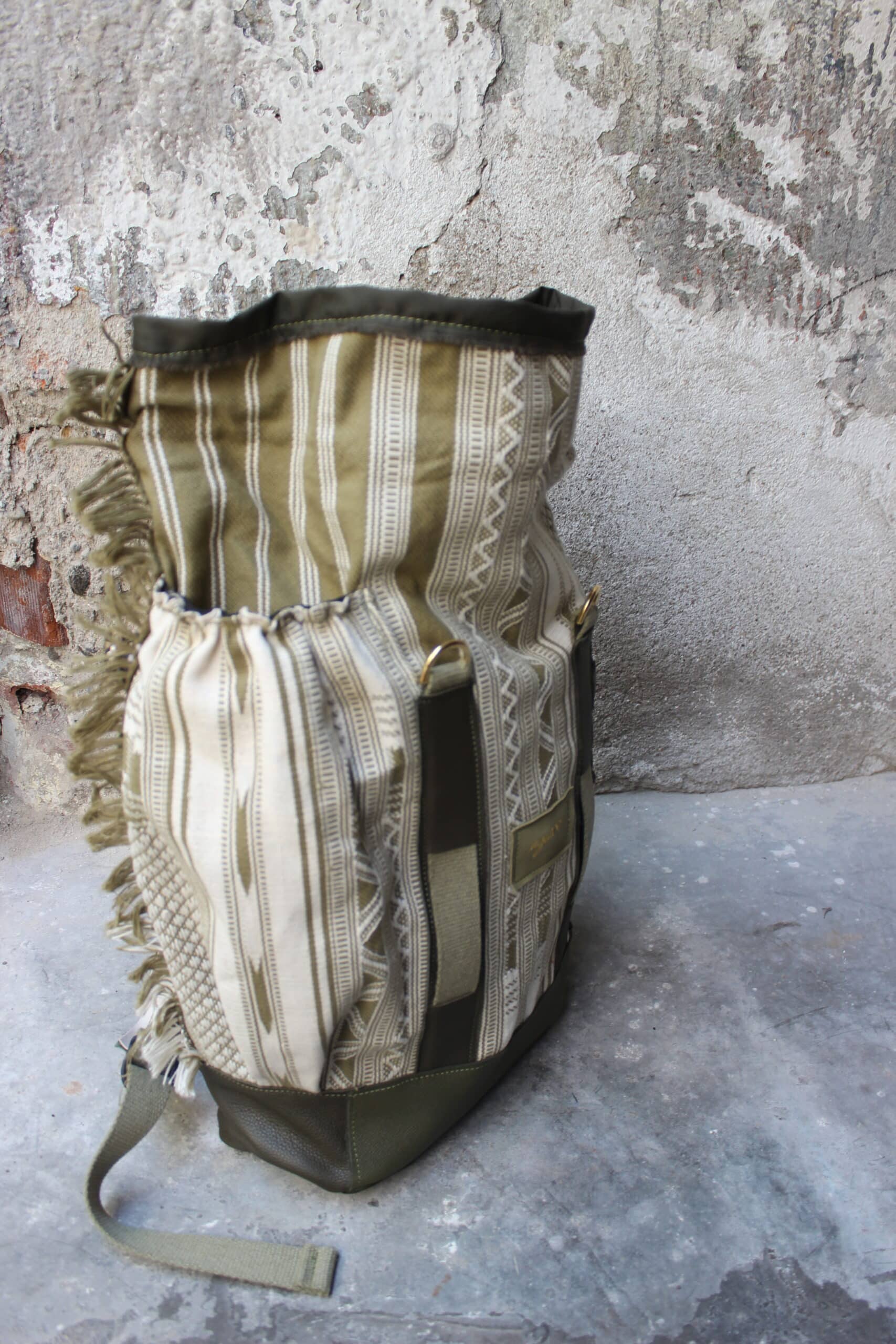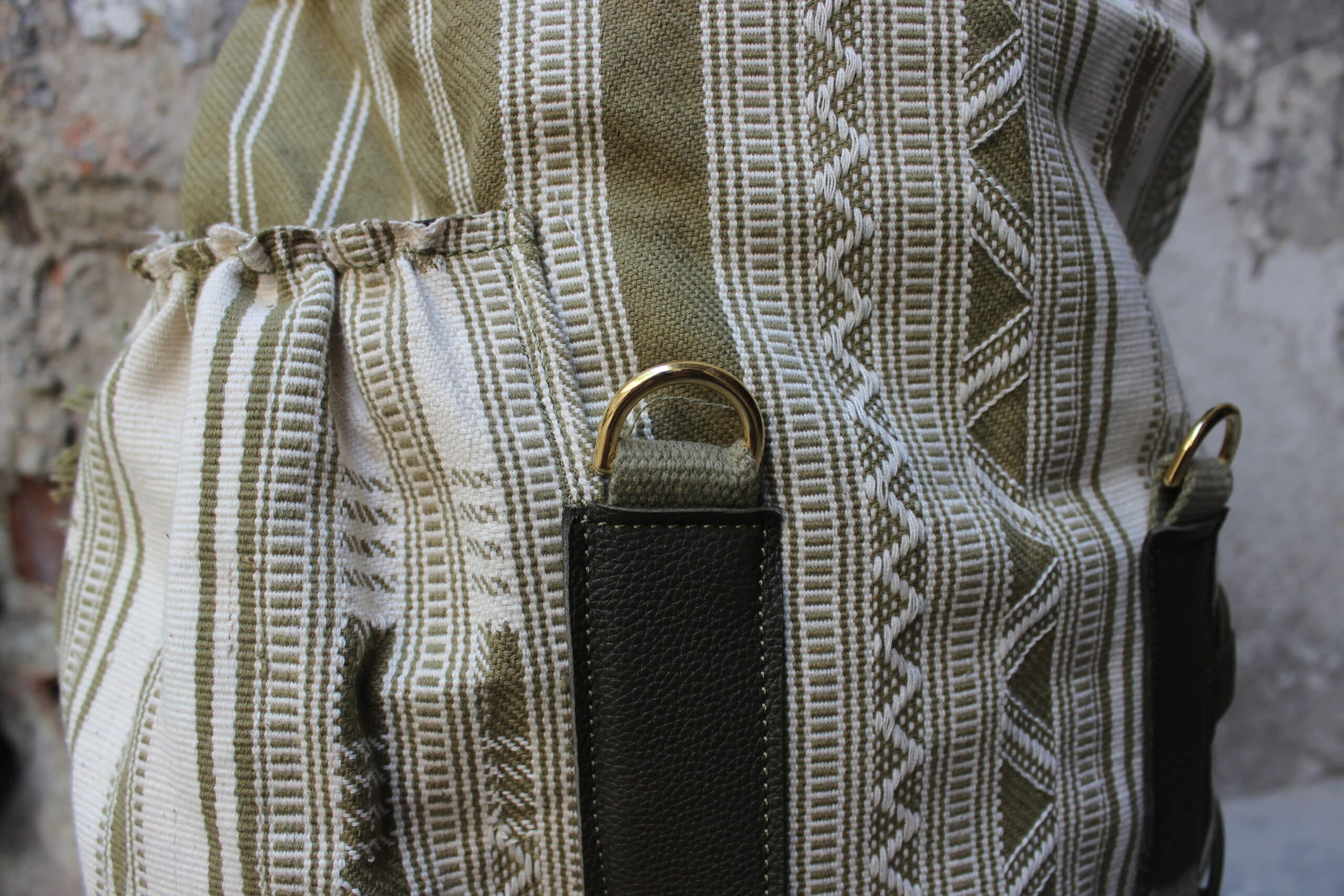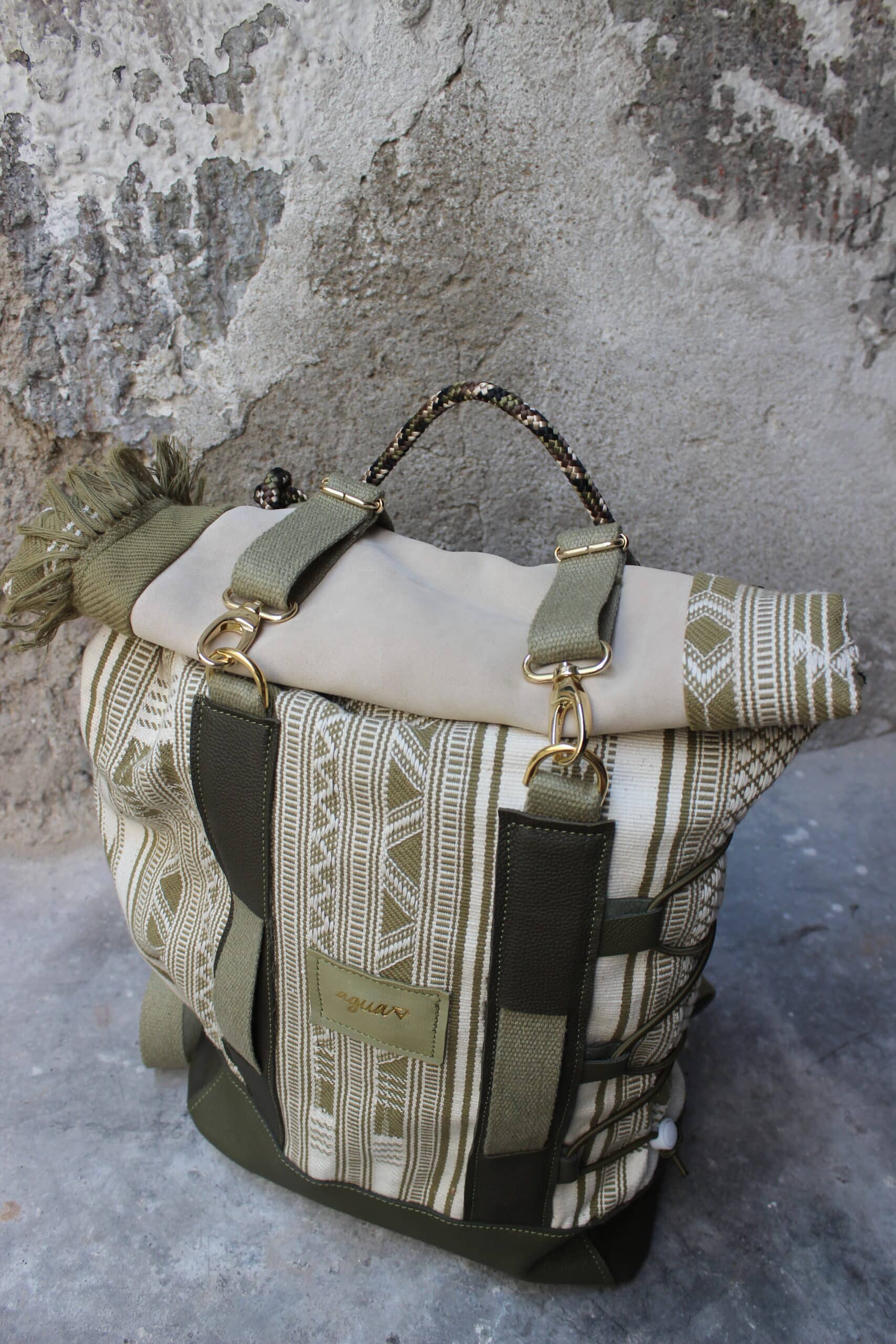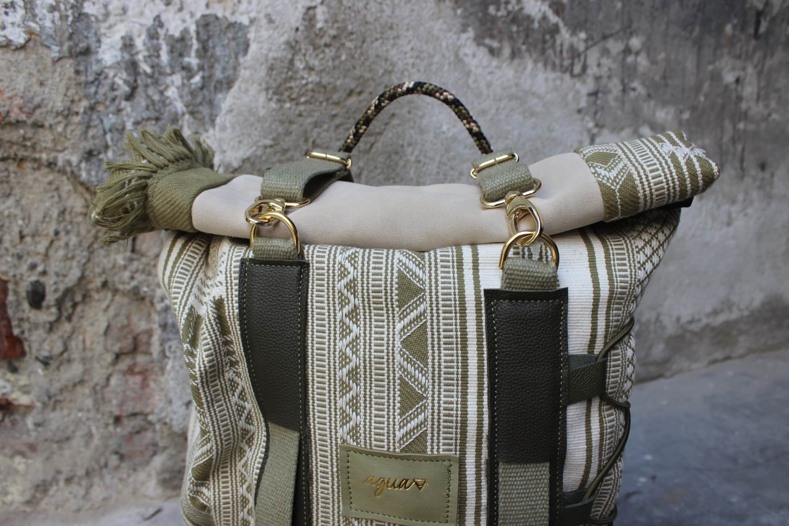 Zaino rolltop realizzato con tessuto in cotone realizzato a telaio da una famiglia di tessitori in India, e pellami misti leftovers di concerie italiane.