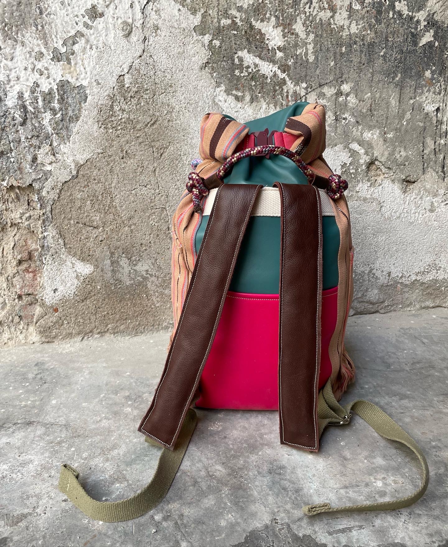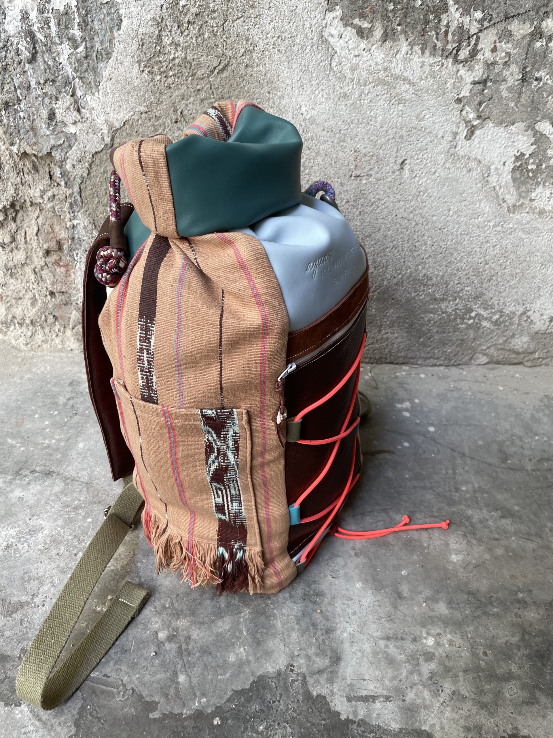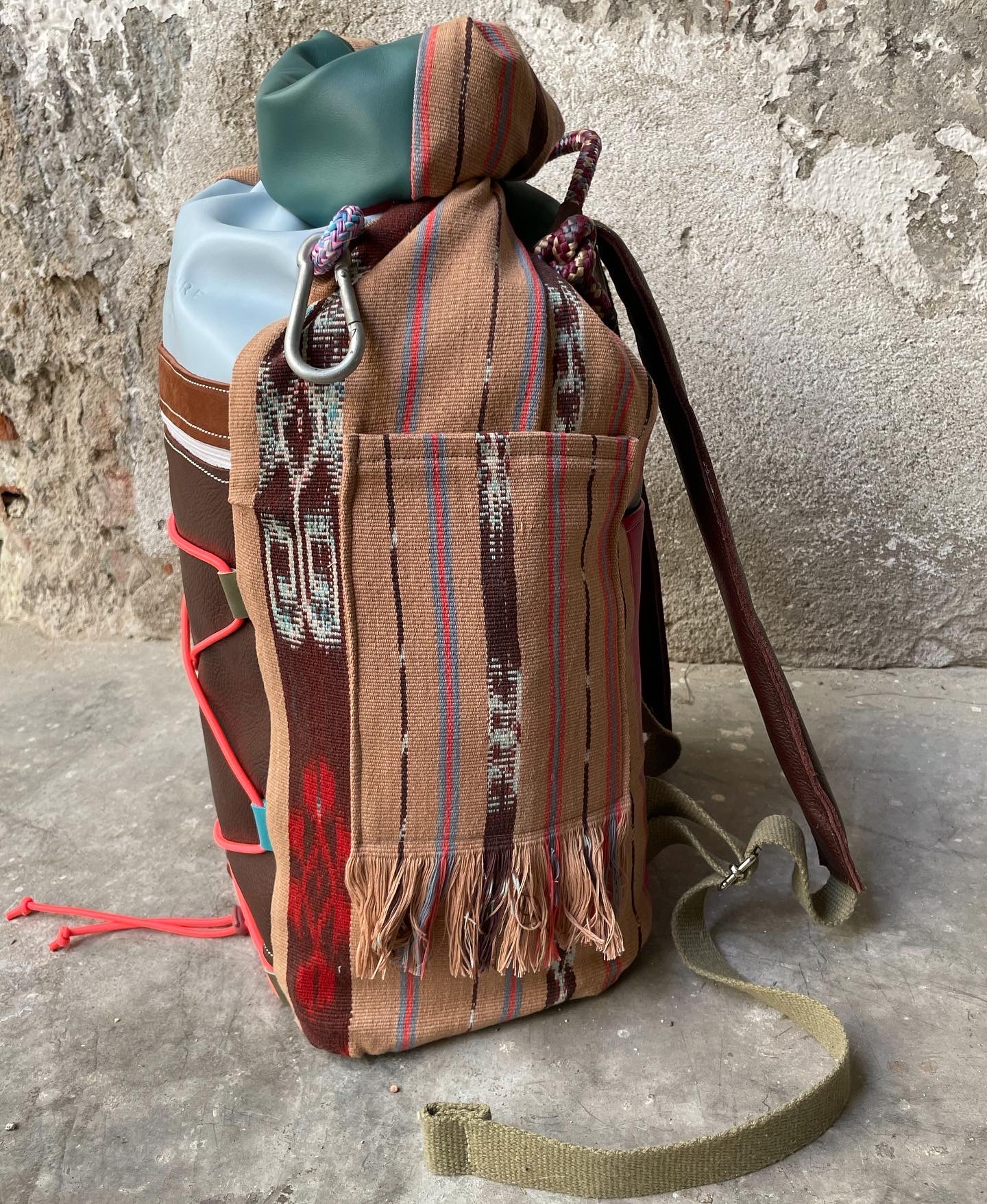 Zaino realizzato con tessuto artigianale in cotone indonesiano KARAJA IKAT tinto in modo naturale, in pellami misti, leftovers di produzione italiana. Il tessuto più colorato tra quelli presi in Indonesia: aveva un’energia avventuriera, esploratrice e divertente.