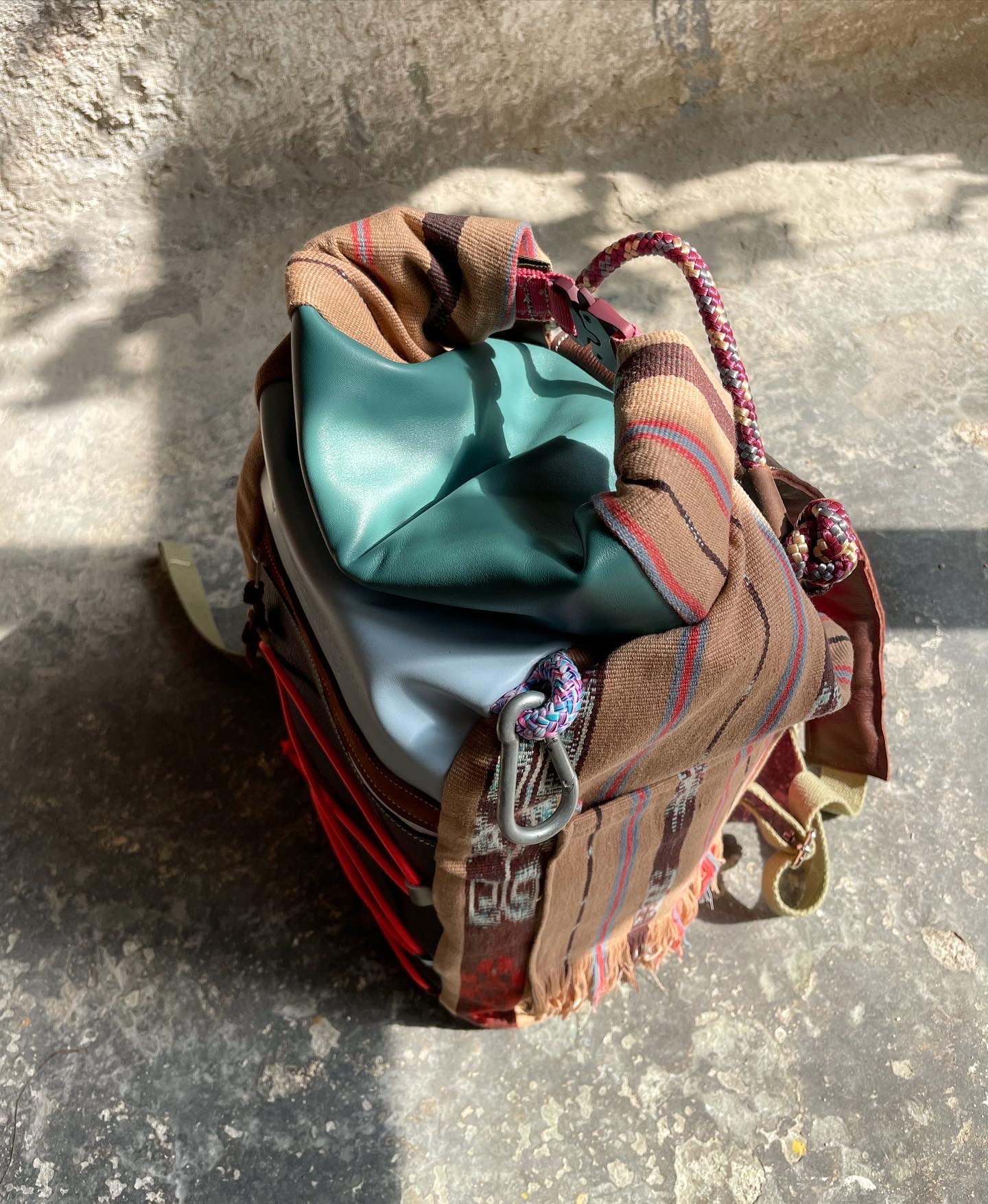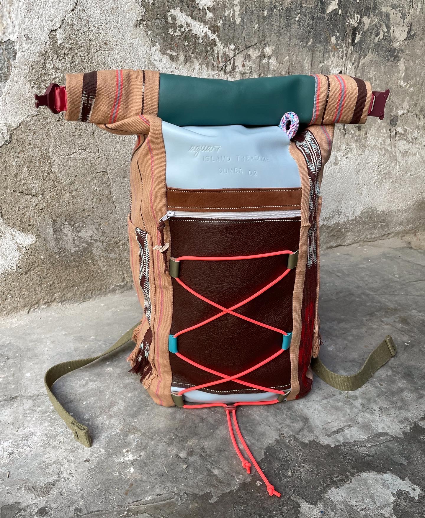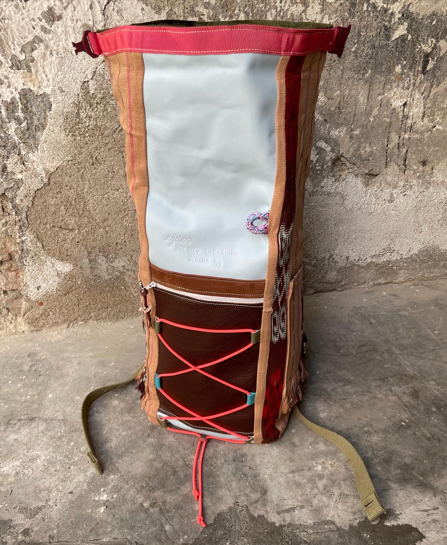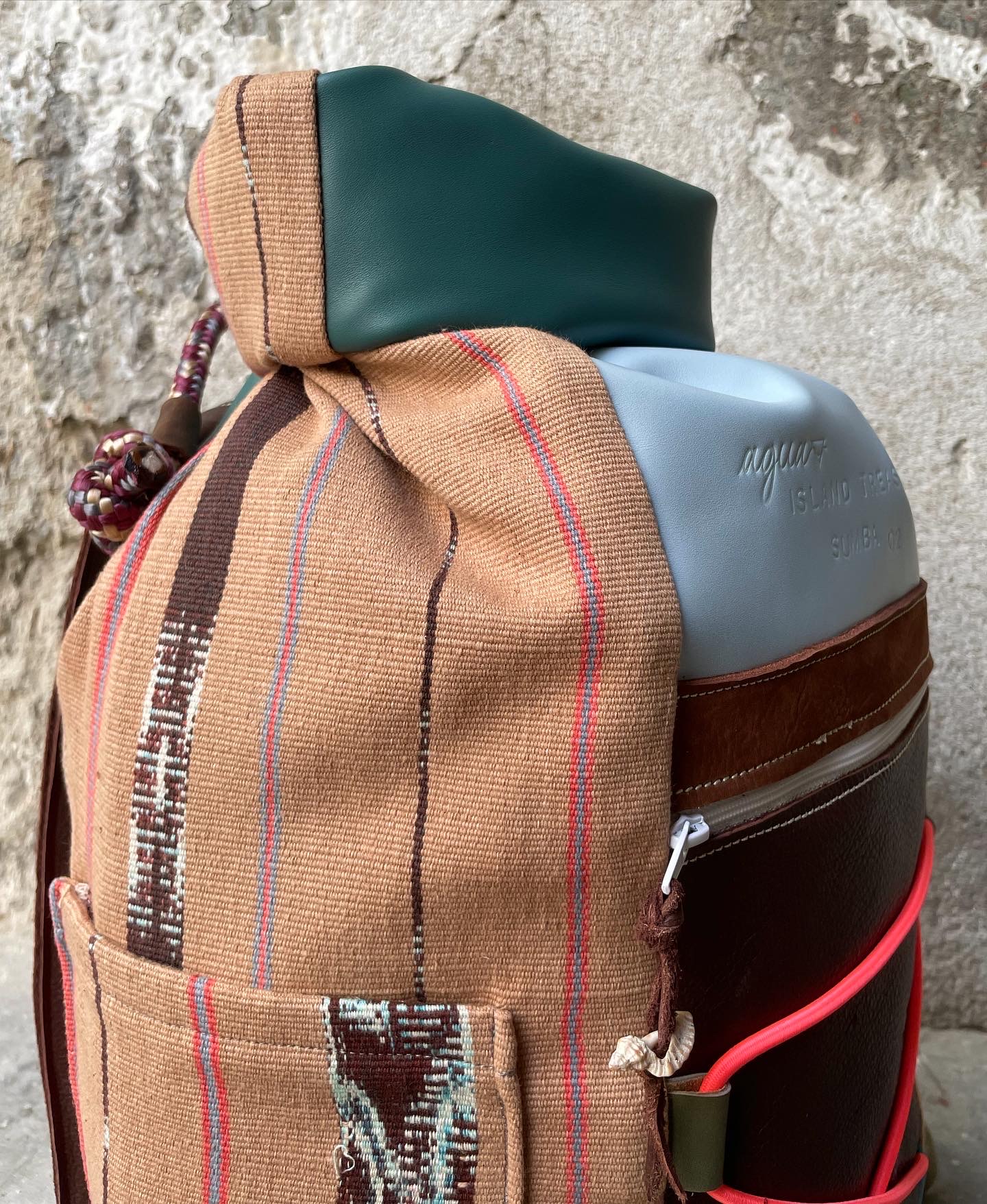 Zaino realizzato con tessuto artigianale in cotone indonesiano KARAJA IKAT tinto in modo naturale, in pellami misti, leftovers di produzione italiana. Il tessuto più colorato tra quelli presi in Indonesia: aveva un’energia avventuriera, esploratrice e divertente.