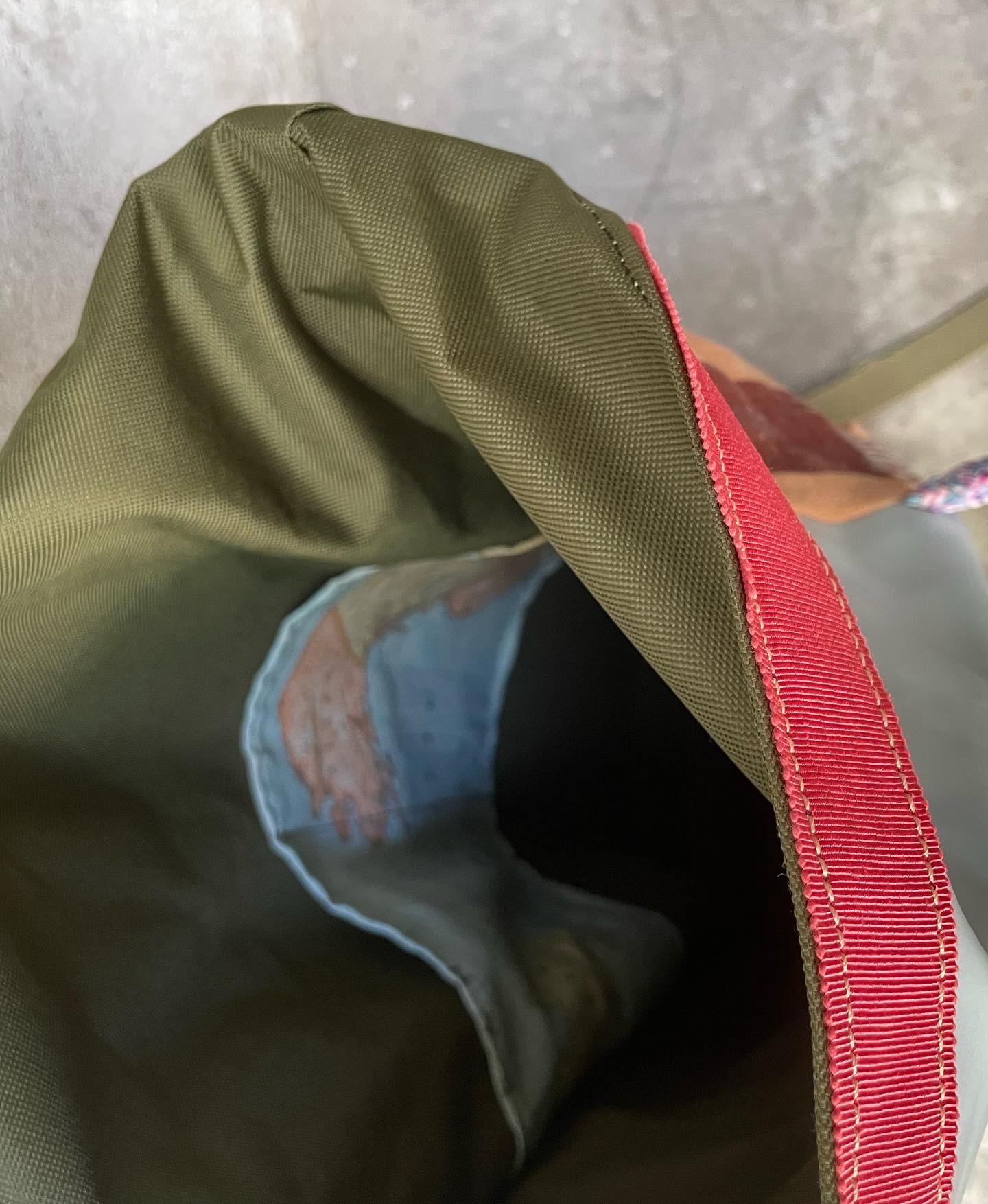 Modello a sacca con chiusura rolltop. Due tasche laterali con dettaglio frange e una tasca frontale chiusa con con cerniera. Lo zaino presenta un’ulteriore tasca sullo schienale, gli spallacci sono imbottiti e regolabili. La fodera interna è impermeabile con due taschine porta oggetti in cotone con stampa cartina geografica.