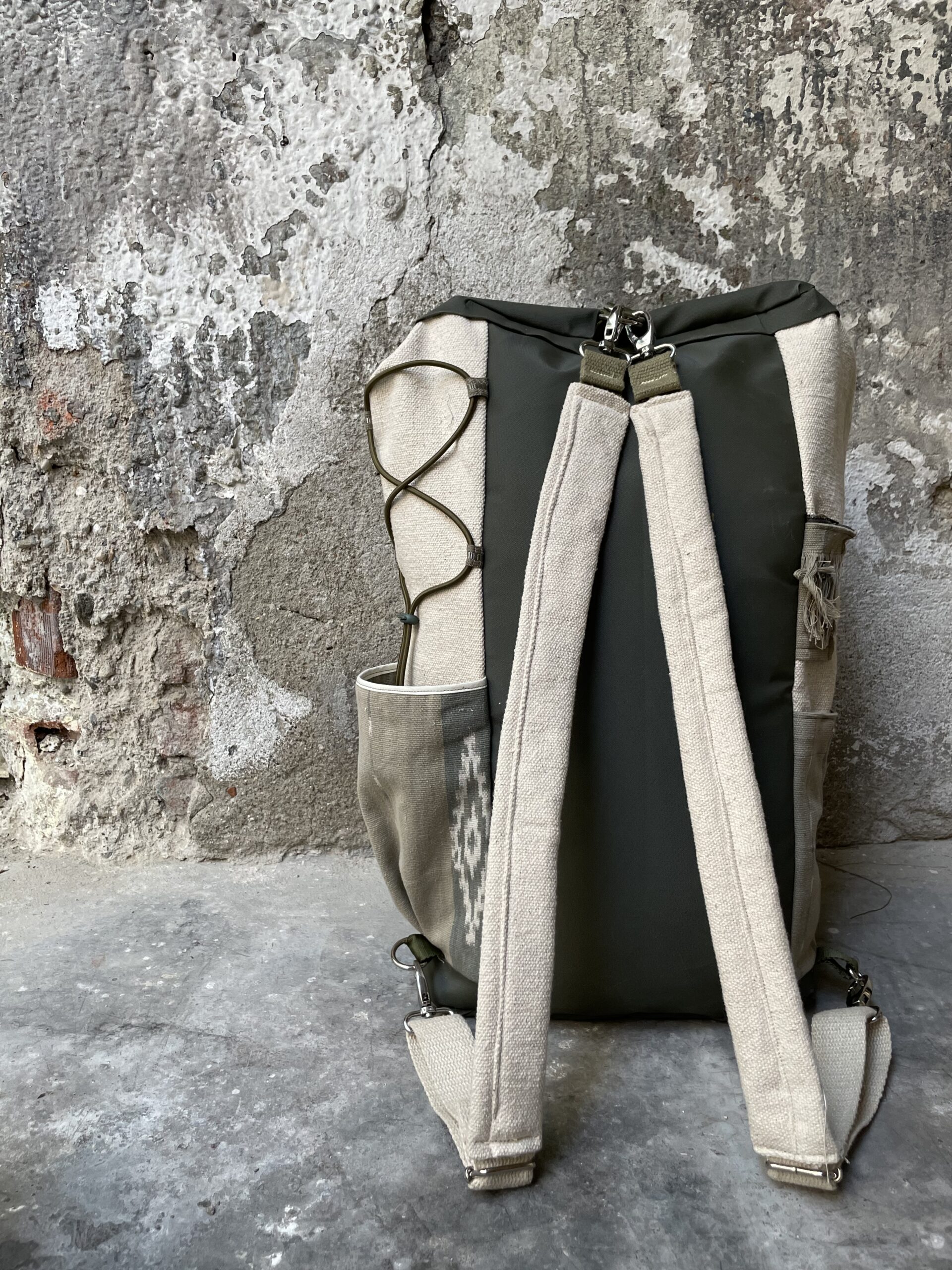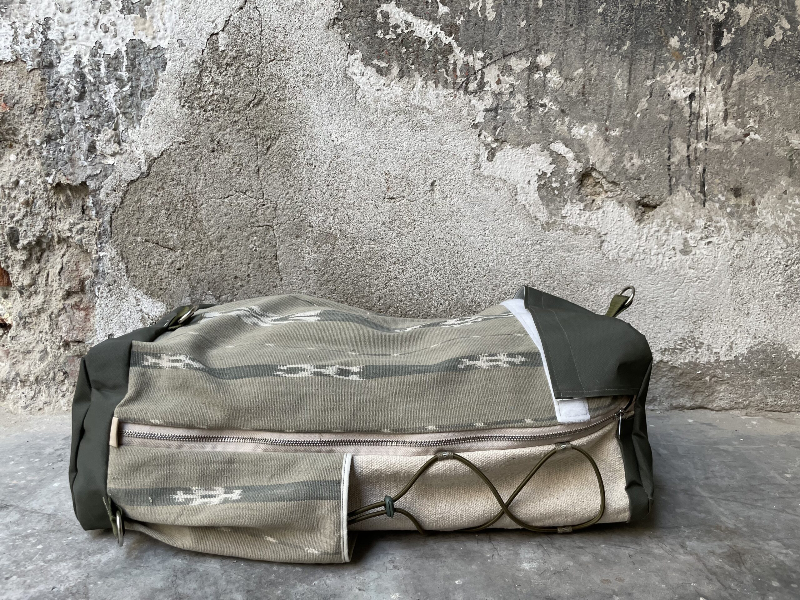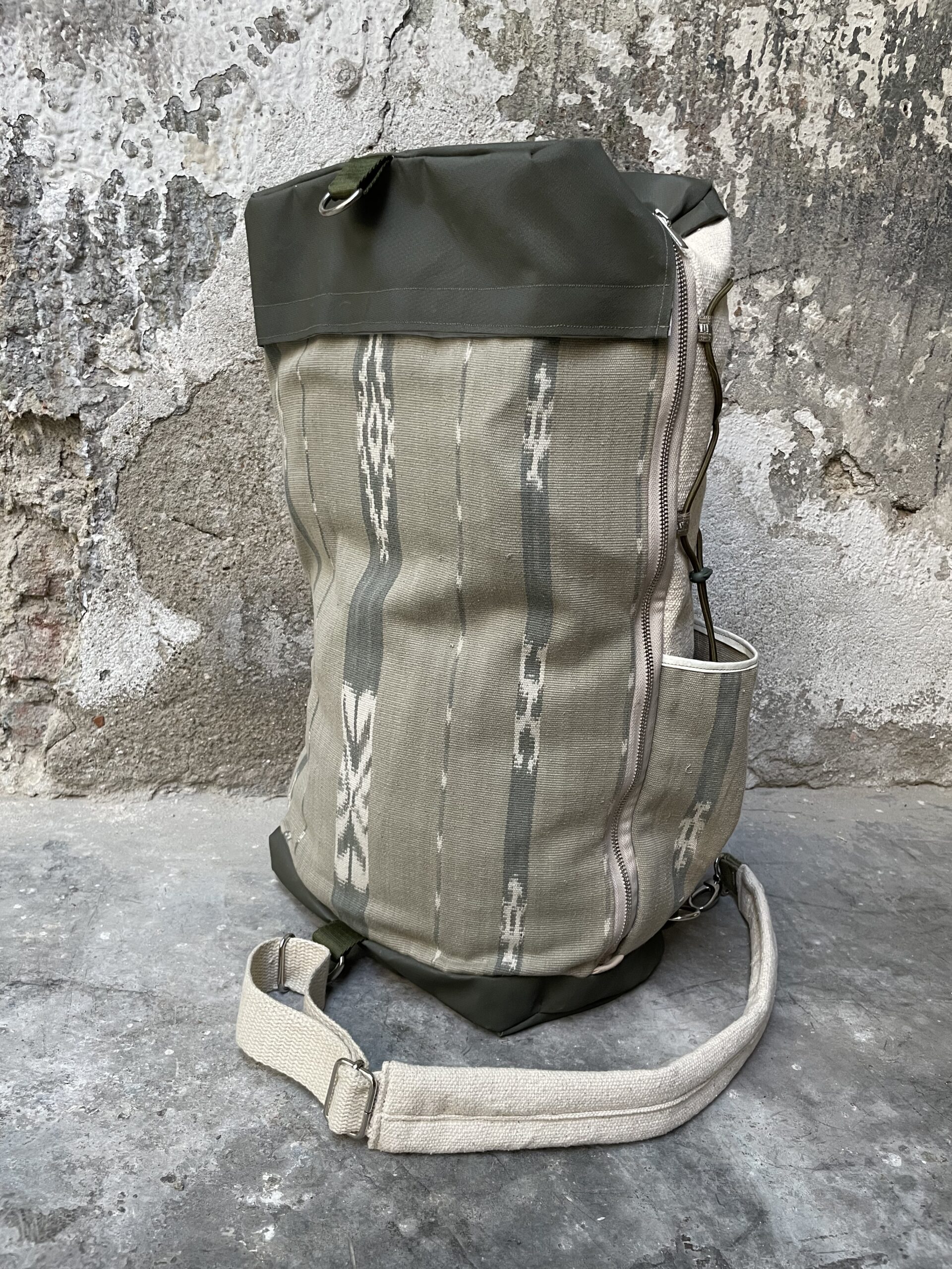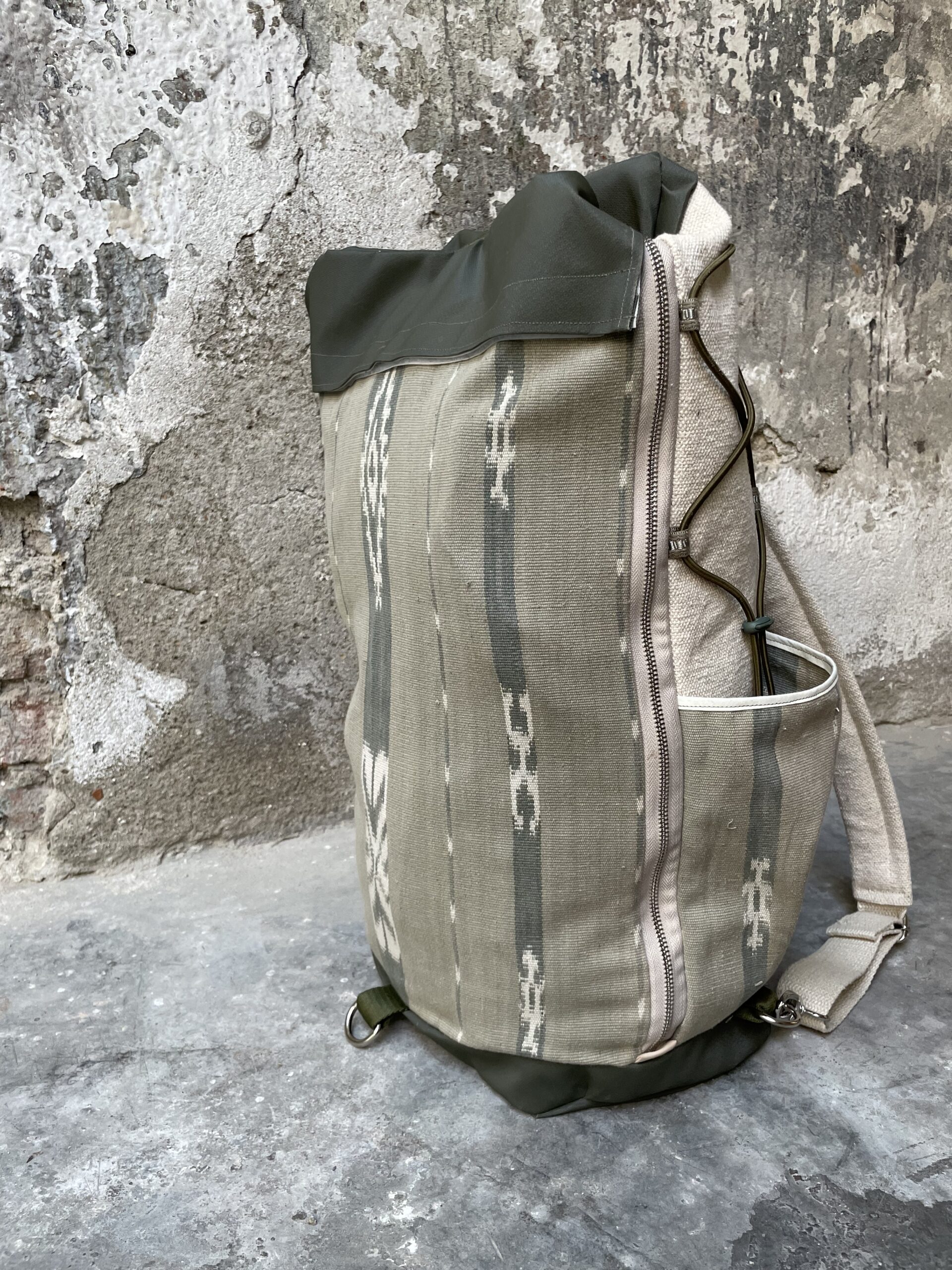 Il primo modello 100% Vegan, un po’ borsone, un po’ zaino. Realizzato in tessuto impermeabile cordura, misto a cotone grezzo e tessuto artigianale in cotone indonesiano KARAJA IKAT tinto in modo naturale.