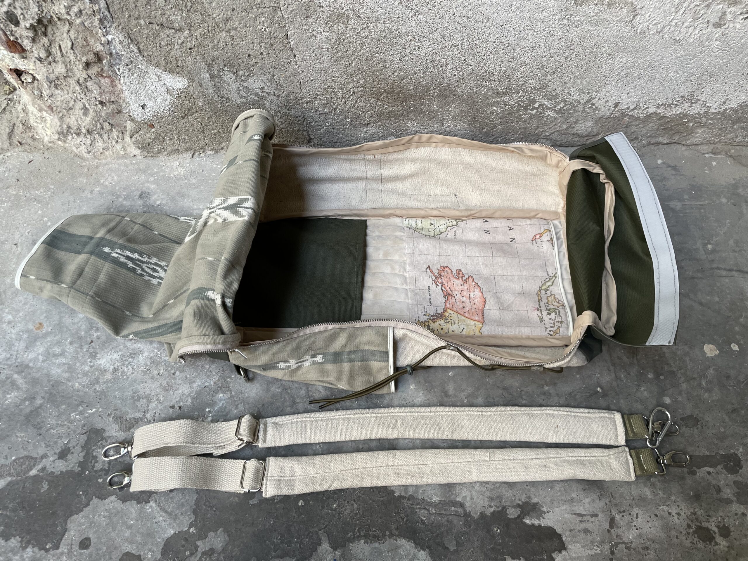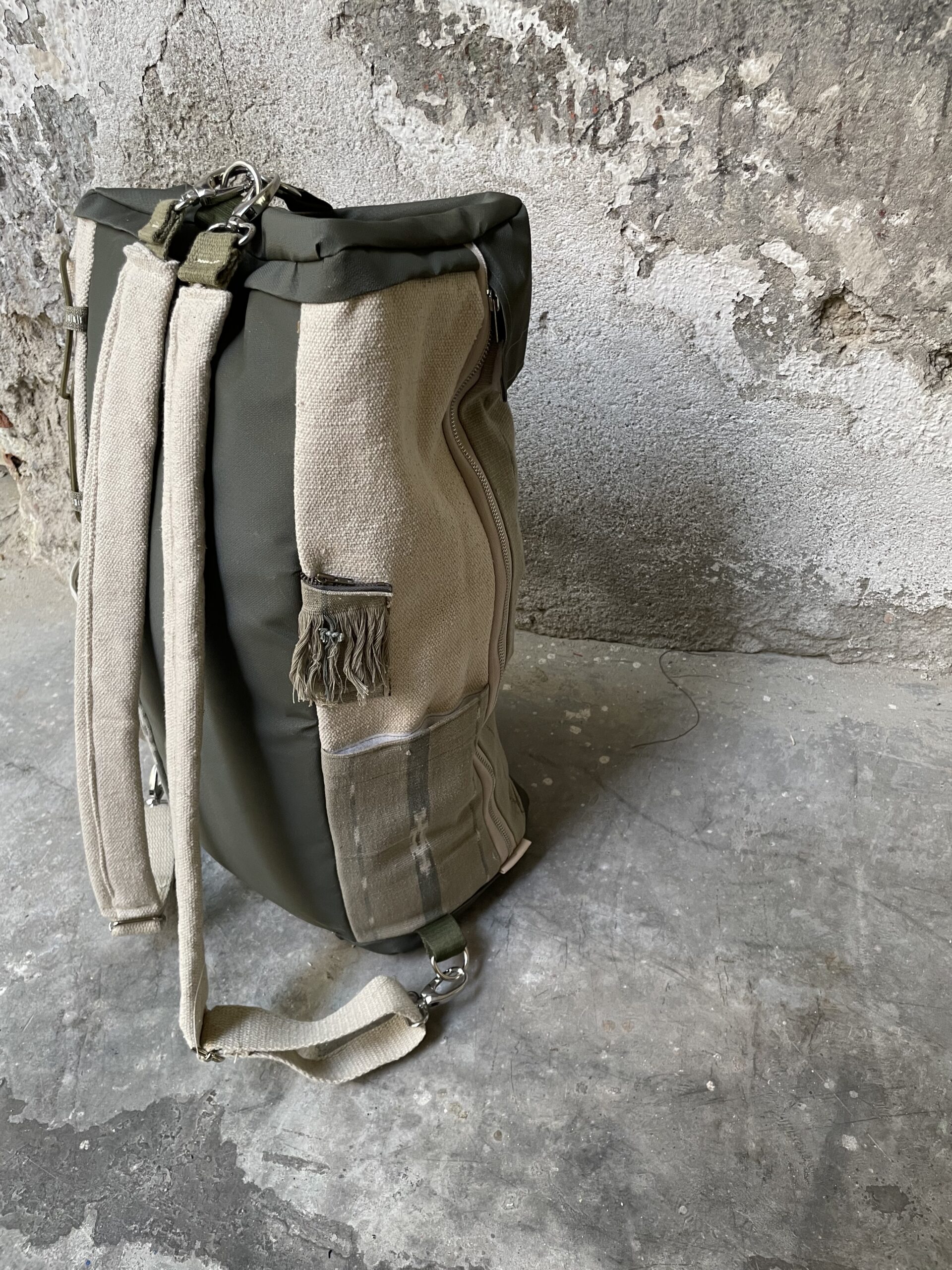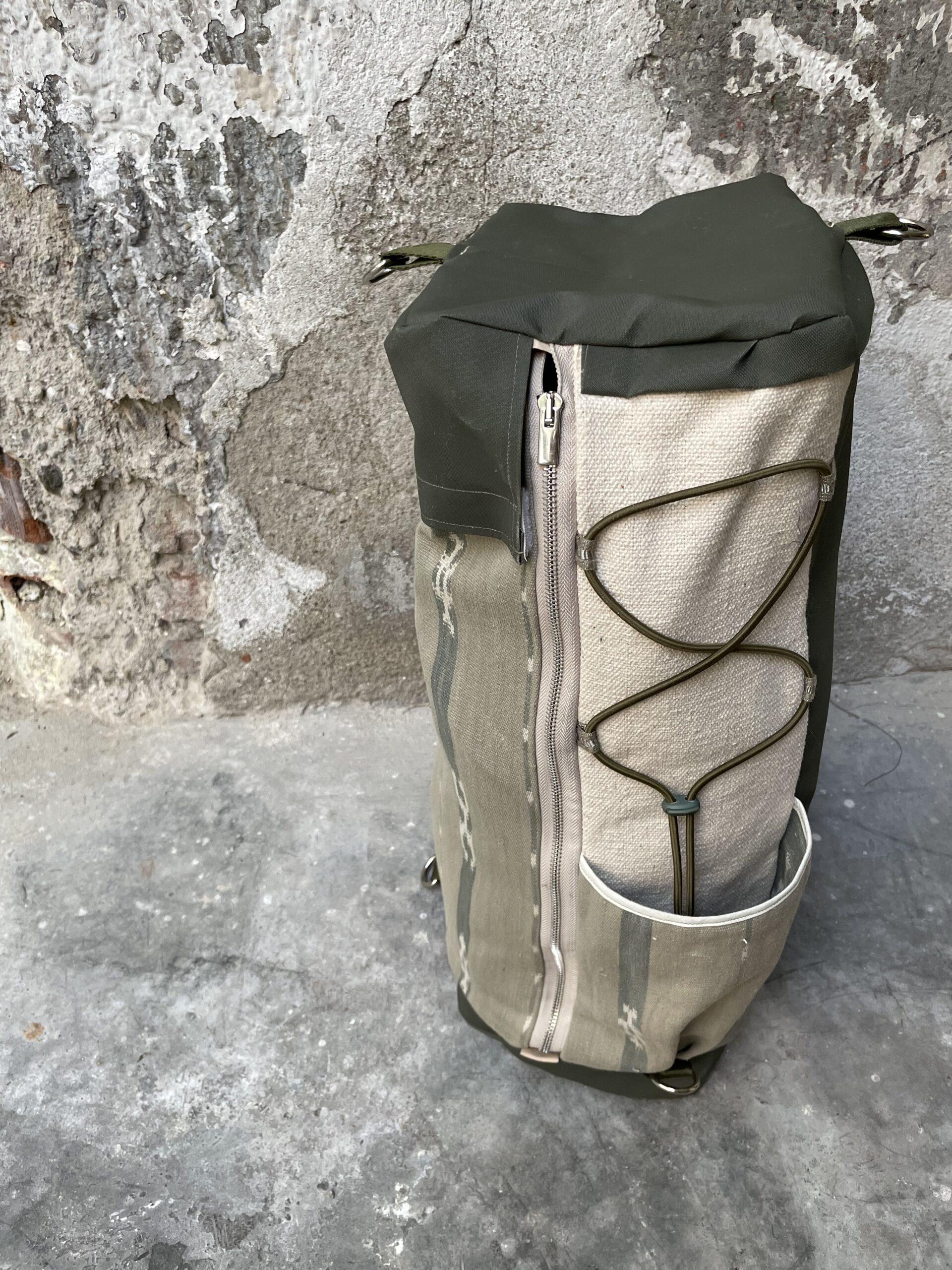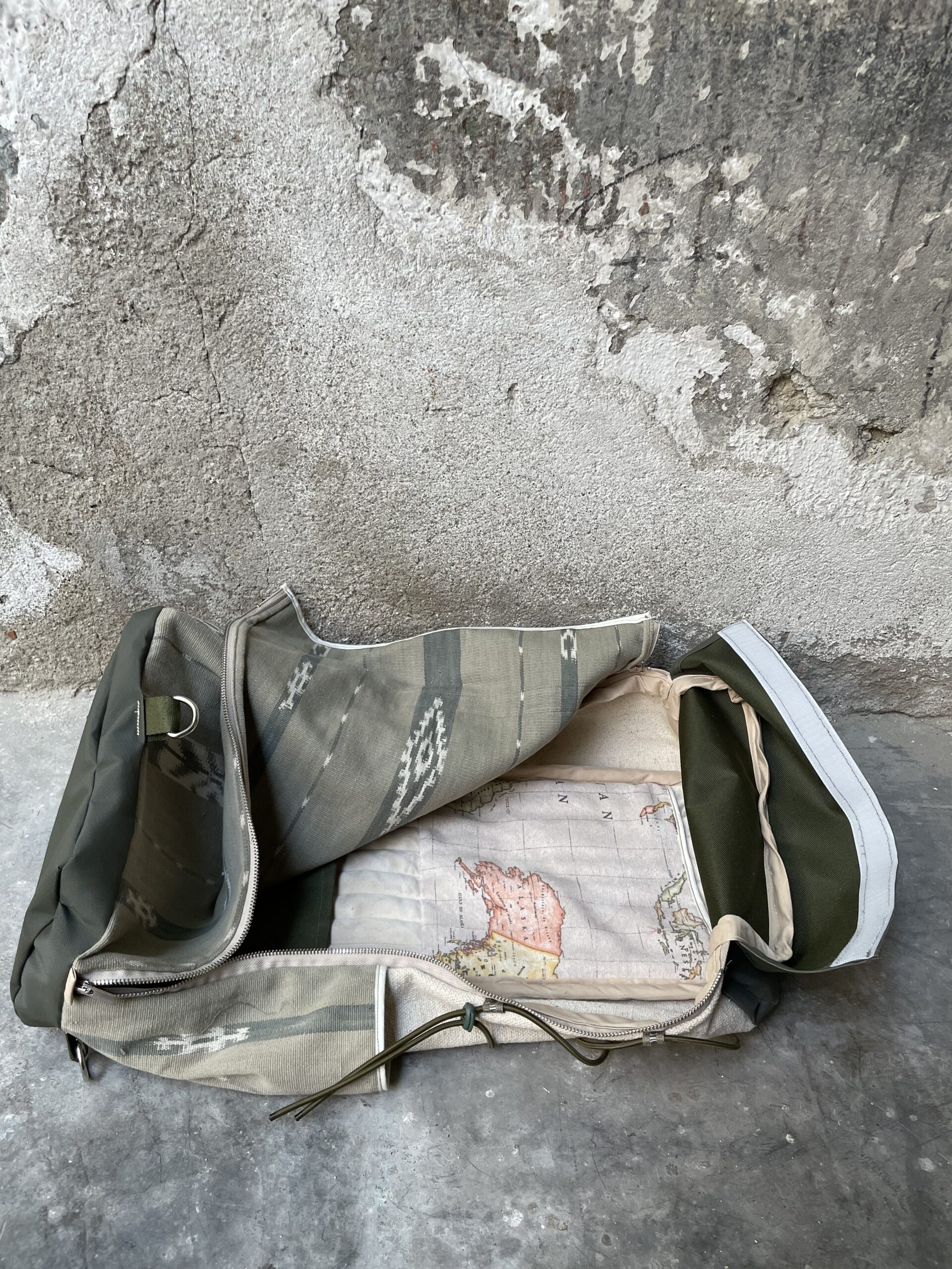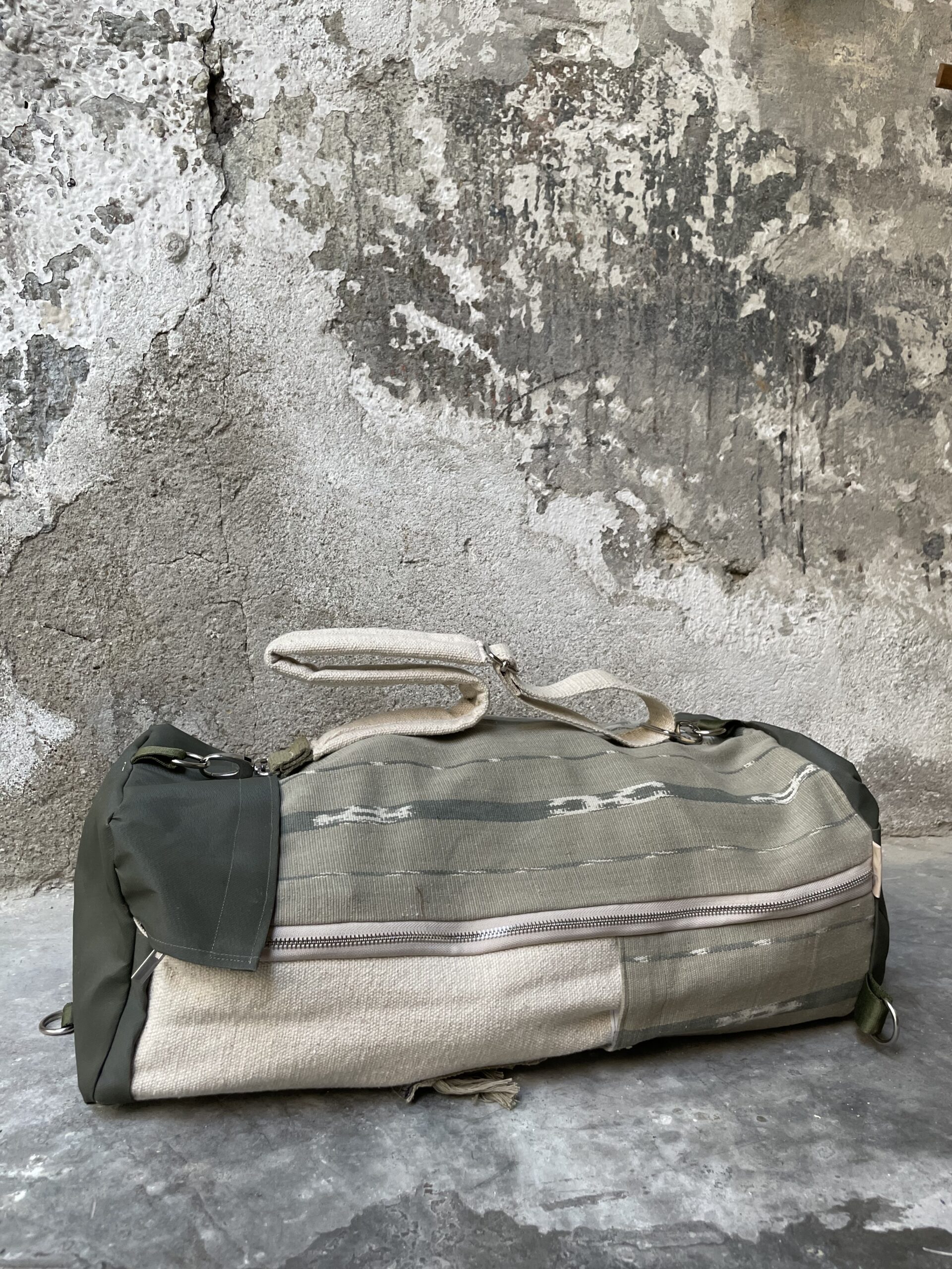 Il primo modello 100% Vegan, un po’ borsone, un po’ zaino. Realizzato in tessuto impermeabile cordura, misto a cotone grezzo e tessuto artigianale in cotone indonesiano KARAJA IKAT tinto in modo naturale.