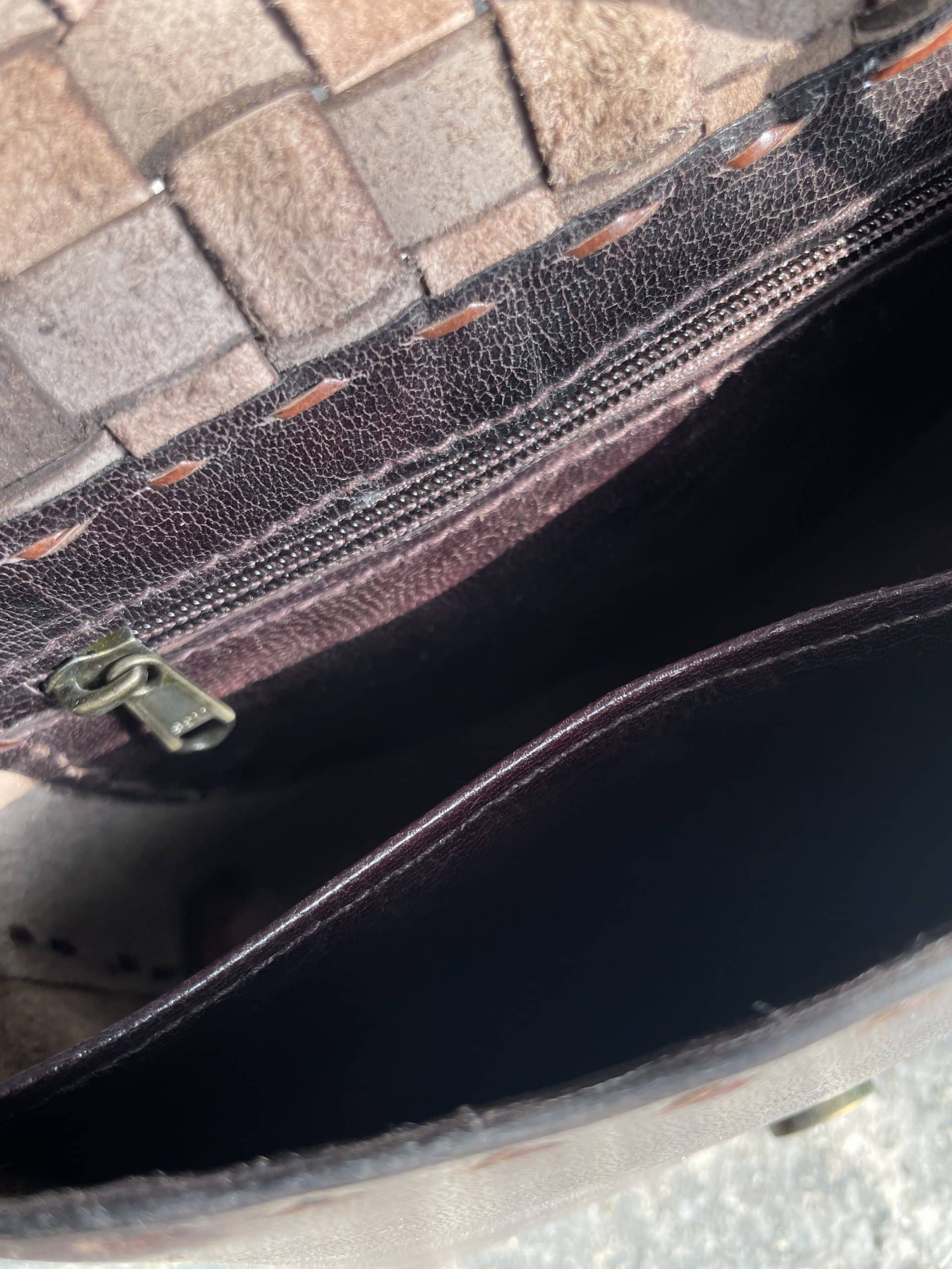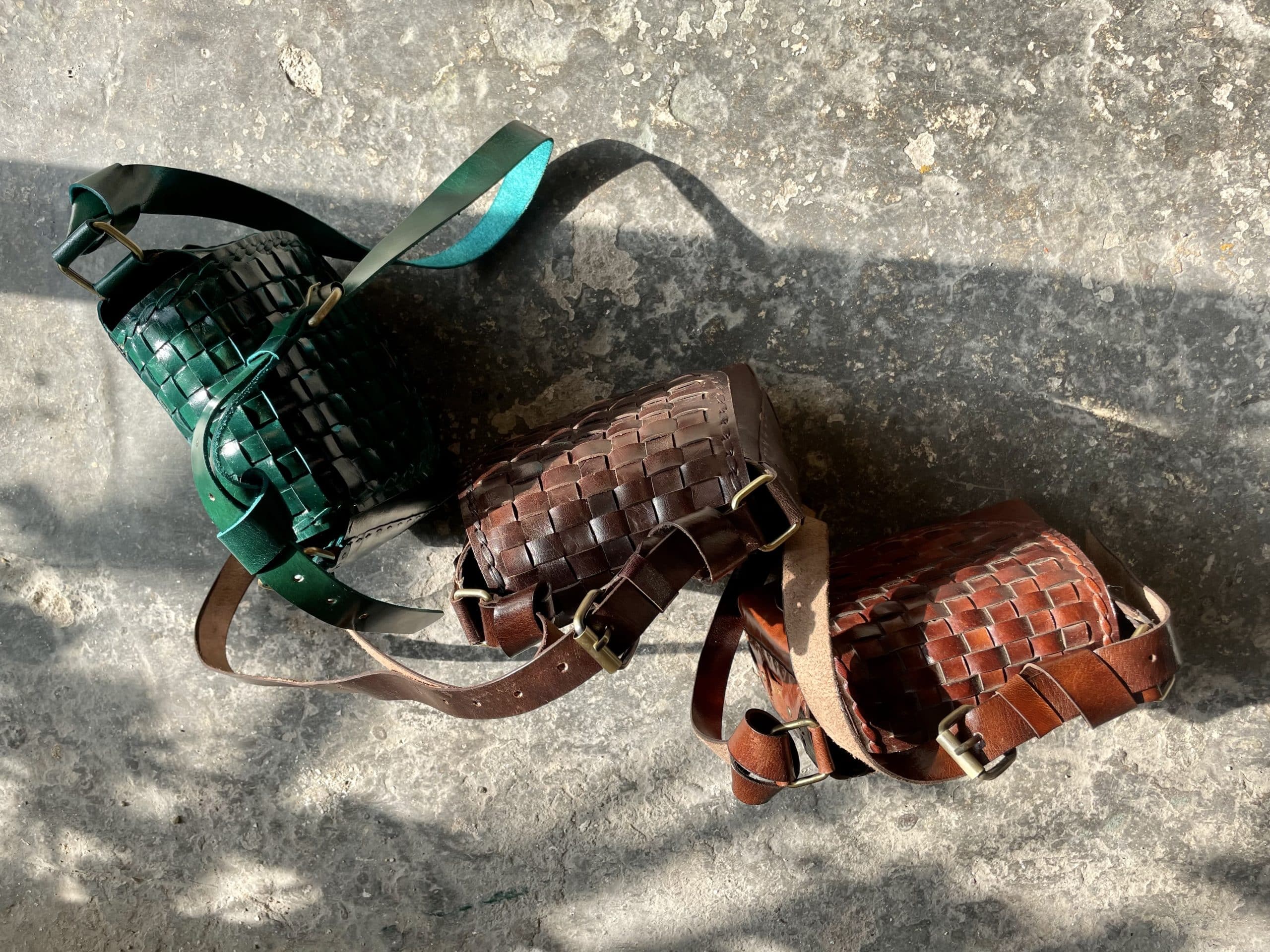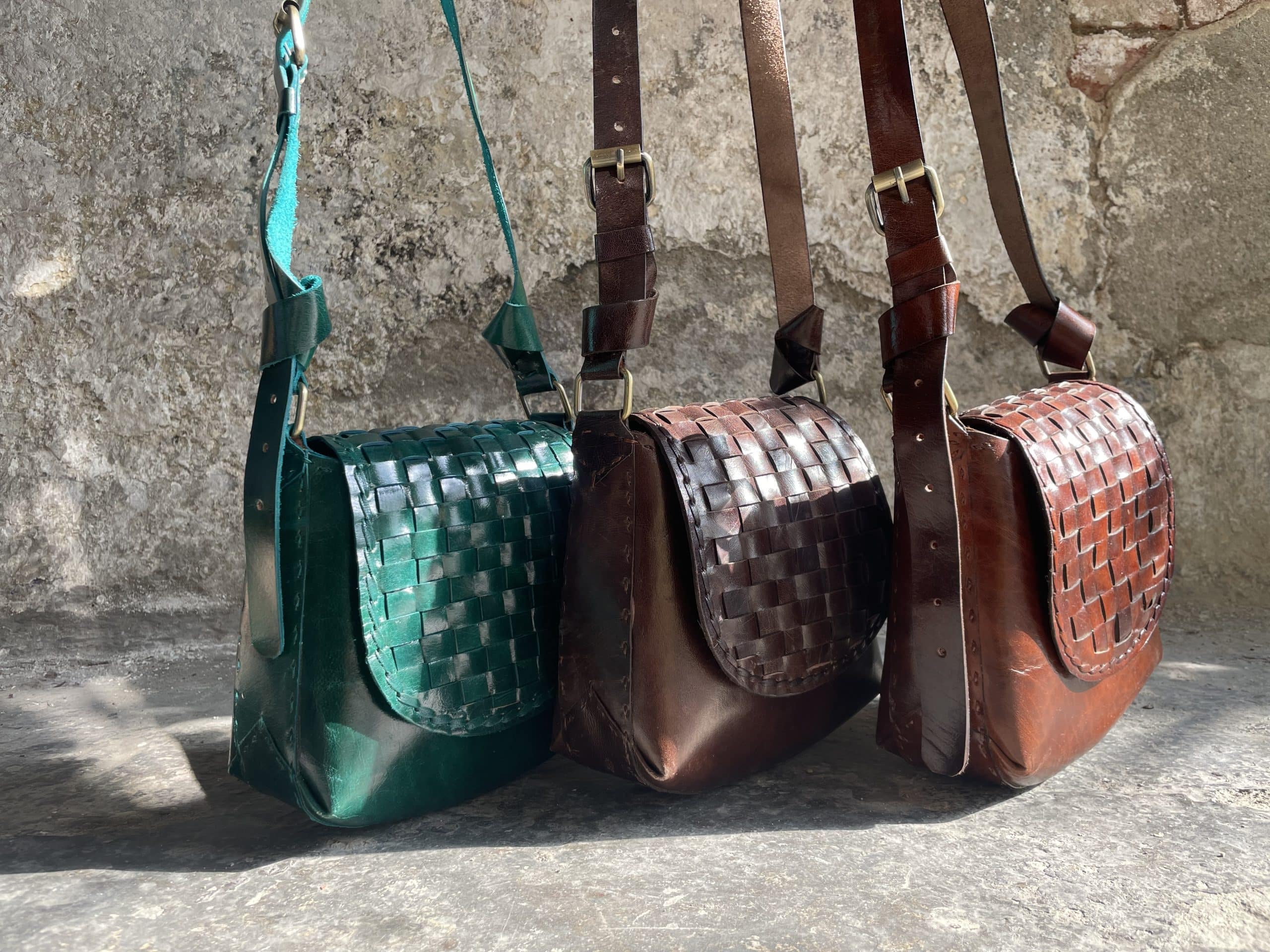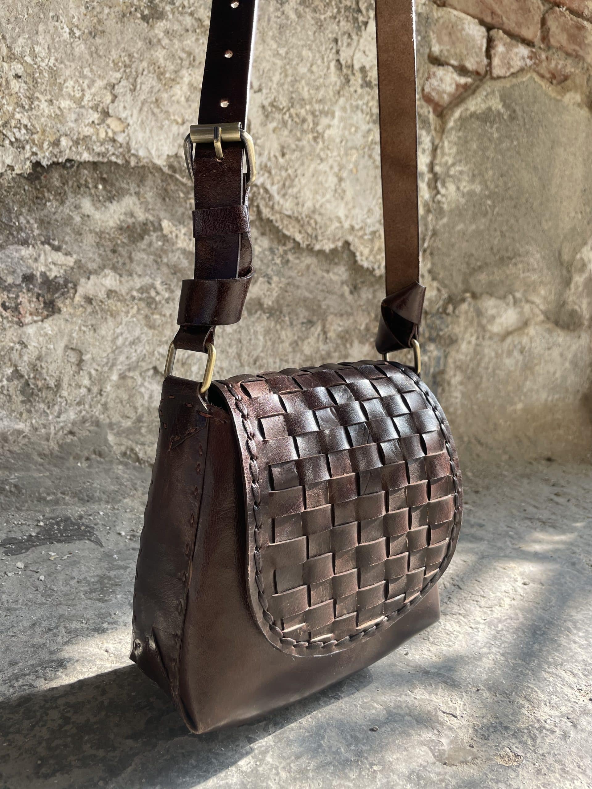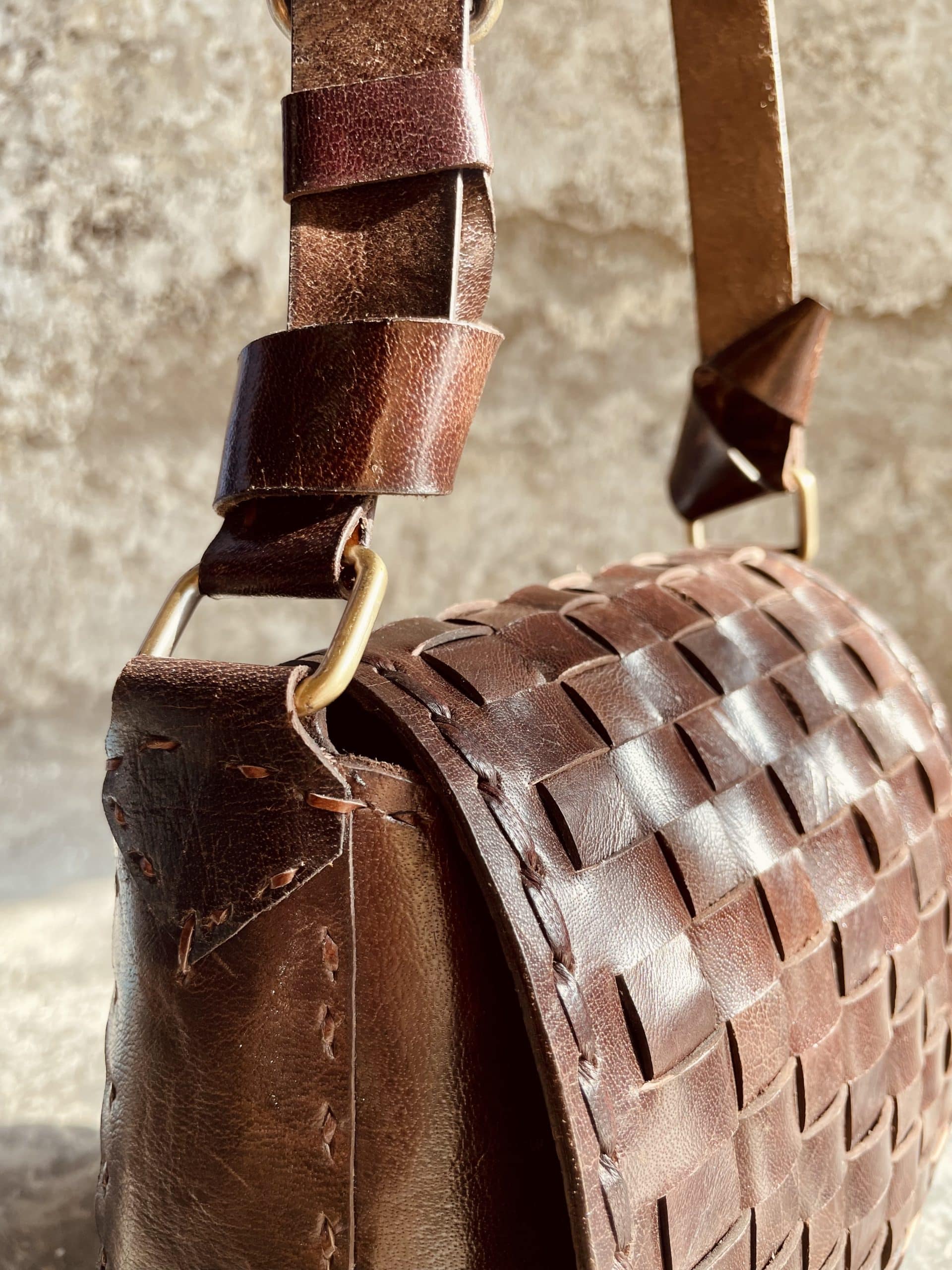L’intreccio sulla patta è stato fatto a mano, tagliando, tingendo ed incastrando tra loro le strisce di pelle.