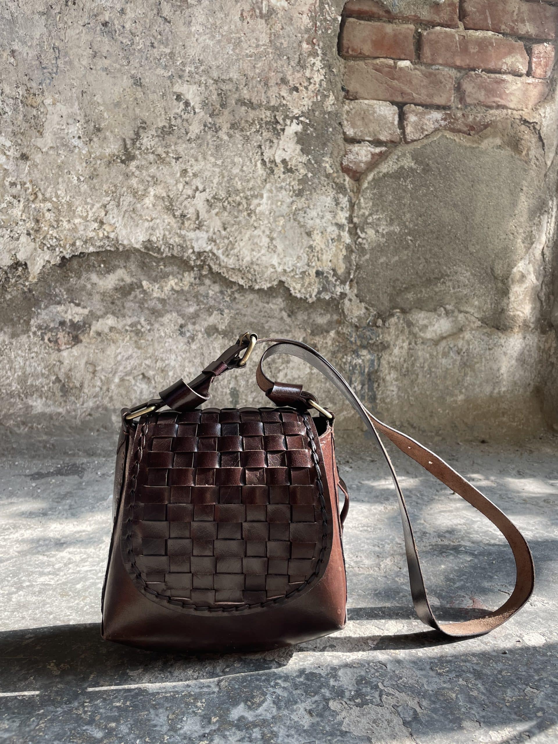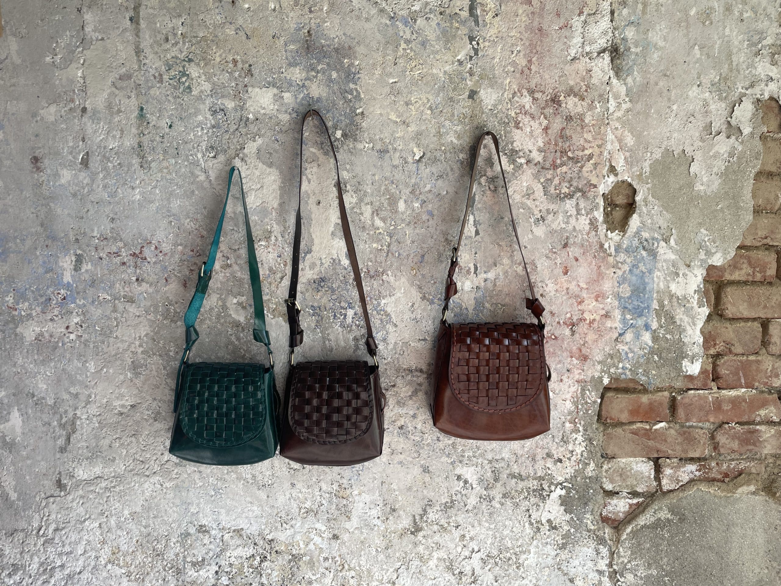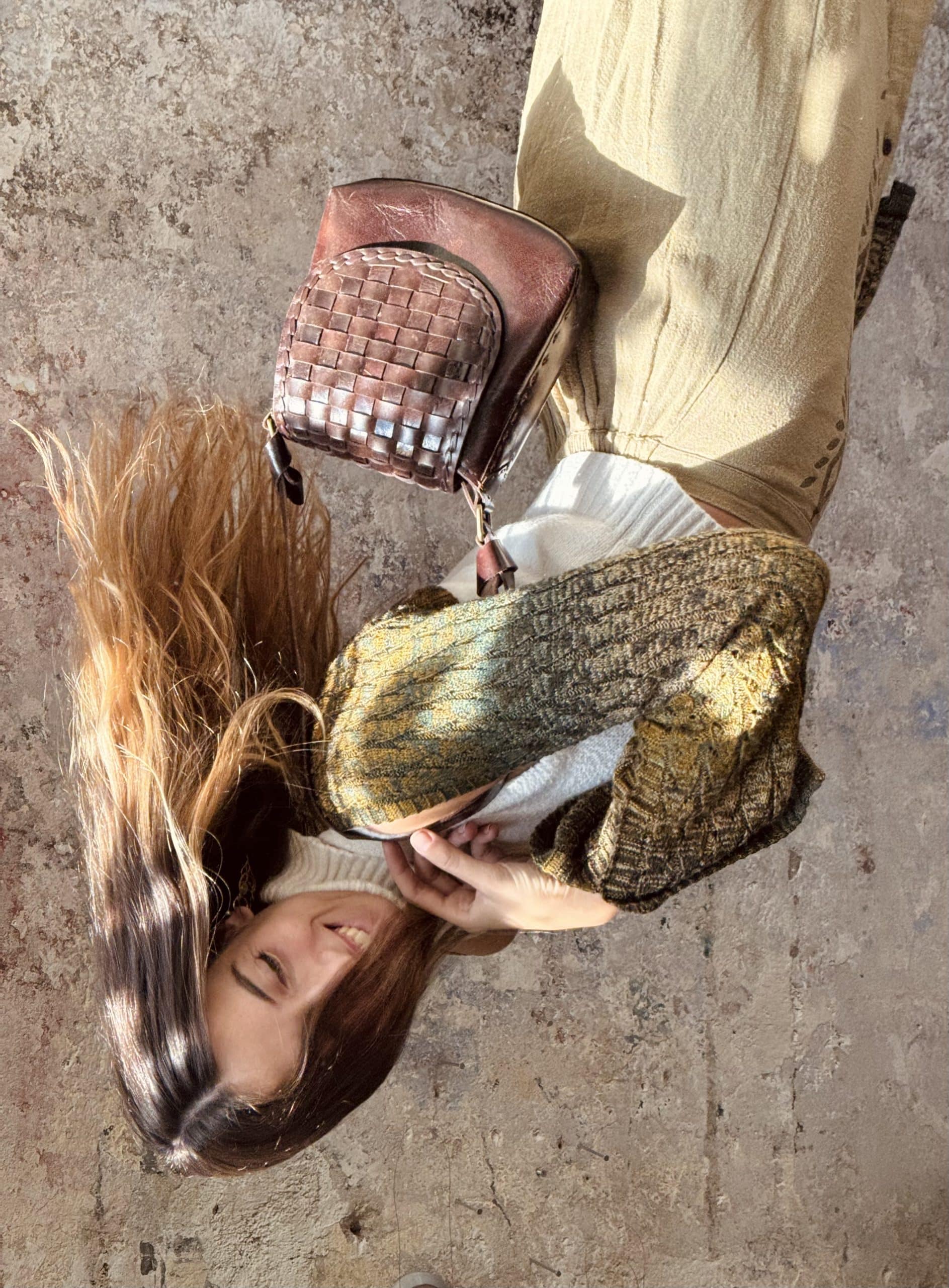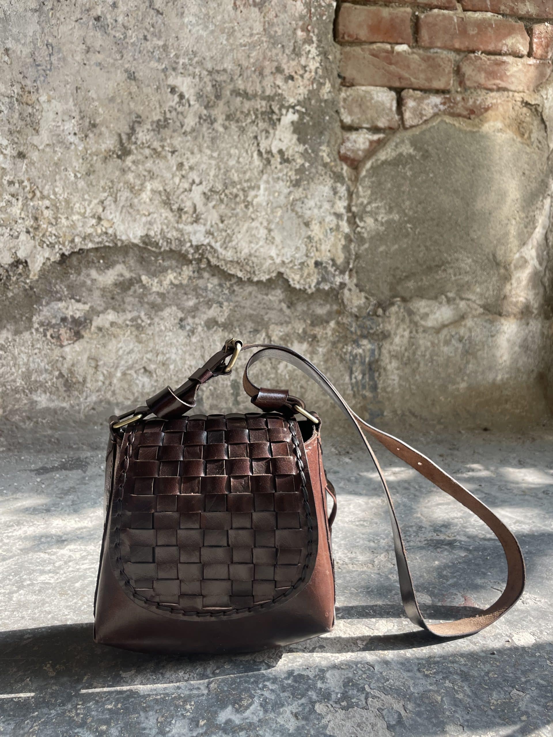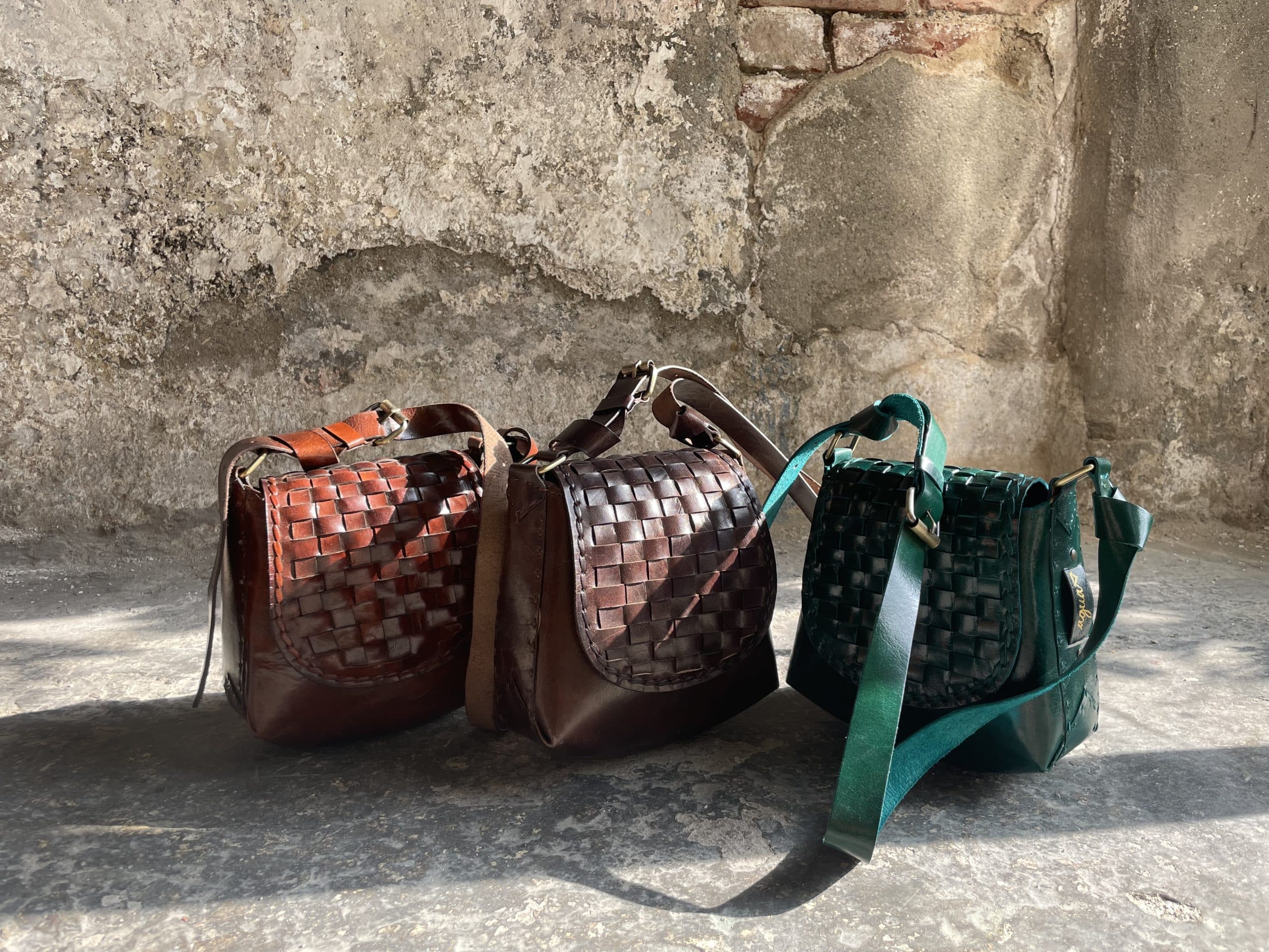L’intreccio sulla patta è stato fatto a mano, tagliando, tingendo ed incastrando tra loro le strisce di pelle.
