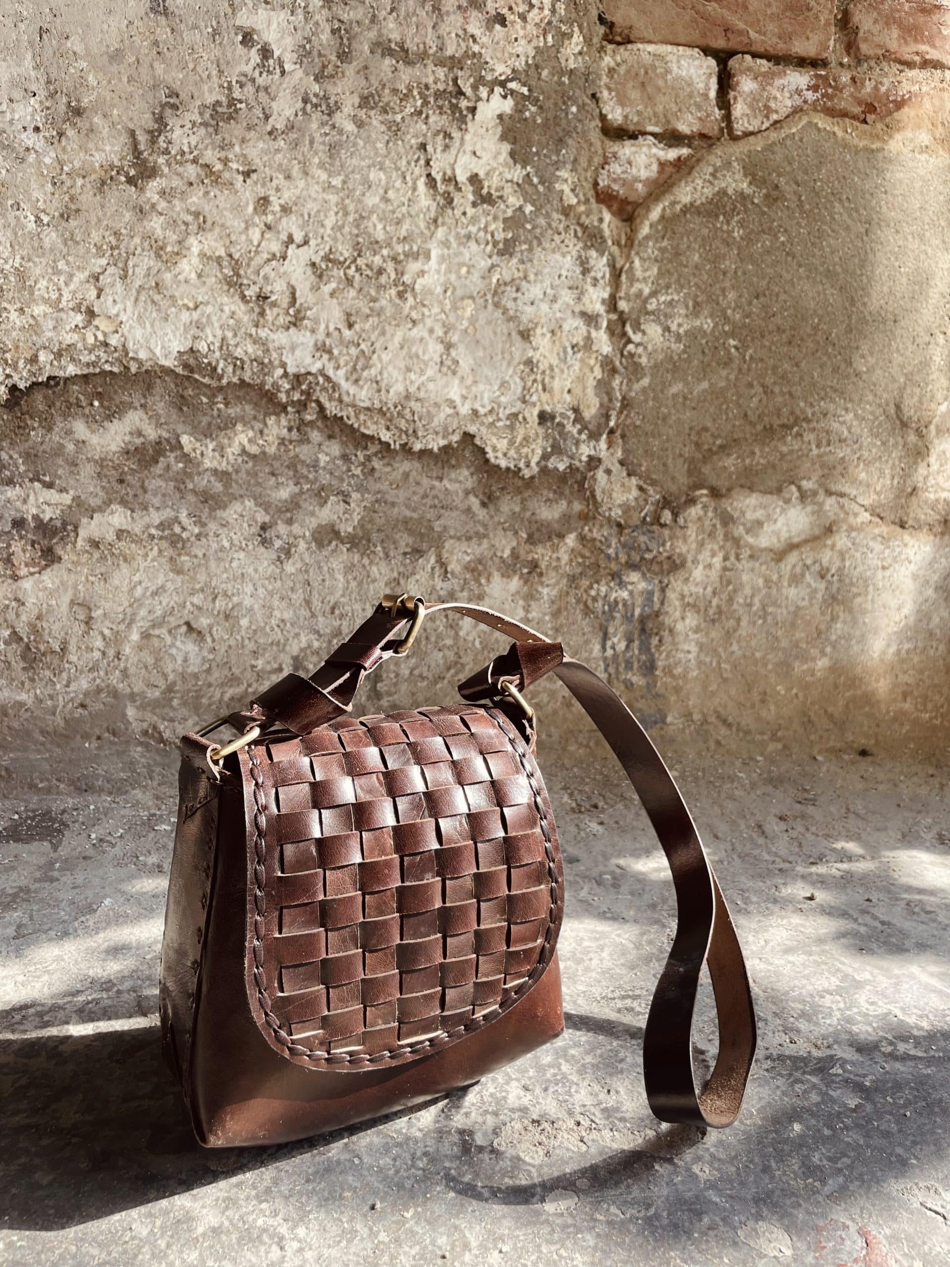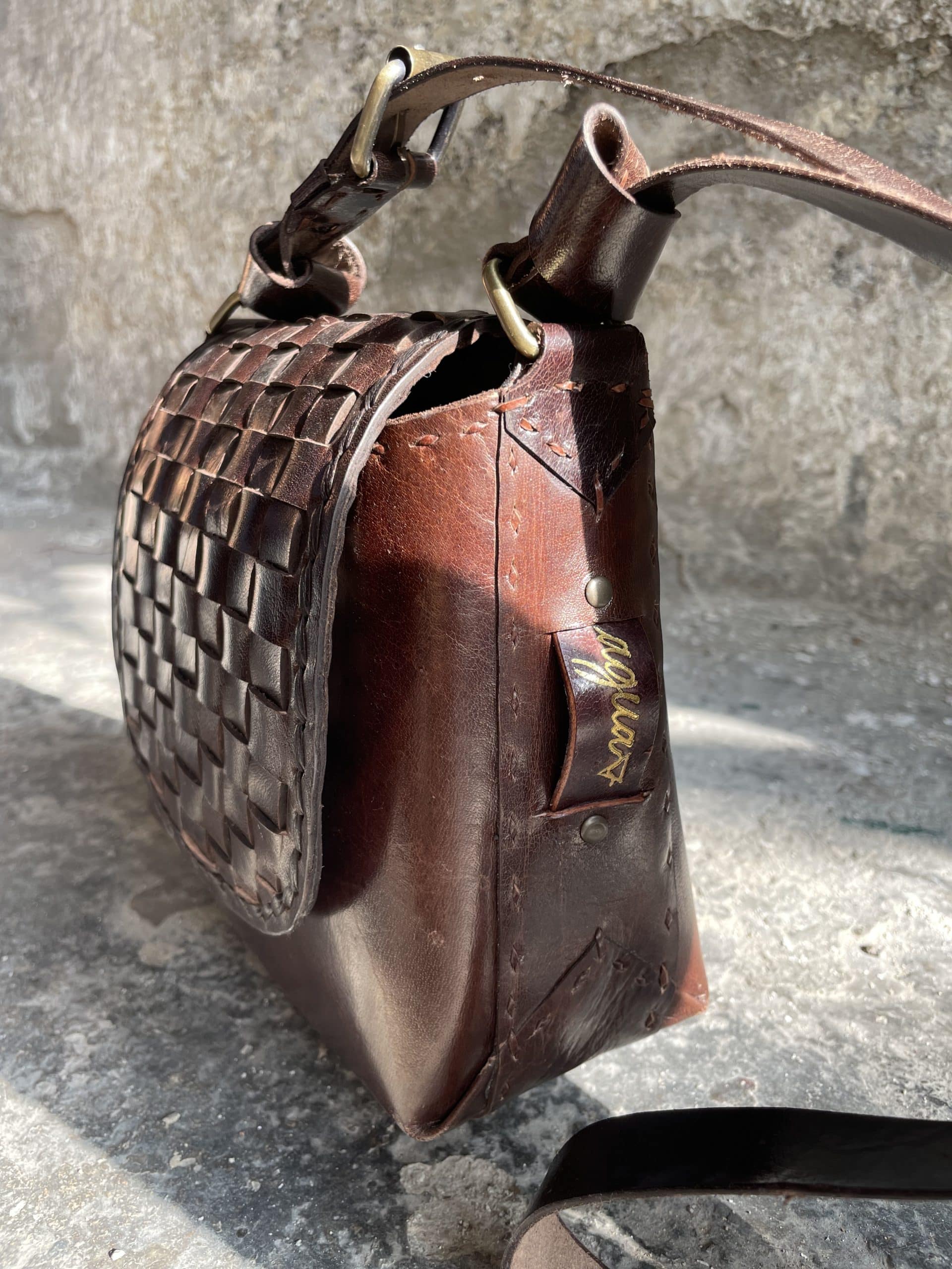 Realizzata interamente in pelle e cucita a mano (al posto del filo è stata utilizzato un cordino nella stessa pelle).