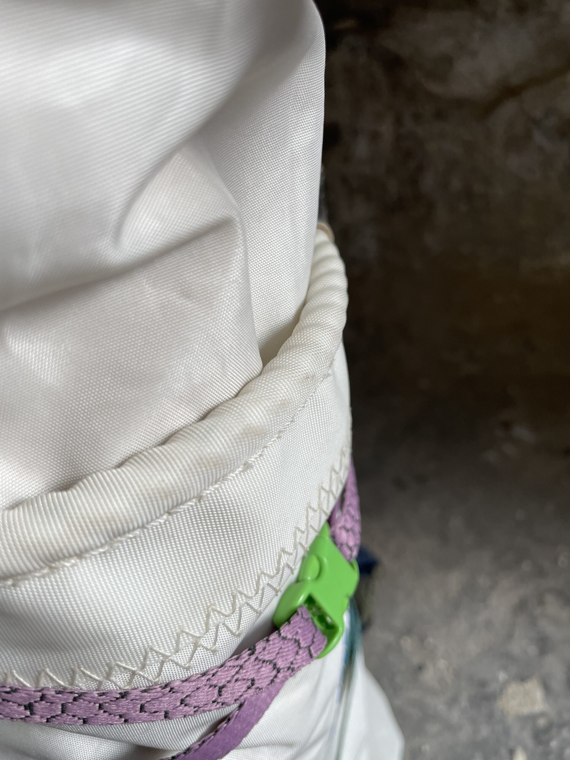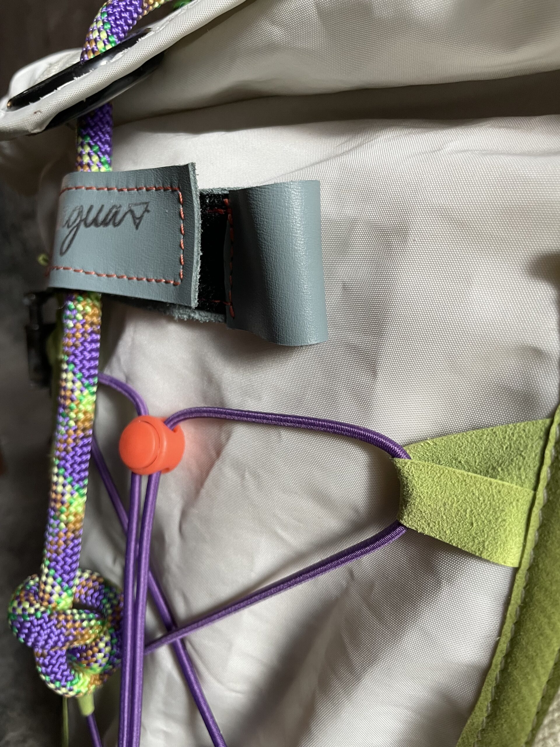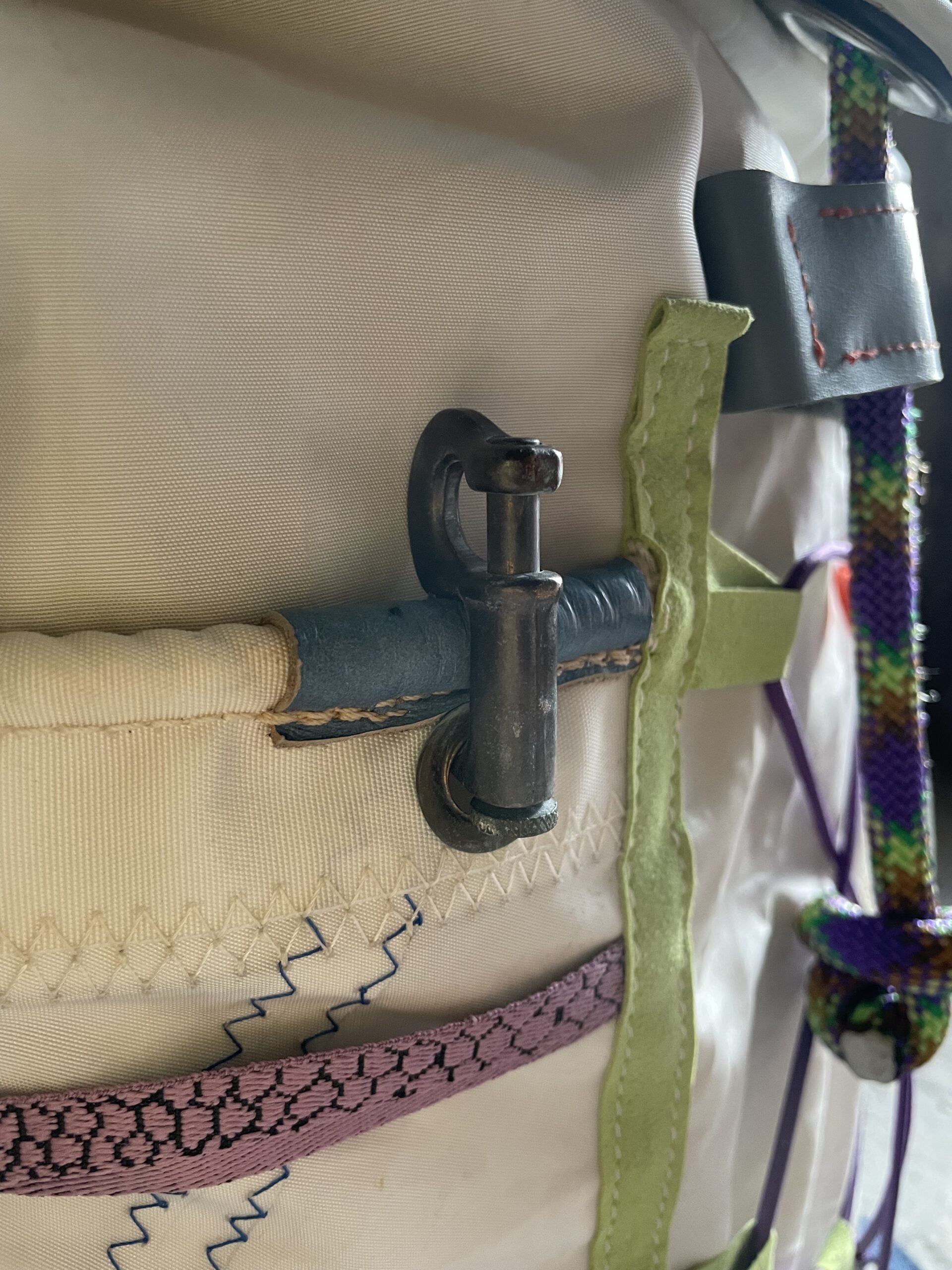 Tasca laterale sinistra con dettaglio moschettone della vela, e cinghie con piccole fibbie colorate per capienza extra esterna.